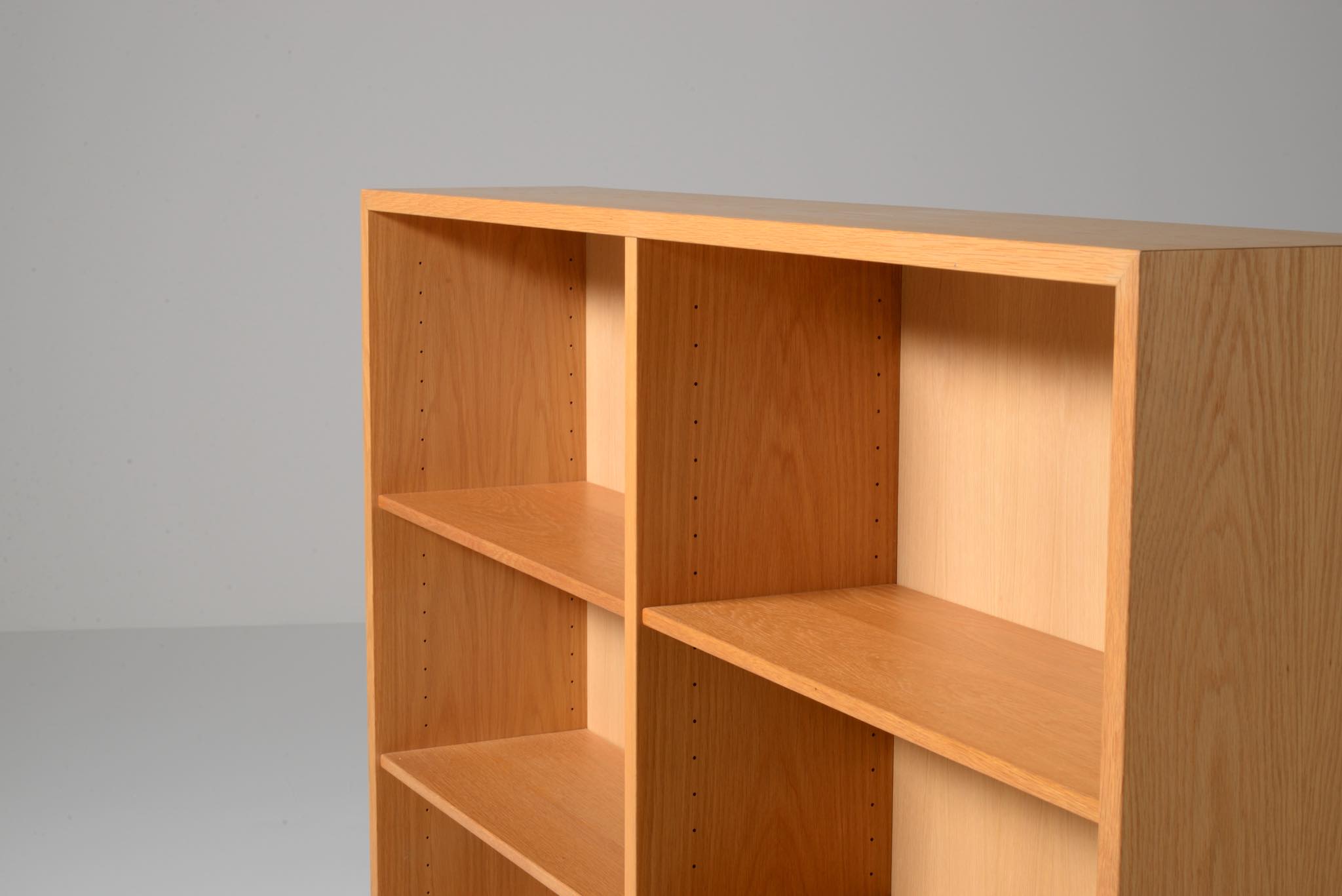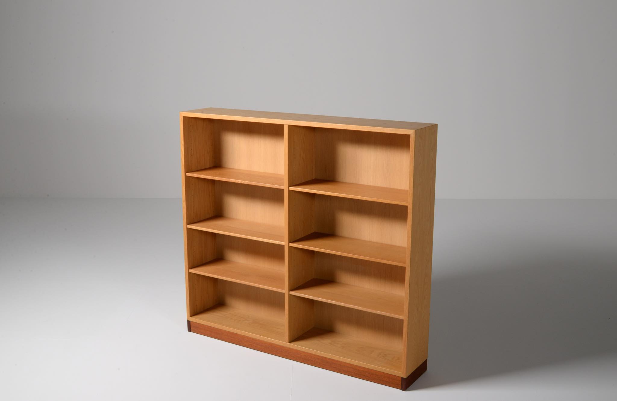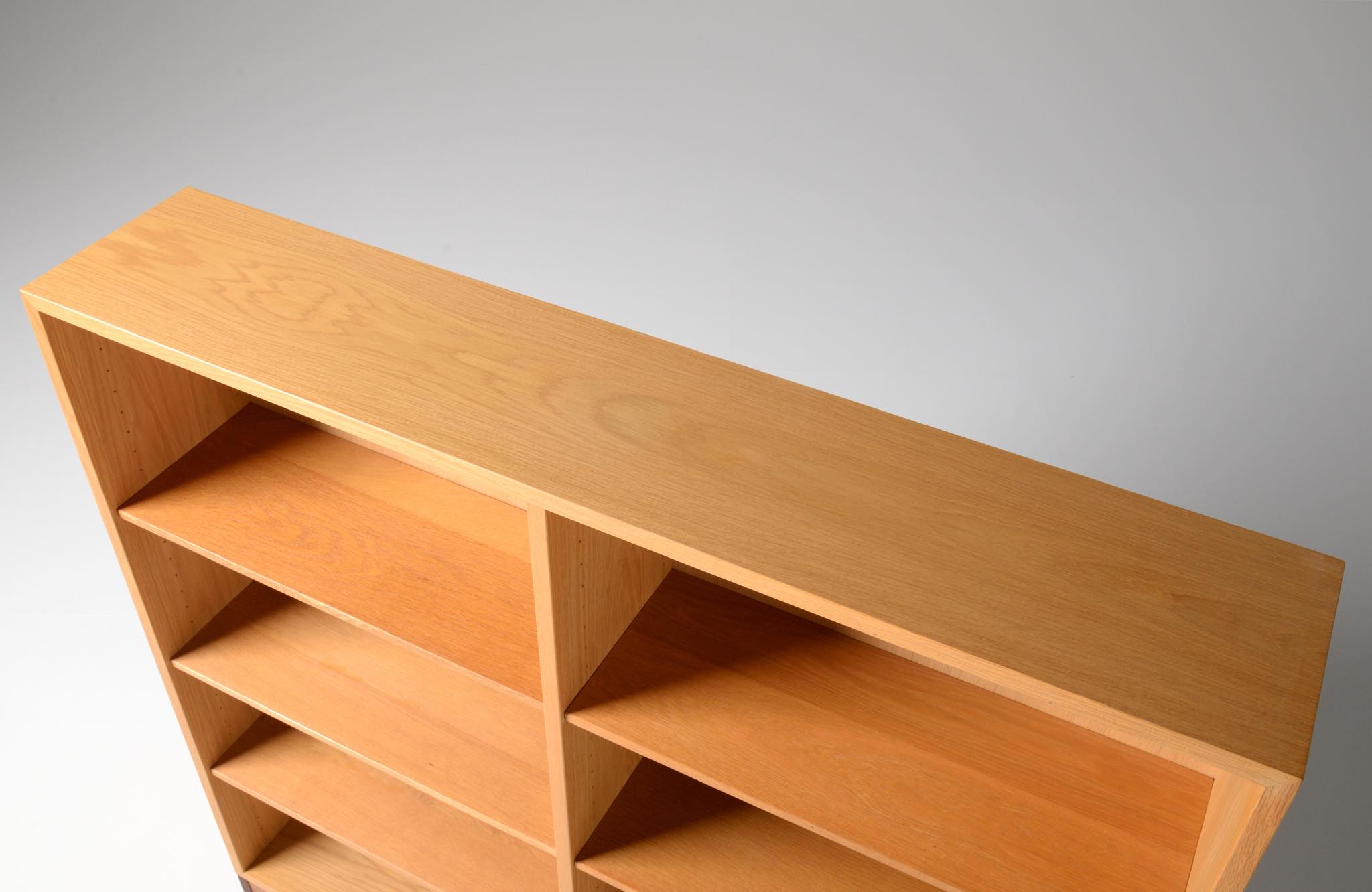 Børge Mogensen/ボーエ・ モーエンセンによる家具シリーズ Øresund/オーレスンのブックケースキャビネットです。1955年発表のこのシリーズは、スウェーデンの工房 Karl Andersson and Söner社によって近年まで生産されていました。デンマークのシェラン島から対岸のスウェーデンを望むエーレ海峡/Øresund にちなんで名付けられたそうで、オーク材の持つナチュラルで爽やかな雰囲気が印象的な家具です。当時選択のオプションがあったようで、オーク材の本体に対しチーク材のベースが備わるツートーン仕様となっています。コンディションですが、ブックシェルフ内部に日焼け退色があります。また、向かって右側面に突板の補修がありますが、全体に使用感少なく綺麗な状態です。