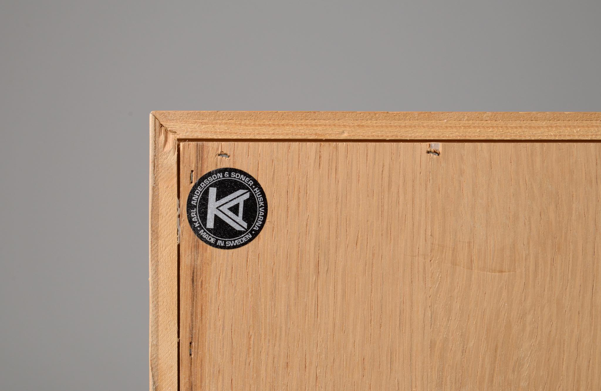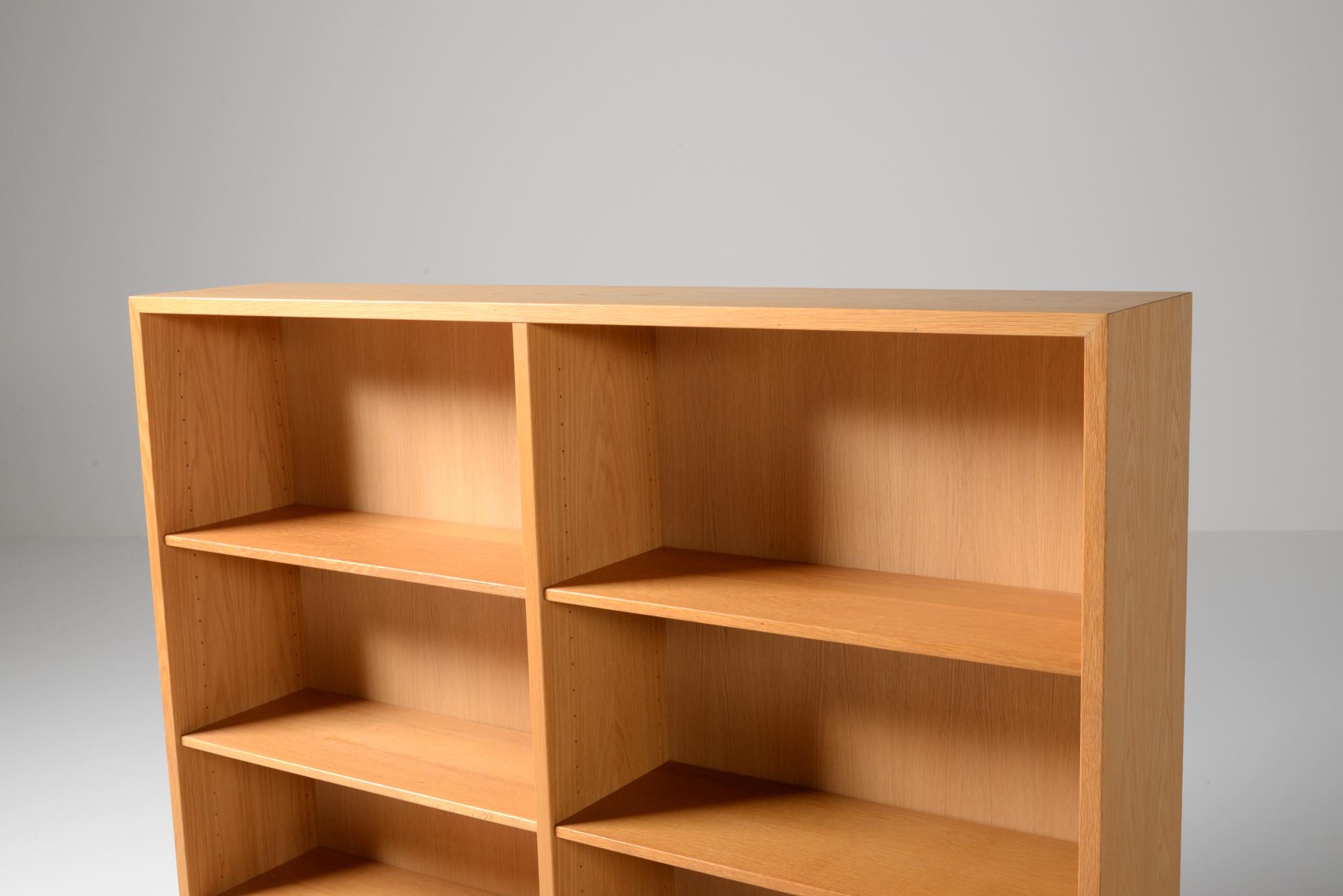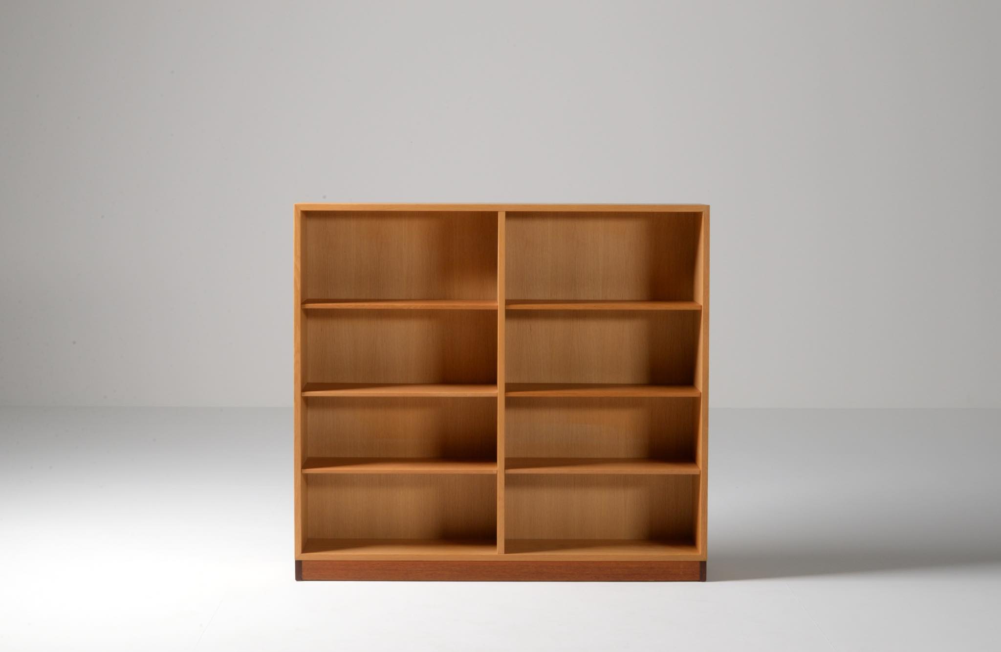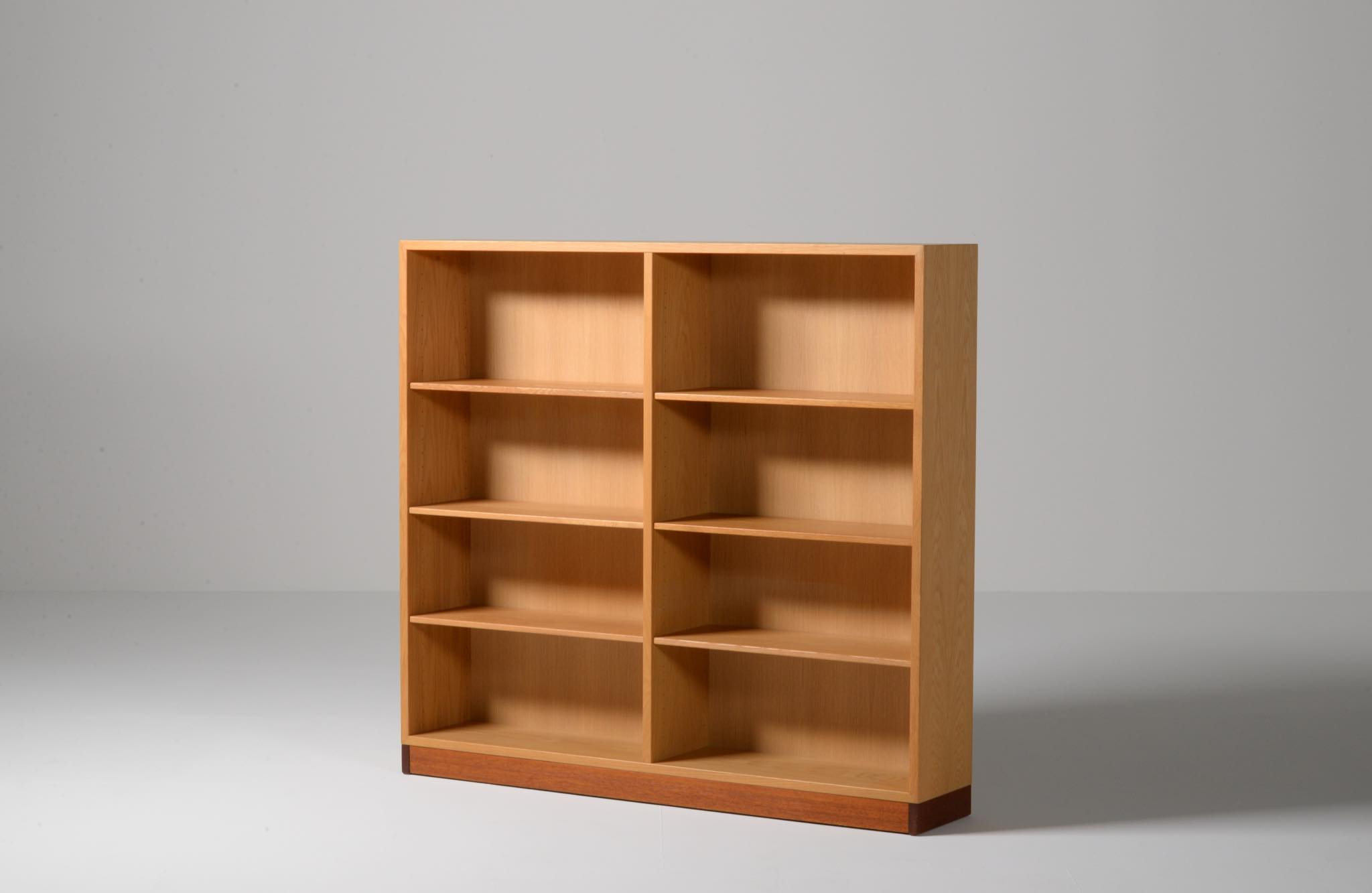 Børge Mogensen/ボーエ・ モーエンセンによる家具シリーズ Øresund/オーレスンのブックケースキャビネットです。1955年発表のこのシリーズは、スウェーデンの工房 Karl Andersson and Söner社によって近年まで生産されていました。デンマークのシェラン島から対岸のスウェーデンを望むエーレ海峡/Øresund にちなんで名付けられたそうで、オーク材の持つナチュラルで爽やかな雰囲気が印象的な家具です。当時選択のオプションがあったようで、オーク材の本体に対しチーク材のベースが備わるツートーン仕様となっています。コンディションですが、ブックシェルフ内部に日焼け退色があります。また、向かって右側面に突板の補修がありますが、全体に使用感少なく綺麗な状態です。