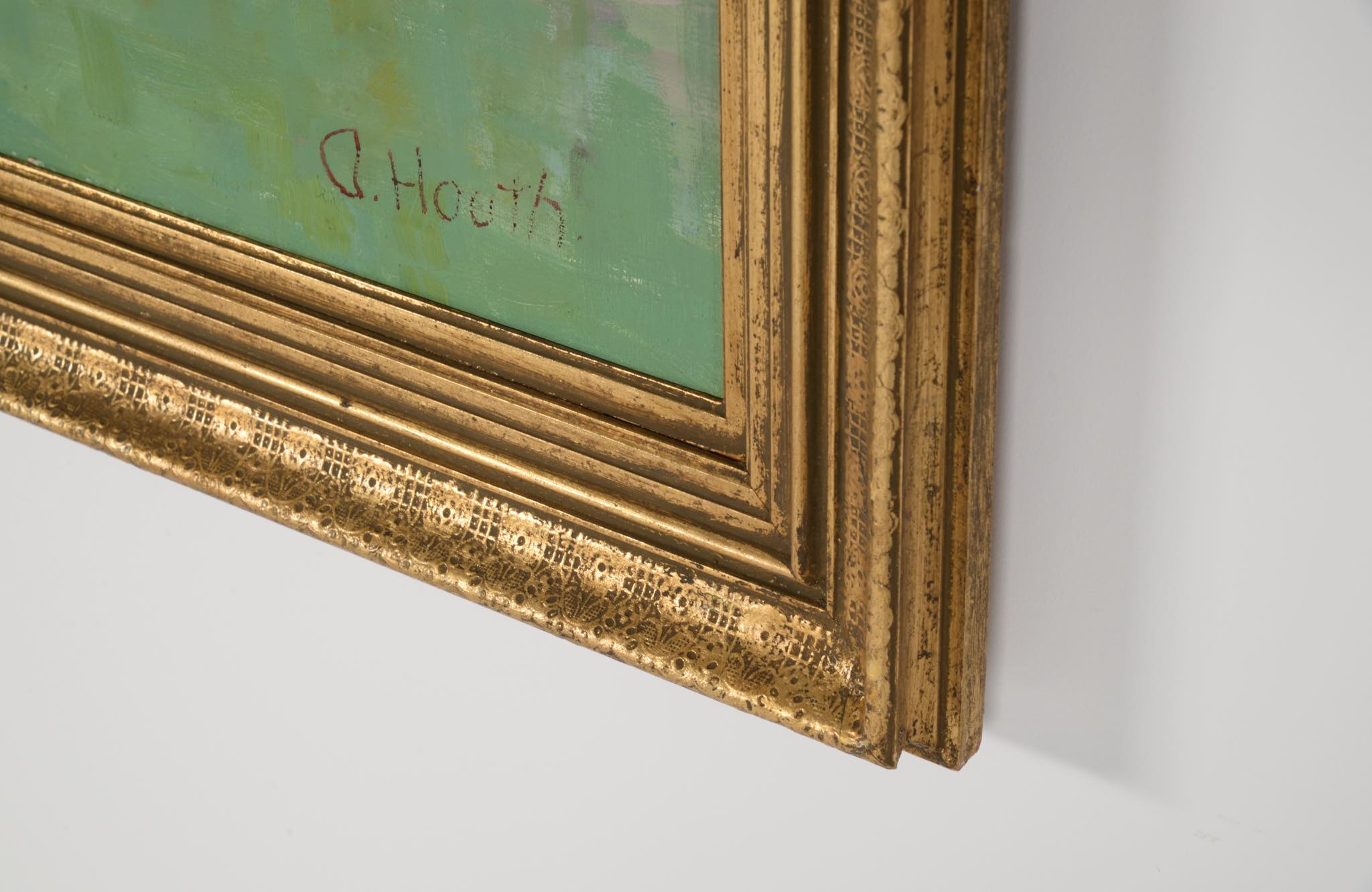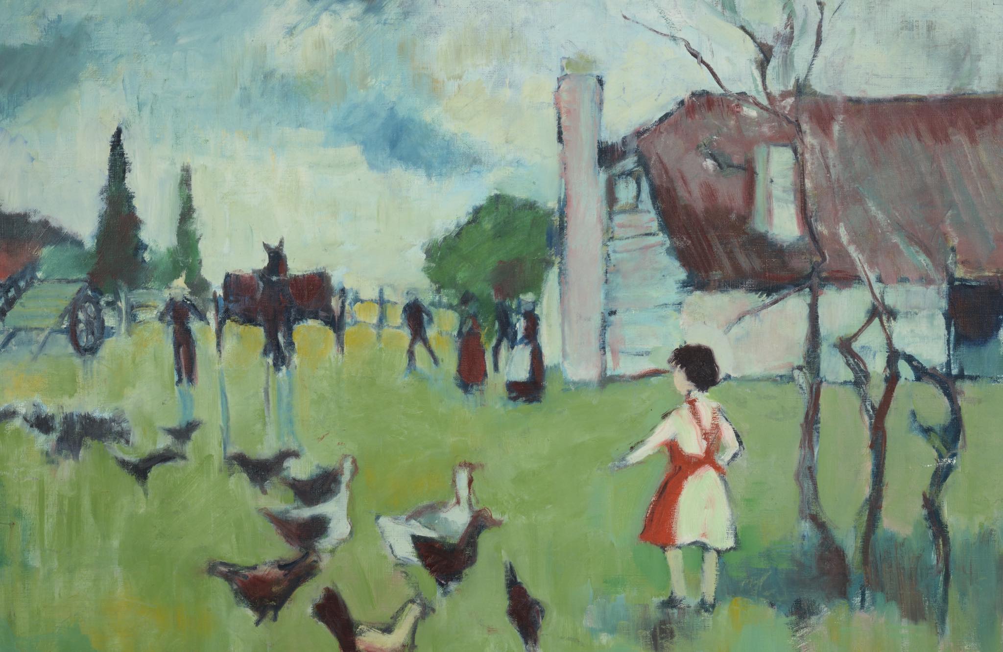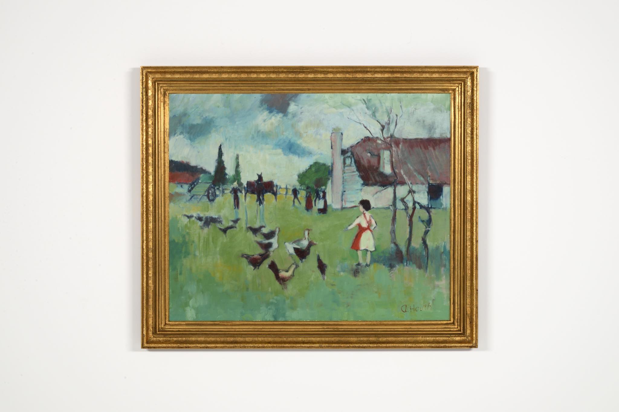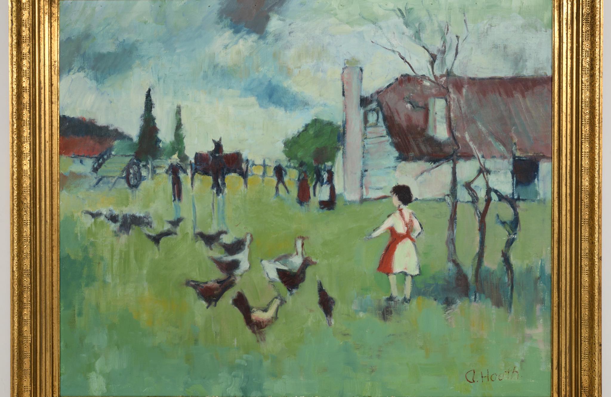 20世紀前葉に活躍したデンマークの女流画家、Annette Houth/アネット・ハウスによる風景画作品です。のどかな農家の庭先で鶏に餌を撒く女の子の姿が描かれています。キャンバスの上部に釘で留めている箇所が見られますが、作品自体のコンディションは良好です。金箔のフレームはオリジナルです。