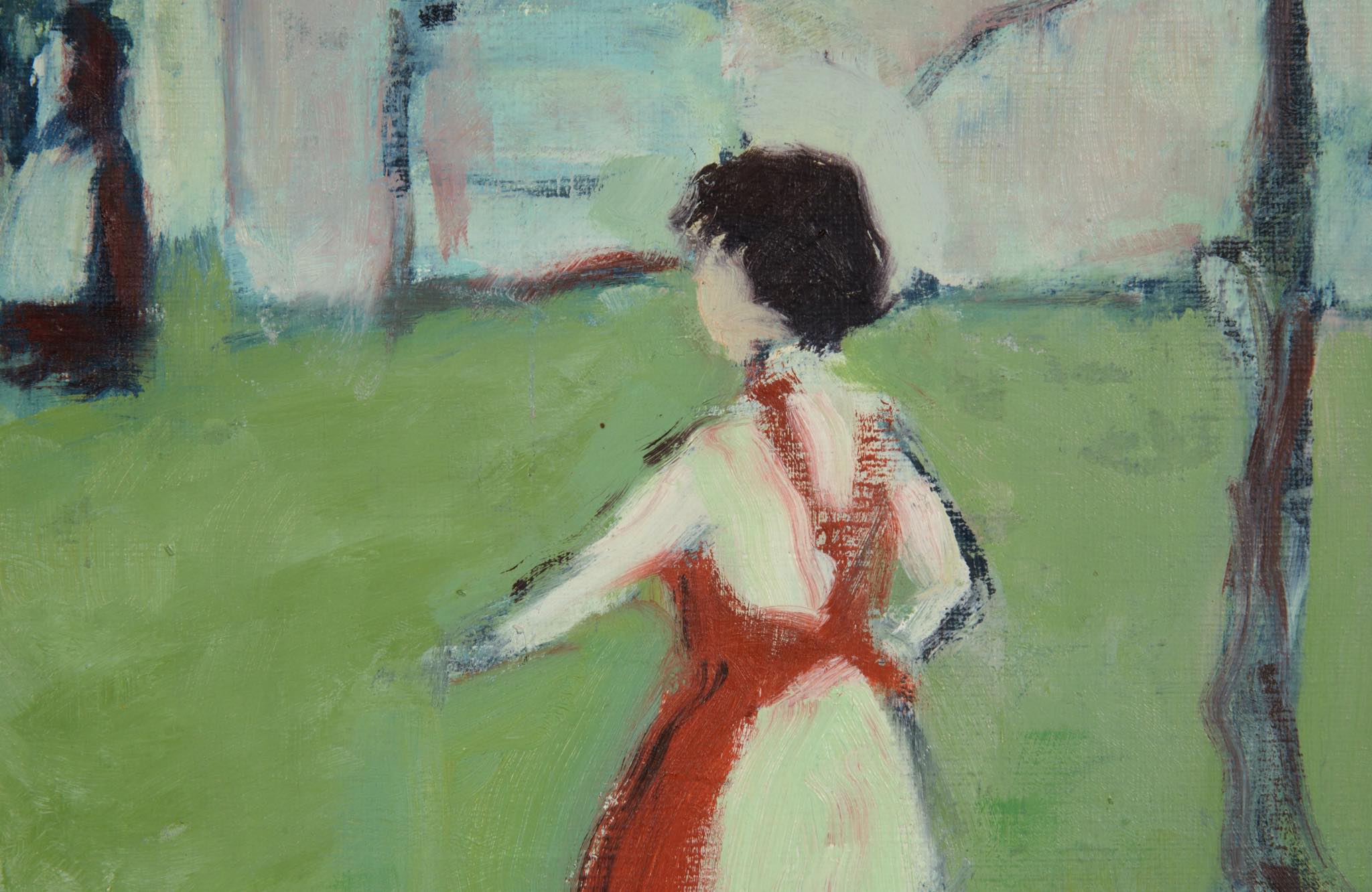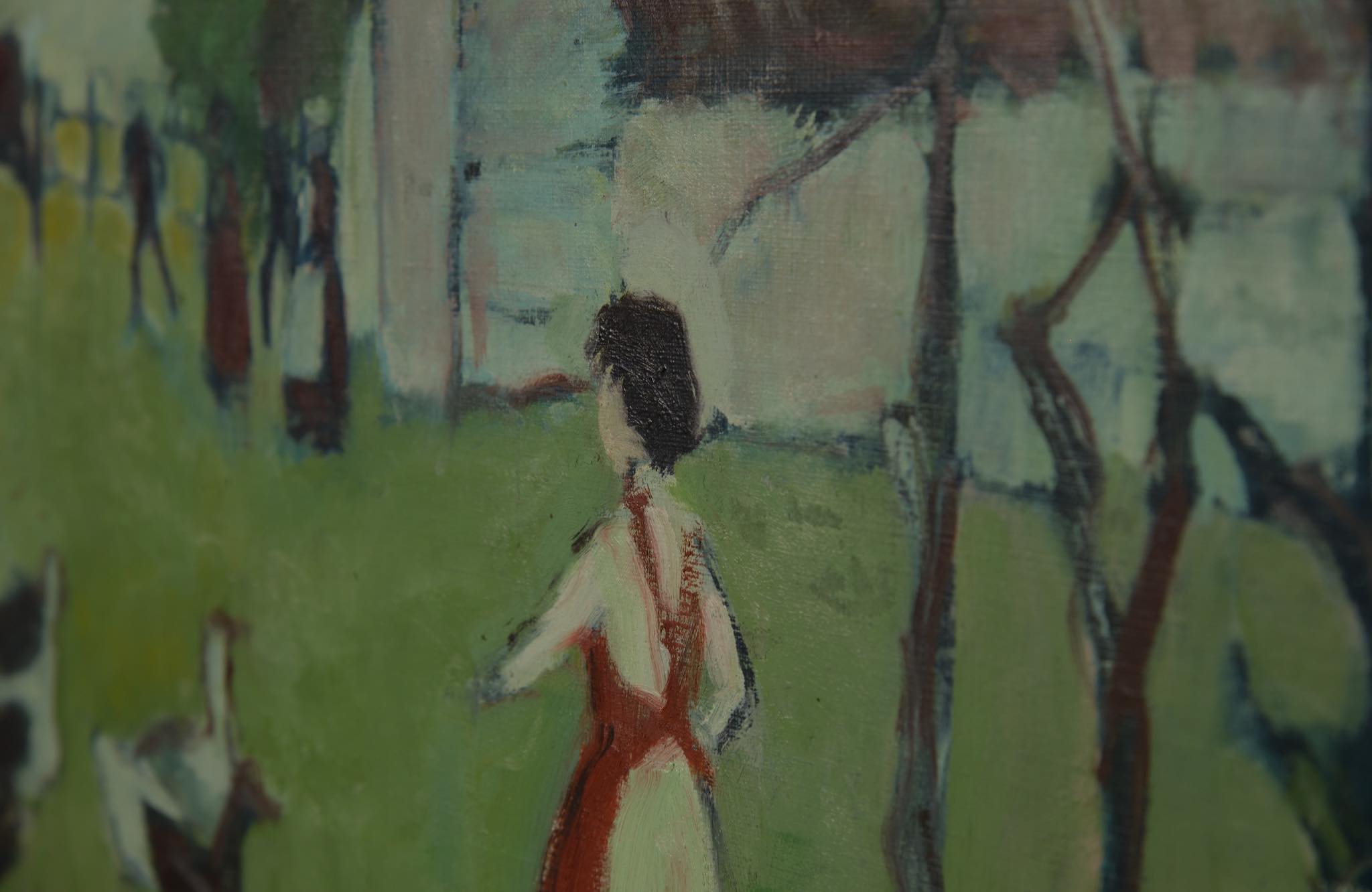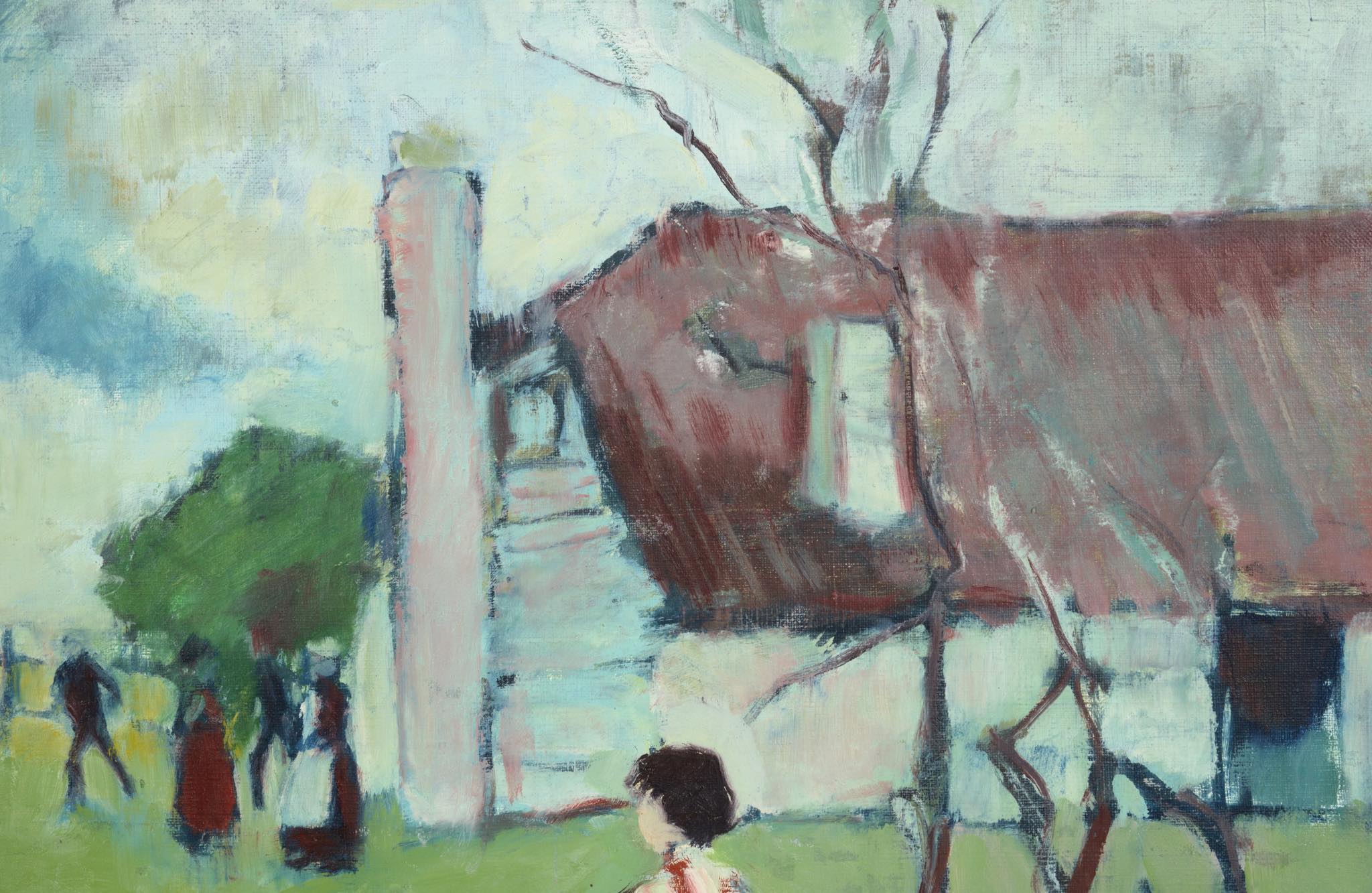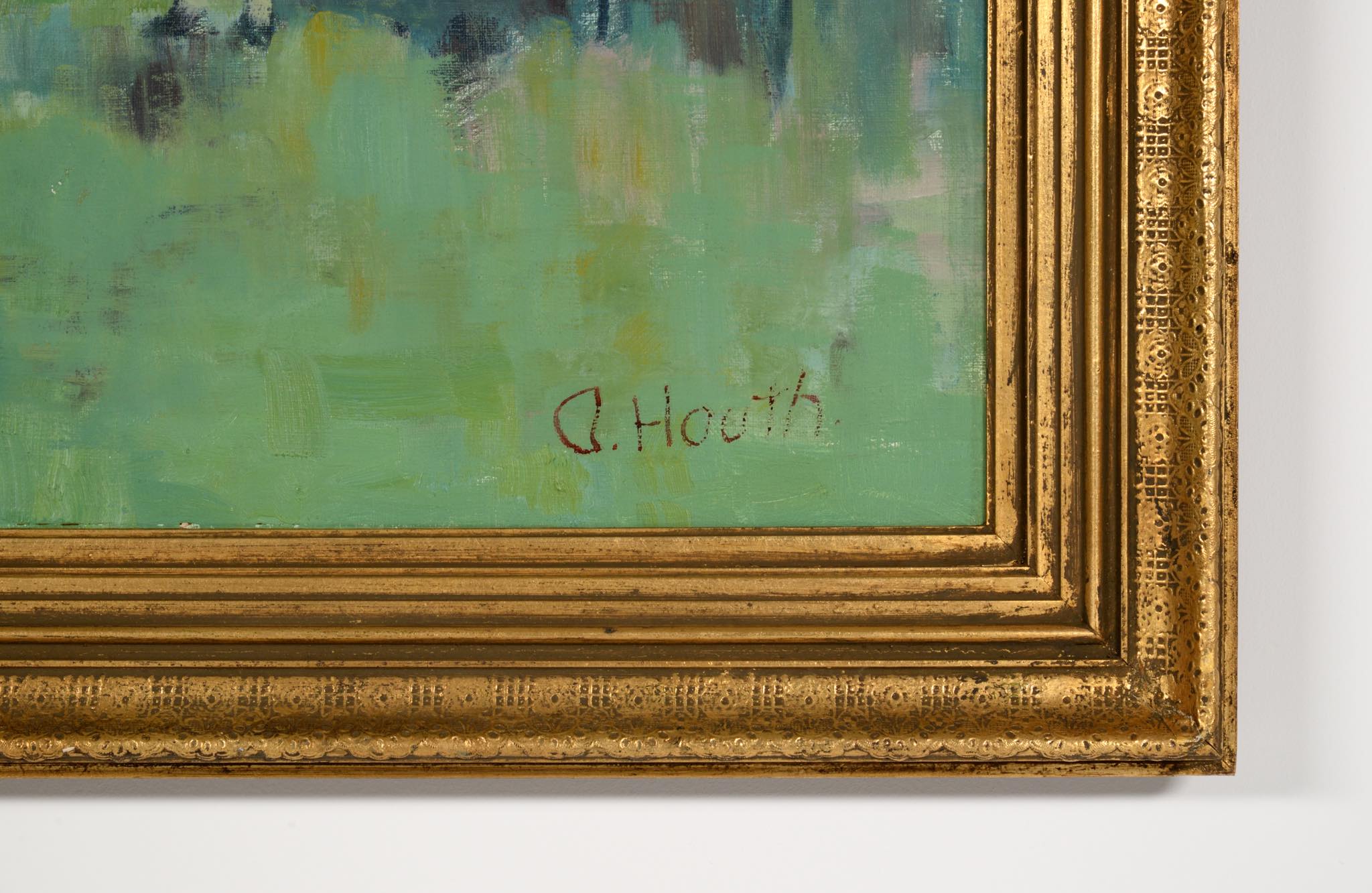 20世紀前葉に活躍したデンマークの女流画家、Annette Houth/アネット・ハウスによる風景画作品です。のどかな農家の庭先で鶏に餌を撒く女の子の姿が描かれています。キャンバスの上部に釘で留めている箇所が見られますが、作品自体のコンディションは良好です。金箔のフレームはオリジナルです。