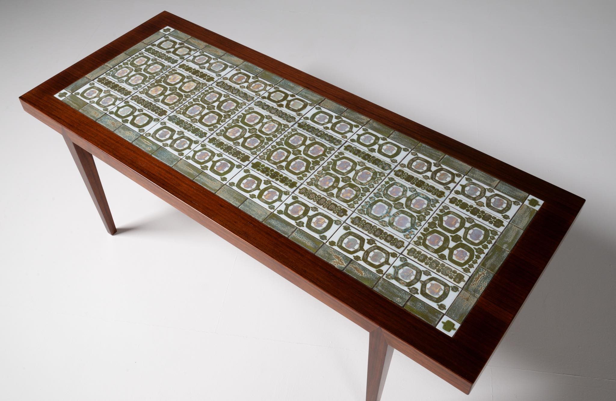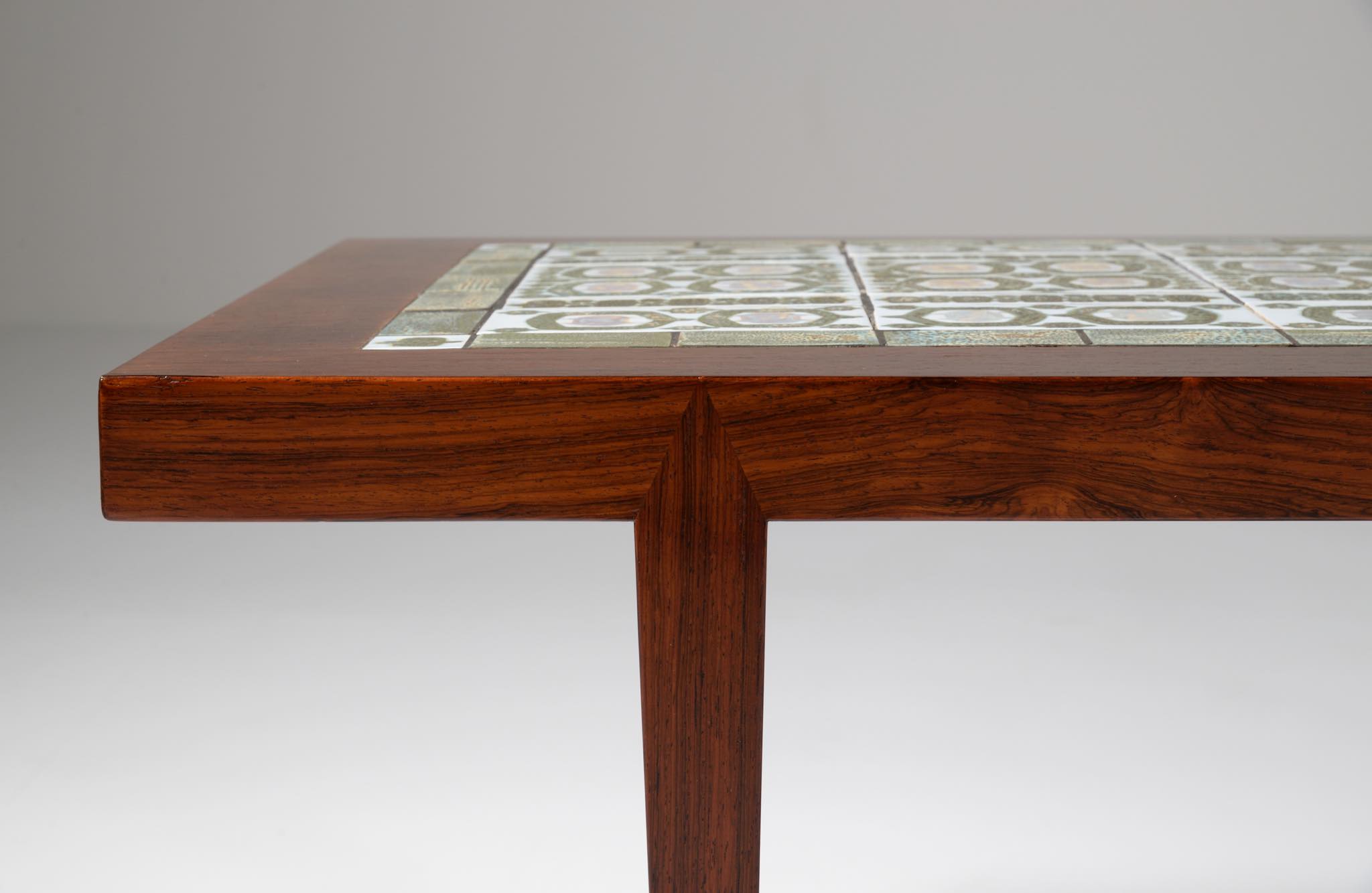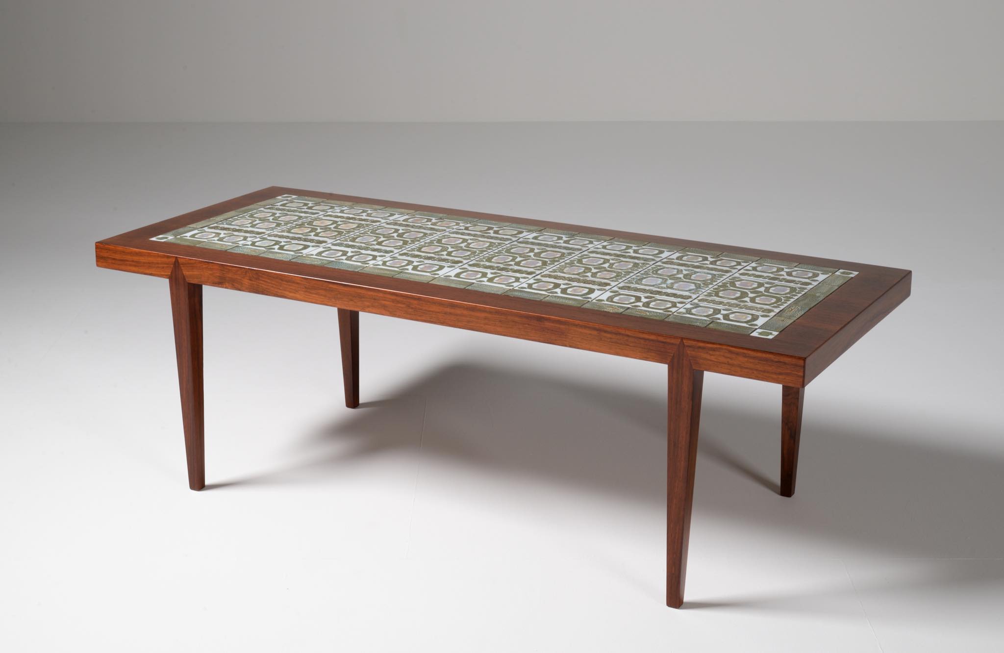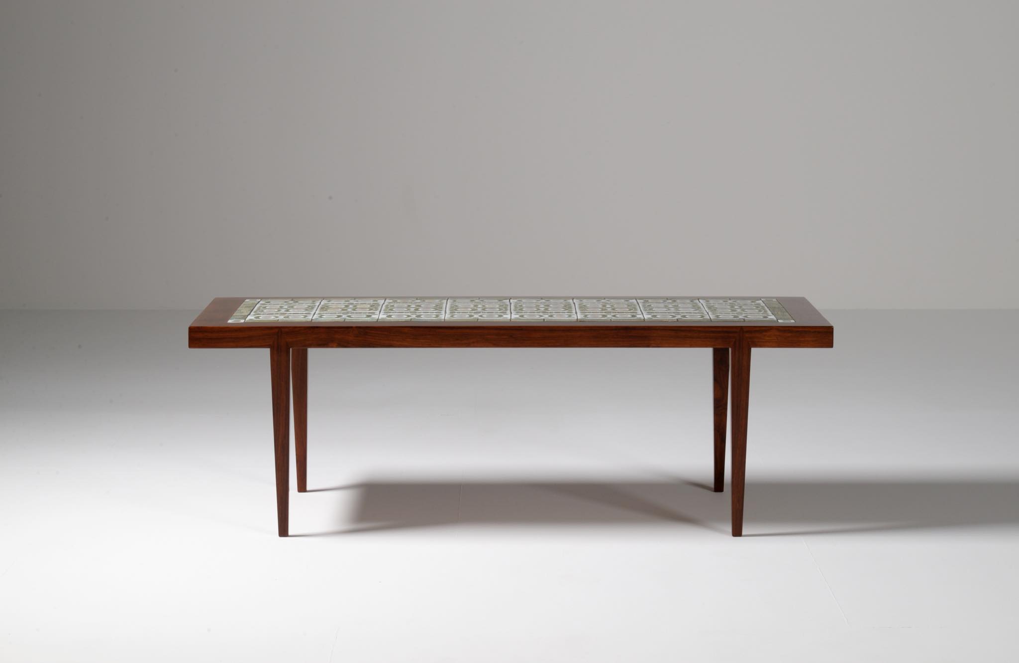 1960年代に活動したデンマークの家具デザイナー、Severin Hansen Jr./セヴェリン・ハンセン Jr.によるコーヒーテーブルです。1960年代に作られたものでしょう。ロイヤルコペンハーゲンのディレクターを務めた Nils Thorsson/ニールス・トーソンによるタイルを天板に象嵌しています。本体はブラジリアンと思しき見所のある木目の現れたローズウッドが用いられており、幅150センチとやや大きめのサイズ感です。タイルは緑釉のタイプが用いられています。目立ったダメージはなくコンディションは良好です。応接のコーヒーテーブルとしてはもちろん、壁際に設置し低いコンソールテーブルとしてお使いの方も多く、オブジェや花を飾ったり、ポータブルテレビを置くなど広い用途で使われています。