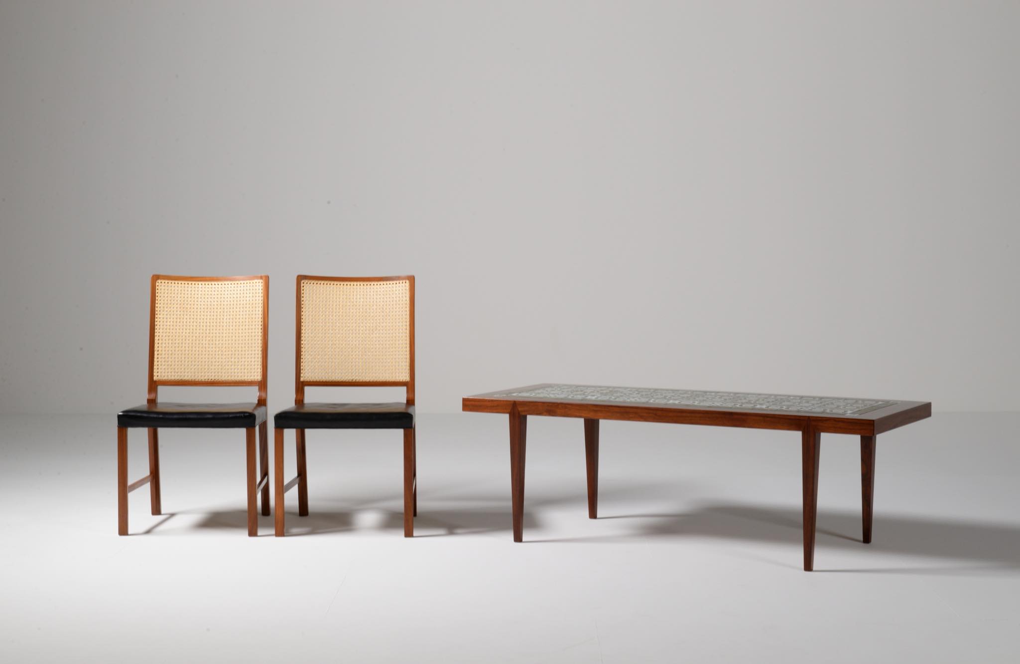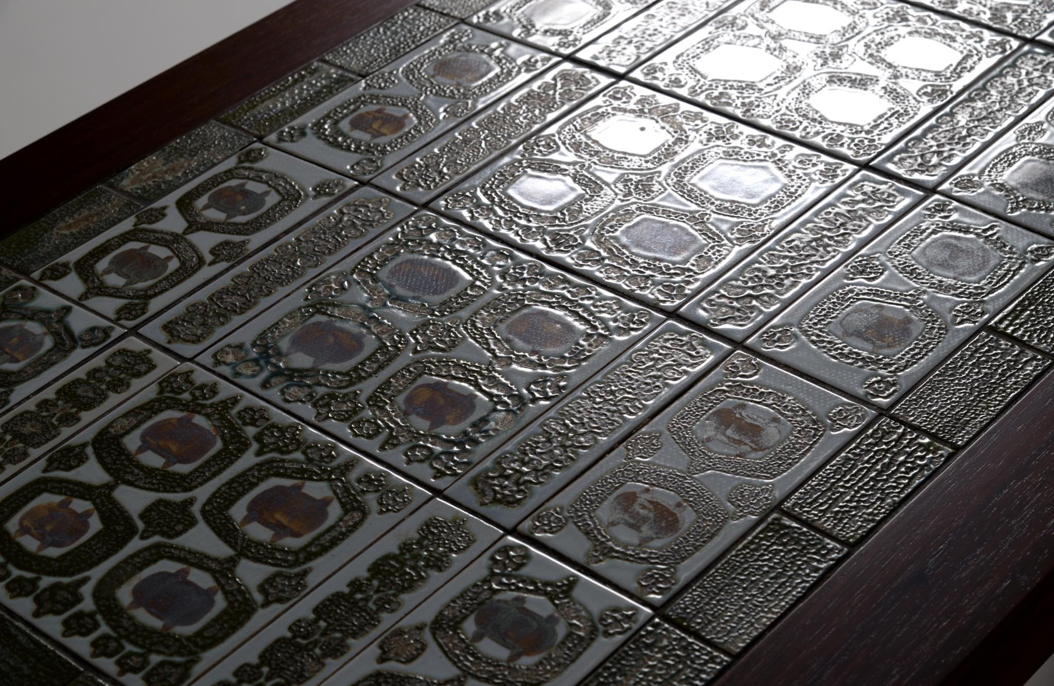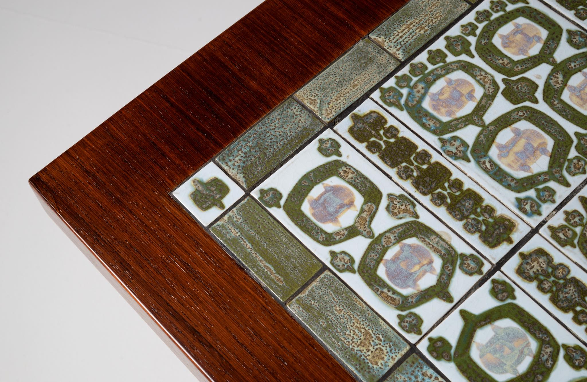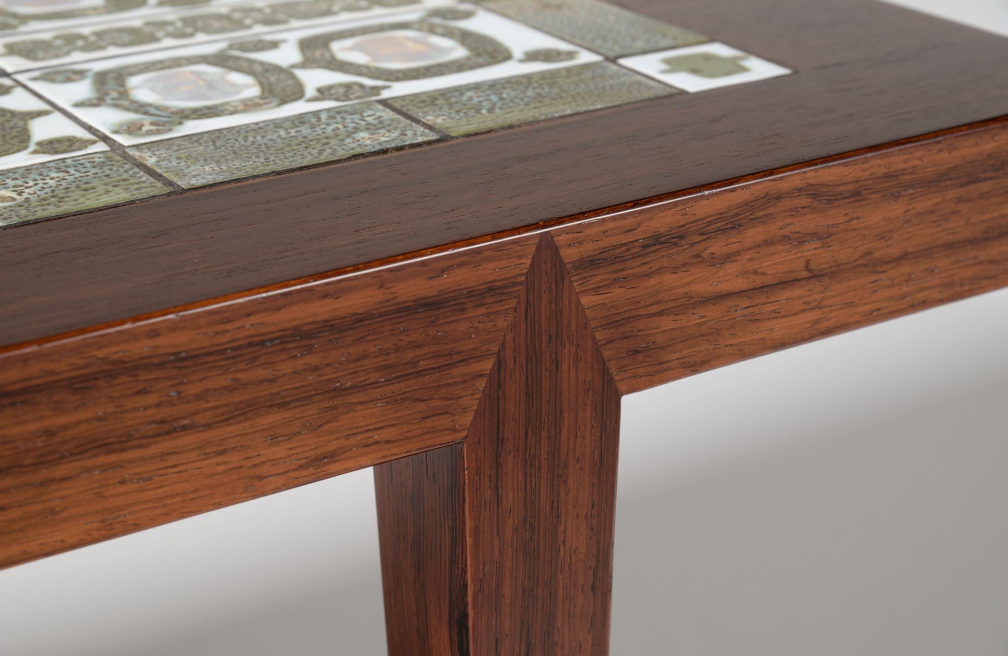 1960年代に活動したデンマークの家具デザイナー、Severin Hansen Jr./セヴェリン・ハンセン Jr.によるコーヒーテーブルです。1960年代に作られたものでしょう。ロイヤルコペンハーゲンのディレクターを務めた Nils Thorsson/ニールス・トーソンによるタイルを天板に象嵌しています。本体はブラジリアンと思しき見所のある木目の現れたローズウッドが用いられており、幅150センチとやや大きめのサイズ感です。タイルは緑釉のタイプが用いられています。目立ったダメージはなくコンディションは良好です。応接のコーヒーテーブルとしてはもちろん、壁際に設置し低いコンソールテーブルとしてお使いの方も多く、オブジェや花を飾ったり、ポータブルテレビを置くなど広い用途で使われています。