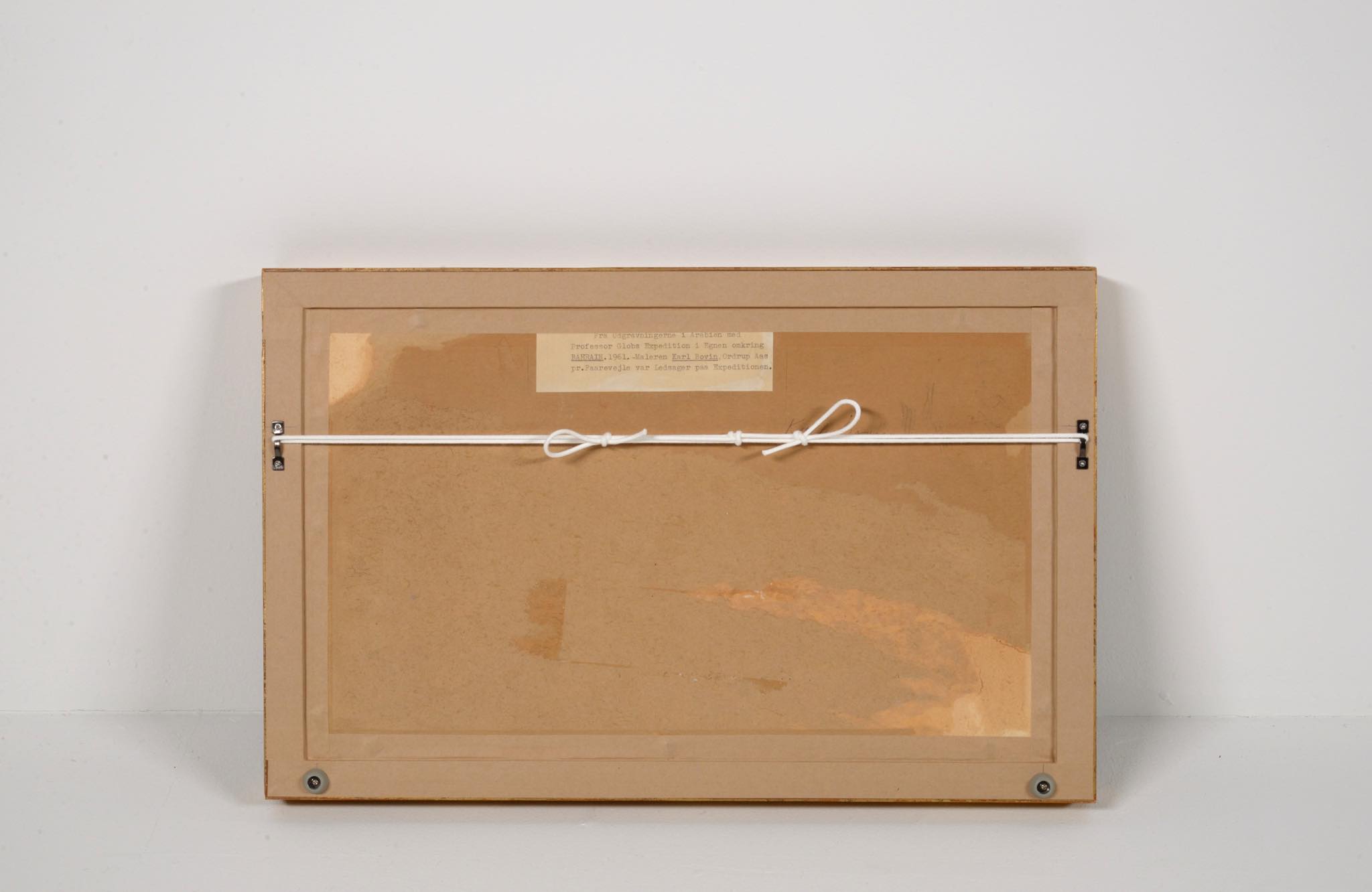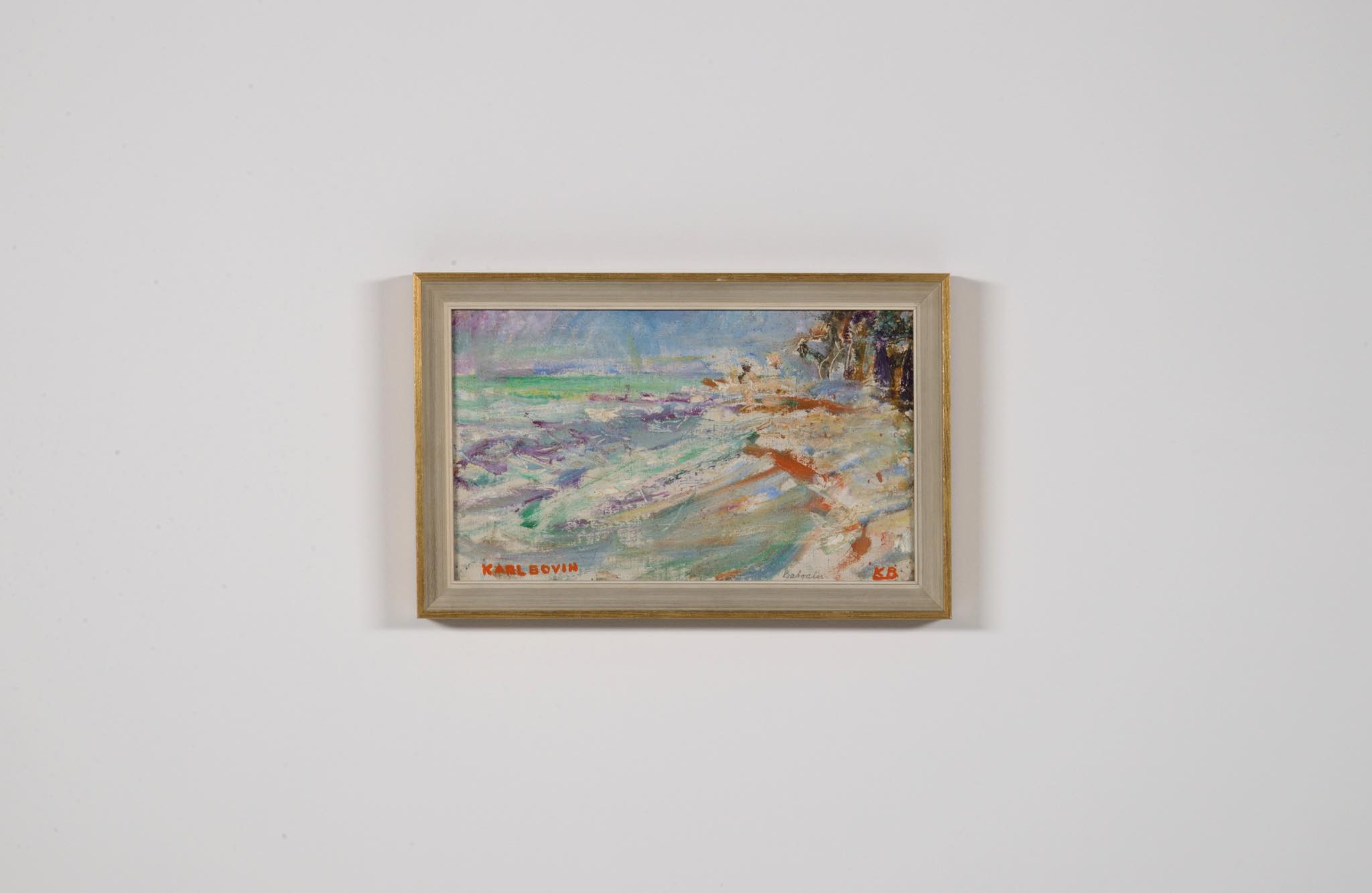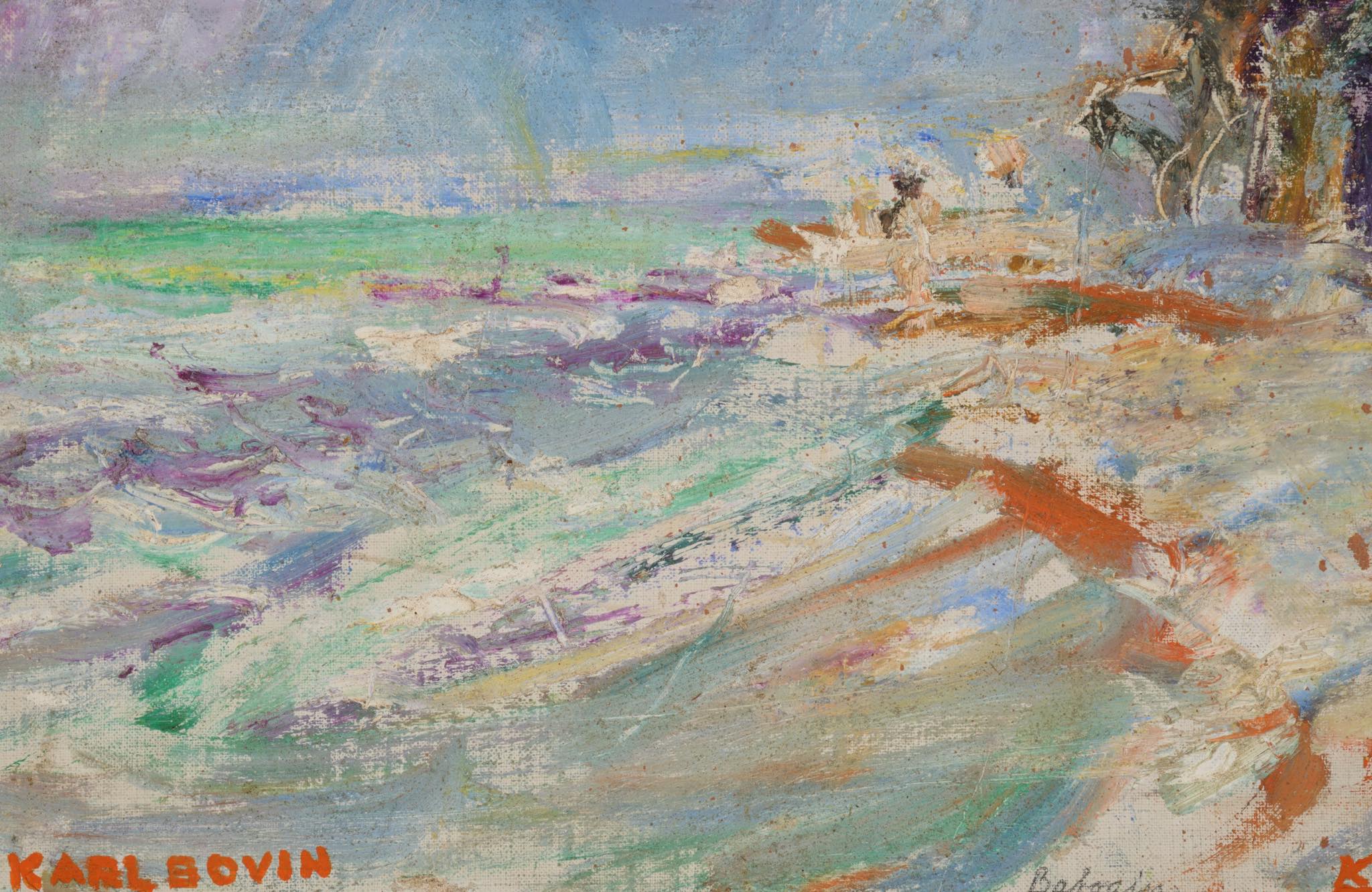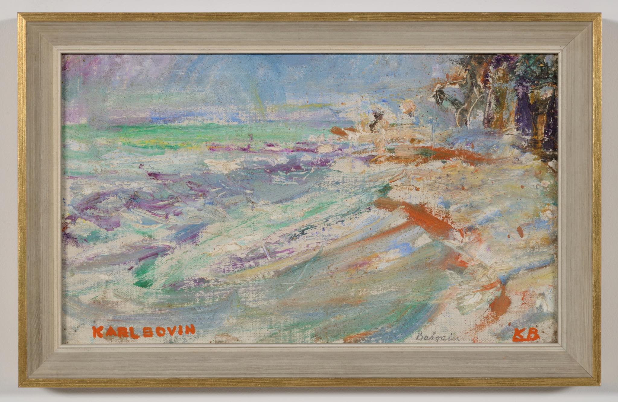 デンマークの画家、Karl Bovin/カール・ボヴィンによる風景画作品です。1961年、考古学者と一緒に中東のバーレーンを旅した際に描かれたものです。水平線や地平線を高めに描くのはボヴィン特有の構図で、抽象的で眩しさを感じる風景画です。玄関にも飾れるくらいの小振りなサイズ感です。フレームはオリジナル、コンディションは良好です。