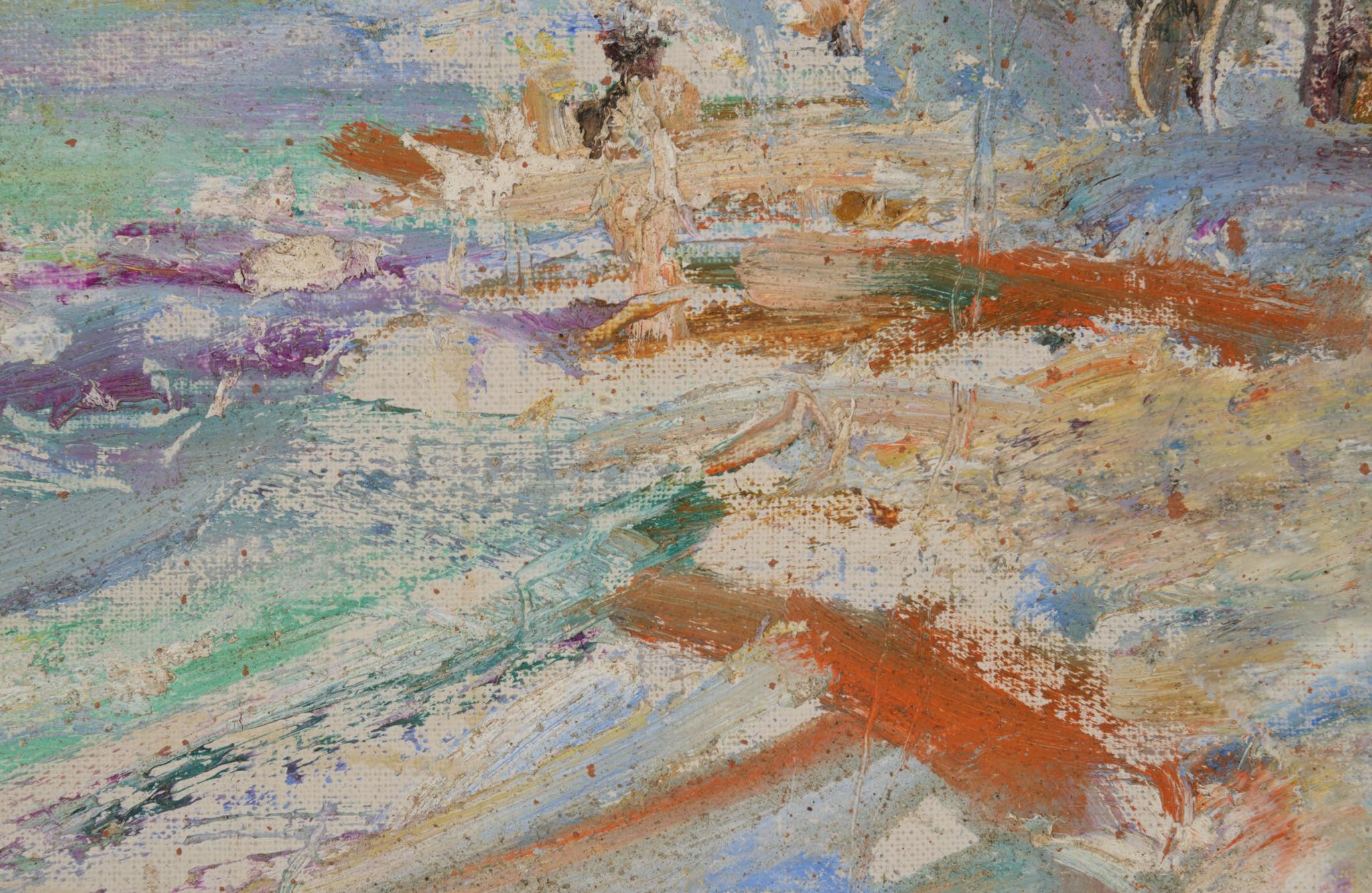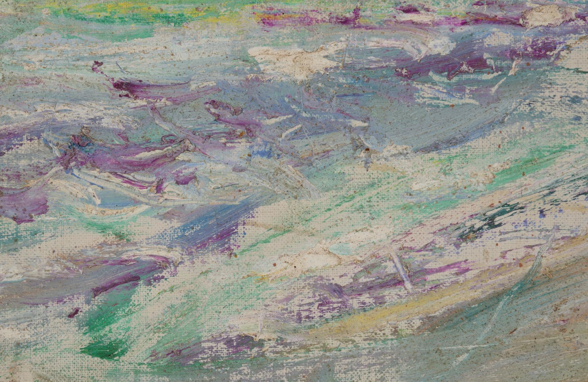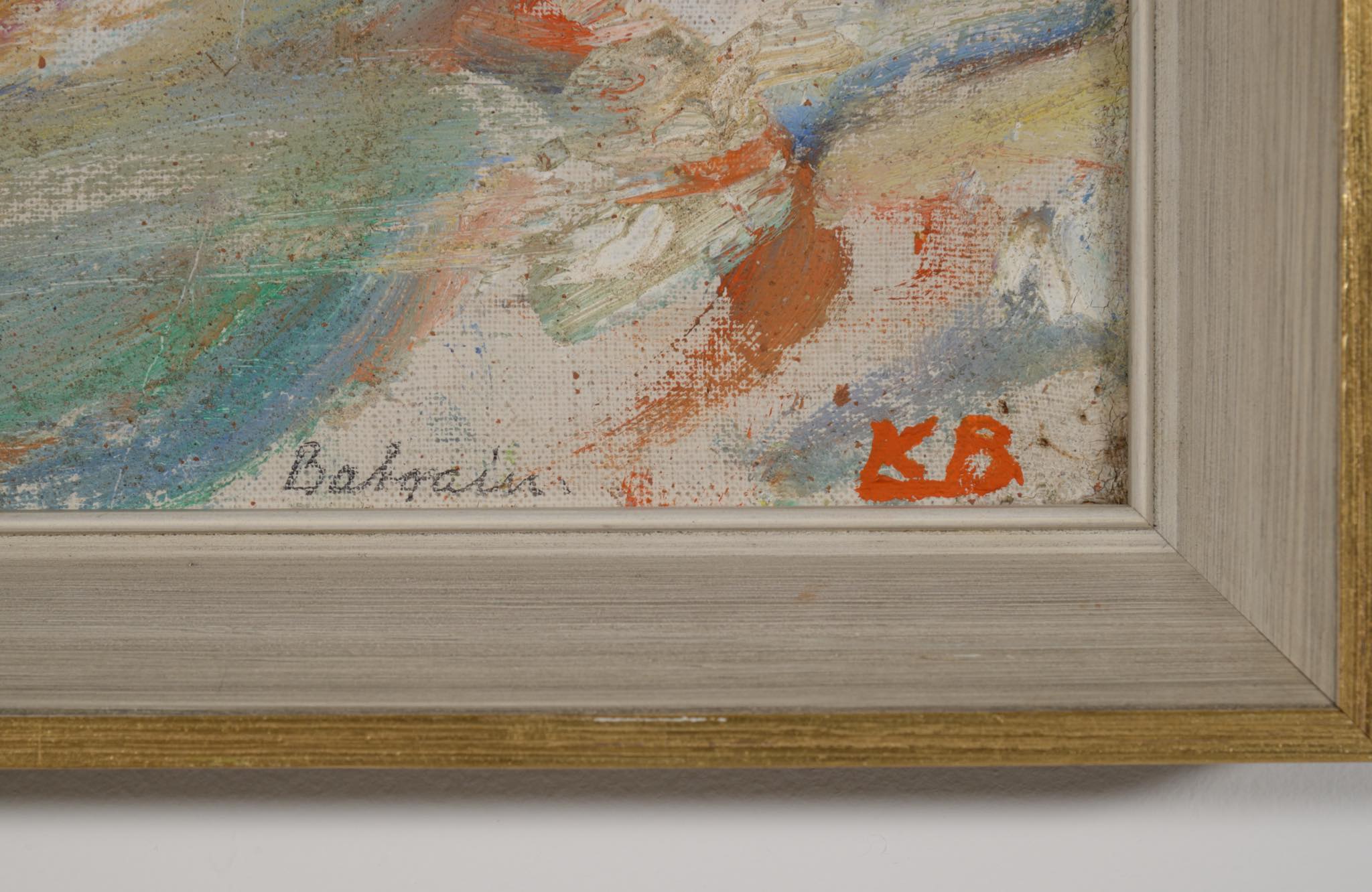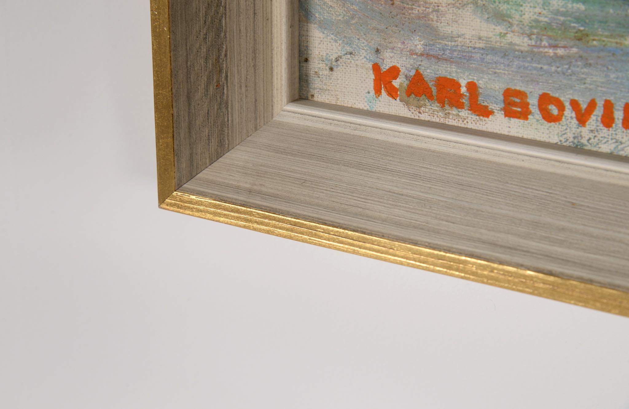 デンマークの画家、Karl Bovin/カール・ボヴィンによる風景画作品です。1961年、考古学者と一緒に中東のバーレーンを旅した際に描かれたものです。水平線や地平線を高めに描くのはボヴィン特有の構図で、抽象的で眩しさを感じる風景画です。玄関にも飾れるくらいの小振りなサイズ感です。フレームはオリジナル、コンディションは良好です。