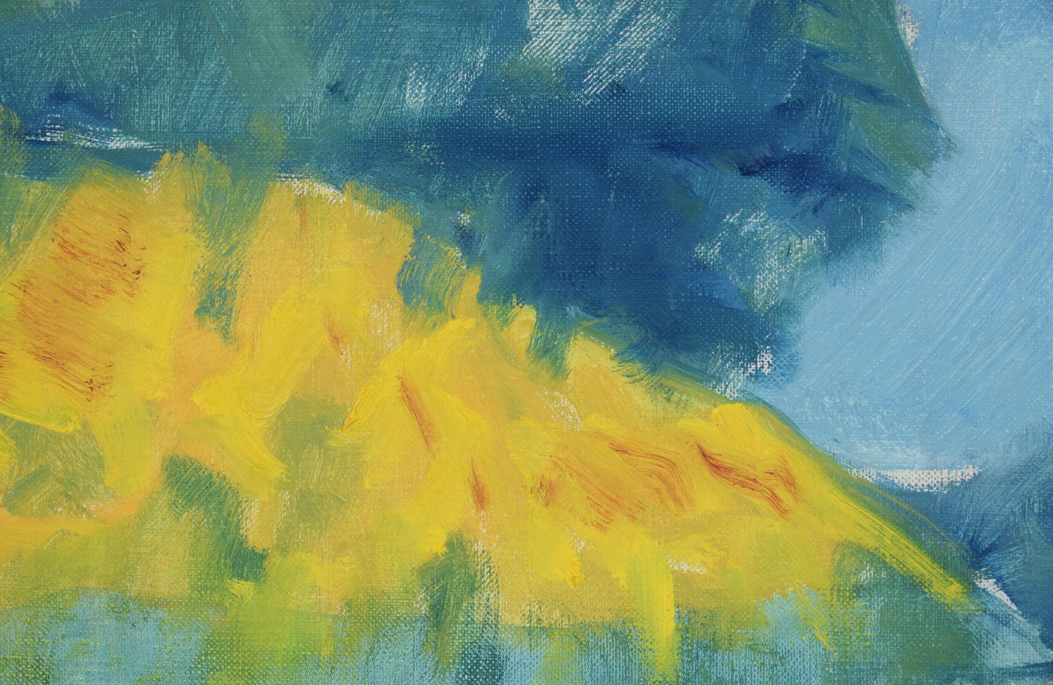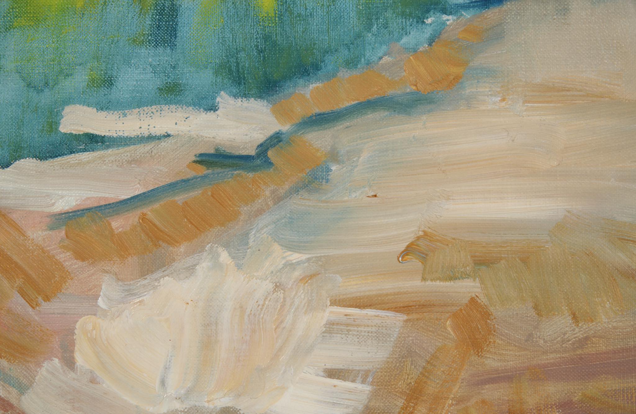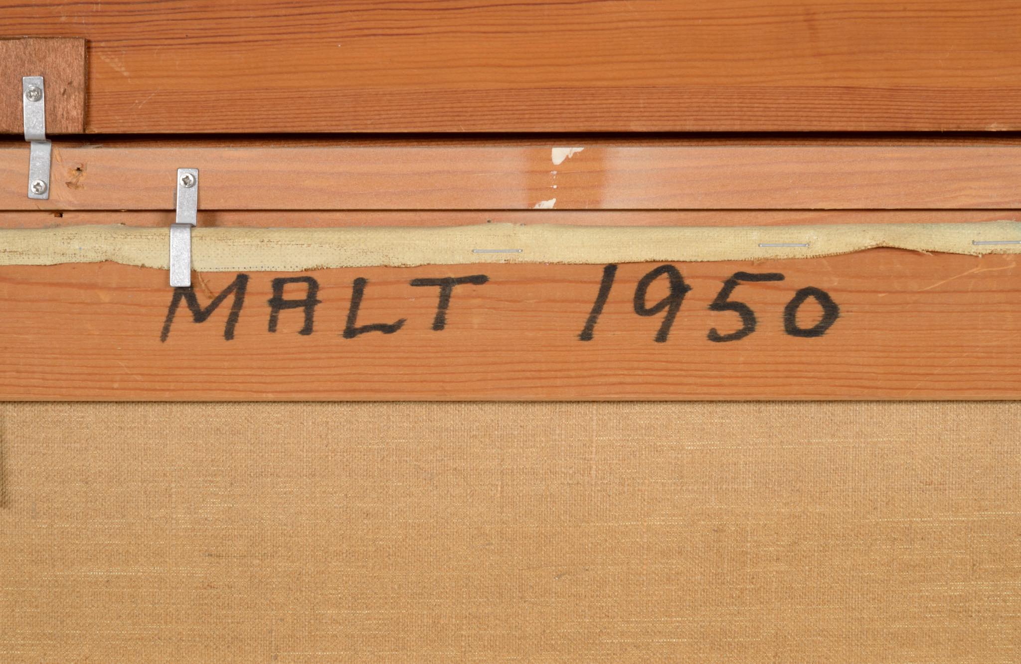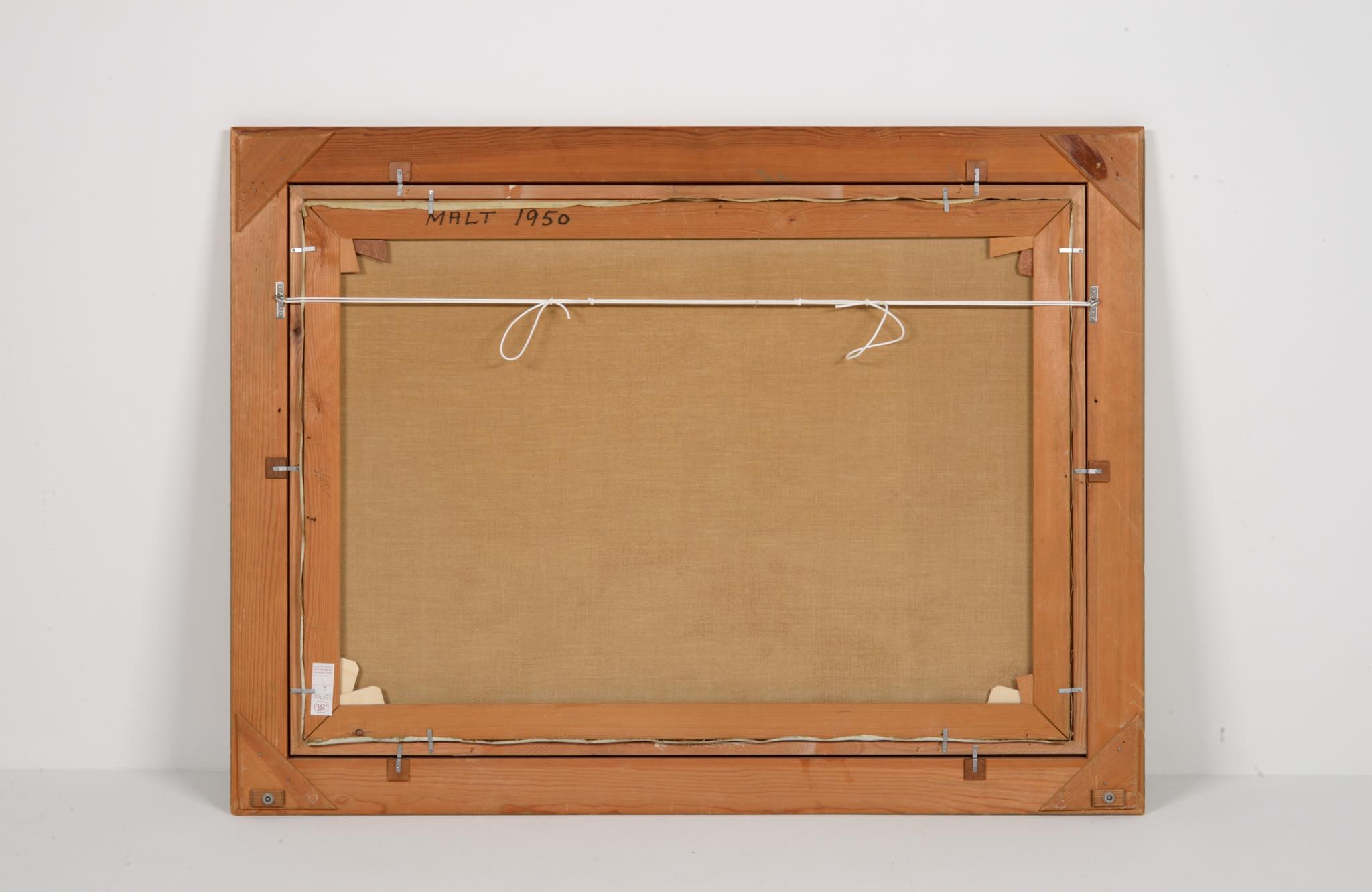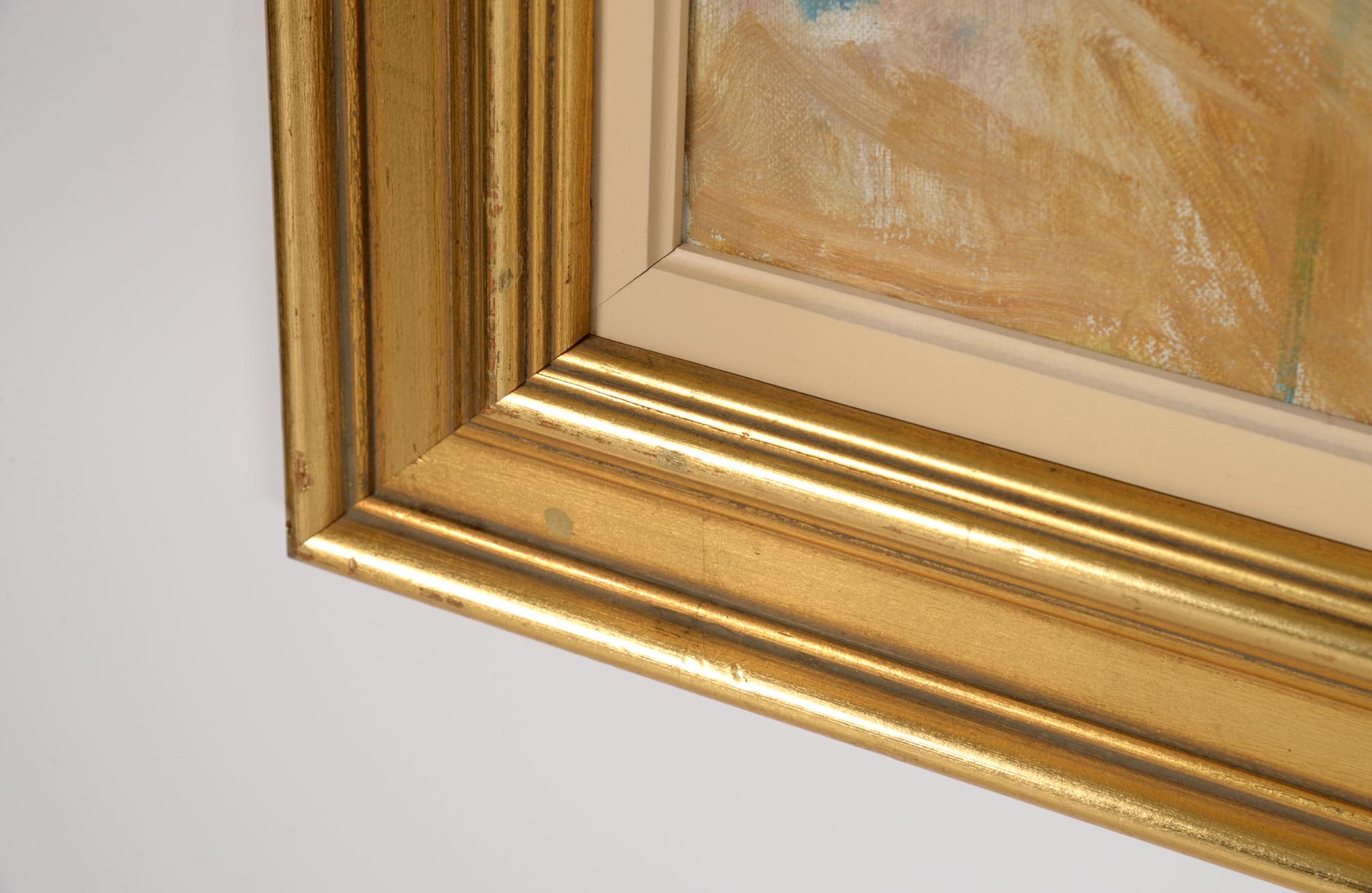 デンマークの画家、Axel P. Jensen/アクセル・P・イェンセンによる風景画油彩作品です。側に咲くのは夏のお花でしょうか。背面の書き込みはタイトルのようで、デンマーク、ユトランド半島の中南部に位置する小さな集落「MALT」の風景を描いたものでしょう。おおらかな筆づかいで描かれた大きめの作品です。金箔のフレームはオリジナルで、フレームの内側のライナーに経年劣化が見られたため彩色で補っています。全体に綺麗な状態です。