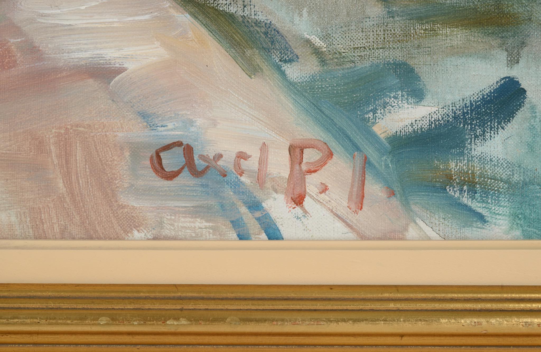 アクセル・ペダー・イェンセンは、デンマークのフュン島出身の画家で、1903年よりオールボーの技術学校にて学んだ後、1908年より巨匠ヨハン・ロードに学びます。静物画の他、季節の移り変わりやその光景、風、変わりゆく天気などを捉えた素朴な風景画を好んで描きました。