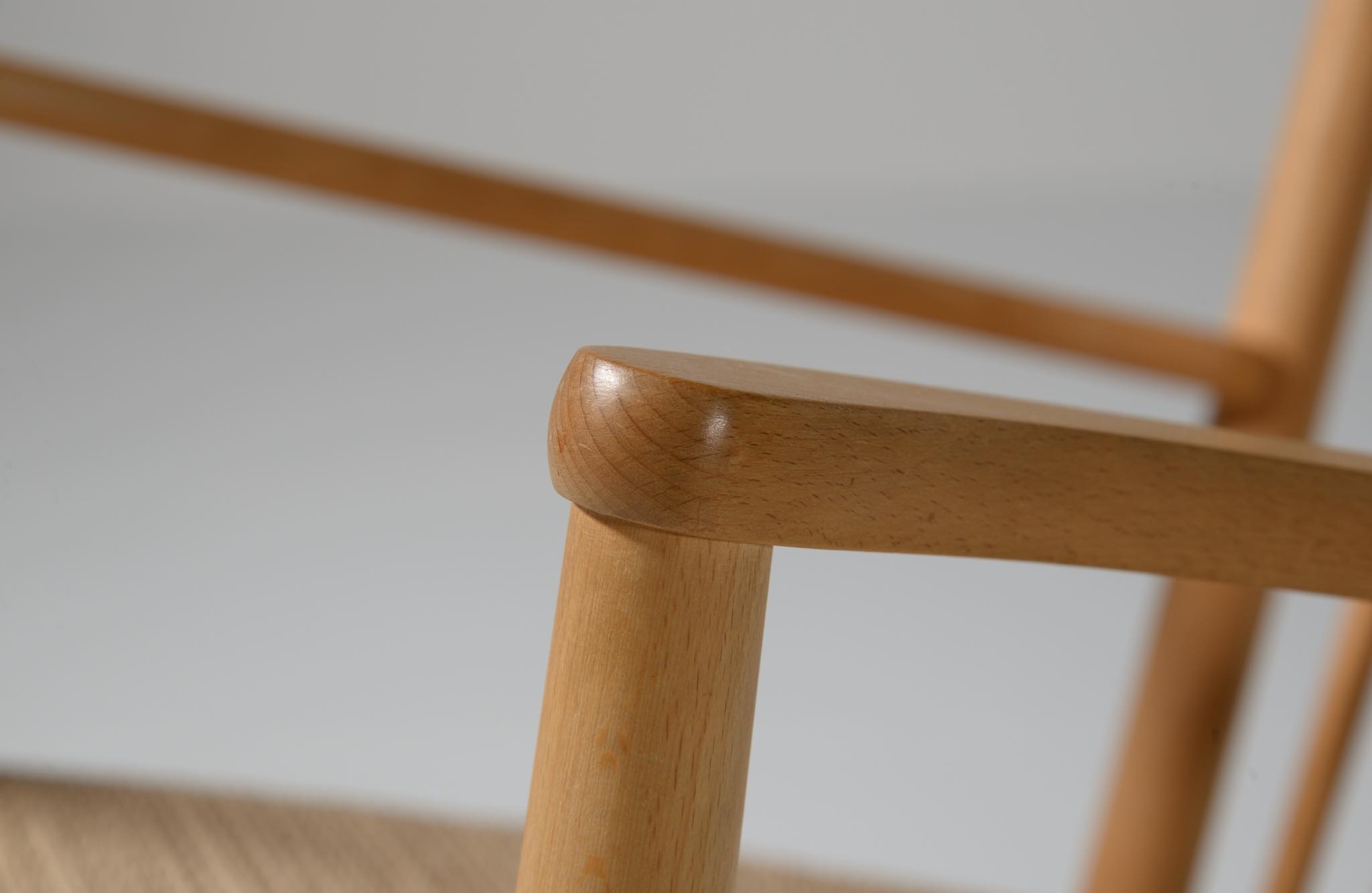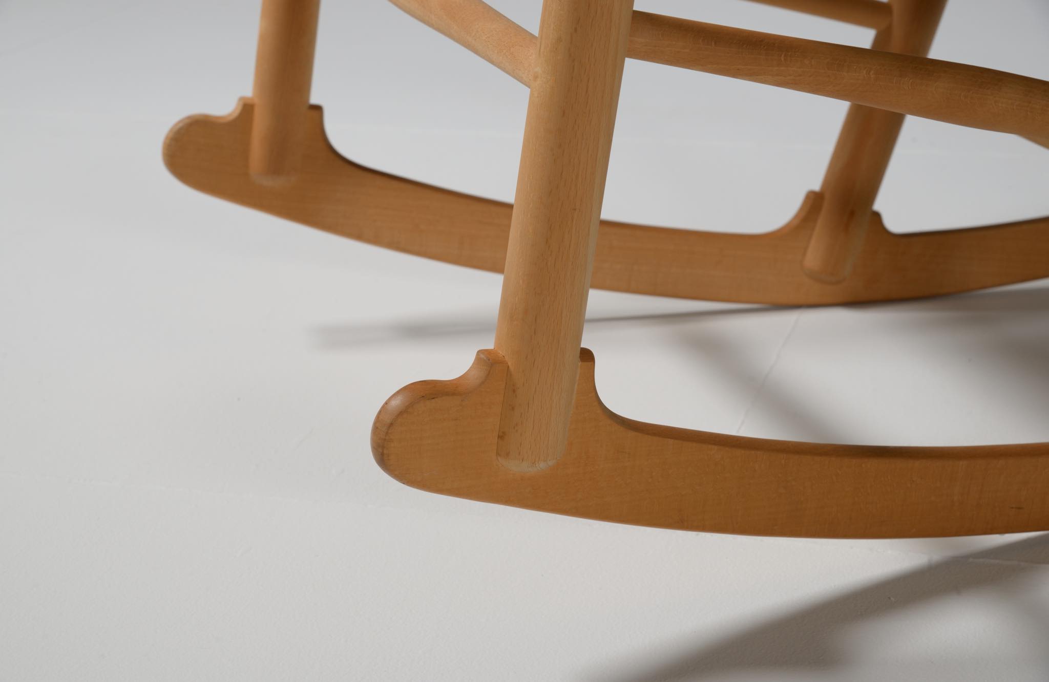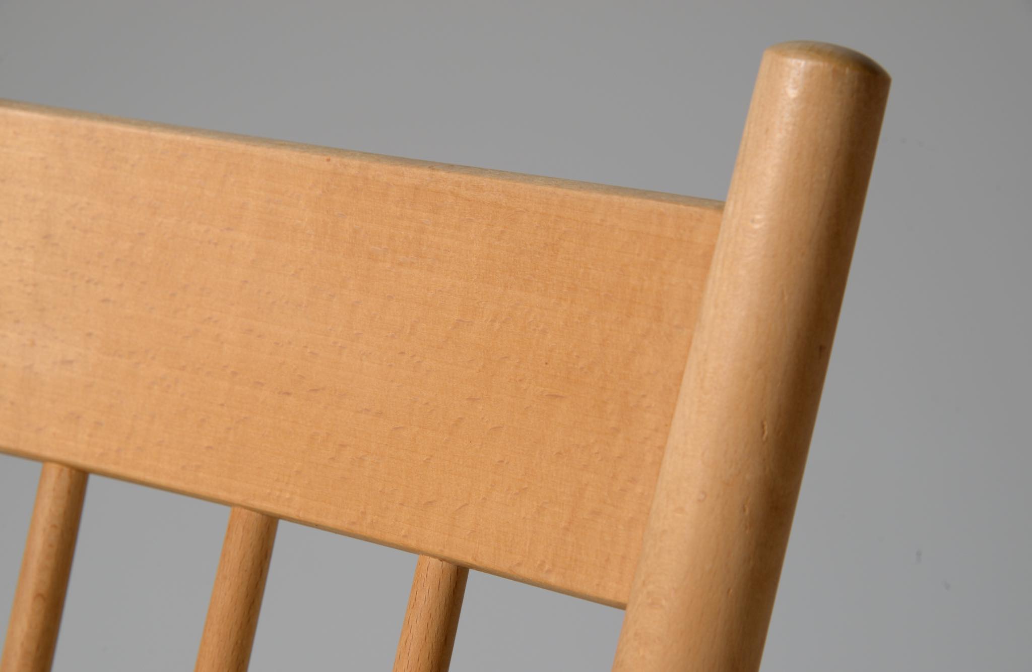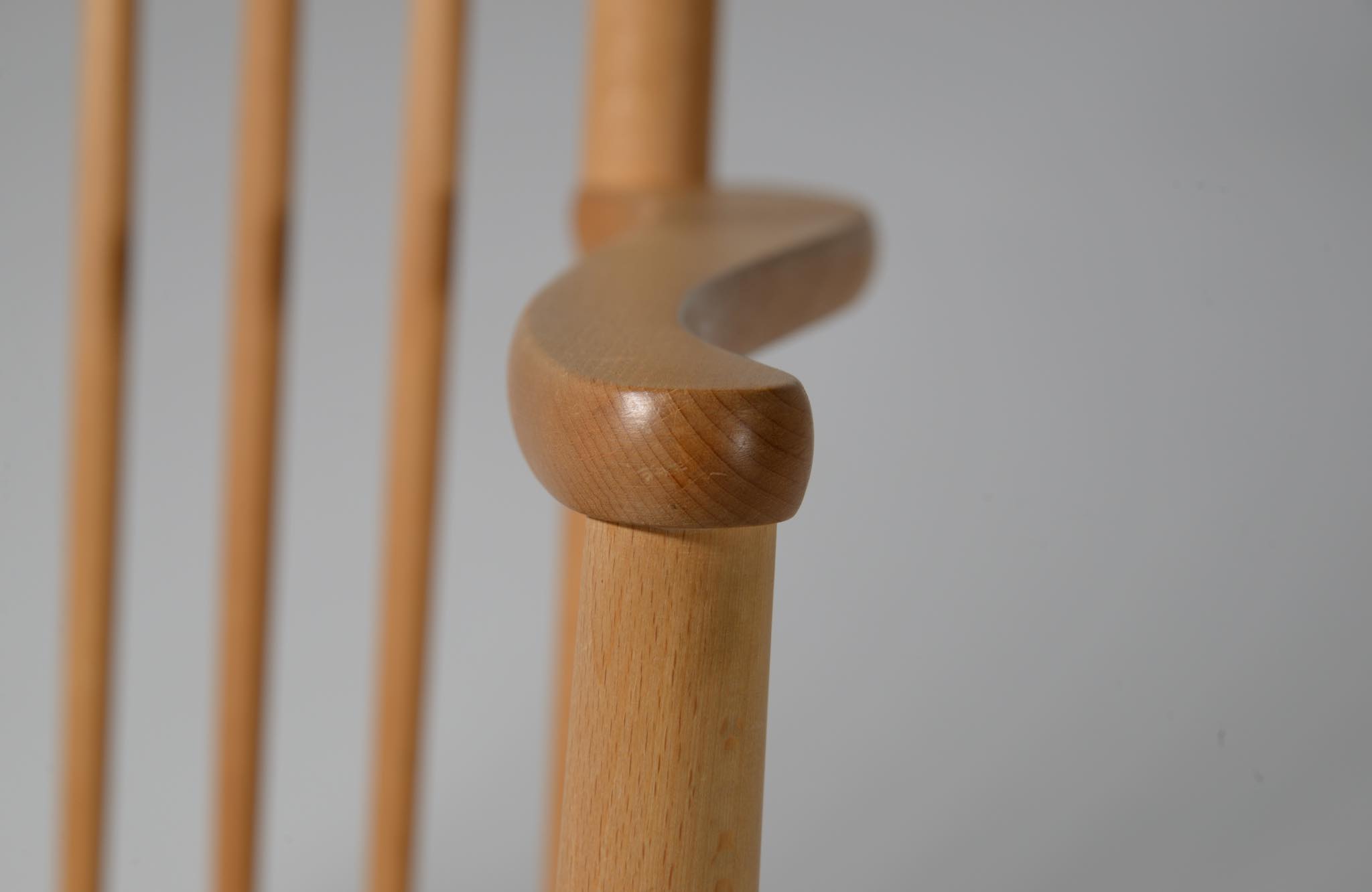 デンマークを代表する家具デザイナーのHans J. Wegner/ハンス・ウェグナーによる ”J16" ロッキングチェアです。FDB生活協同組合によって1944年に発表、生産されたもので、KVIST社を経て、現在もKVIST社と合併したFREDERICA社で生産が受け継がれているロングセラーモデルです。当時妊娠中だった妻のインガ夫人のために、軽く、座り易く、楽に立ち上がれるよう、やがて生まれてくる赤ちゃんを抱っこする母親の為に、延いては一緒に座ることで赤ちゃんのゆりかごにも使えるようデザインされたもので、当時FDB生活協同組合の家具部門のチーフディレクターを務めていたボーエ・モーエンセンが開発に関わったとも云われており、シェーカー様式とウインザー様式をミックスさせ、モダンで軽やかに仕上げられた作品です。こちらはFDB生活協同組合で後期に作られたものとしてデンマークで扱われていましたが、FDBとは刻印が異なるため、後の工房 KVIST社の製品かと思われます。本体はビーチ材、ソープフィニッシュで仕上げました。座面は新たなペーパーコードにて張り替えています。コンディションは良好です。