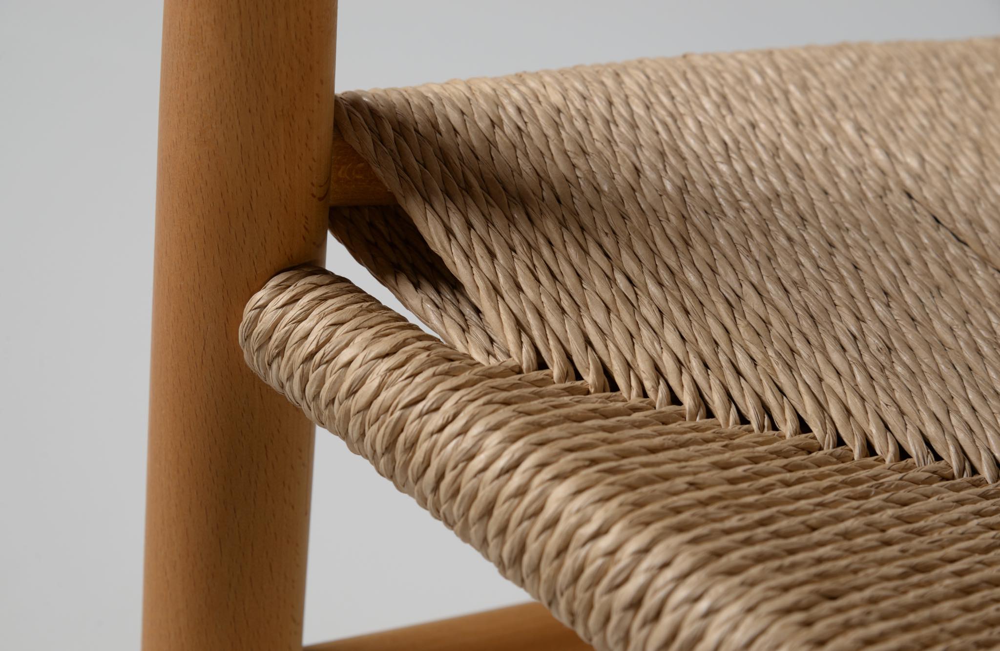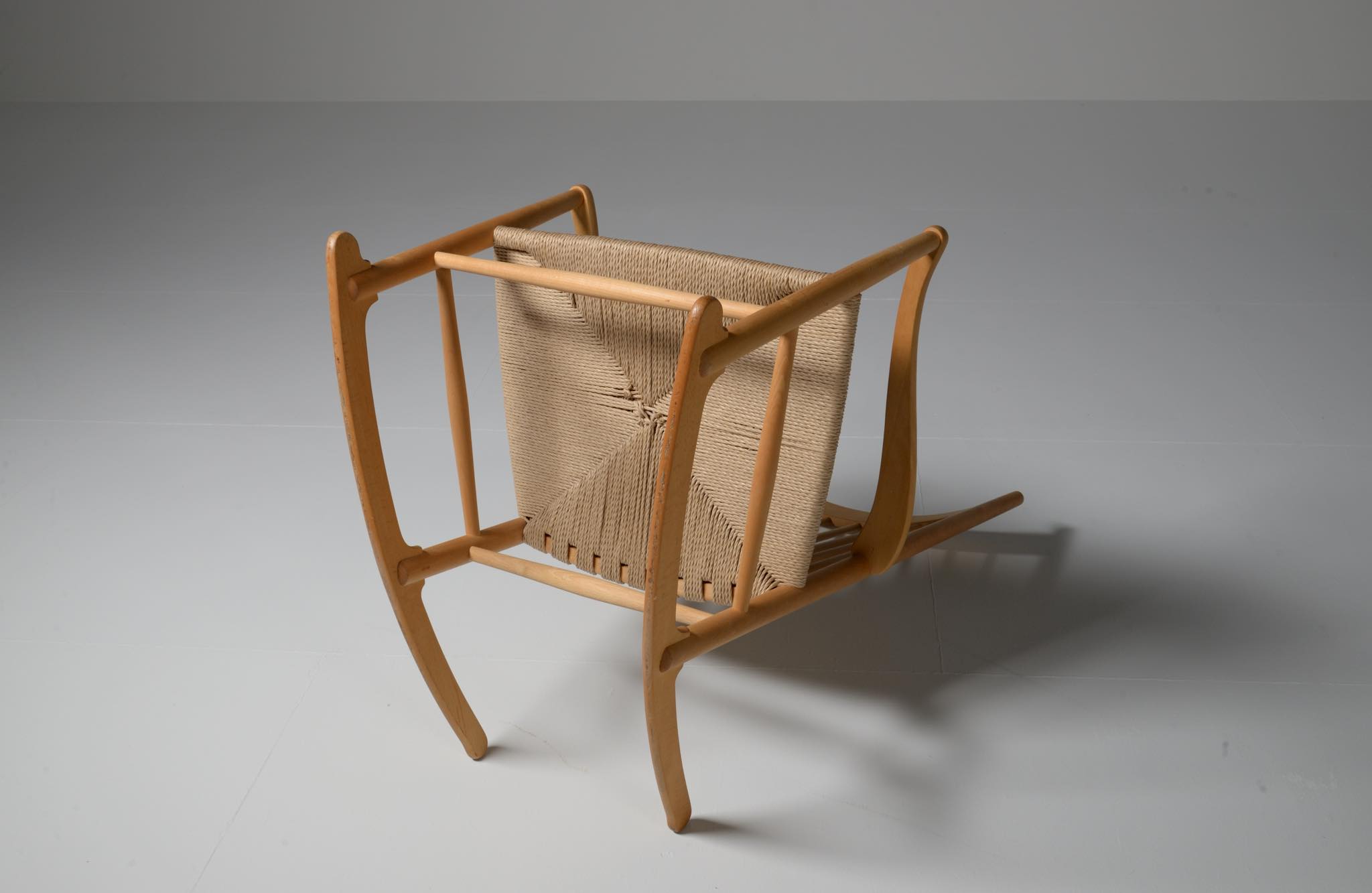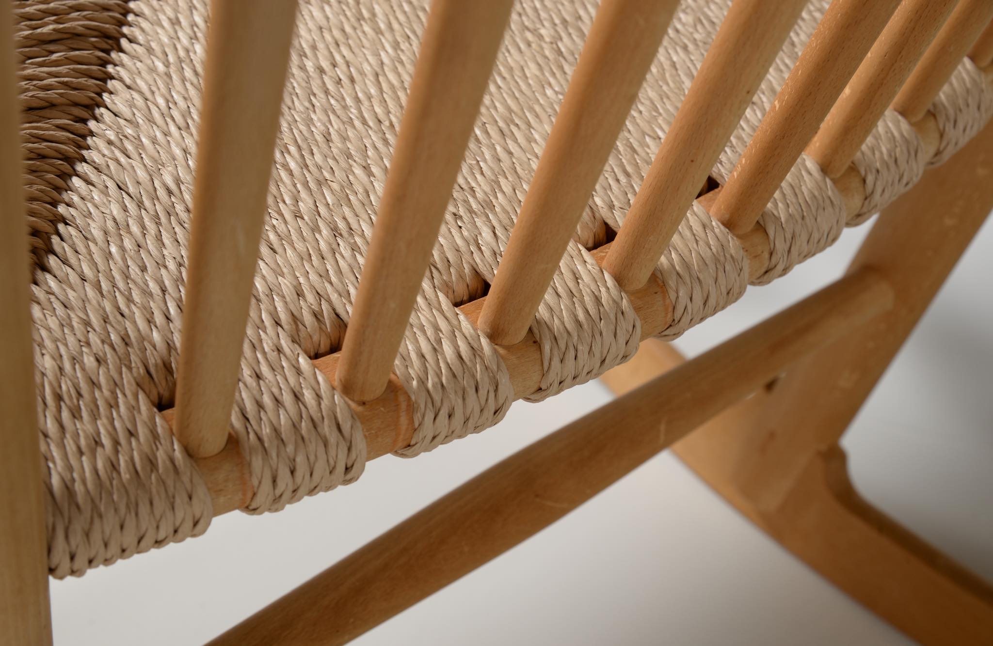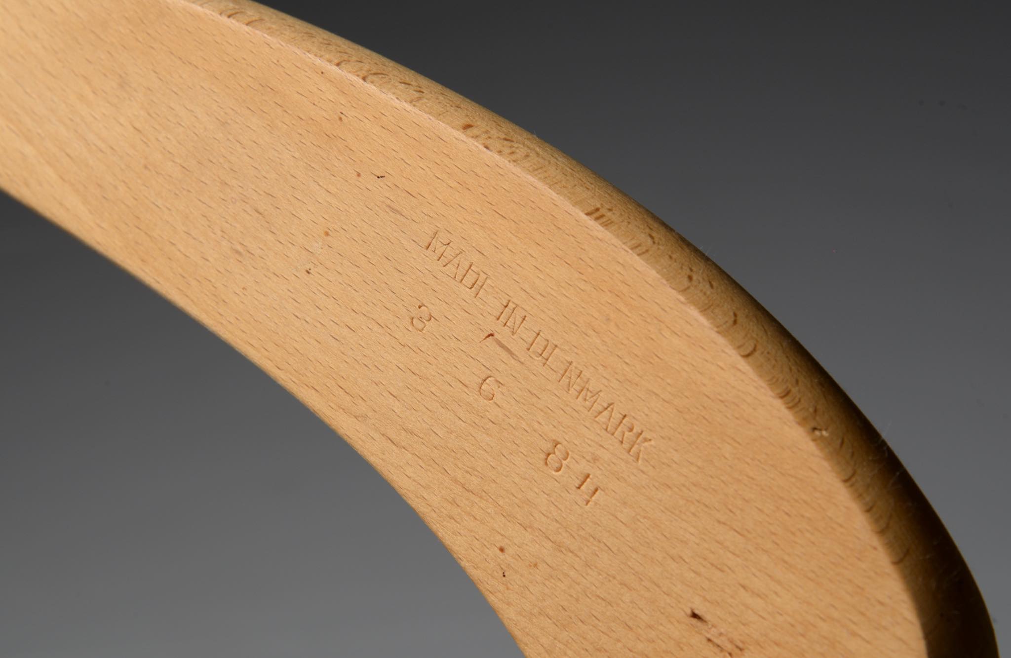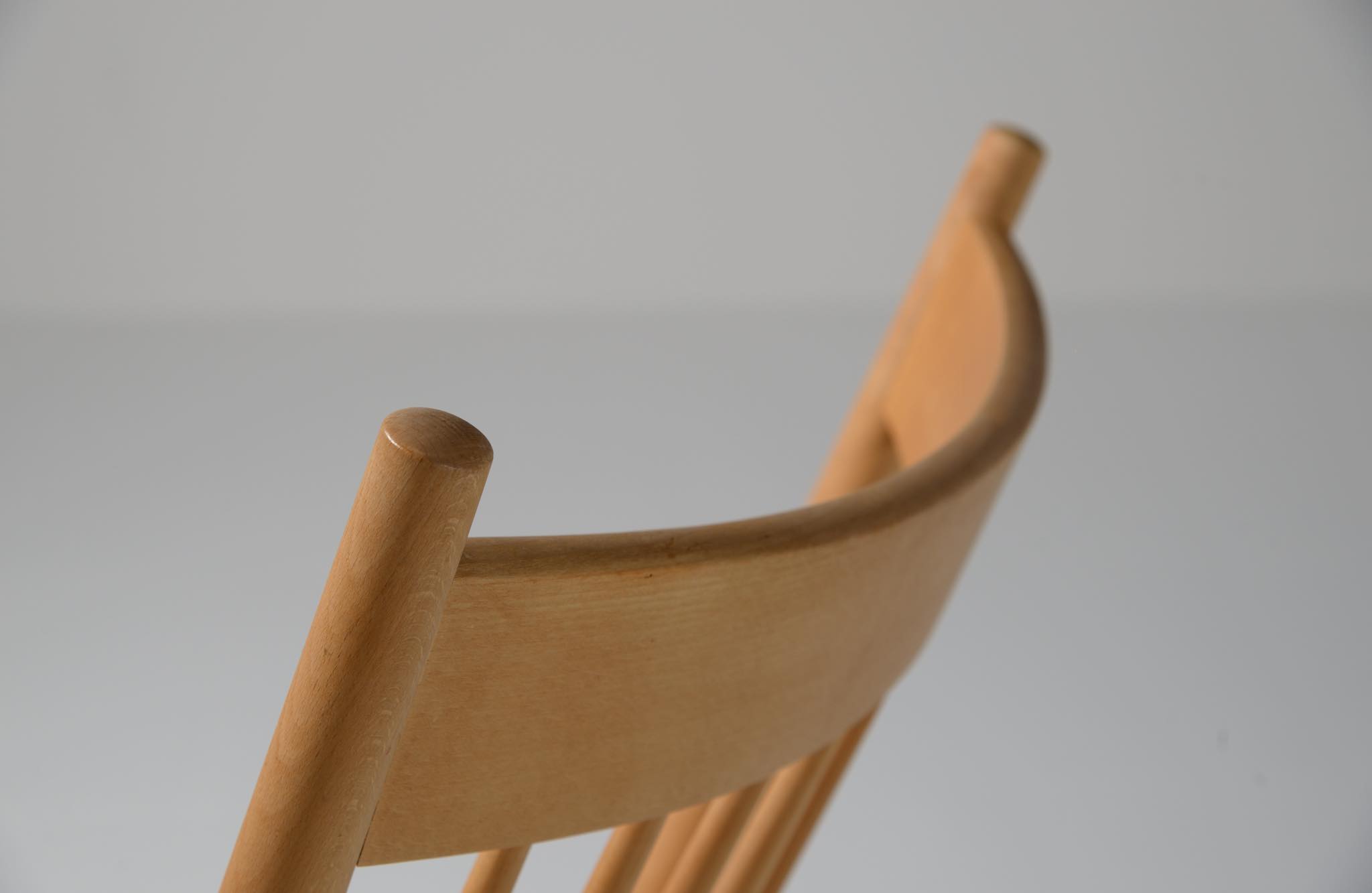デンマークを代表する家具デザイナーのHans J. Wegner/ハンス・ウェグナーによる ”J16" ロッキングチェアです。FDB生活協同組合によって1944年に発表、生産されたもので、KVIST社を経て、現在もKVIST社と合併したFREDERICA社で生産が受け継がれているロングセラーモデルです。当時妊娠中だった妻のインガ夫人のために、軽く、座り易く、楽に立ち上がれるよう、やがて生まれてくる赤ちゃんを抱っこする母親の為に、延いては一緒に座ることで赤ちゃんのゆりかごにも使えるようデザインされたもので、当時FDB生活協同組合の家具部門のチーフディレクターを務めていたボーエ・モーエンセンが開発に関わったとも云われており、シェーカー様式とウインザー様式をミックスさせ、モダンで軽やかに仕上げられた作品です。こちらはFDB生活協同組合で後期に作られたものとしてデンマークで扱われていましたが、FDBとは刻印が異なるため、後の工房 KVIST社の製品かと思われます。本体はビーチ材、ソープフィニッシュで仕上げました。座面は新たなペーパーコードにて張り替えています。コンディションは良好です。