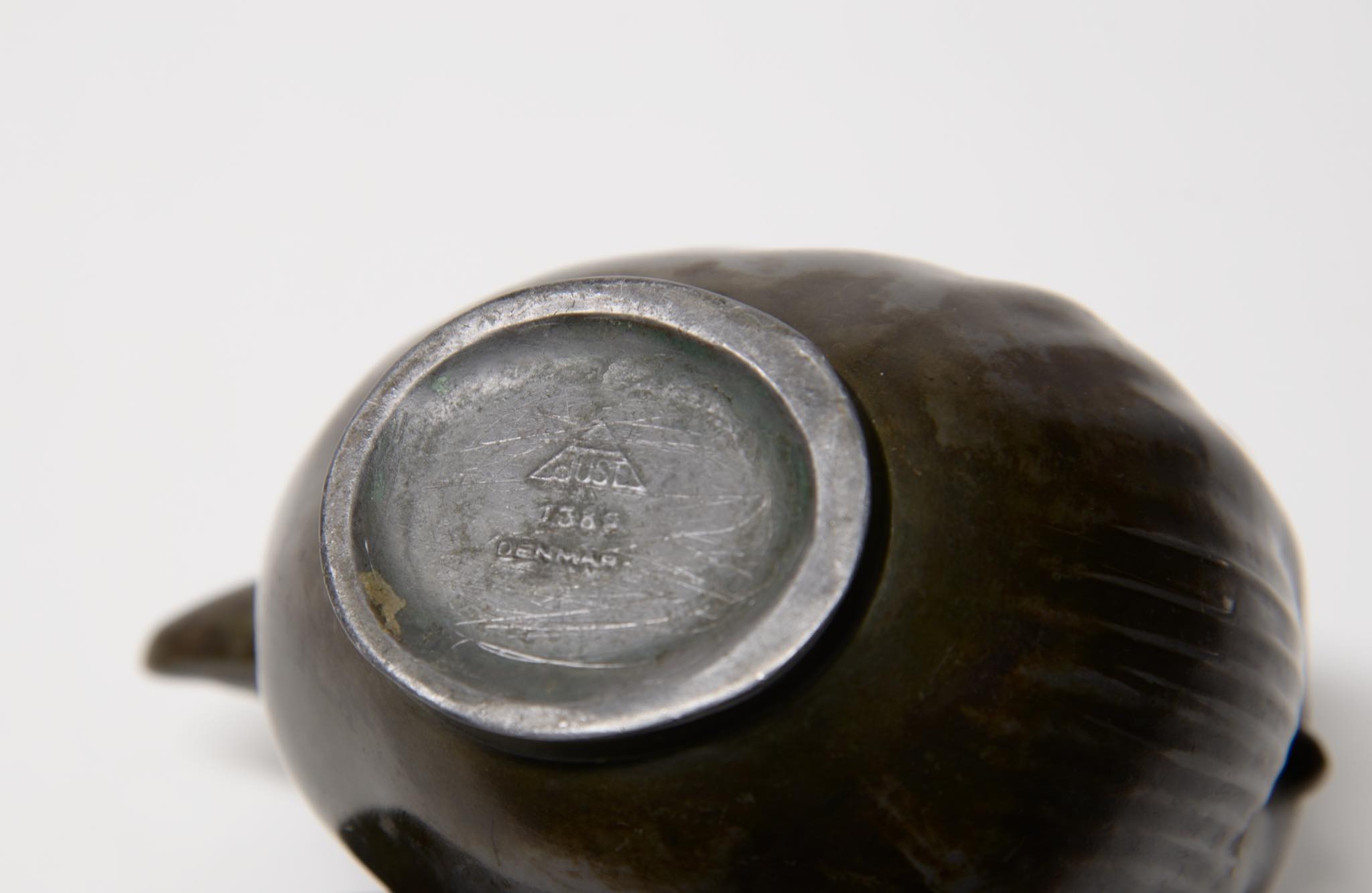 鉛やアンチモン等を配合し、ベースやフィギュアなどの型へ鋳込んで形成、表面を褐色に彩色したもので、ユスト・アナセンによって独自に開発された素材。故郷グリーンランドのディスコ湾の深緑色を呈した海面に色調が似ていることからDisko Metal/ディスコメタルと命名し、1925年に開催されたパリ万博にて発表されました。ブロンズに比べ材料のコストを大幅に削減できた新素材の製品は、デンマークのみならず世界中で販売され人気を博しました。