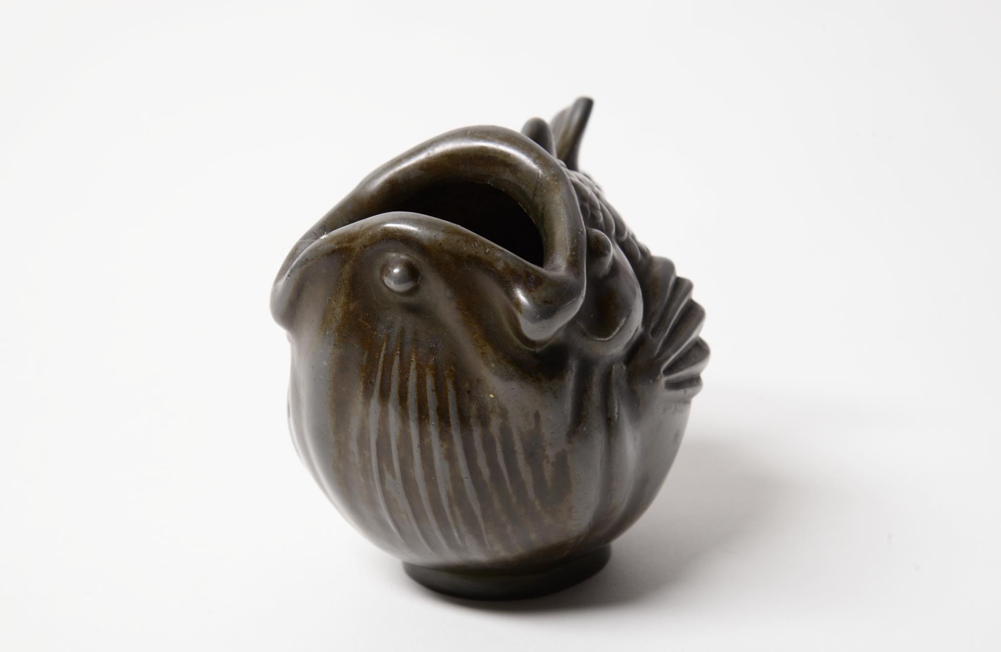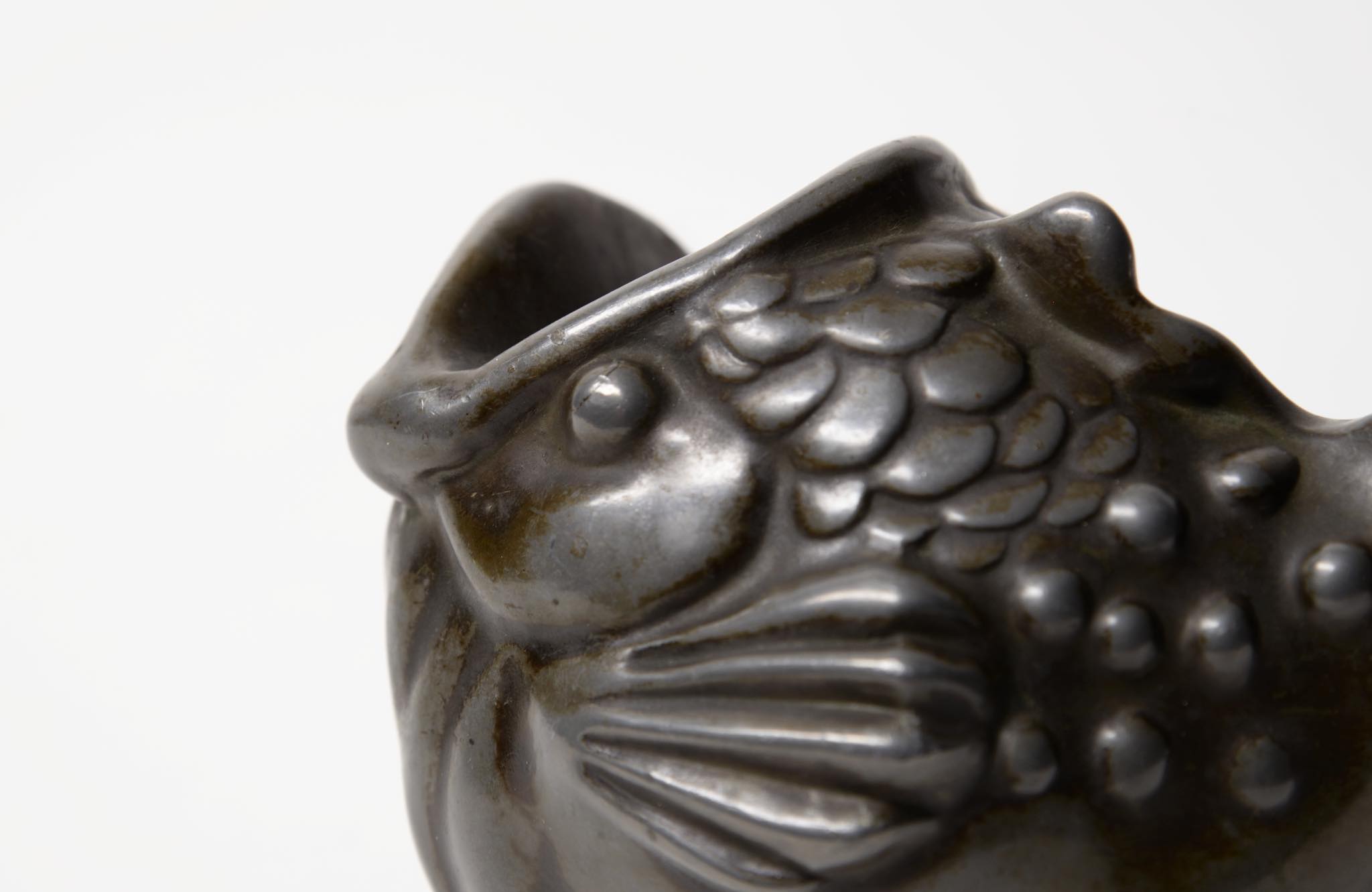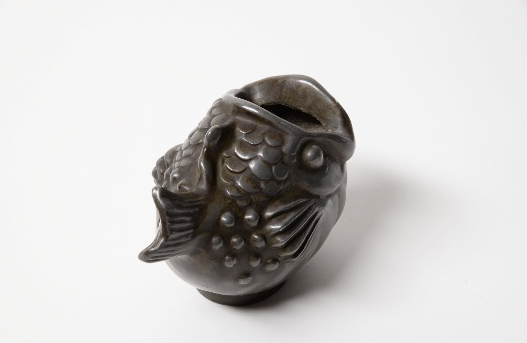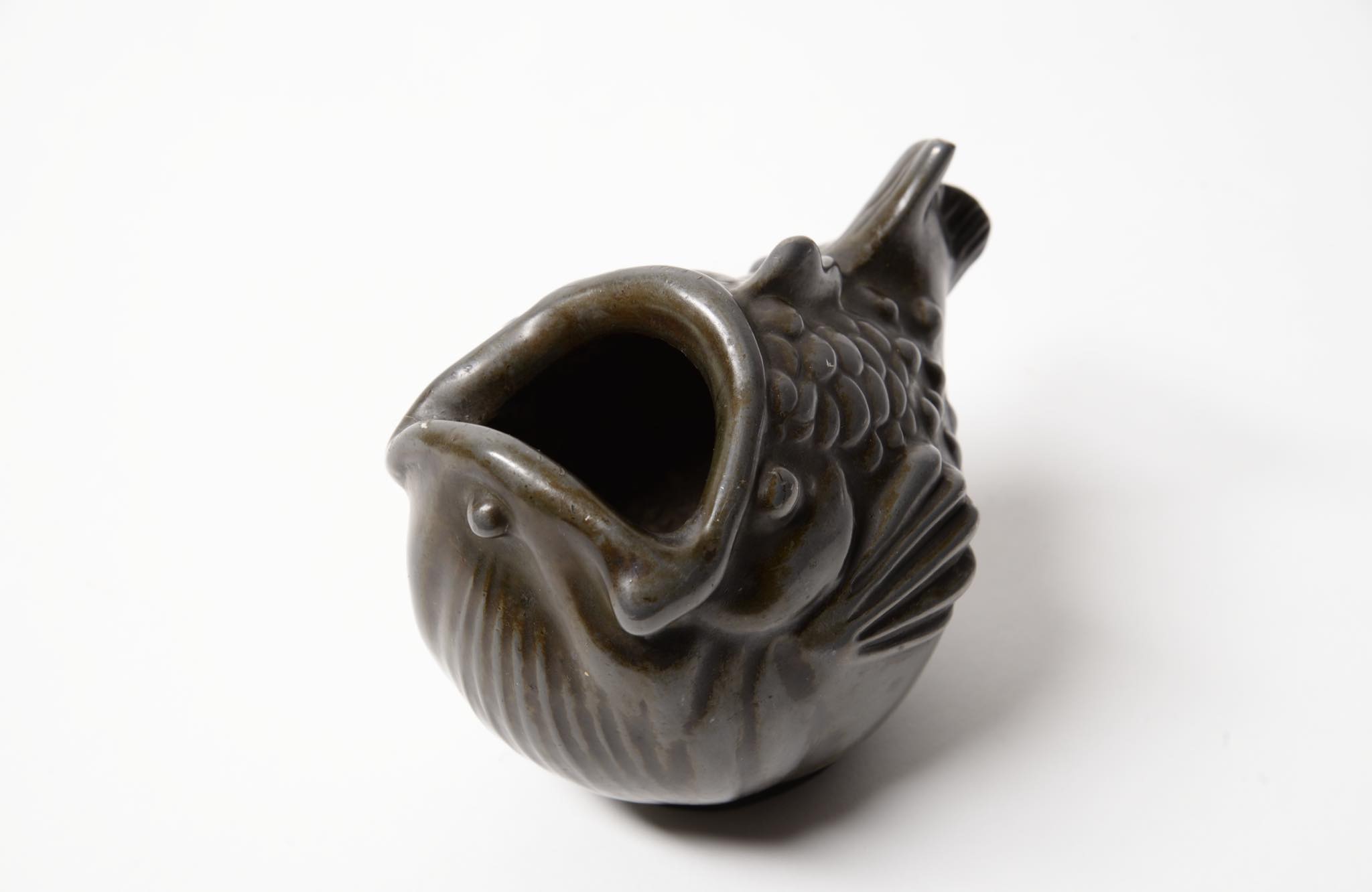 デンマークの金工作家、Just Andersen/ユスト・アナセンによるディスコメタル製の魚型のベースです。1920~30年代頃に作られたものでしょう。大きく口を開けた深海魚のような魚がモチーフで、花を生けることも可能です。表面のコーティングは擦れて地の色がやや露出しています。