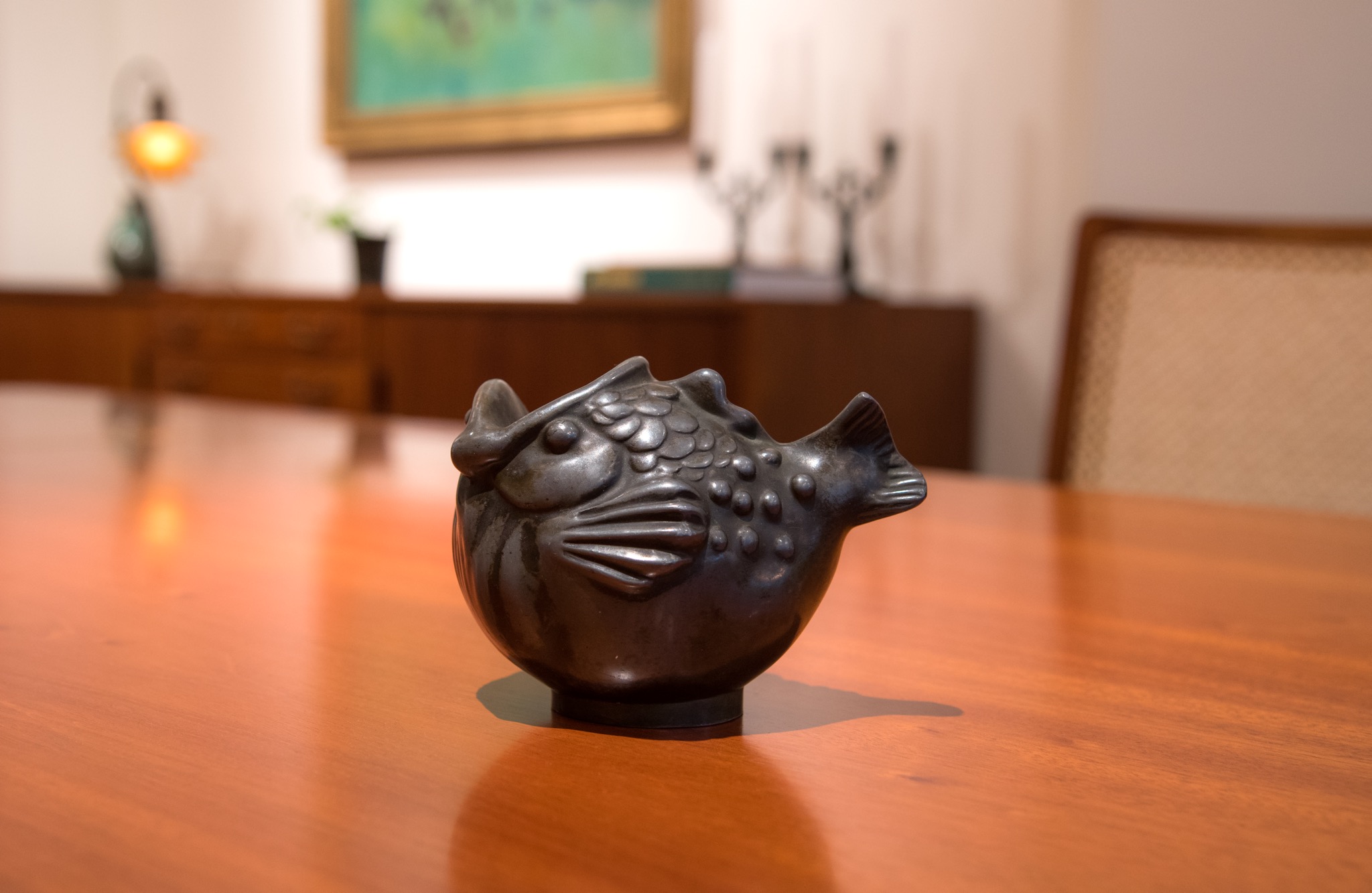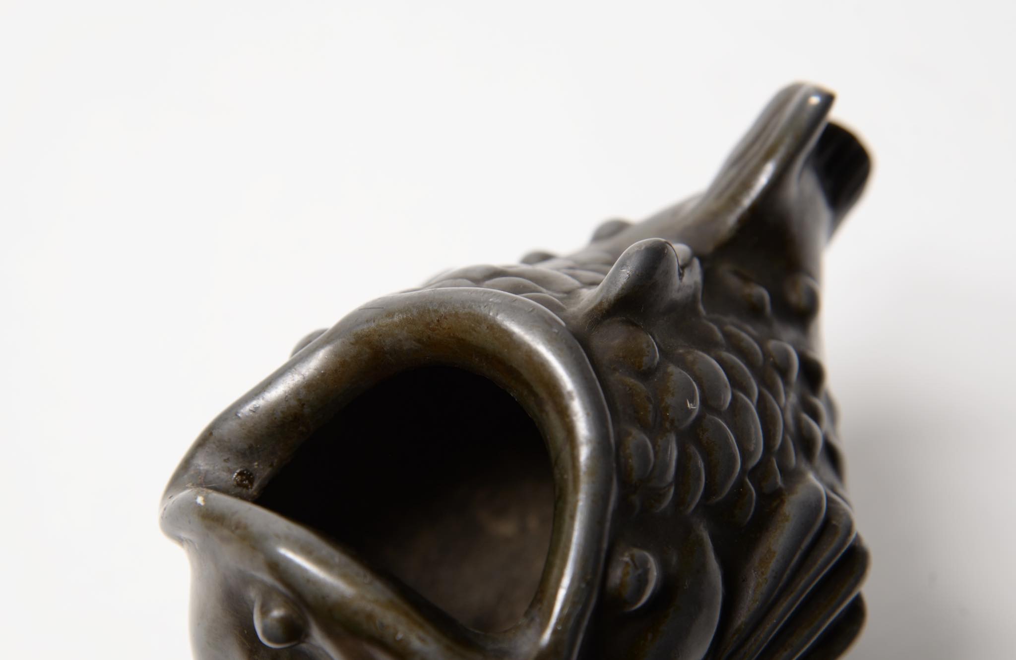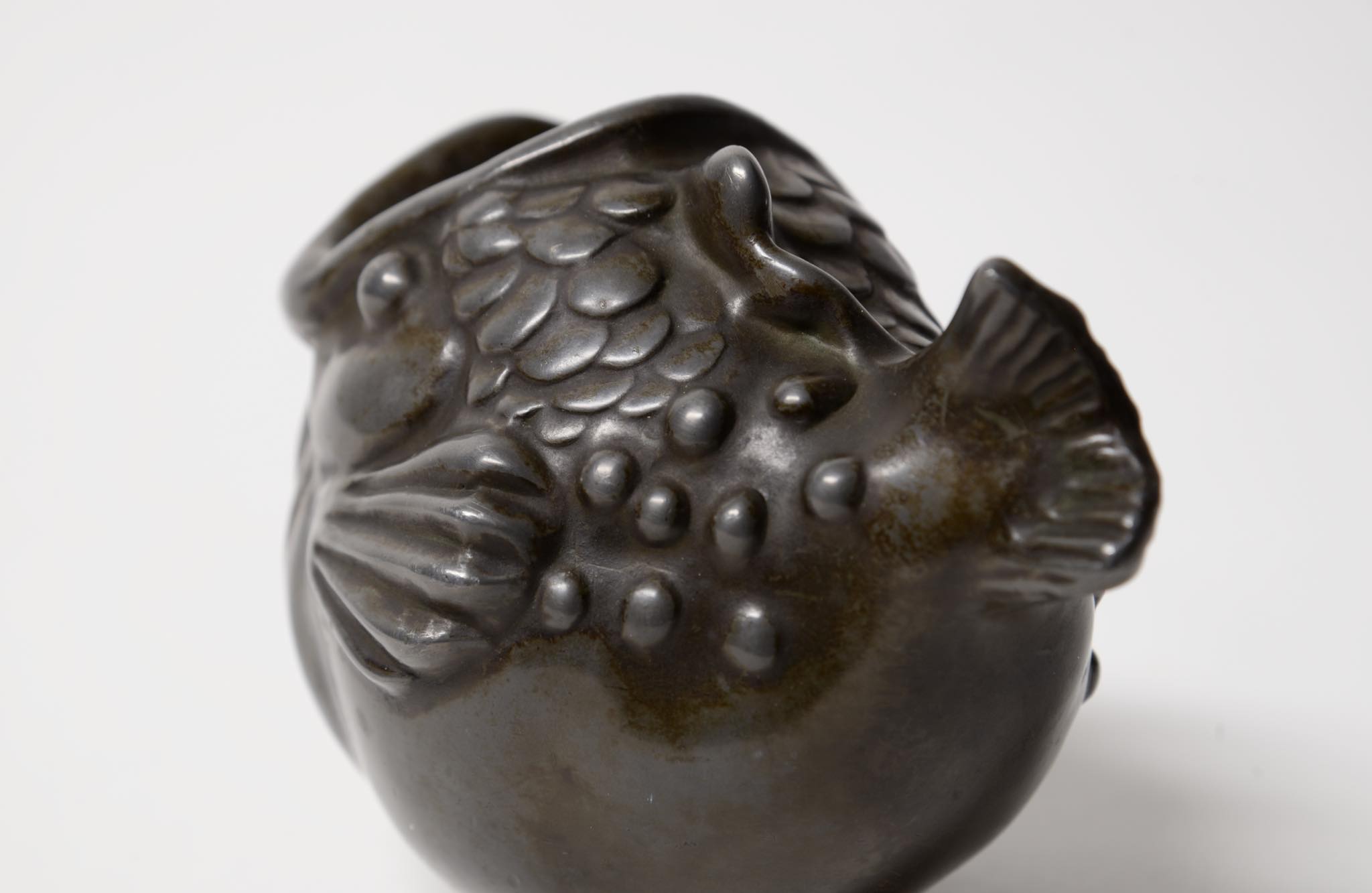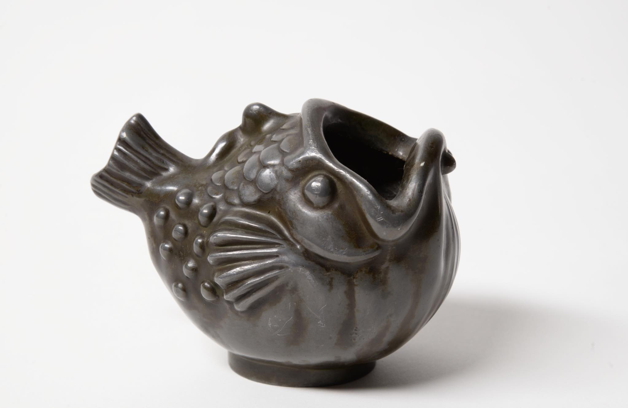 デンマークの金工作家、Just Andersen/ユスト・アナセンによるディスコメタル製の魚型のベースです。1920~30年代頃に作られたものでしょう。大きく口を開けた深海魚のような魚がモチーフで、花を生けることも可能です。表面のコーティングは擦れて地の色がやや露出しています。