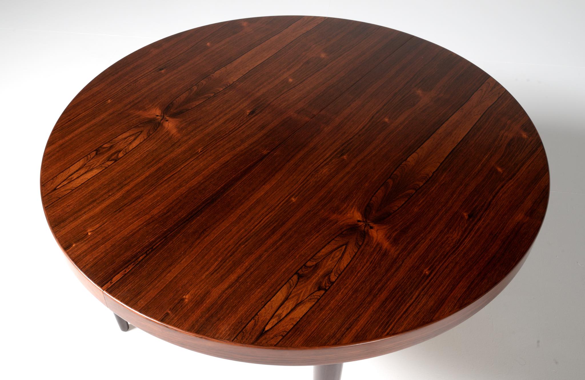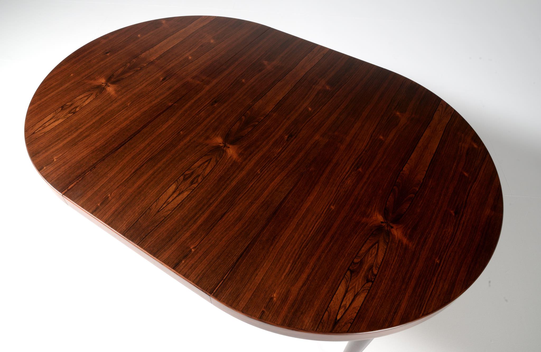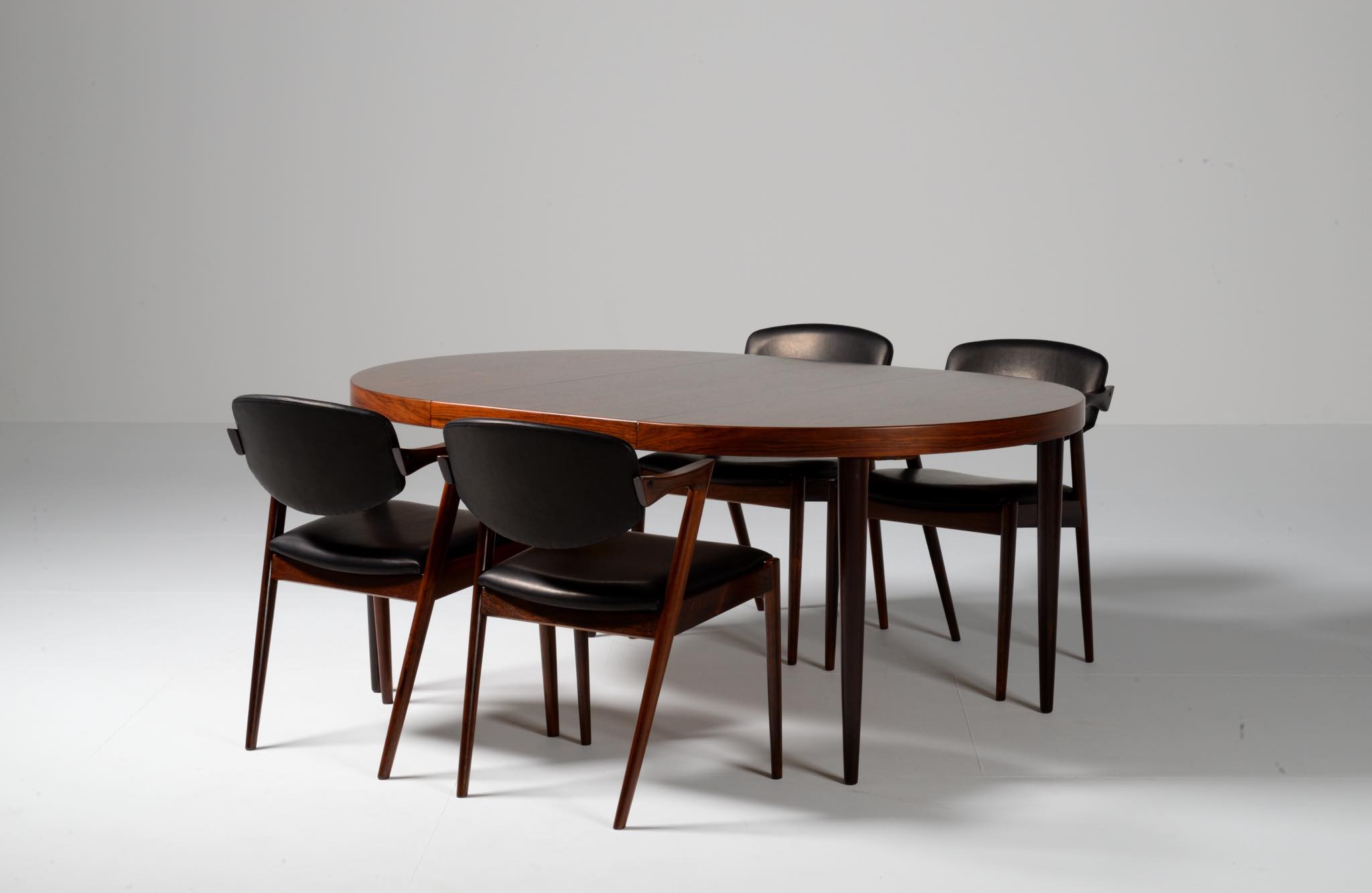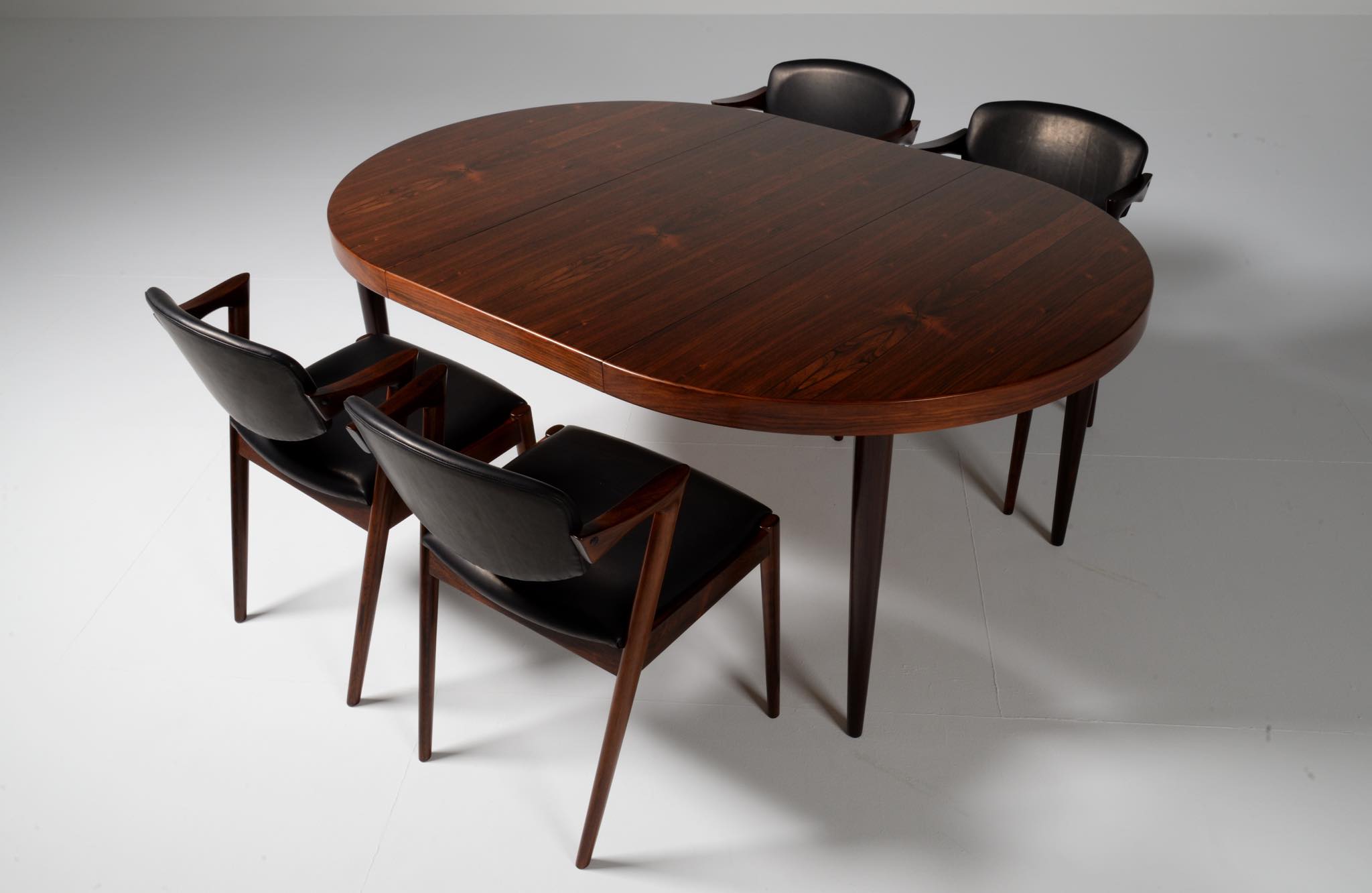 デンマークを代表する家具デザイナーのKai Kristiansen/カイ・クリスチャンセンによるダイニングテーブルです。幕板の作りに特徴のあるタイプで、斜めの線を排除したミニマリズムを思わせるデザインのテーブルです。ブラジル原産と思しきローズウッド材が木取りされており、天板には見事な木目文様が現れています。エクステンションリーフが2枚付属し天板面積を拡張できますが、2枚目のリーフは簡易的なもので、異素材(マホガニー)のためテーブルクロスを掛けることが前提のロングエクステンションと思われます。表面の塗膜に劣化が見られたため再塗装を施しました。コンディションは良好です。