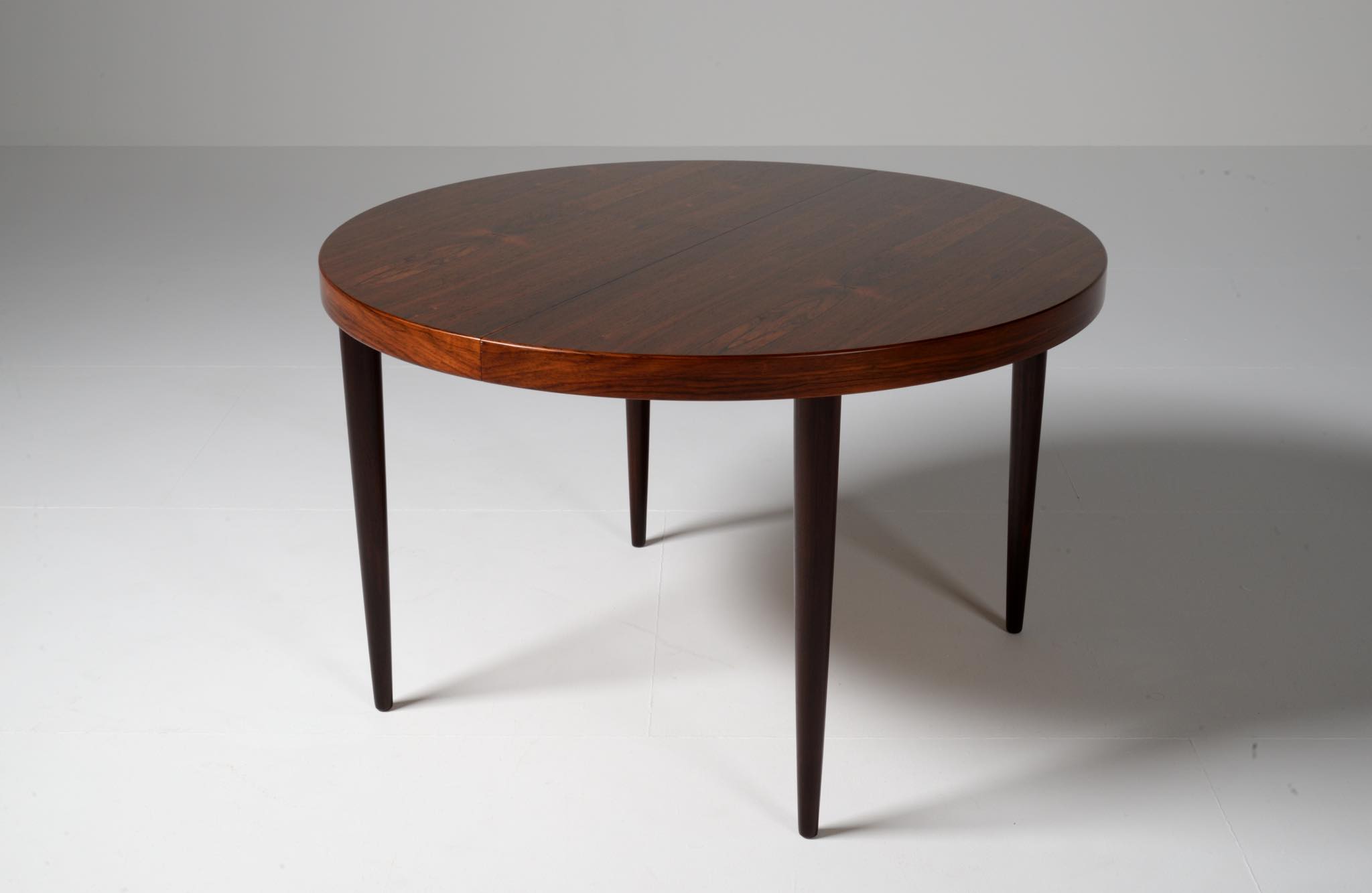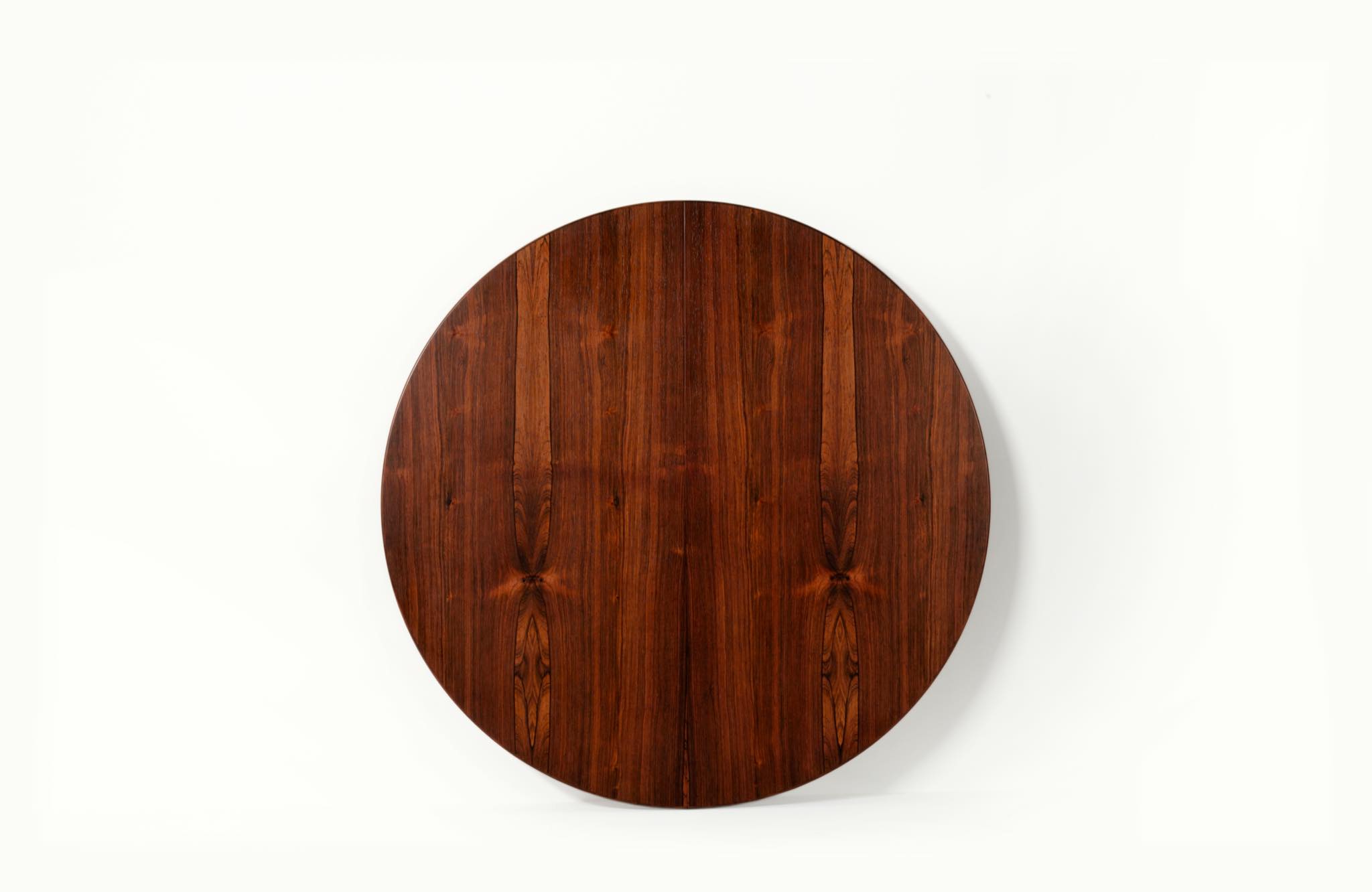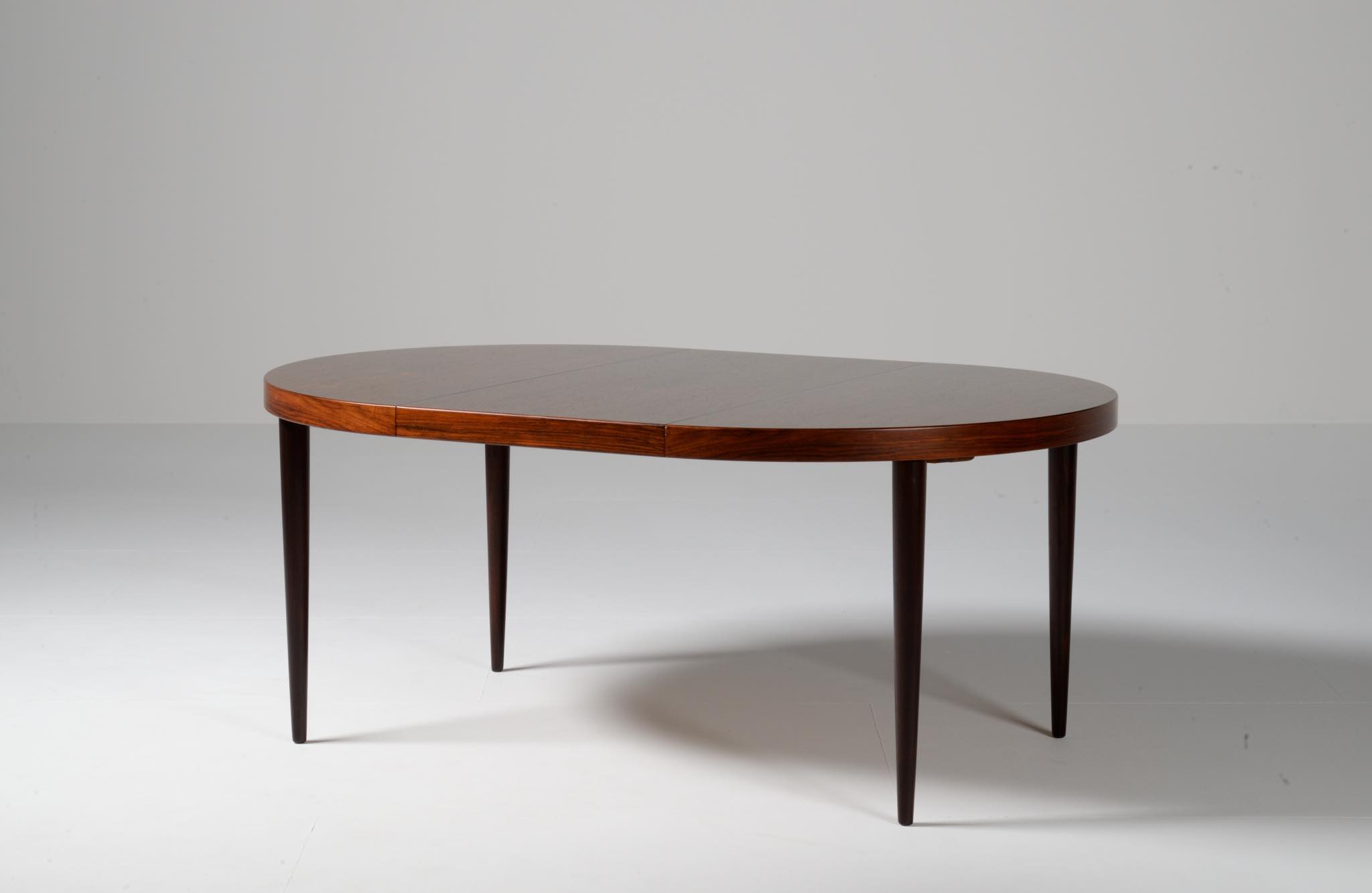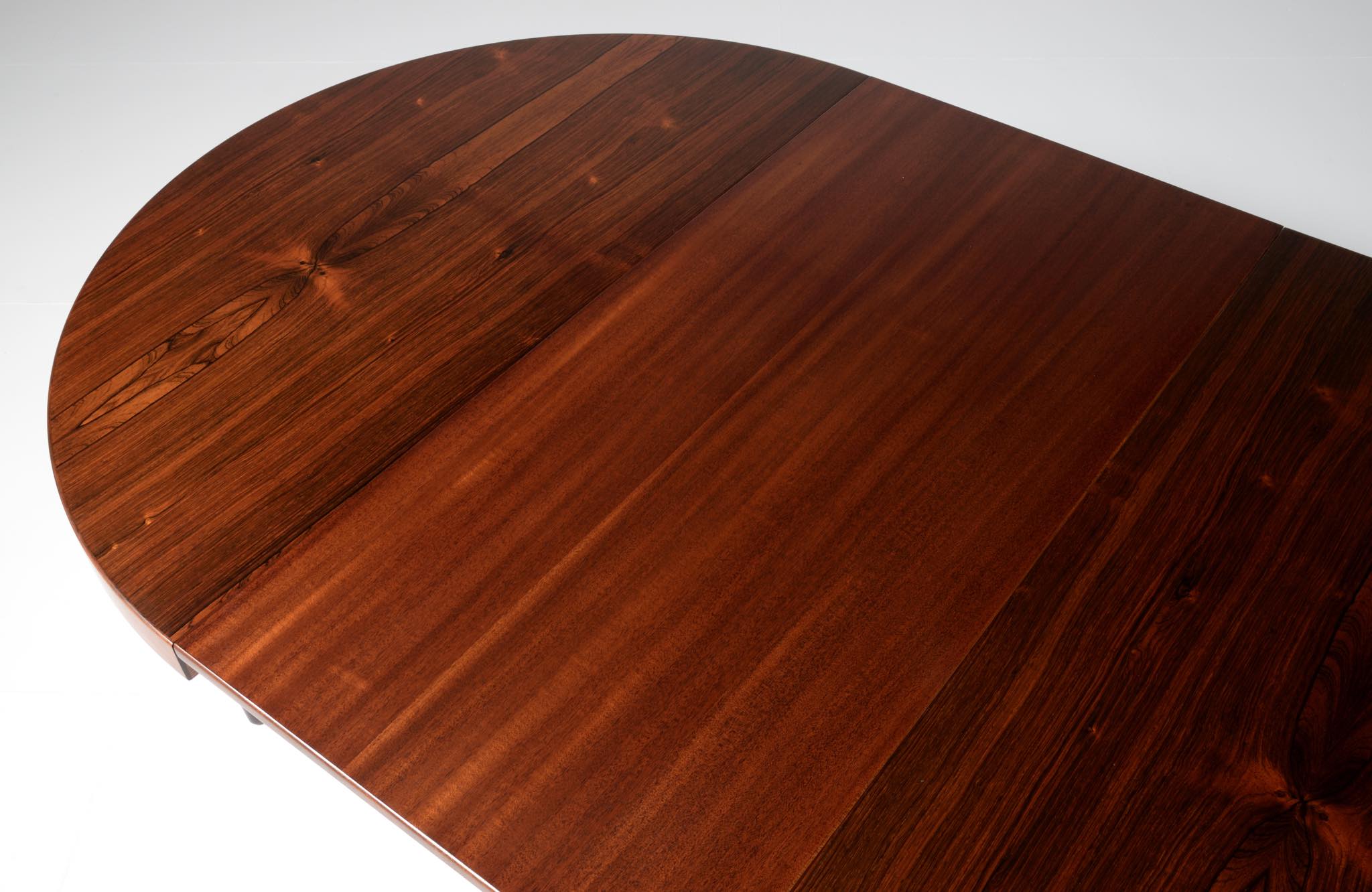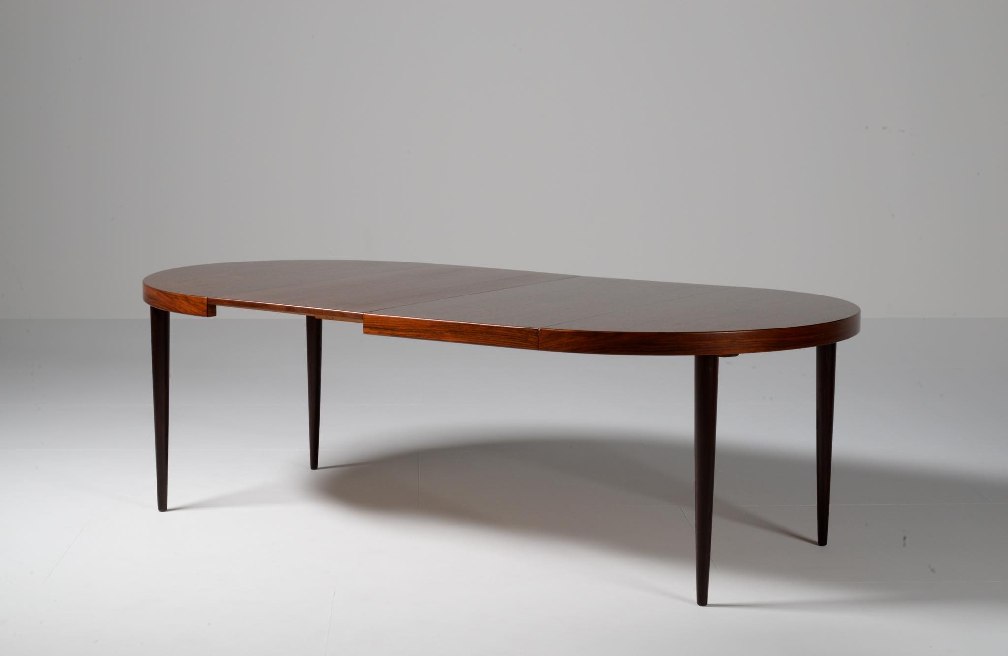 デンマークを代表する家具デザイナーのKai Kristiansen/カイ・クリスチャンセンによるダイニングテーブルです。幕板の作りに特徴のあるタイプで、斜めの線を排除したミニマリズムを思わせるデザインのテーブルです。ブラジル原産と思しきローズウッド材が木取りされており、天板には見事な木目文様が現れています。エクステンションリーフが2枚付属し天板面積を拡張できますが、2枚目のリーフは簡易的なもので、異素材(マホガニー)のためテーブルクロスを掛けることが前提のロングエクステンションと思われます。表面の塗膜に劣化が見られたため再塗装を施しました。コンディションは良好です。
