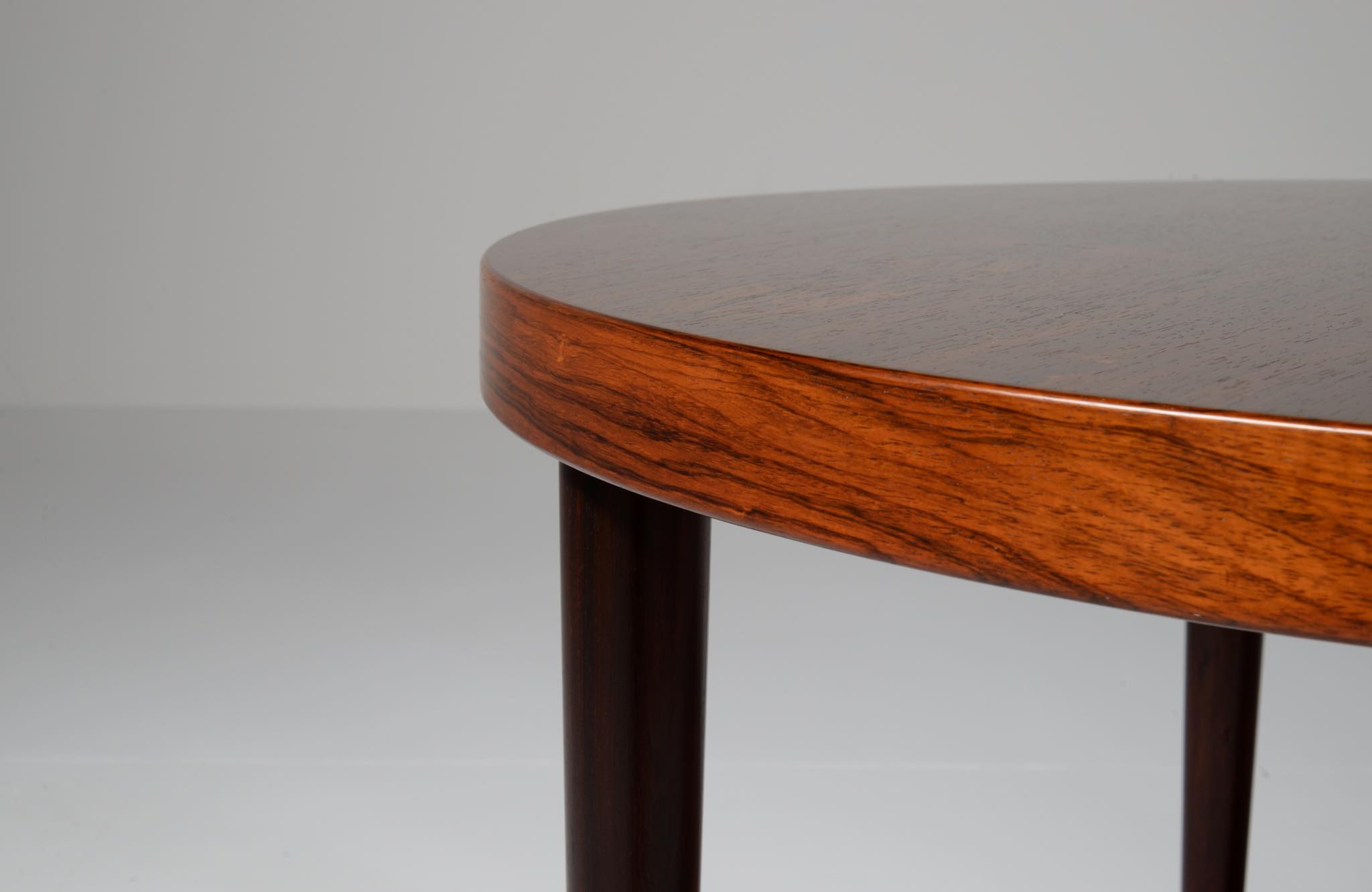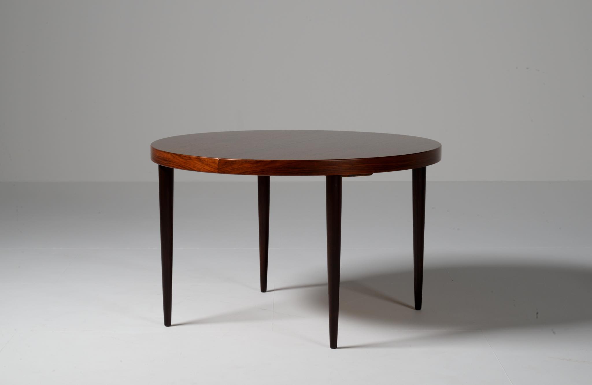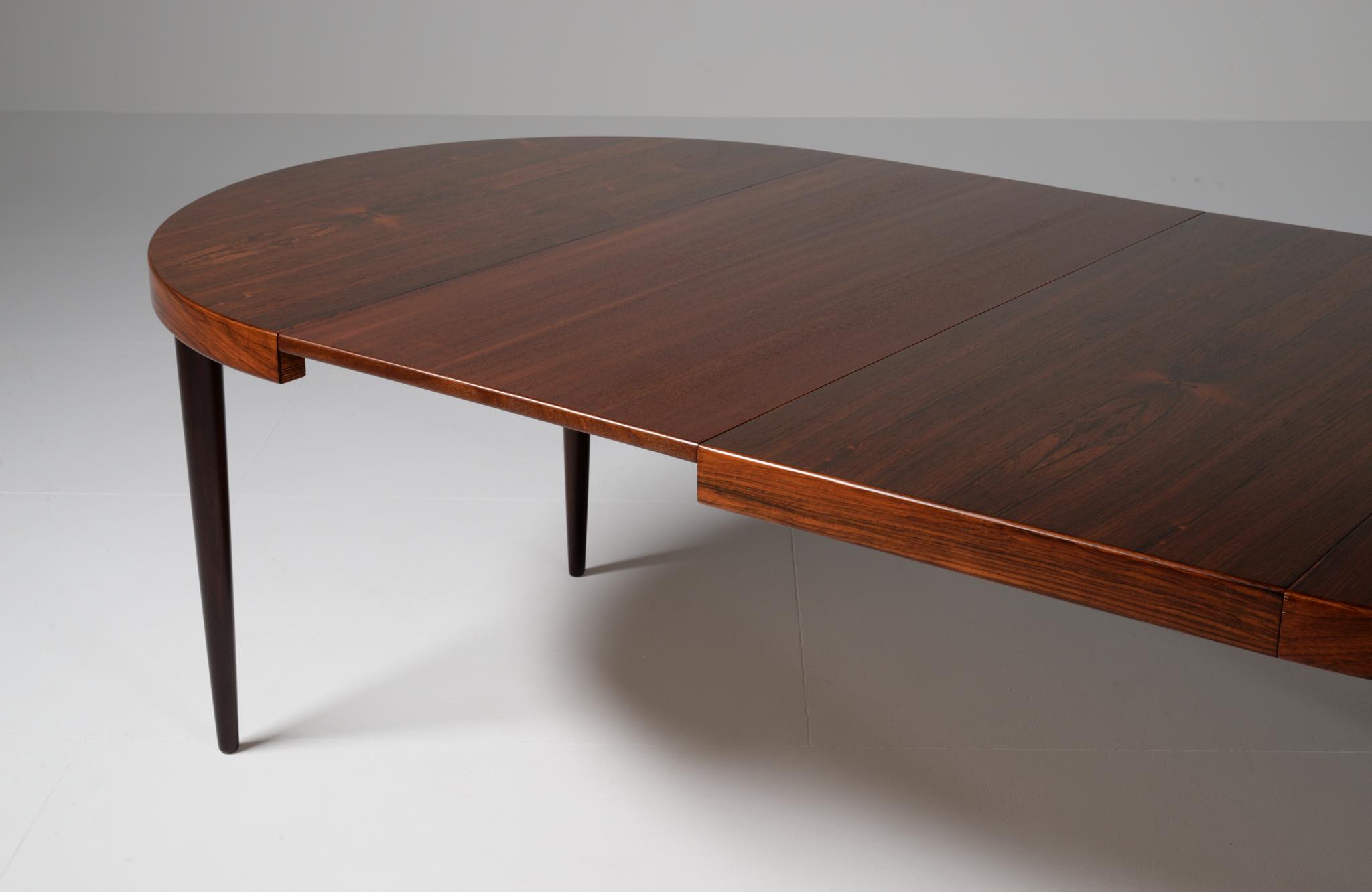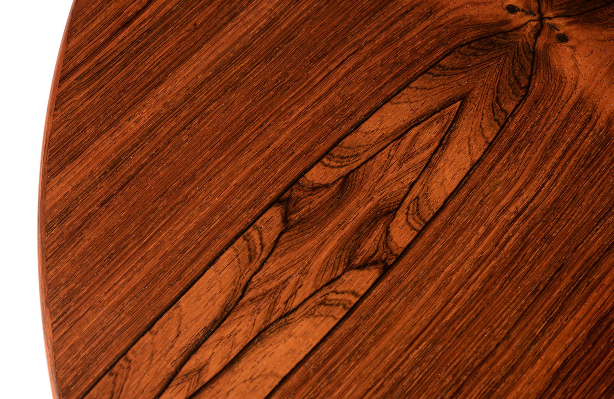 デンマークを代表する家具デザイナーのKai Kristiansen/カイ・クリスチャンセンによるダイニングテーブルです。幕板の作りに特徴のあるタイプで、斜めの線を排除したミニマリズムを思わせるデザインのテーブルです。ブラジル原産と思しきローズウッド材が木取りされており、天板には見事な木目文様が現れています。エクステンションリーフが2枚付属し天板面積を拡張できますが、2枚目のリーフは簡易的なもので、異素材(マホガニー)のためテーブルクロスを掛けることが前提のロングエクステンションと思われます。表面の塗膜に劣化が見られたため再塗装を施しました。コンディションは良好です。