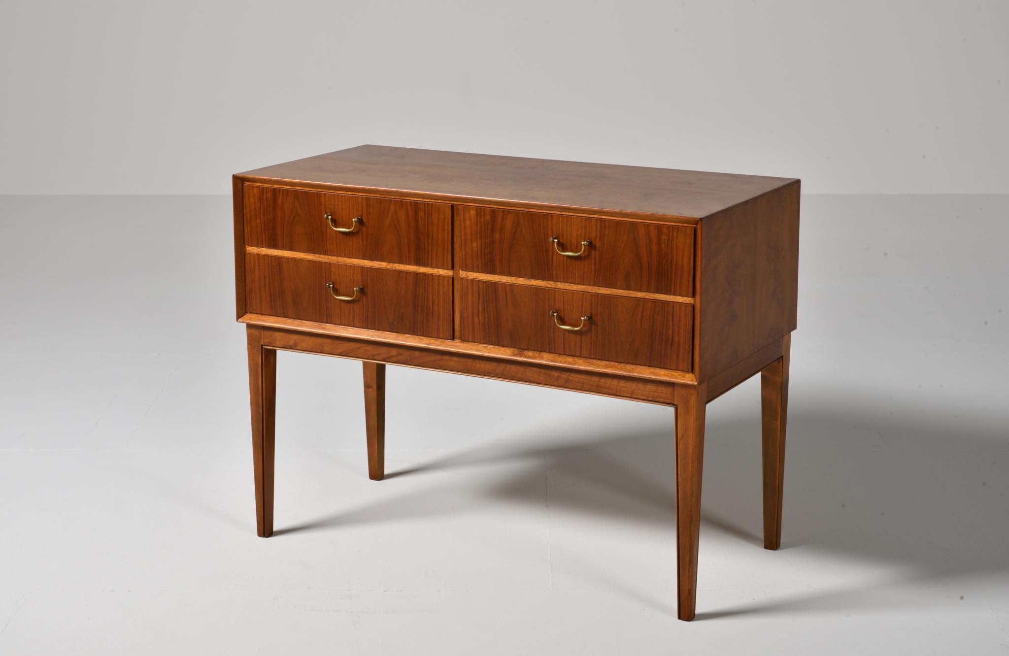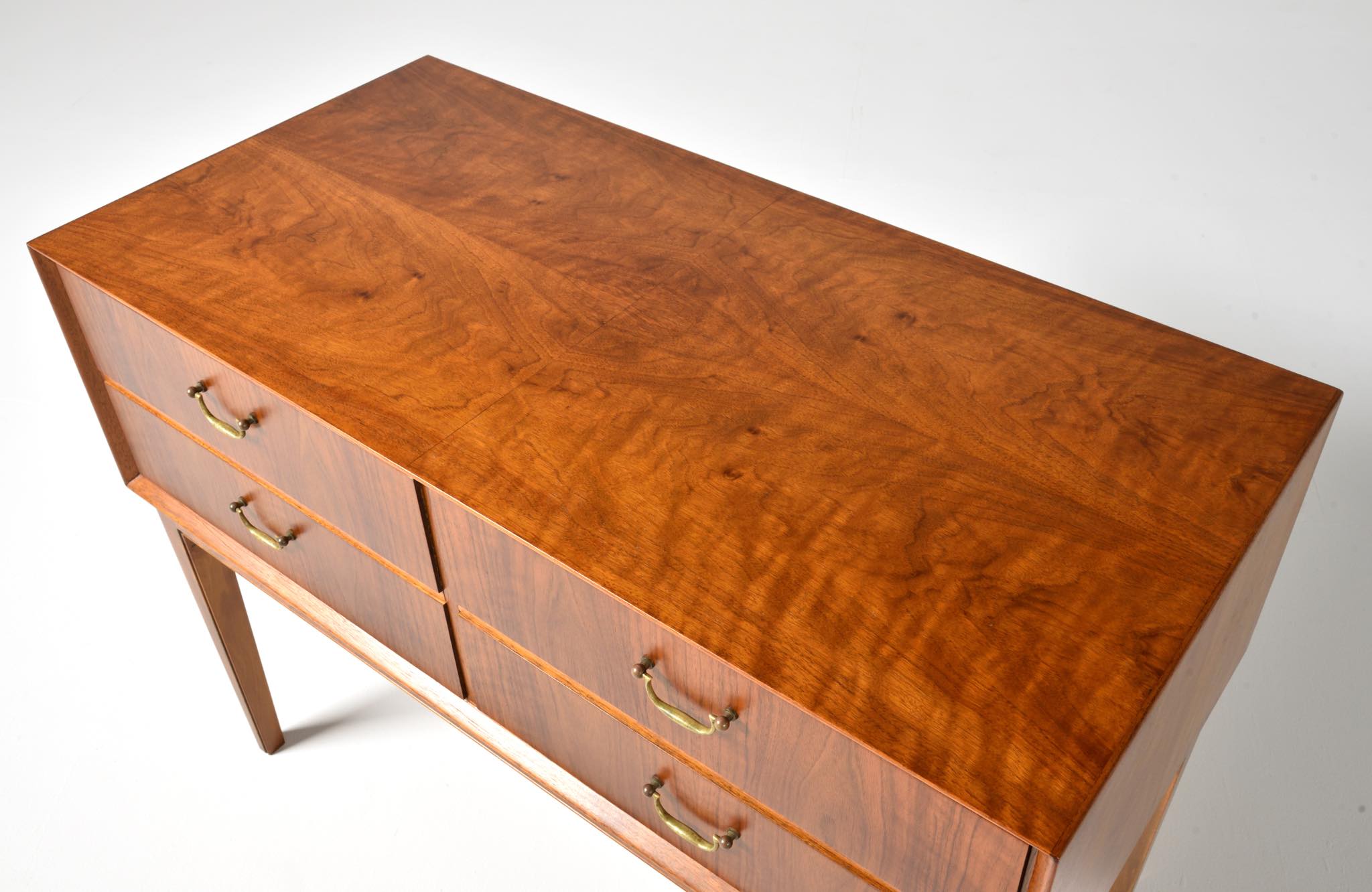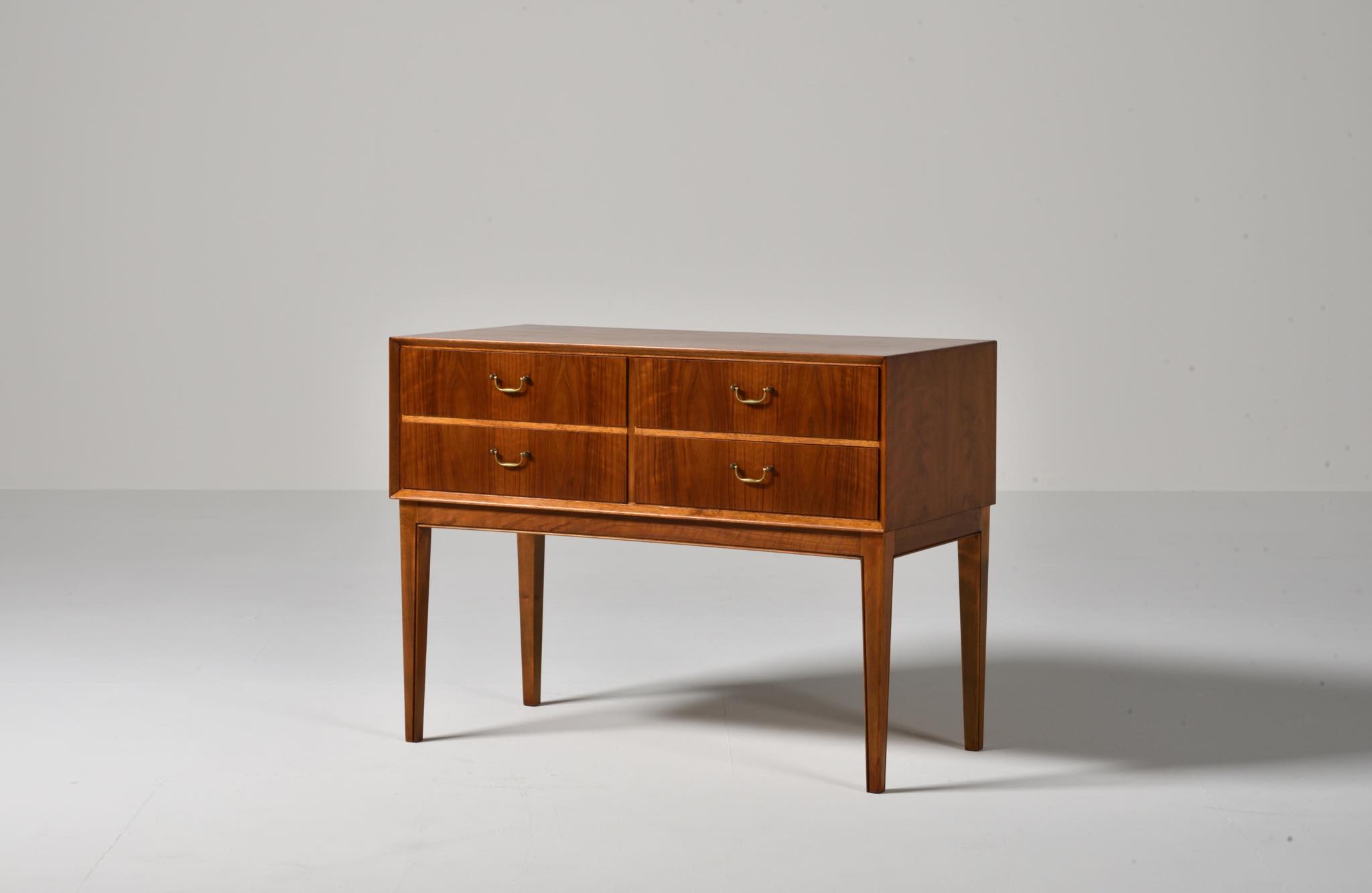デンマークの家具工房で作られたコンソールテーブルです。1940年代頃に作られたもので、ウォルナット材に表れた見応えのある木目文様が特徴です。引手には真鍮製のハンドルが備わり、丁寧に作られたことが伺えます。脚部はステインされたビーチ材です。リビングや玄関ホールなどで生け花やフィギュアを飾るなど活躍しそうなテーブルです。目立ったダメージは見られず、コンディションは良好です。