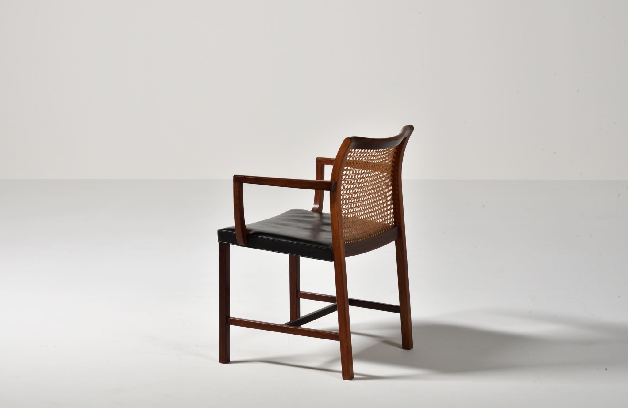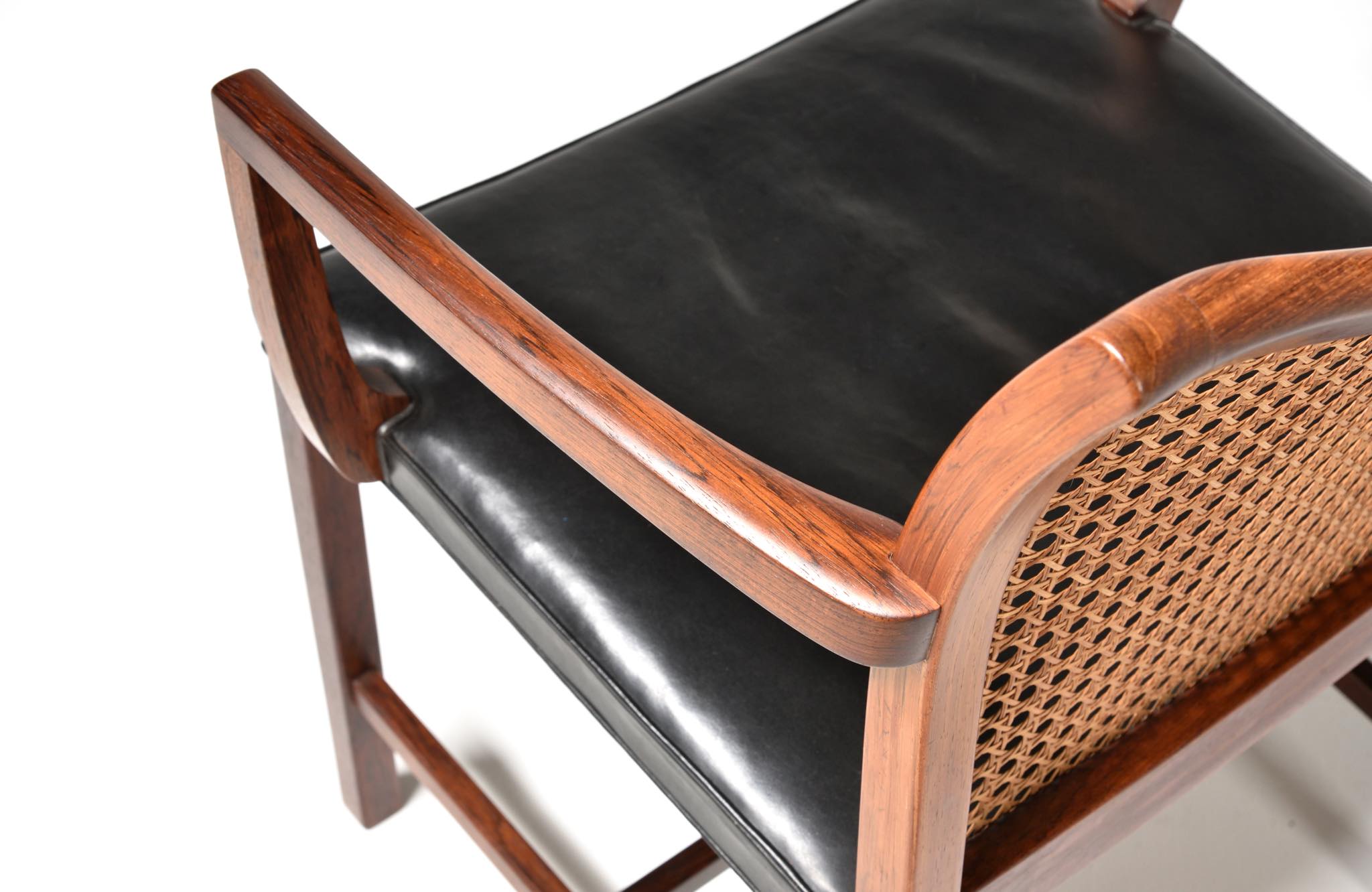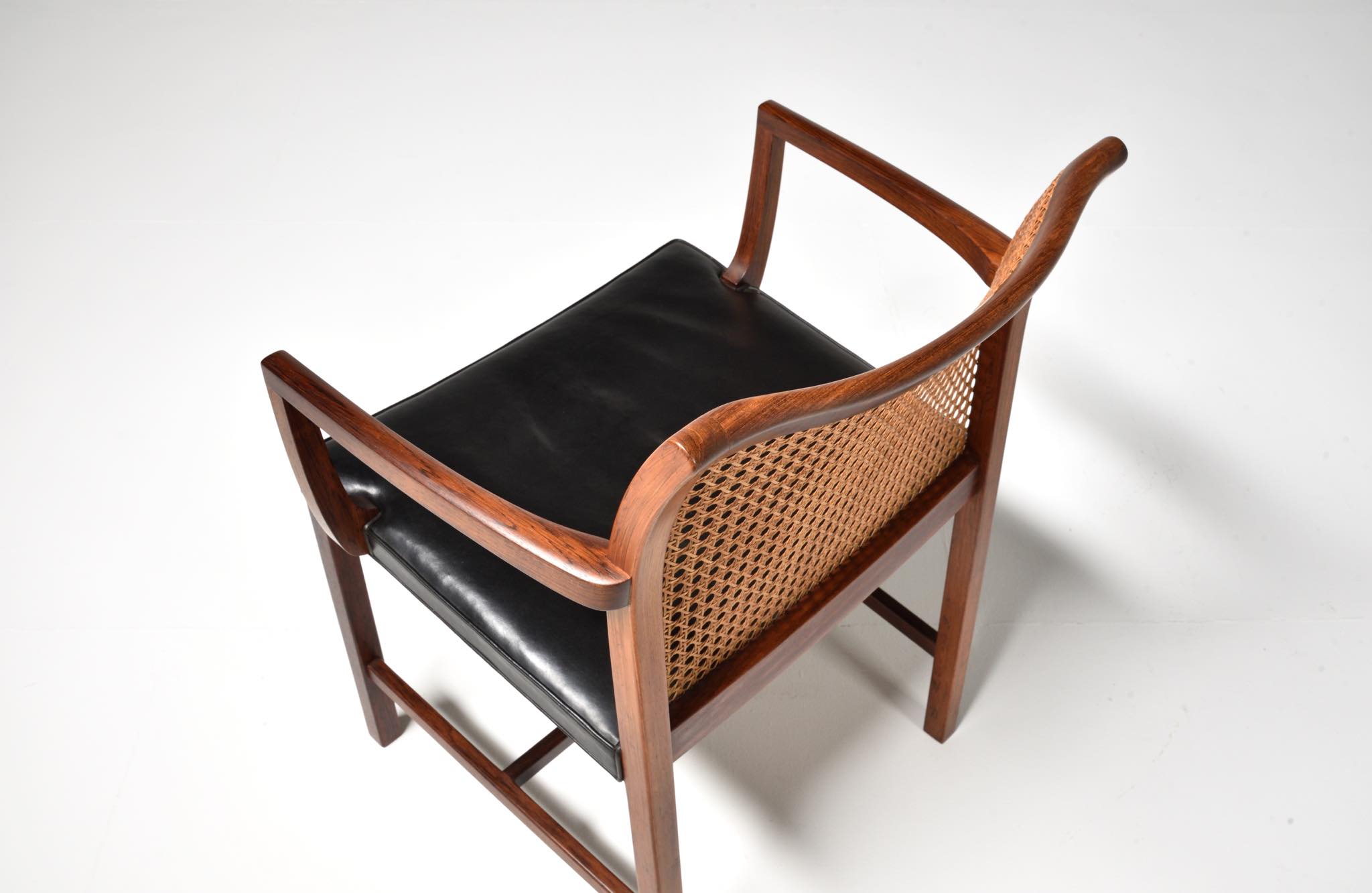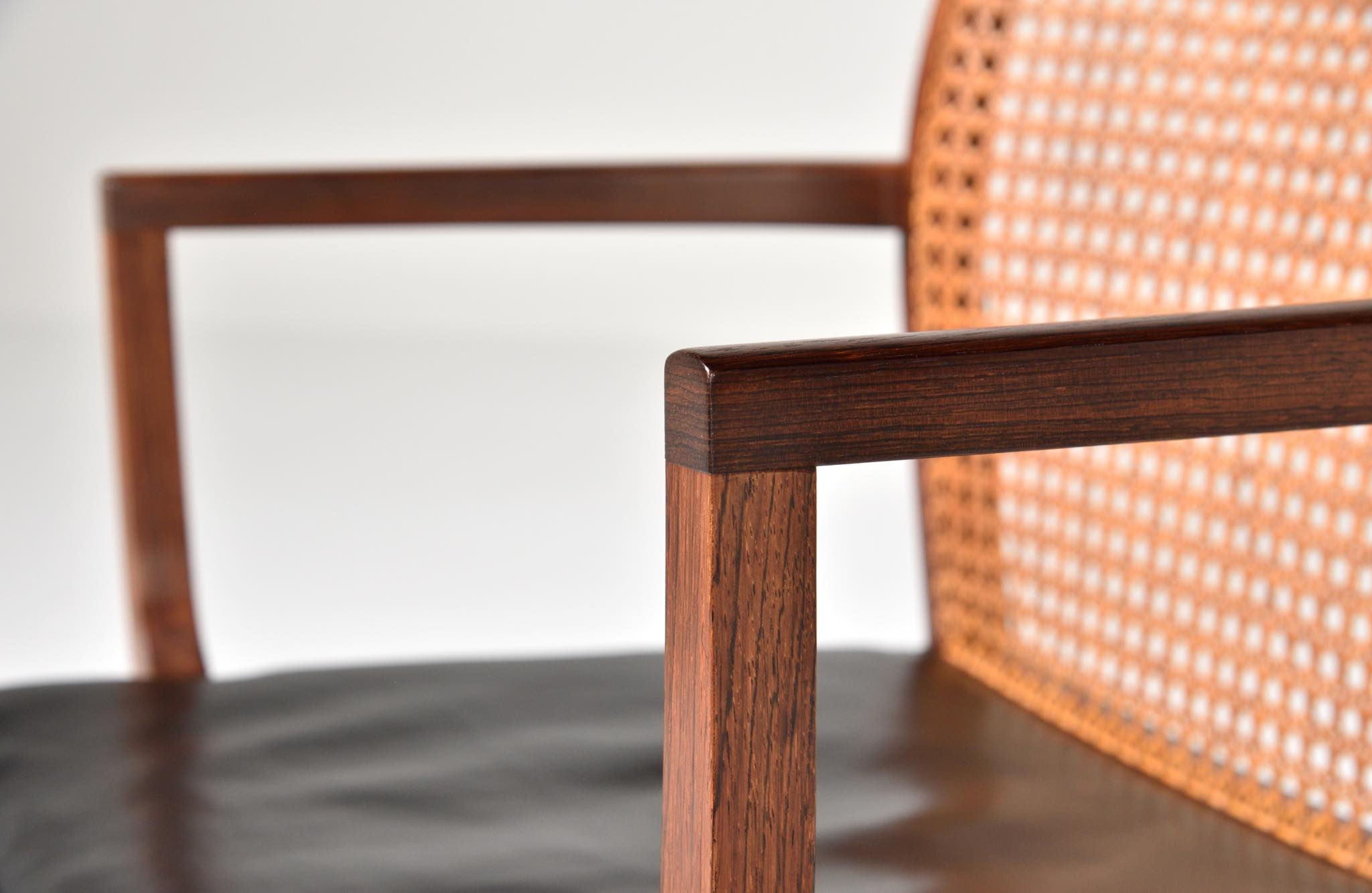デンマークのデザイナー、Ditte and Adrian Heath/ディッテ&エイドリアン・ヒースによるアームチェアです。フィン・ユールのプロダクトを手がけたキャビネットメーカーのソーレン・ホーンによって製作されたもので、フレームには良質なローズウッド材が使われており、ブラジル原産の材種と思われます。後年に引きついだニルス・ロス・アナセン工房による製品ではフレームに無垢集成材が用いられていますが、こちらのソーレン・ホーン工房のものは無垢削り出しのフレームが採用されています。手編みされた背もたれの籐張りと、シートに張り込まれた黒皮革はオリジナルのようで、ヴィンテージとしてのコンディションは良好です。