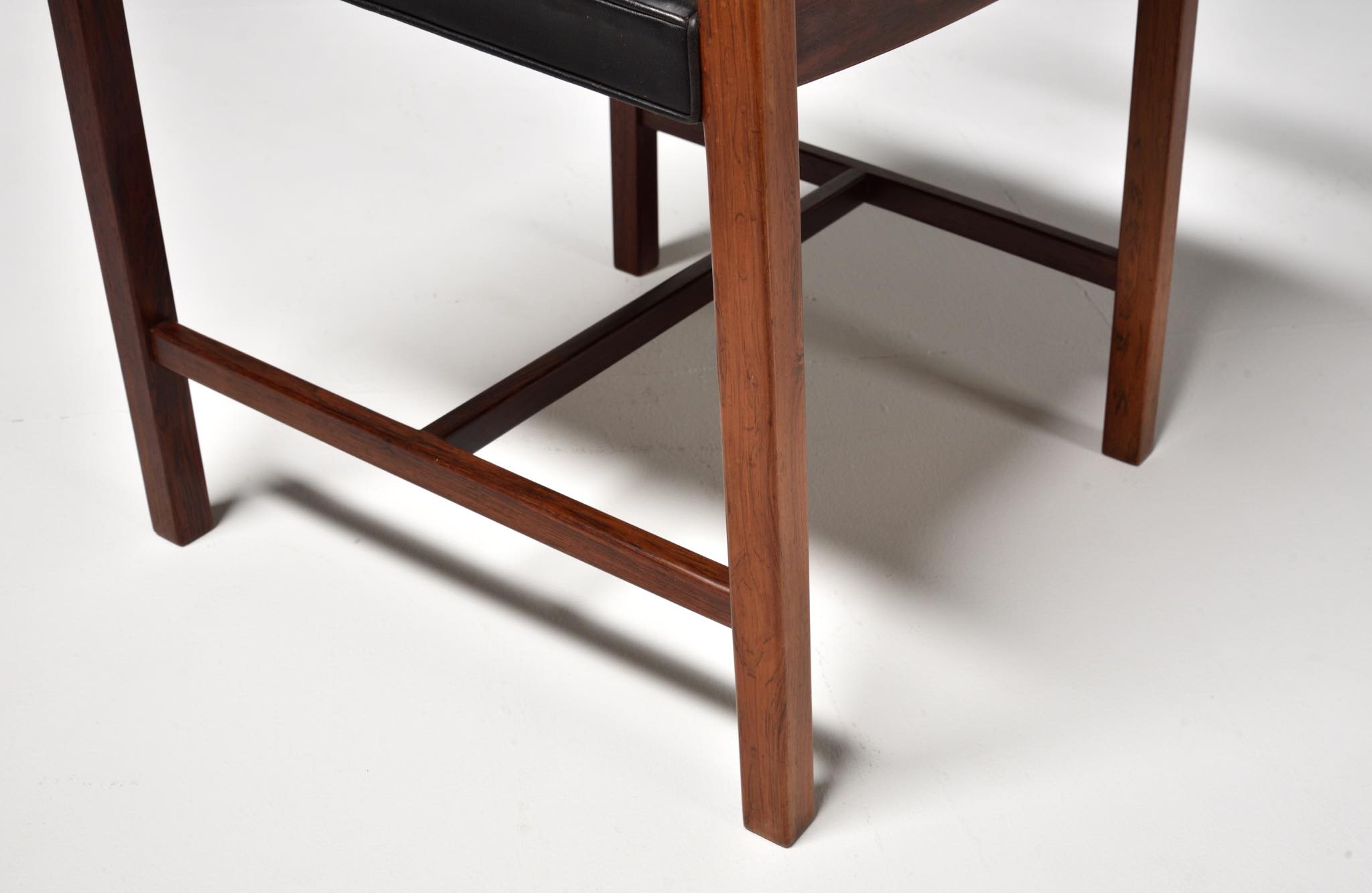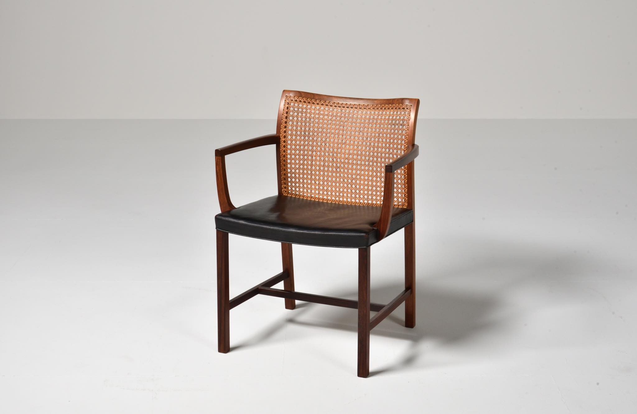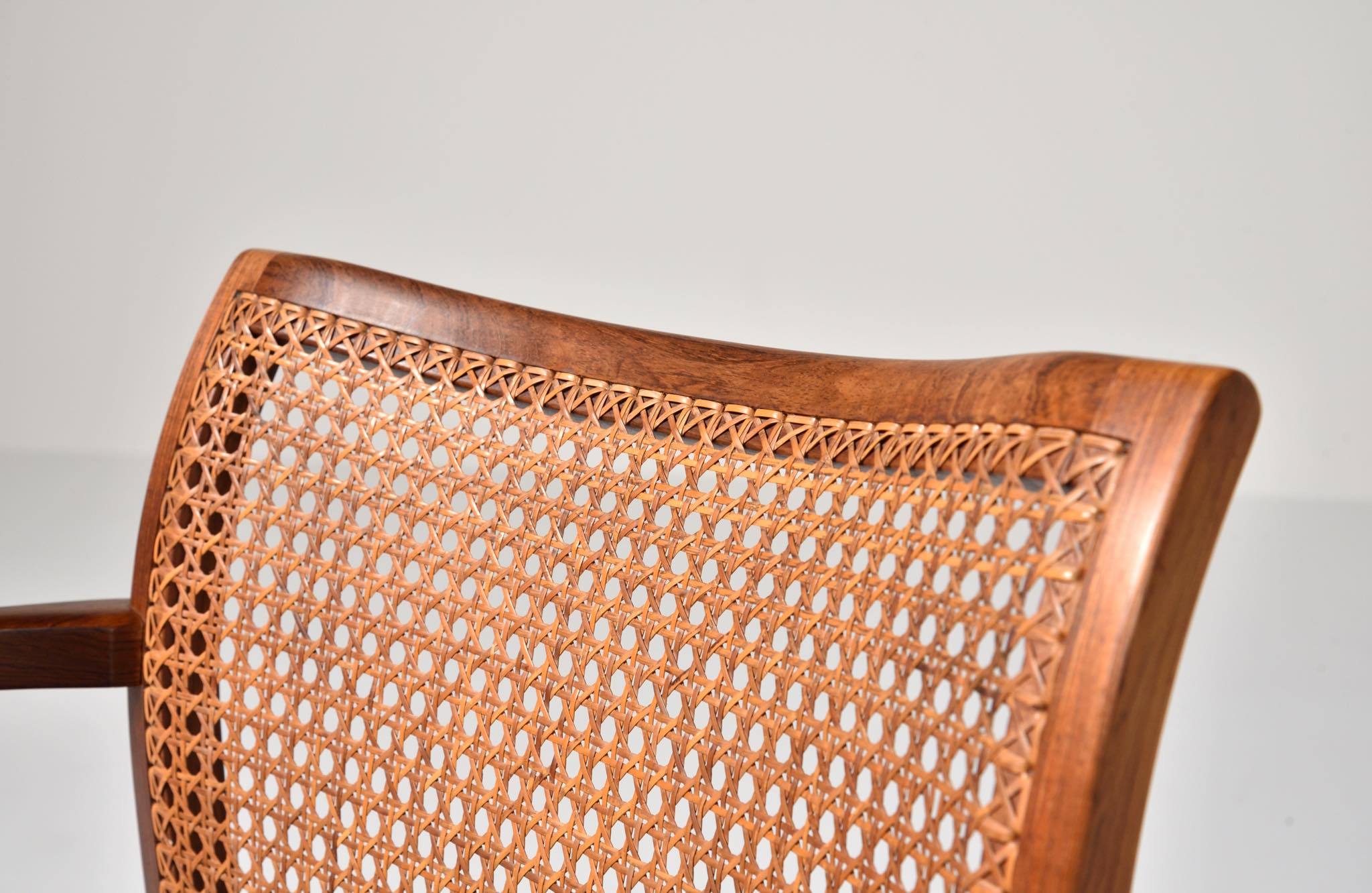デンマークのデザイナー、Ditte and Adrian Heath/ディッテ&エイドリアン・ヒースによるアームチェアです。フィン・ユールのプロダクトを手がけたキャビネットメーカーのソーレン・ホーンによって製作されたもので、フレームには良質なローズウッド材が使われており、ブラジル原産の材種と思われます。後年に引きついだニルス・ロス・アナセン工房による製品ではフレームに無垢集成材が用いられていますが、こちらのソーレン・ホーン工房のものは無垢削り出しのフレームが採用されています。手編みされた背もたれの籐張りと、シートに張り込まれた黒皮革はオリジナルのようで、ヴィンテージとしてのコンディションは良好です。