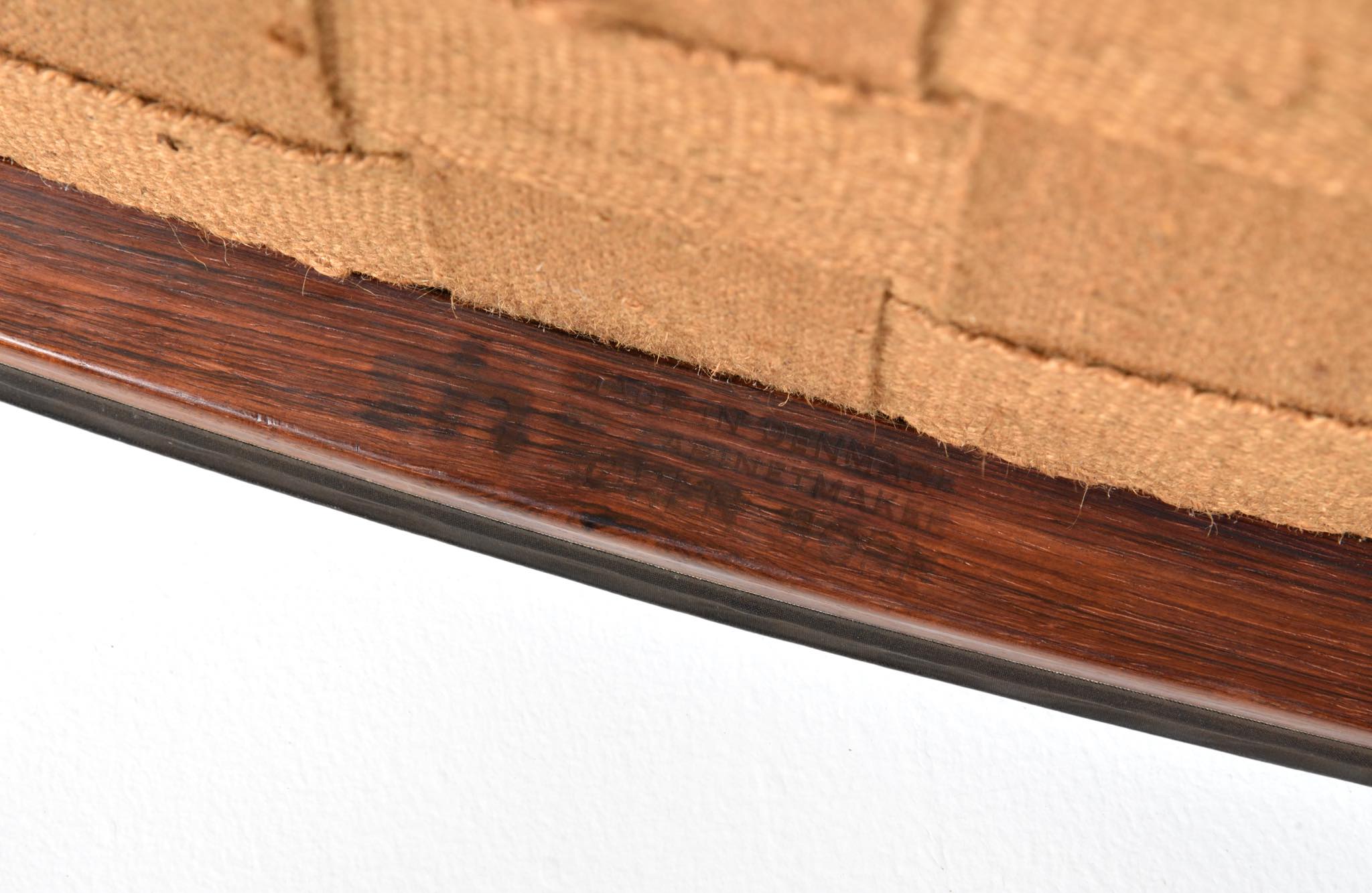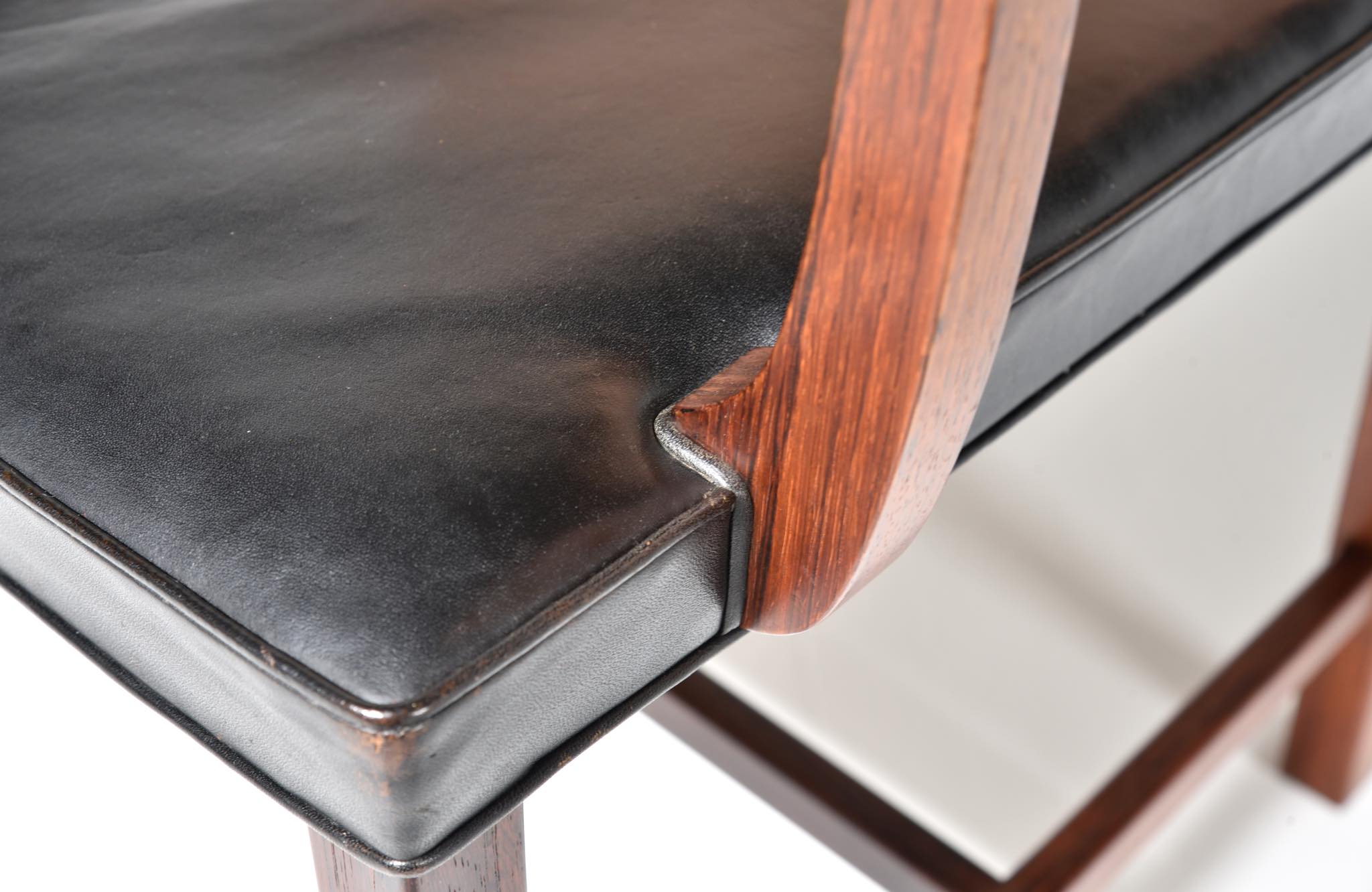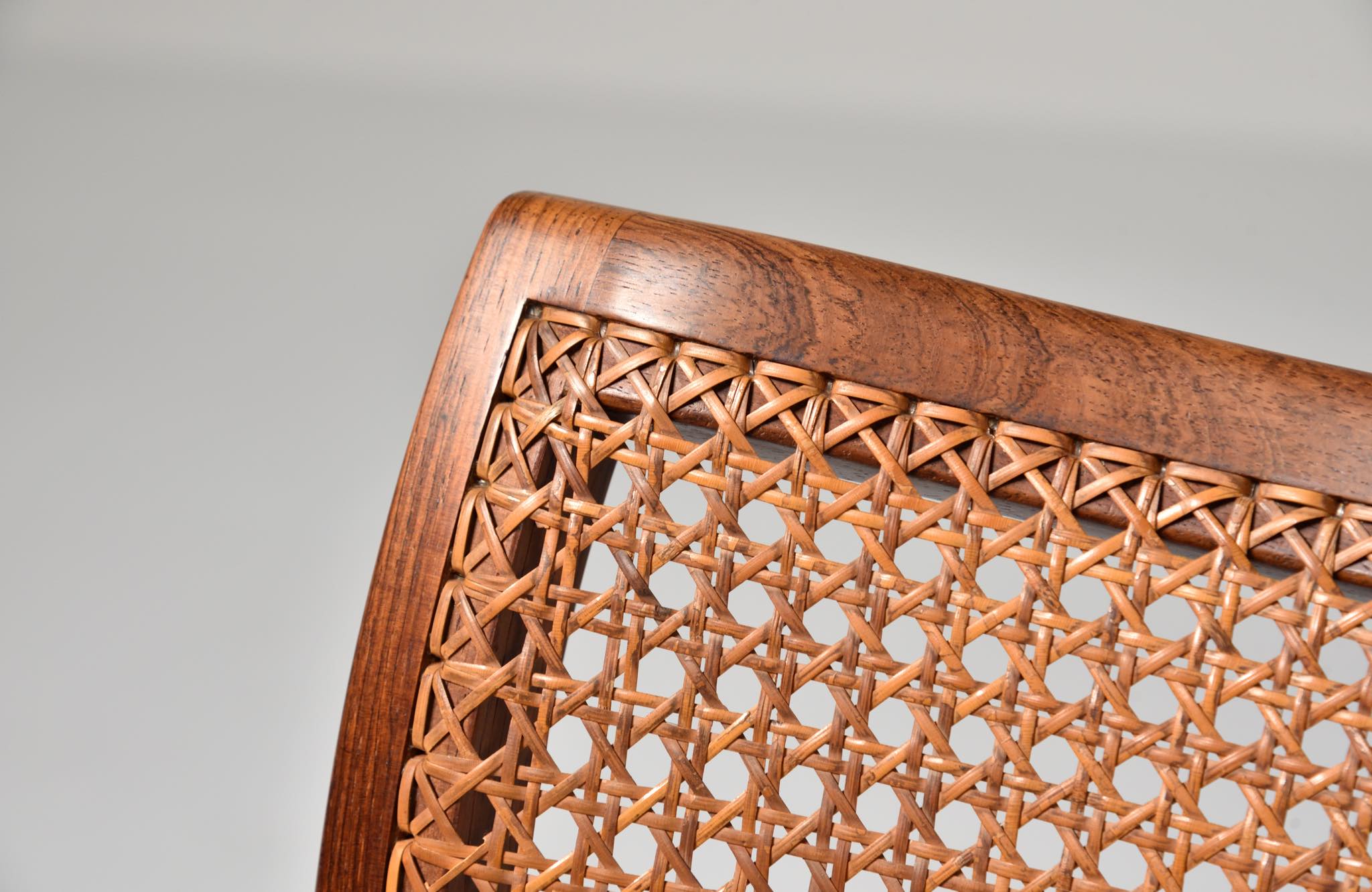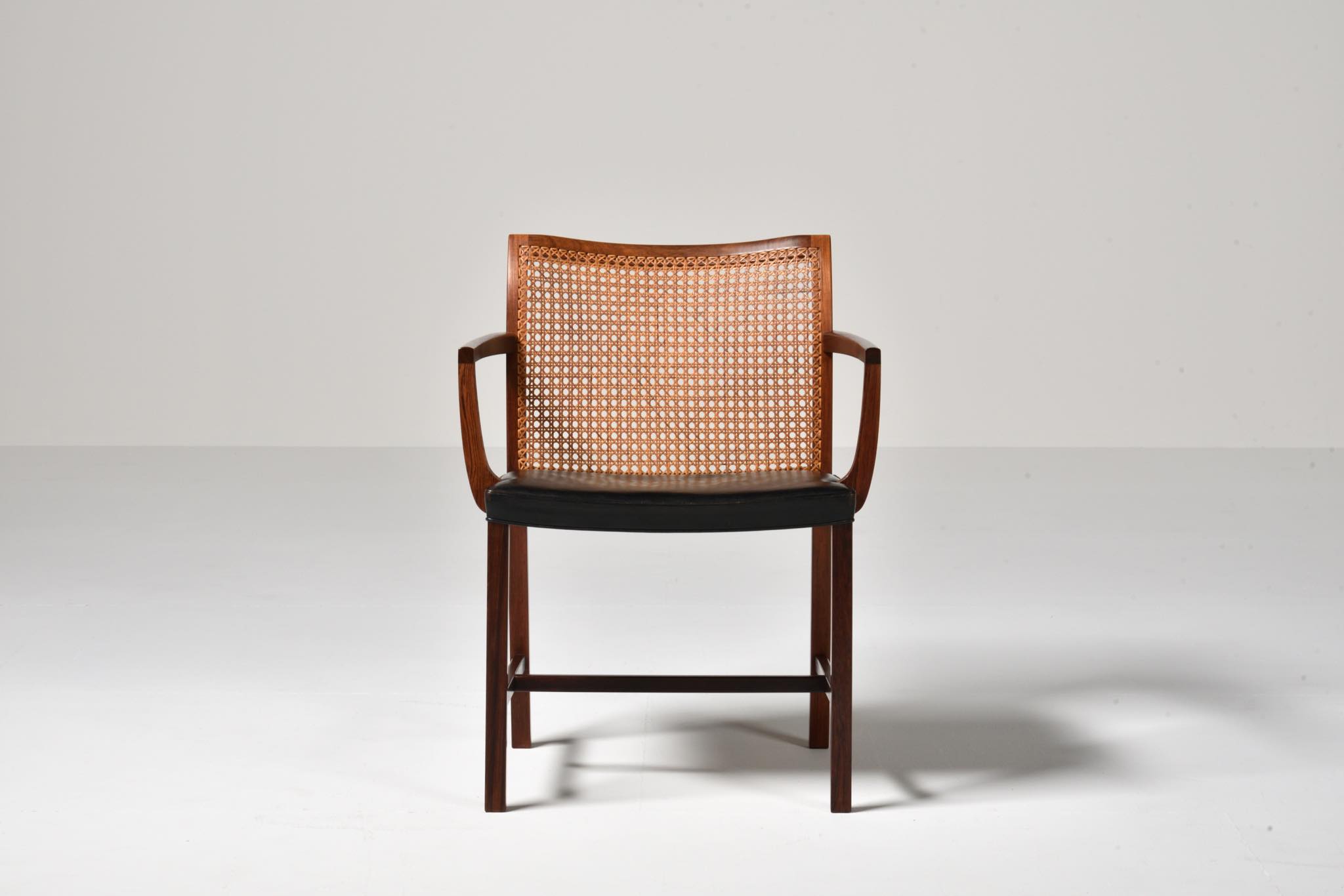 デンマークのデザイナー、Ditte and Adrian Heath/ディッテ&エイドリアン・ヒースによるアームチェアです。フィン・ユールのプロダクトを手がけたキャビネットメーカーのソーレン・ホーンによって製作されたもので、フレームには良質なローズウッド材が使われており、ブラジル原産の材種と思われます。後年に引きついだニルス・ロス・アナセン工房による製品ではフレームに無垢集成材が用いられていますが、こちらのソーレン・ホーン工房のものは無垢削り出しのフレームが採用されています。手編みされた背もたれの籐張りと、シートに張り込まれた黒皮革はオリジナルのようで、ヴィンテージとしてのコンディションは良好です。