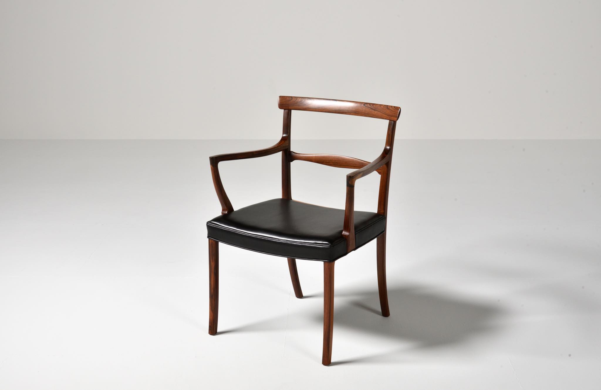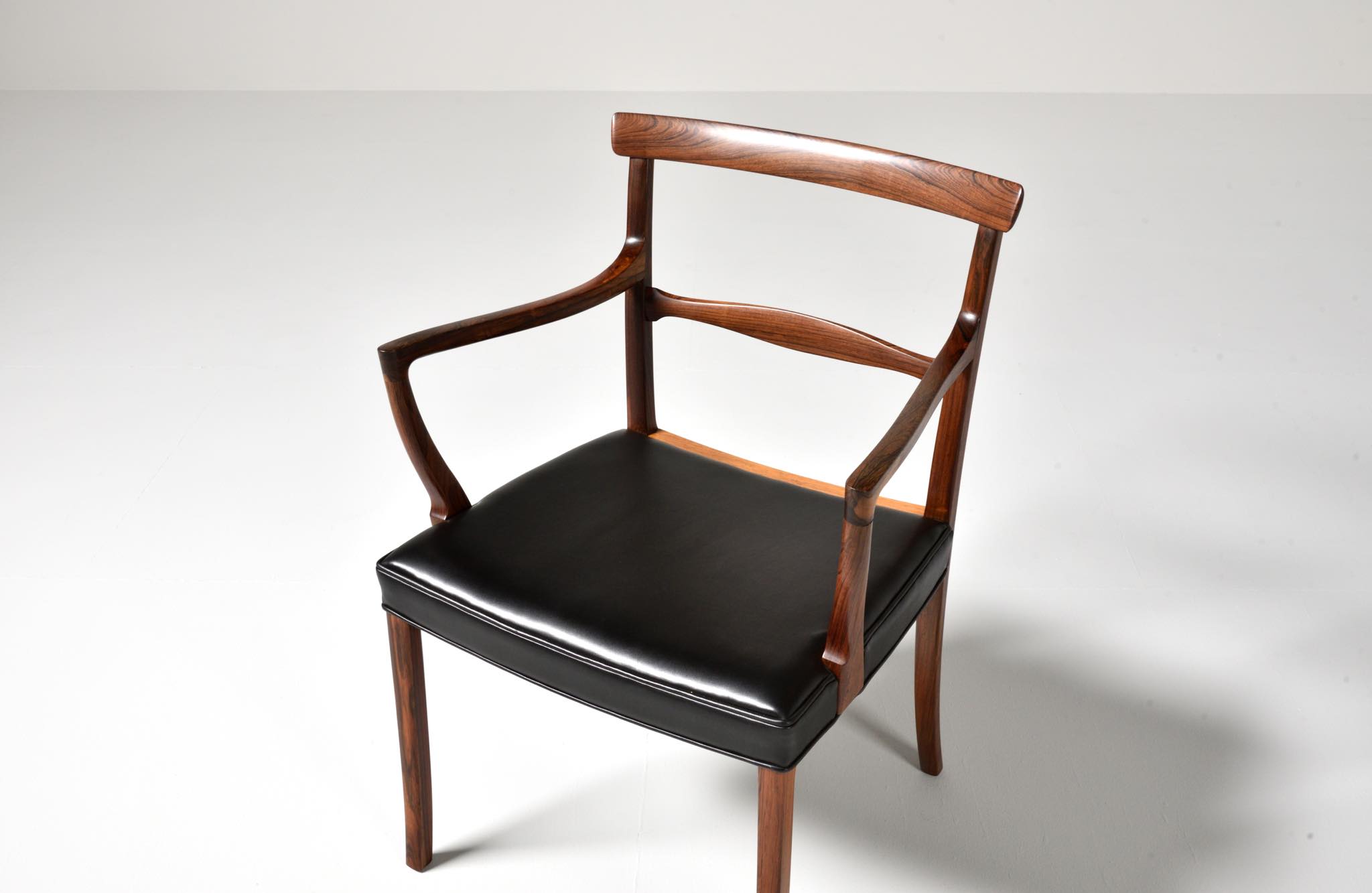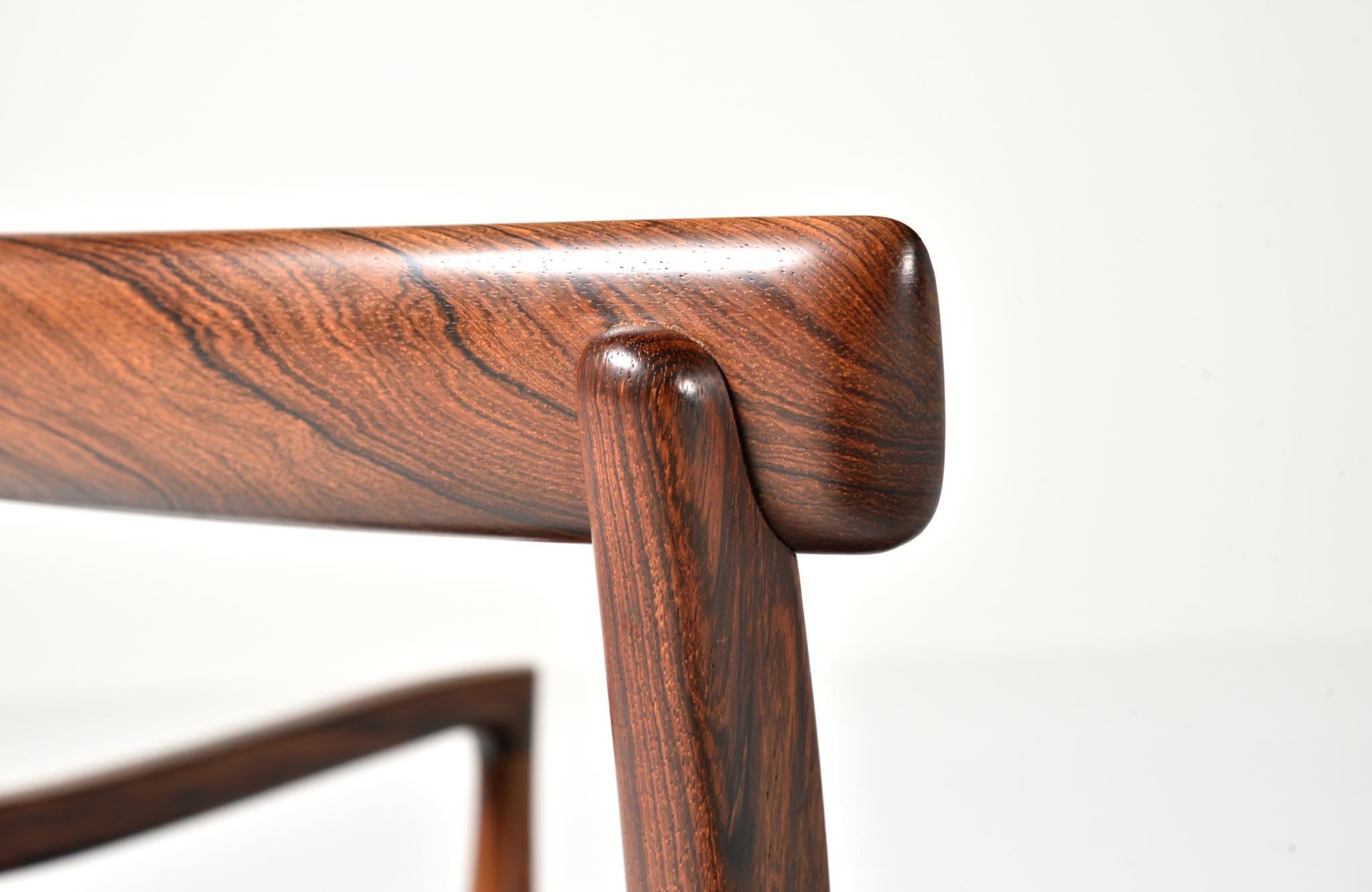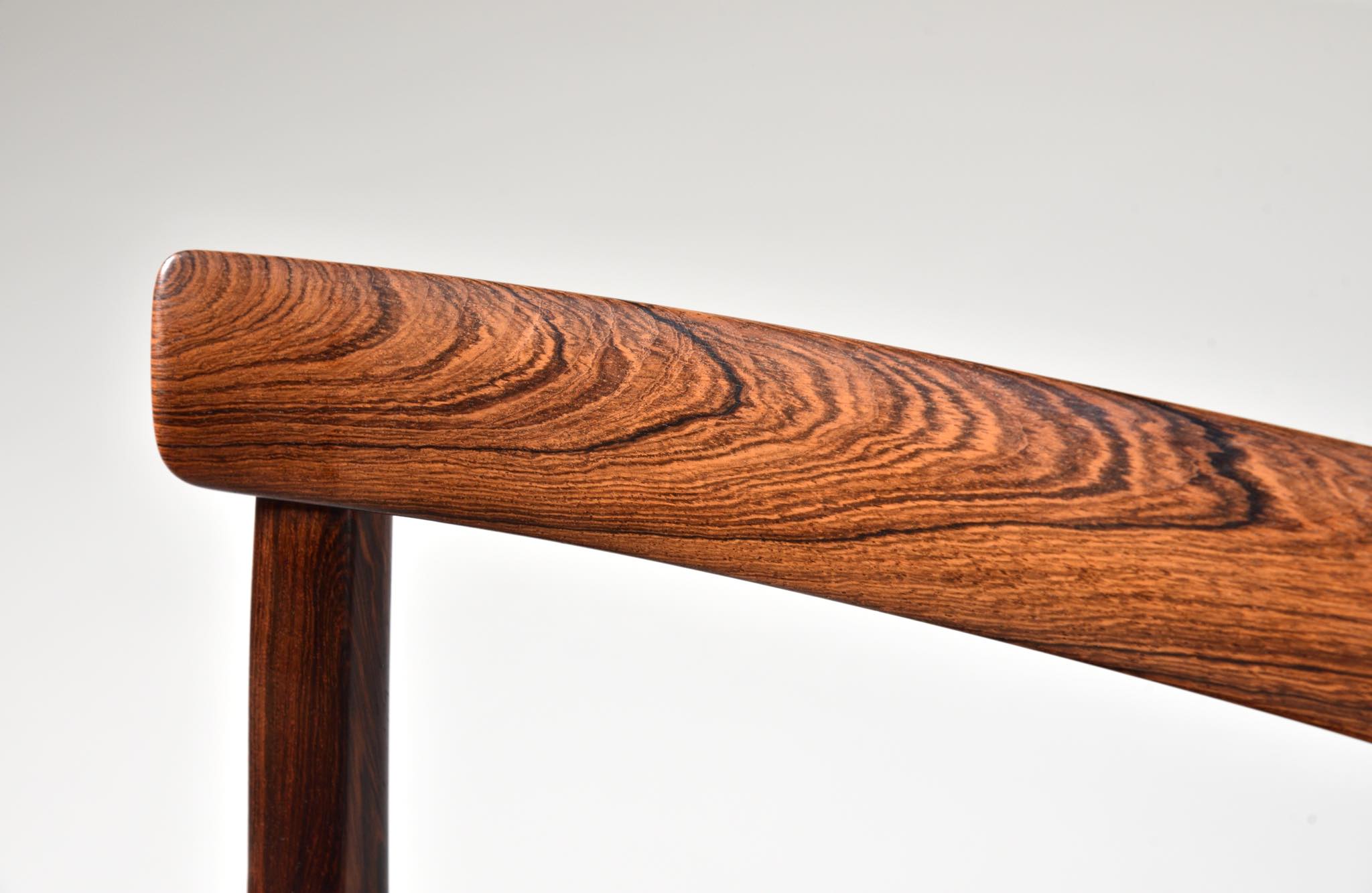 デンマークの家具デザイナーで、王立アカデミー家具科の教授を務めたOle Wanscher/オーレ・ヴァンシャーによるアームチェアです。1962年にダイニングシリーズとして発表されたモデルで、優雅なデザインが特長です。フレームには見応えのある良質なローズウッド材が用いられています。シートは近年張り替えられたもののようで、とても綺麗な状態です。
