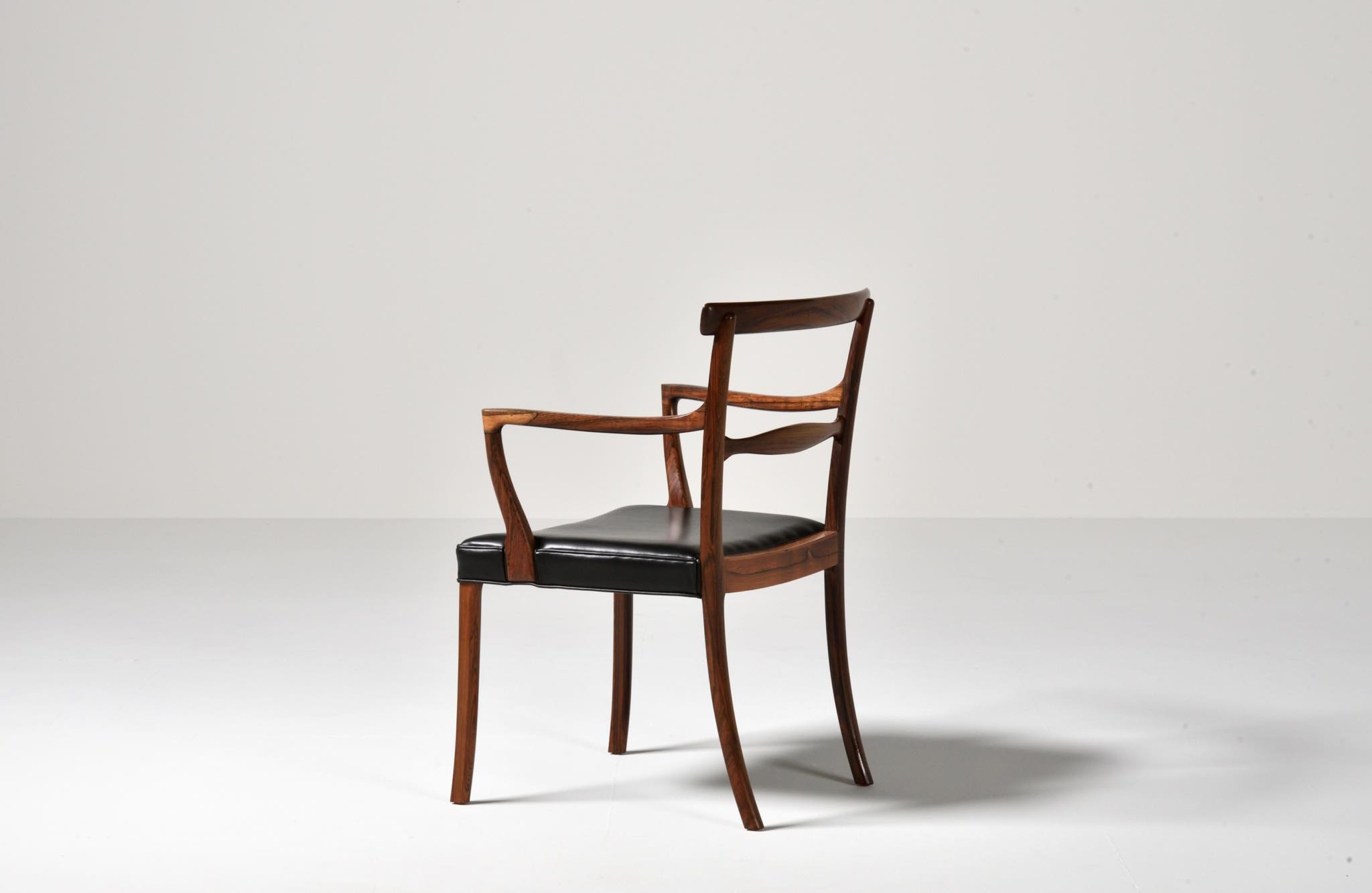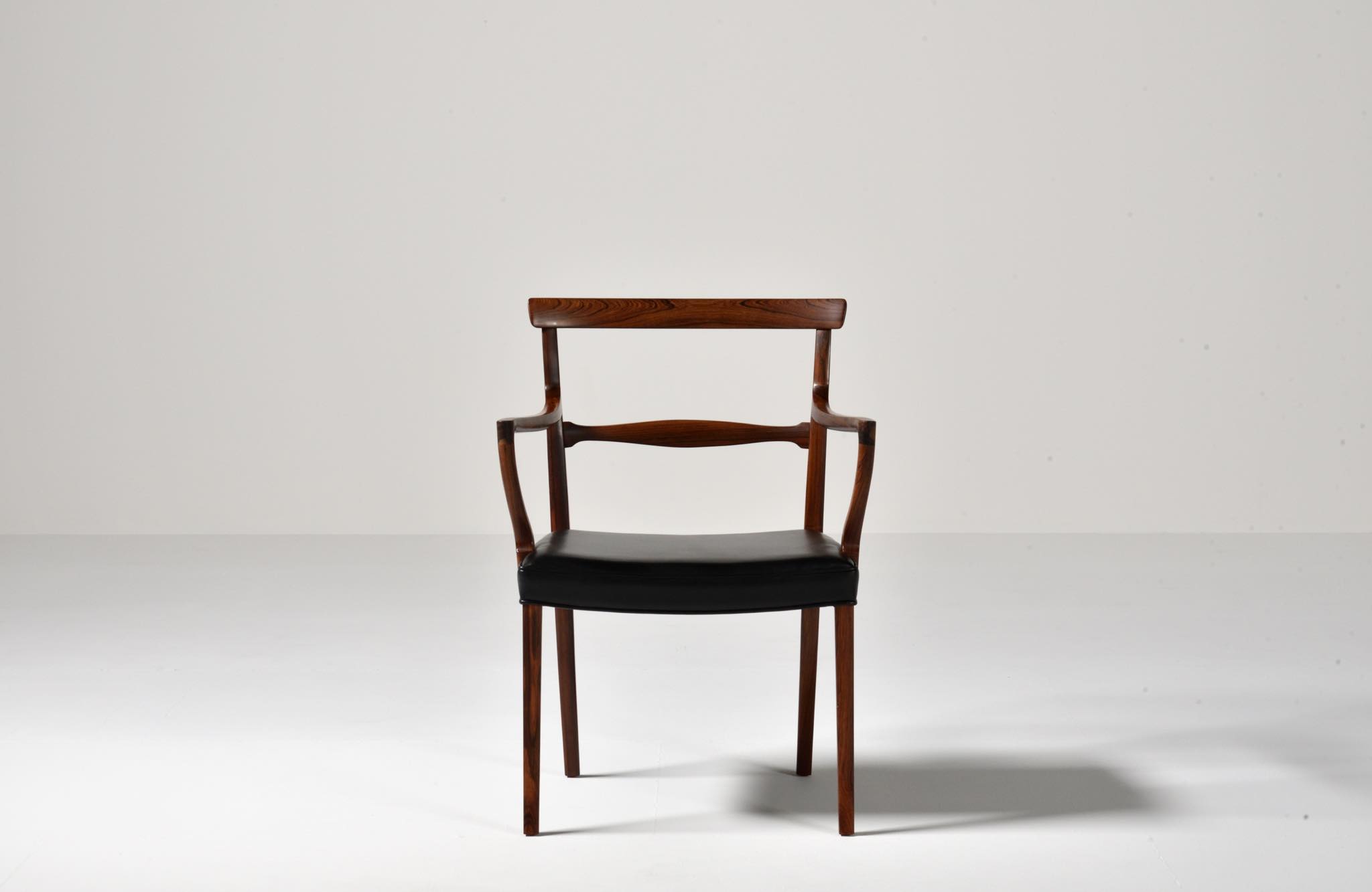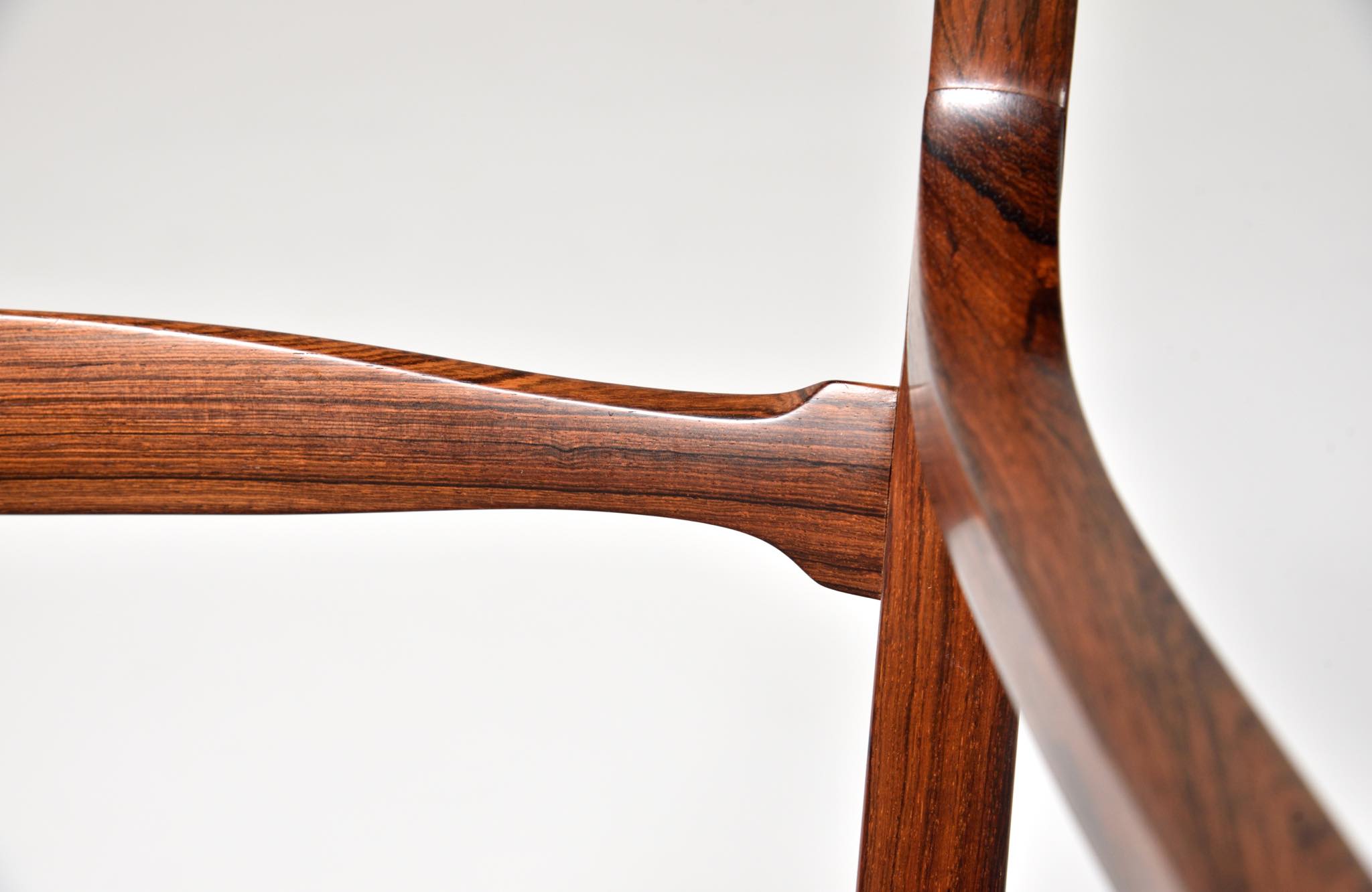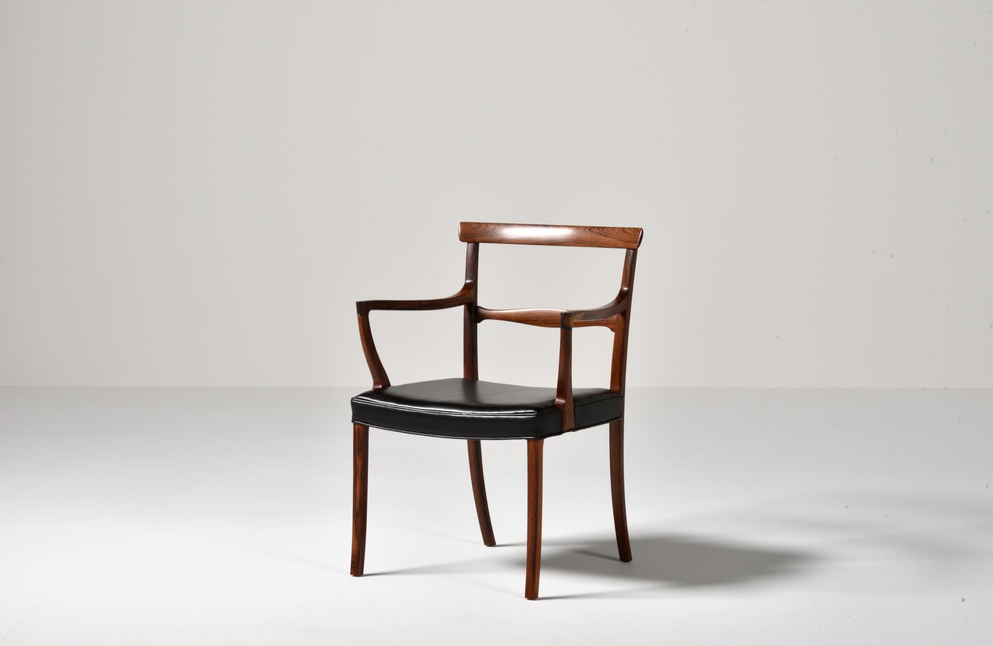 デンマークの家具デザイナーで、王立アカデミー家具科の教授を務めたOle Wanscher/オーレ・ヴァンシャーによるアームチェアです。1962年にダイニングシリーズとして発表されたモデルで、優雅なデザインが特長です。フレームには見応えのある良質なローズウッド材が用いられています。シートは近年張り替えられたもののようで、とても綺麗な状態です。