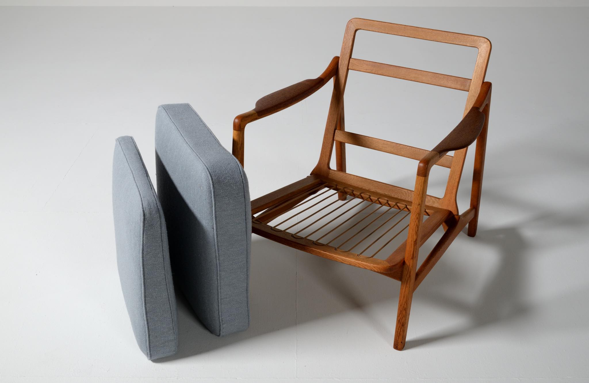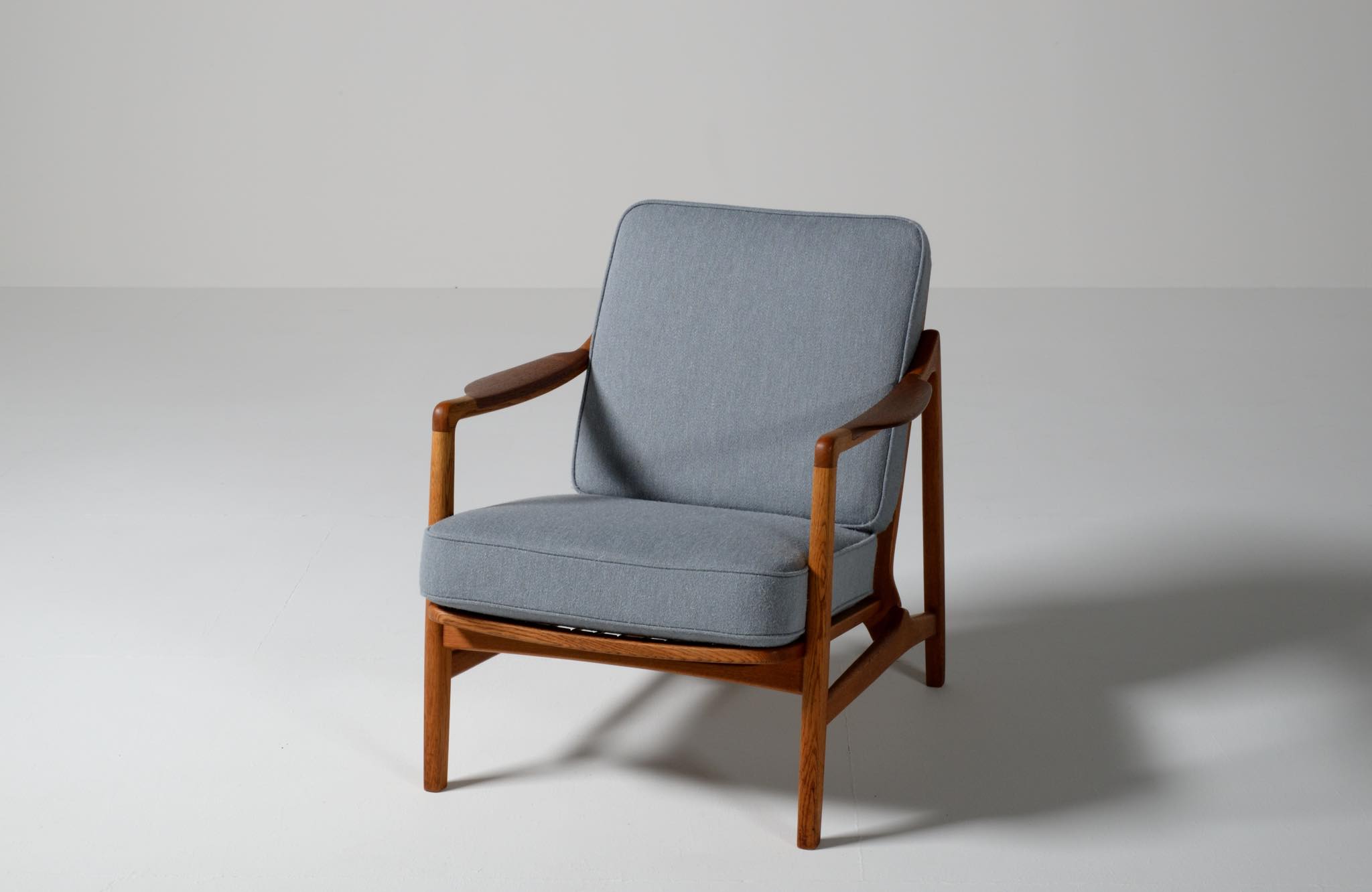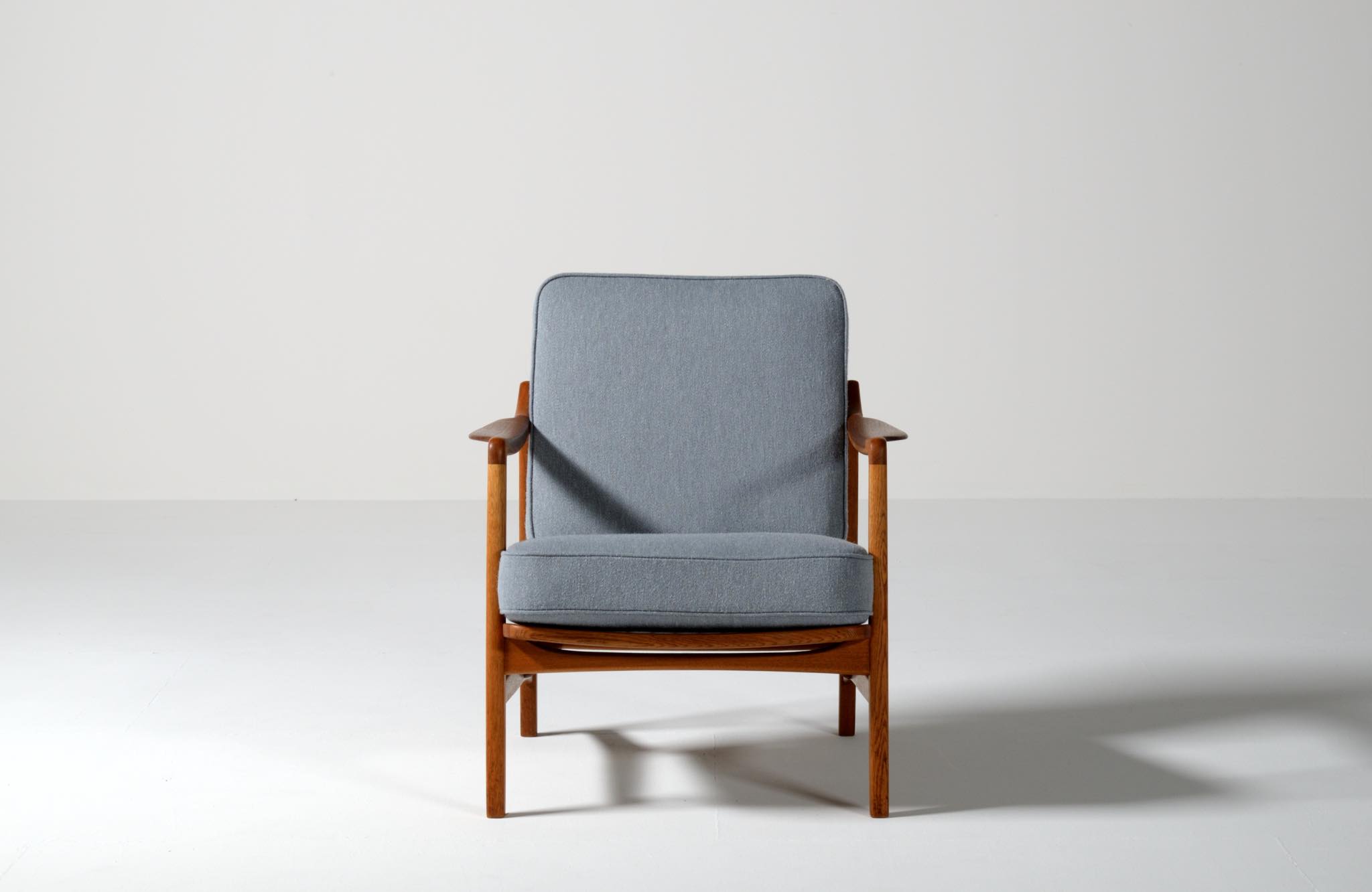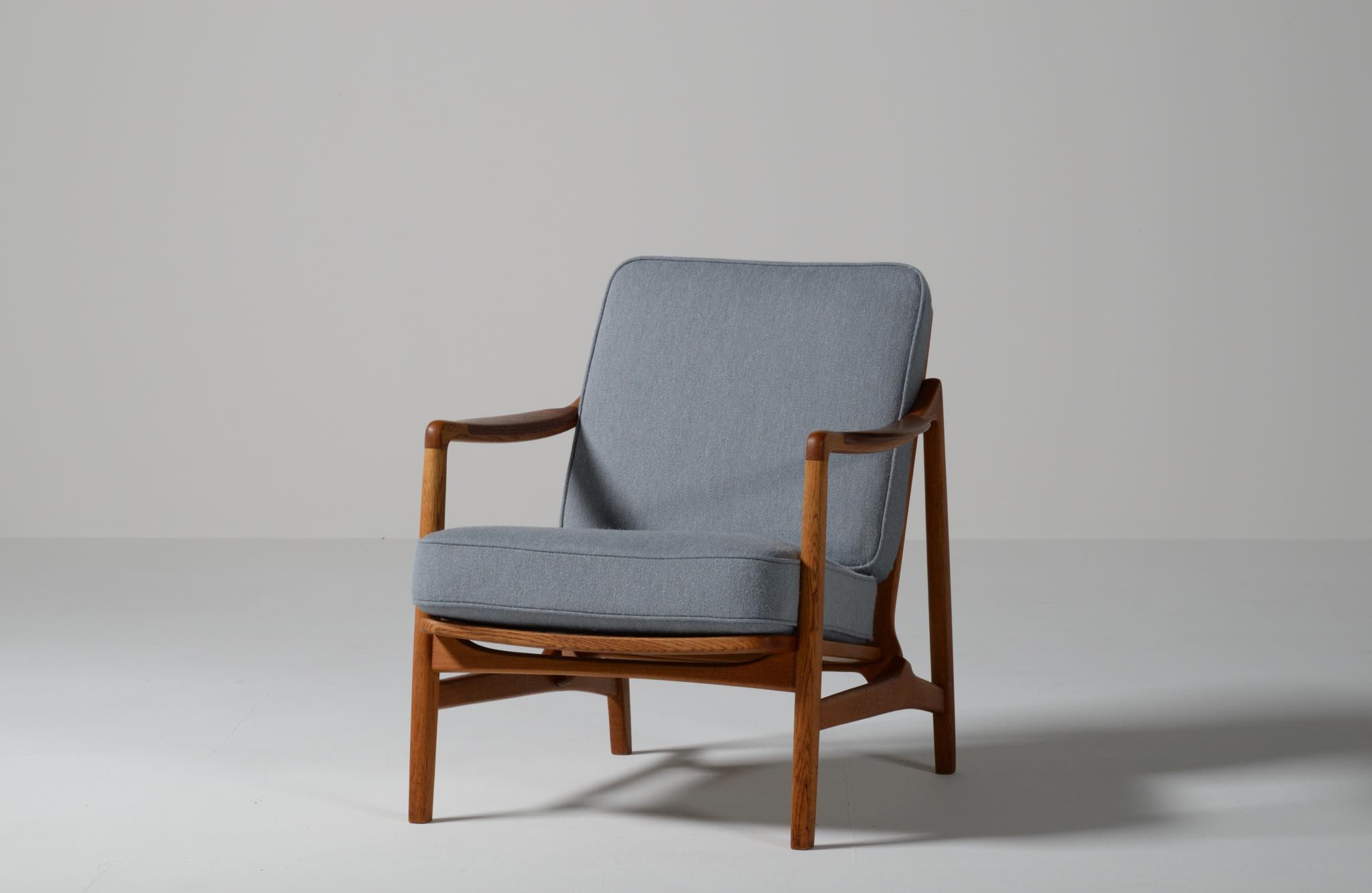 デンマーク家具デザイン黄金期の比較的早い時期から活躍したデザイナーユニット、Tove & Edvard Kindt-Larsen/トーべとエドヴァルド・キンド・ラーセン夫妻によるイージーチェアです。1956年に発表されたモデルで、この椅子もその頃に作られたものでしょう。オーク材のフレームにチーク材のアームをはめ込んだ構造が特徴的です。シートのファブリックは新たに張り替えました。スプリング内包型のクッションで、座りやすい椅子です。