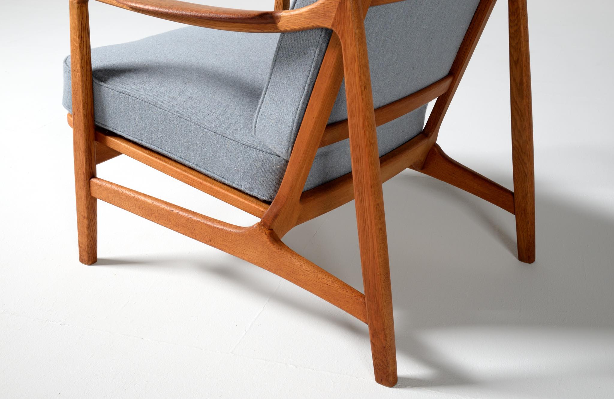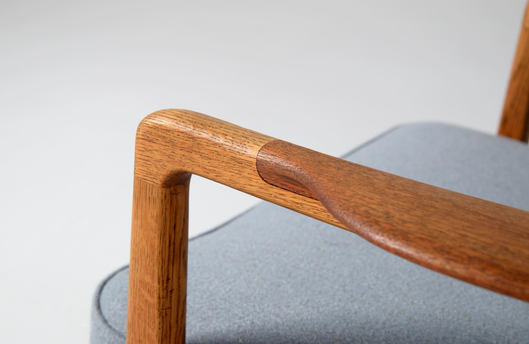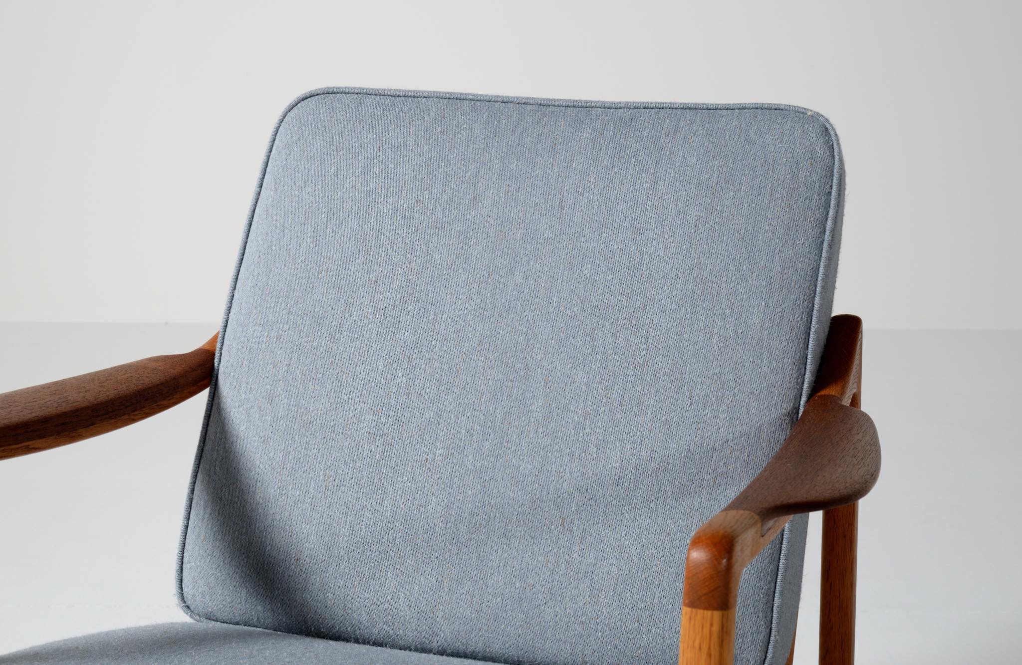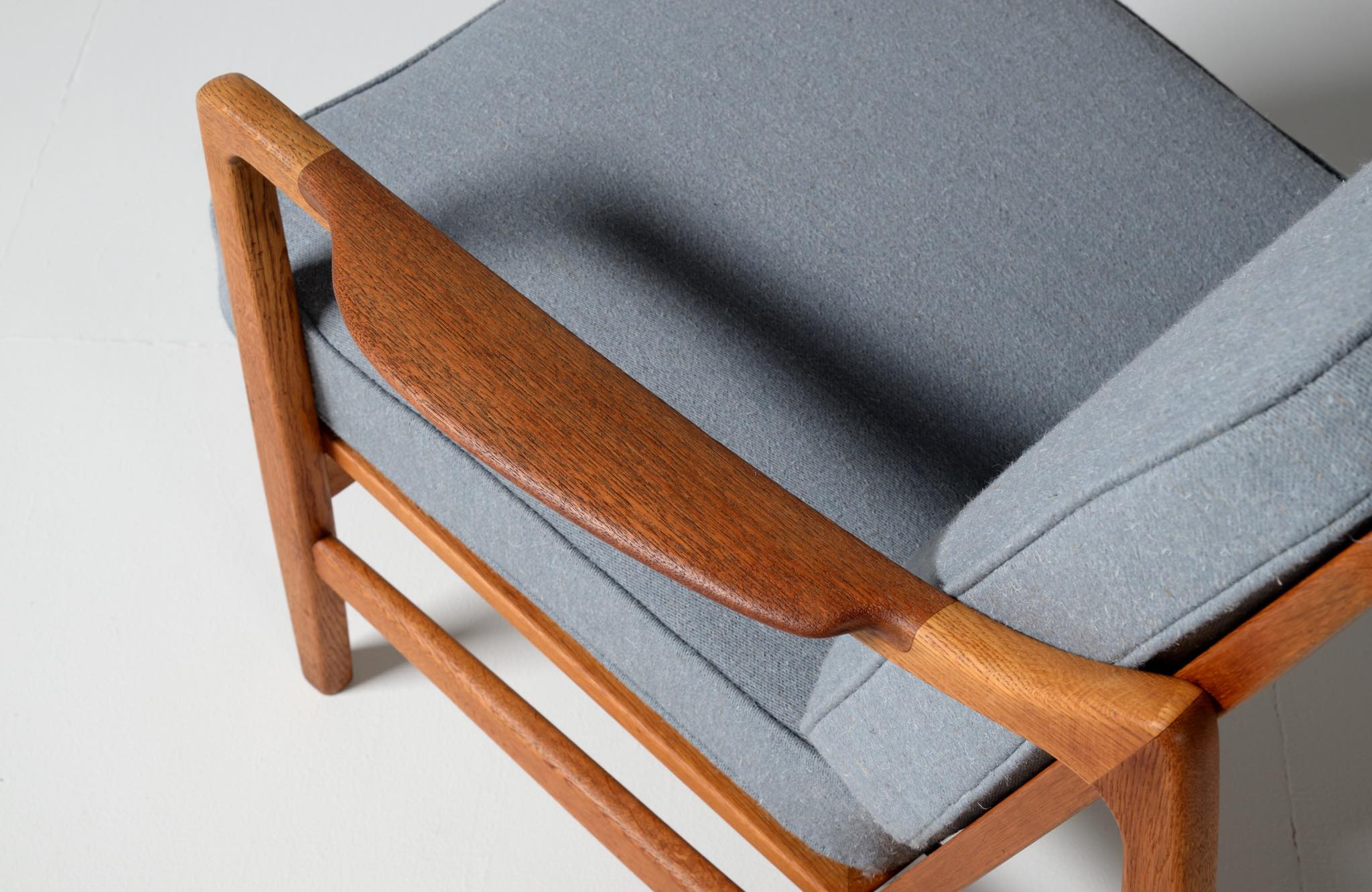 デンマーク家具デザイン黄金期の比較的早い時期から活躍したデザイナーユニット、Tove & Edvard Kindt-Larsen/トーべとエドヴァルド・キンド・ラーセン夫妻によるイージーチェアです。1956年に発表されたモデルで、この椅子もその頃に作られたものでしょう。オーク材のフレームにチーク材のアームをはめ込んだ構造が特徴的です。シートのファブリックは新たに張り替えました。スプリング内包型のクッションで、座りやすい椅子です。