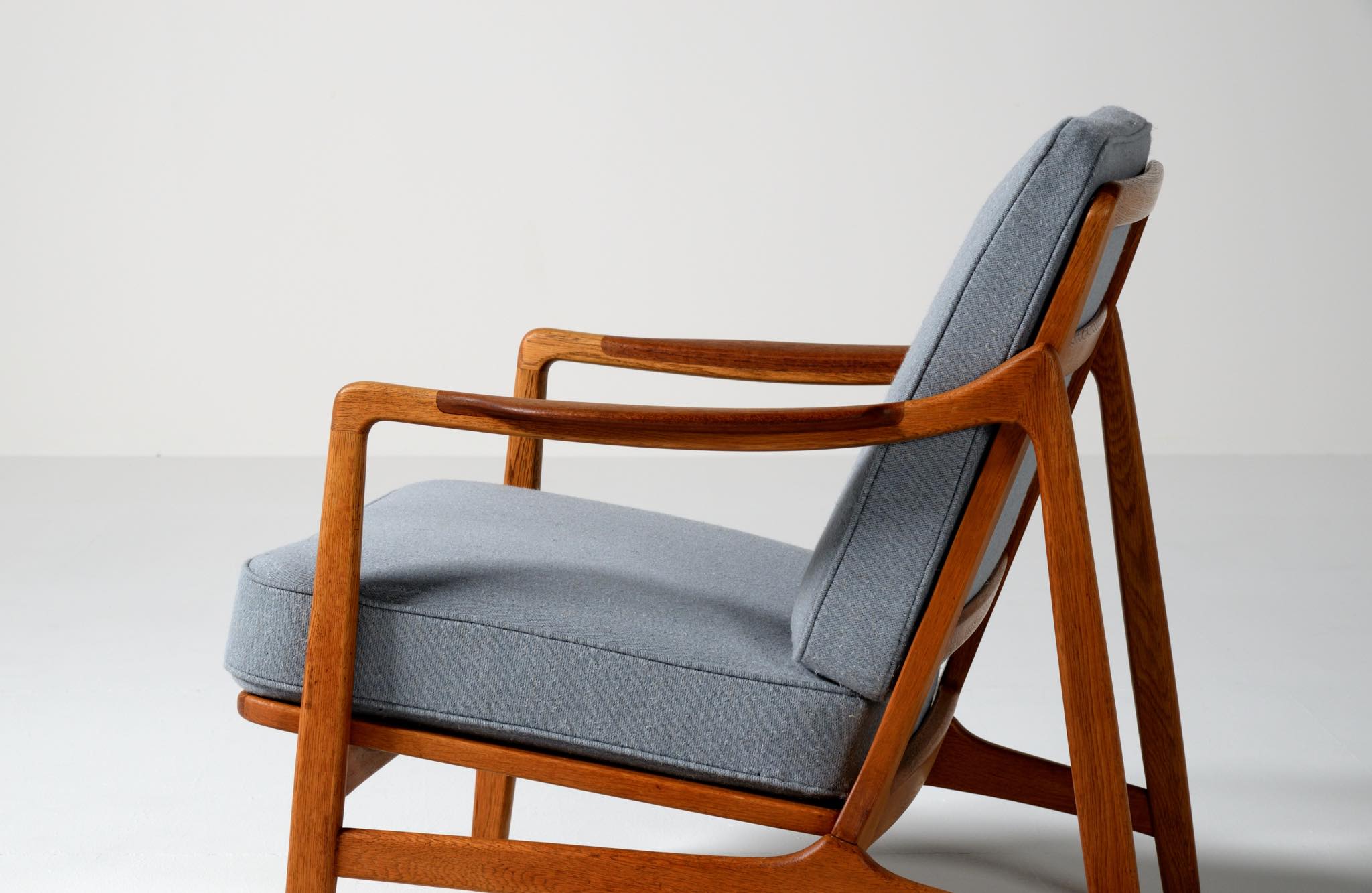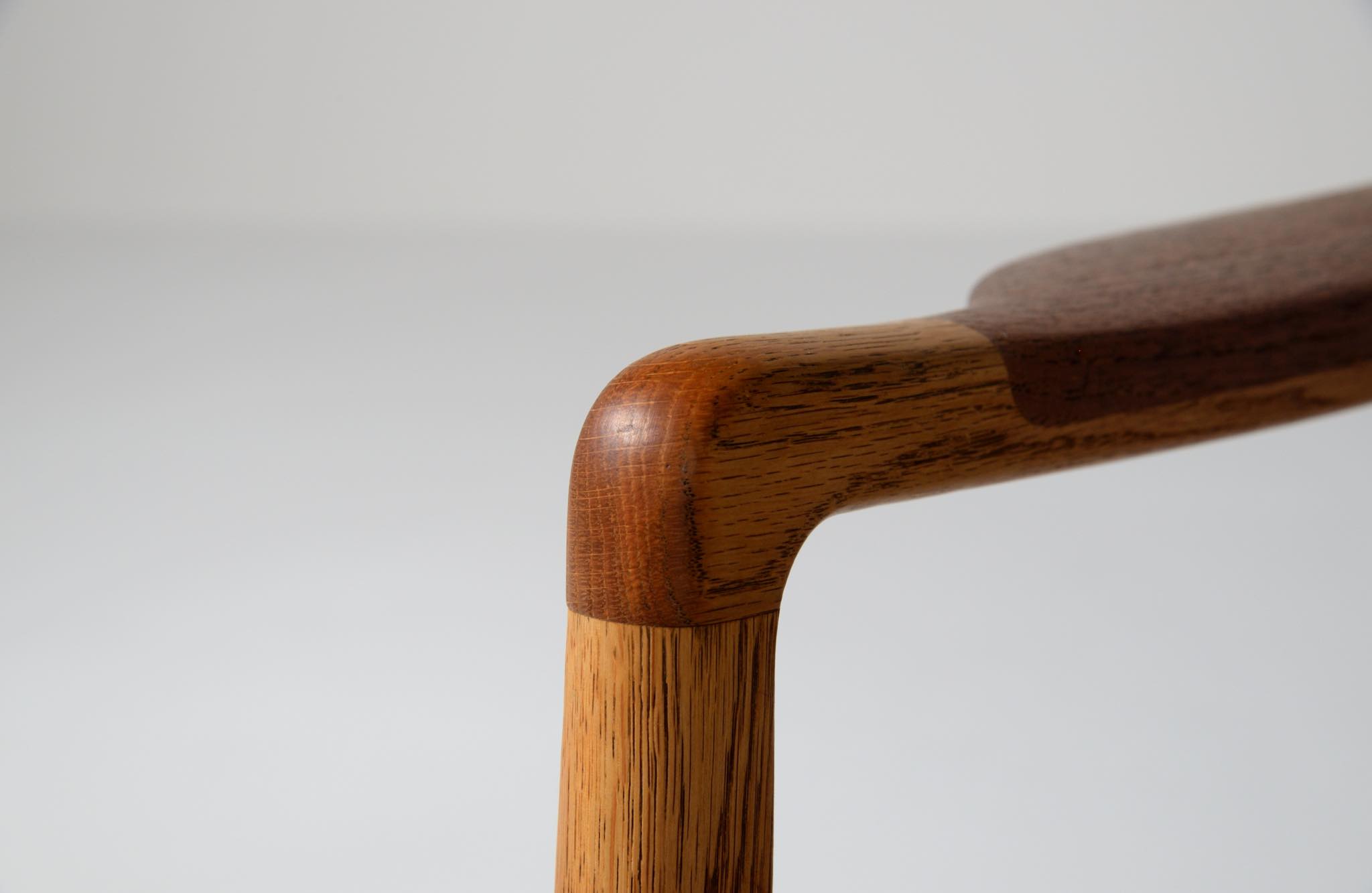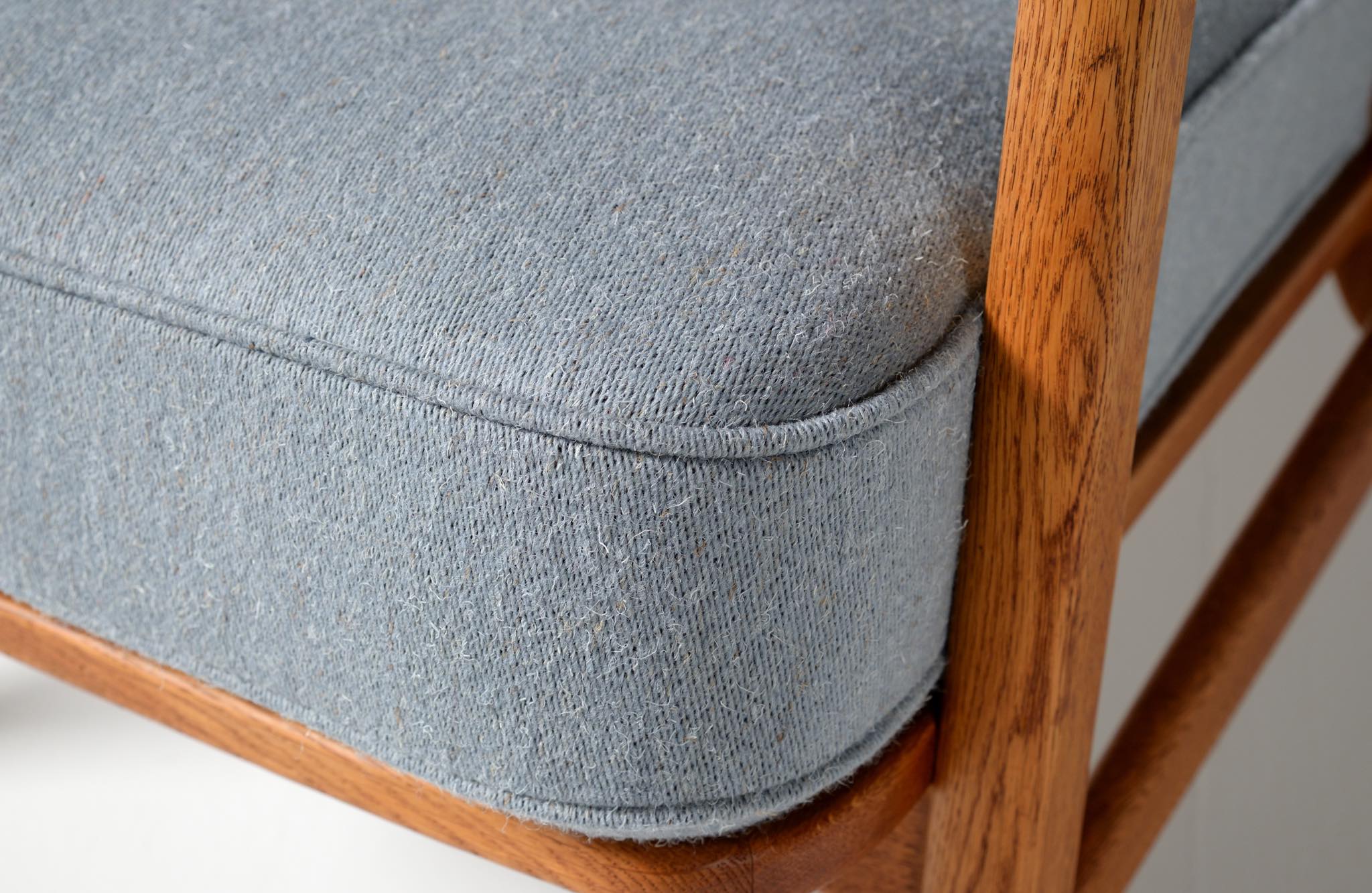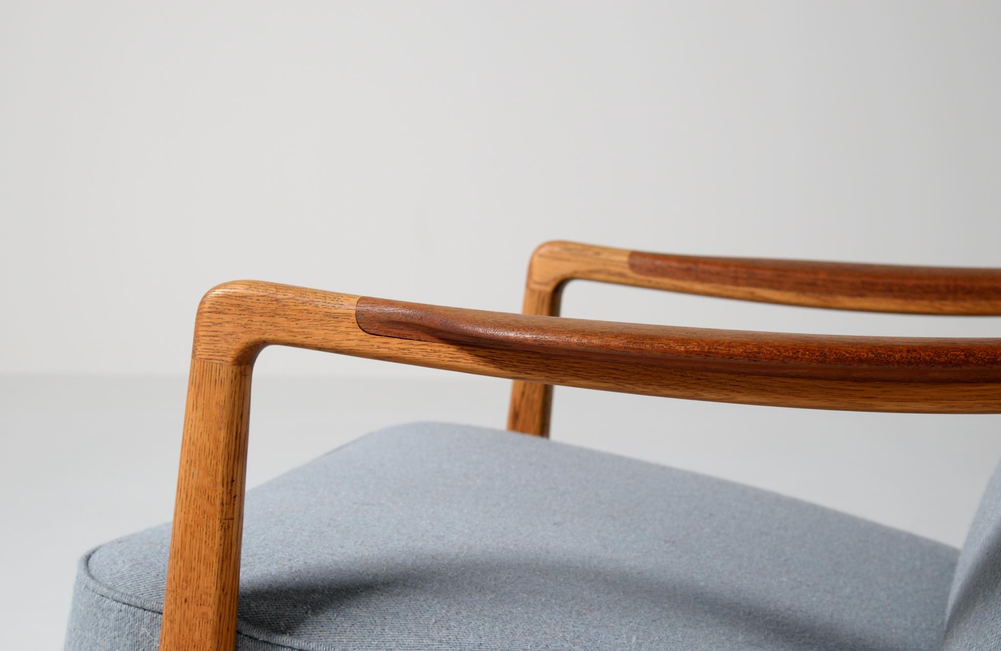 デンマーク家具デザイン黄金期の比較的早い時期から活躍したデザイナーユニット、Tove & Edvard Kindt-Larsen/トーべとエドヴァルド・キンド・ラーセン夫妻によるイージーチェアです。1956年に発表されたモデルで、この椅子もその頃に作られたものでしょう。オーク材のフレームにチーク材のアームをはめ込んだ構造が特徴的です。シートのファブリックは新たに張り替えました。スプリング内包型のクッションで、座りやすい椅子です。
