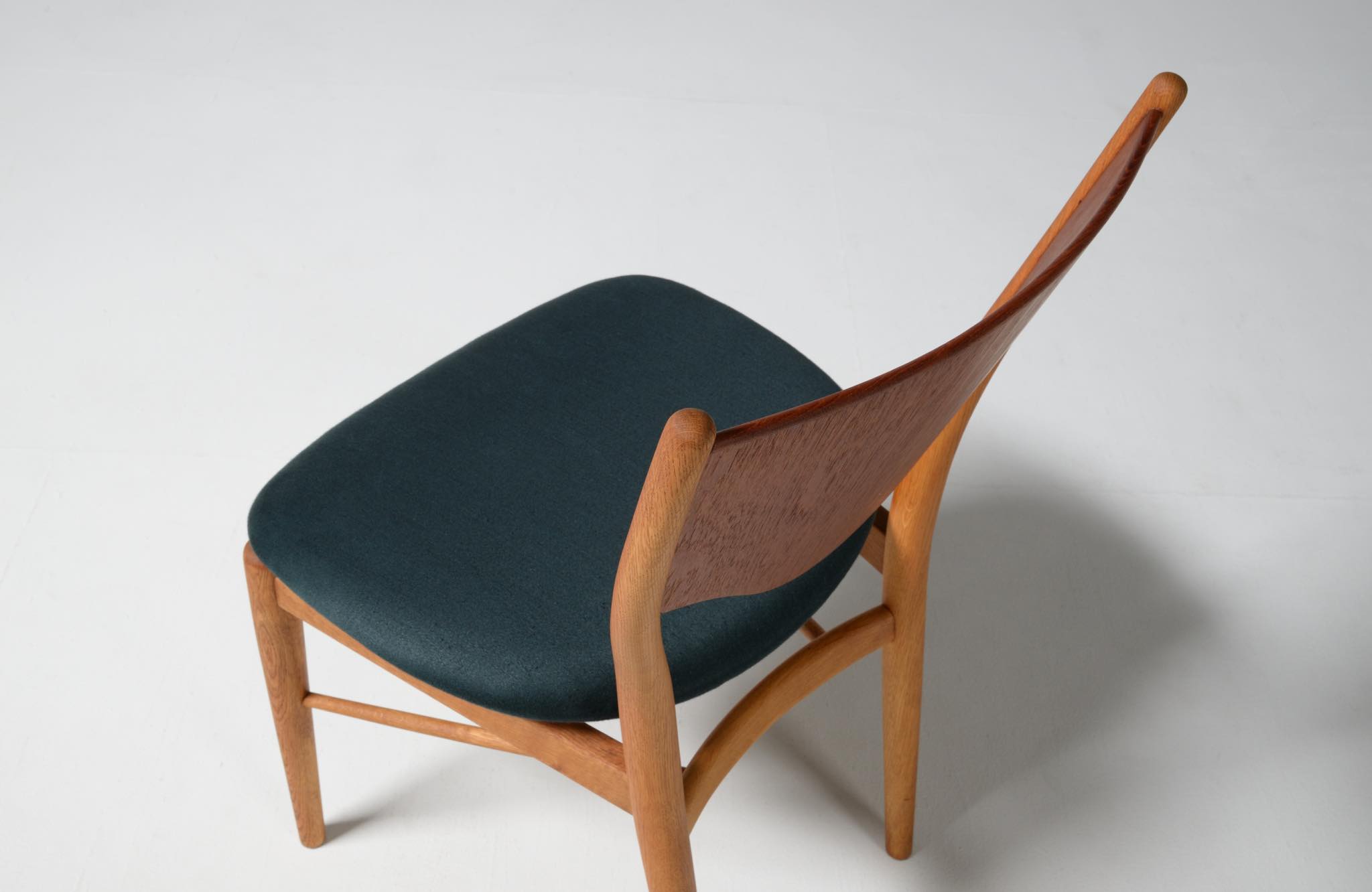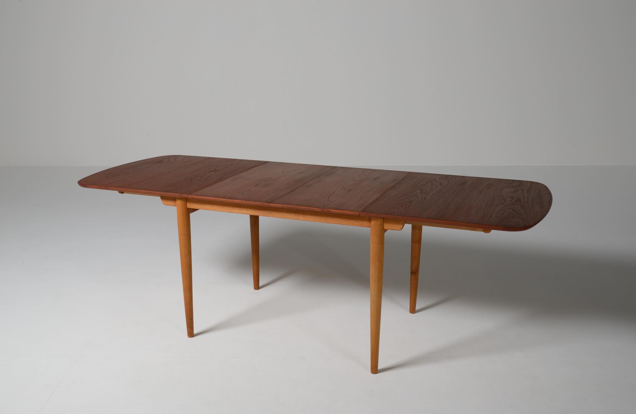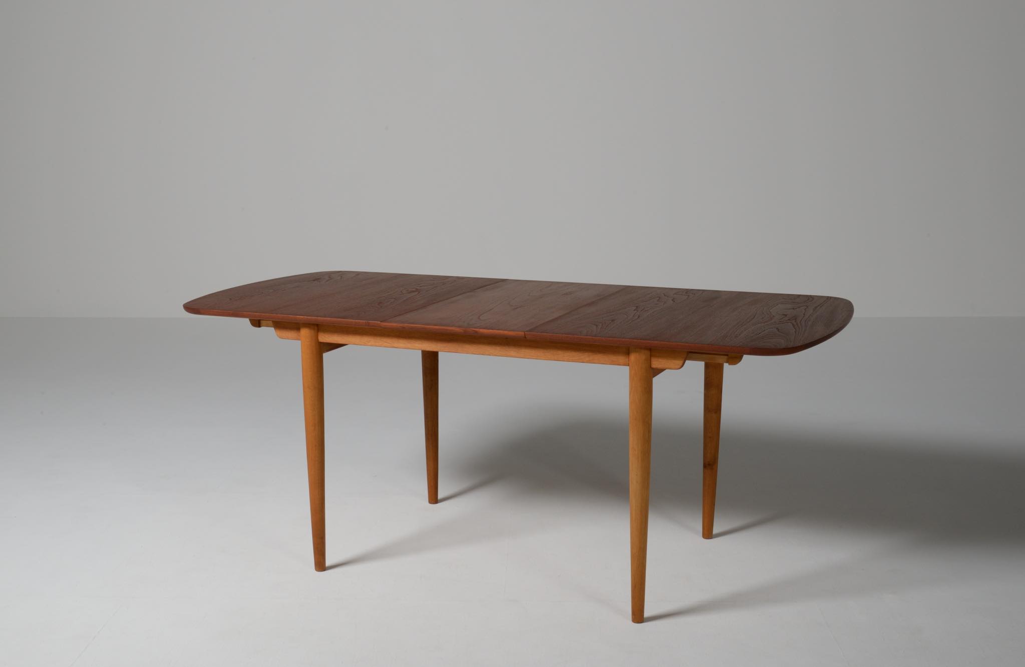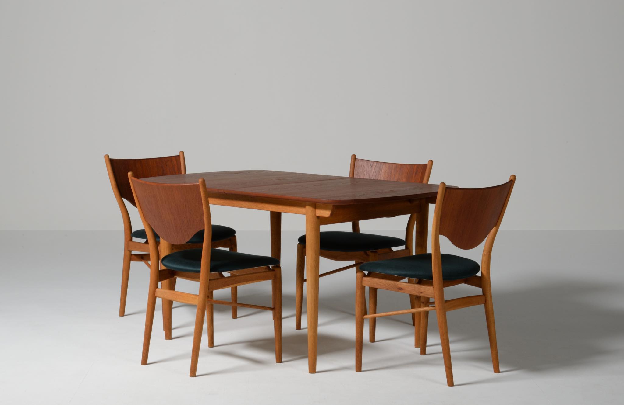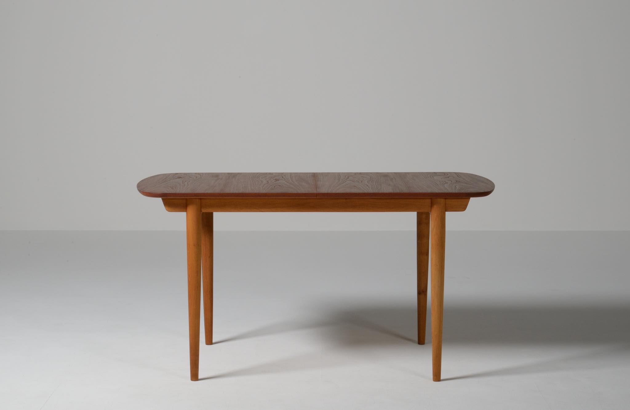 デンマークを代表するデザイナーのFinn Juhl/フィン・ユールによってデザインされたダイニングテーブルと椅子のセットです。1950年代に作られたものでしょう。テーブルはチーク材の天板にオーク材の脚の構成で、エクステンションリーフが二枚付属し、天板面積の拡張が可能です。天板に小傷が見られますが、全体に綺麗な状態です。椅子はチーク材の背もたれにオーク材のフレームの構成で、20世紀中葉に流行した異素材のコンビネーションが特徴です。笠木の表面突き板の一部に呼び継ぎ補修のあるものが一脚見られますが、構造的な問題はありません。また、6脚中1脚の「貫」にダメージが見られたため、同じオーク材によって再製作しています。こちらも構造的な問題はなく、6脚ともに綺麗な状態です。シートはイタリアのリネン生地、ロロピアーナインテリアのPavilionにて張り替えました。こちらはテーブルと椅子6脚との7点セットでの販売です。
