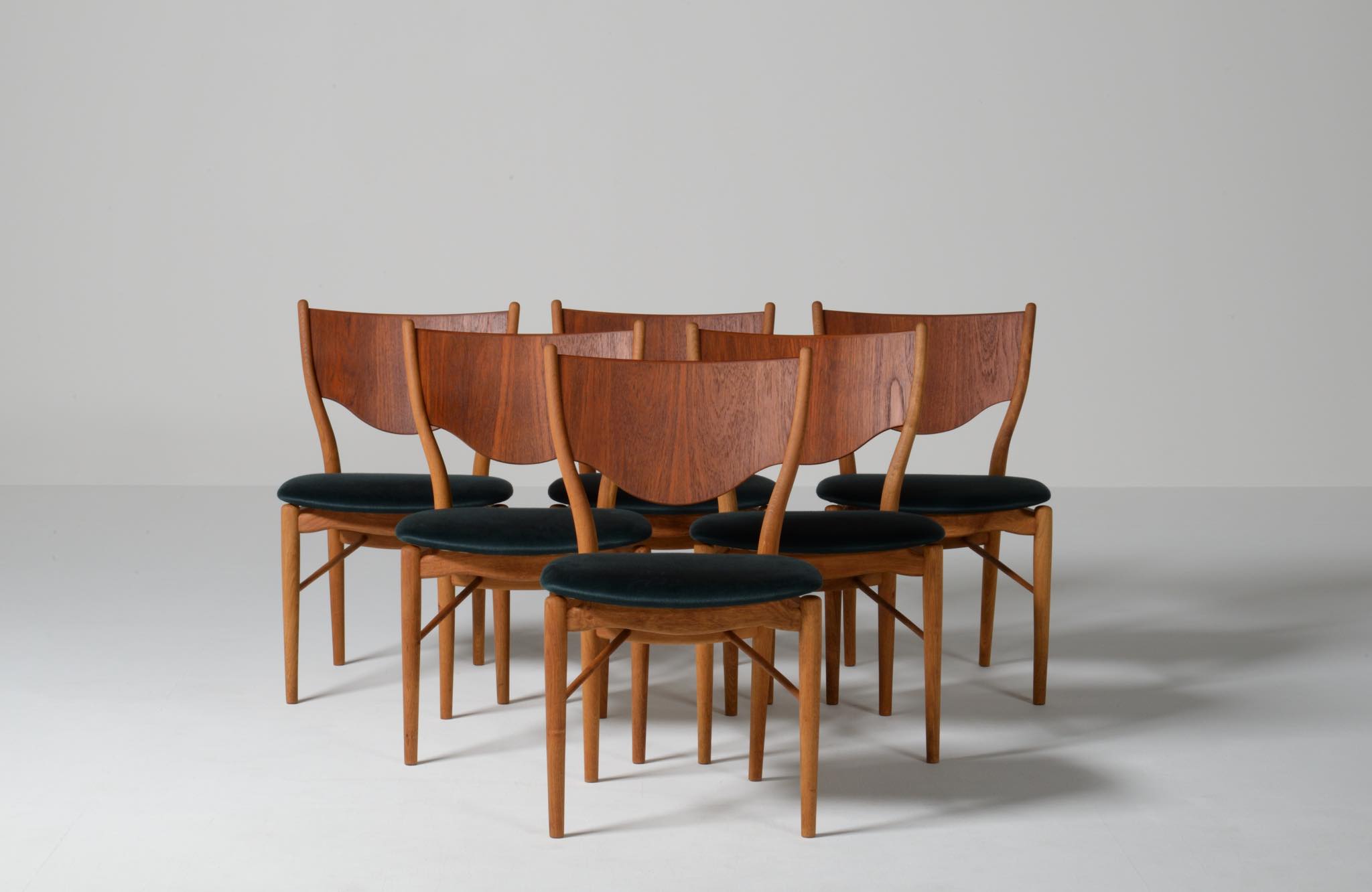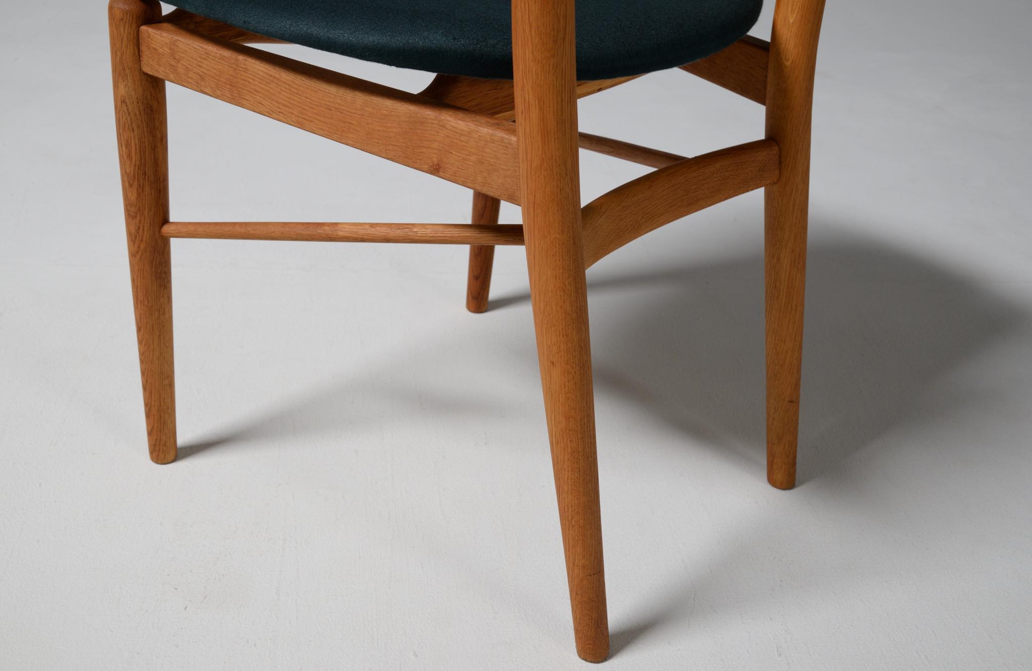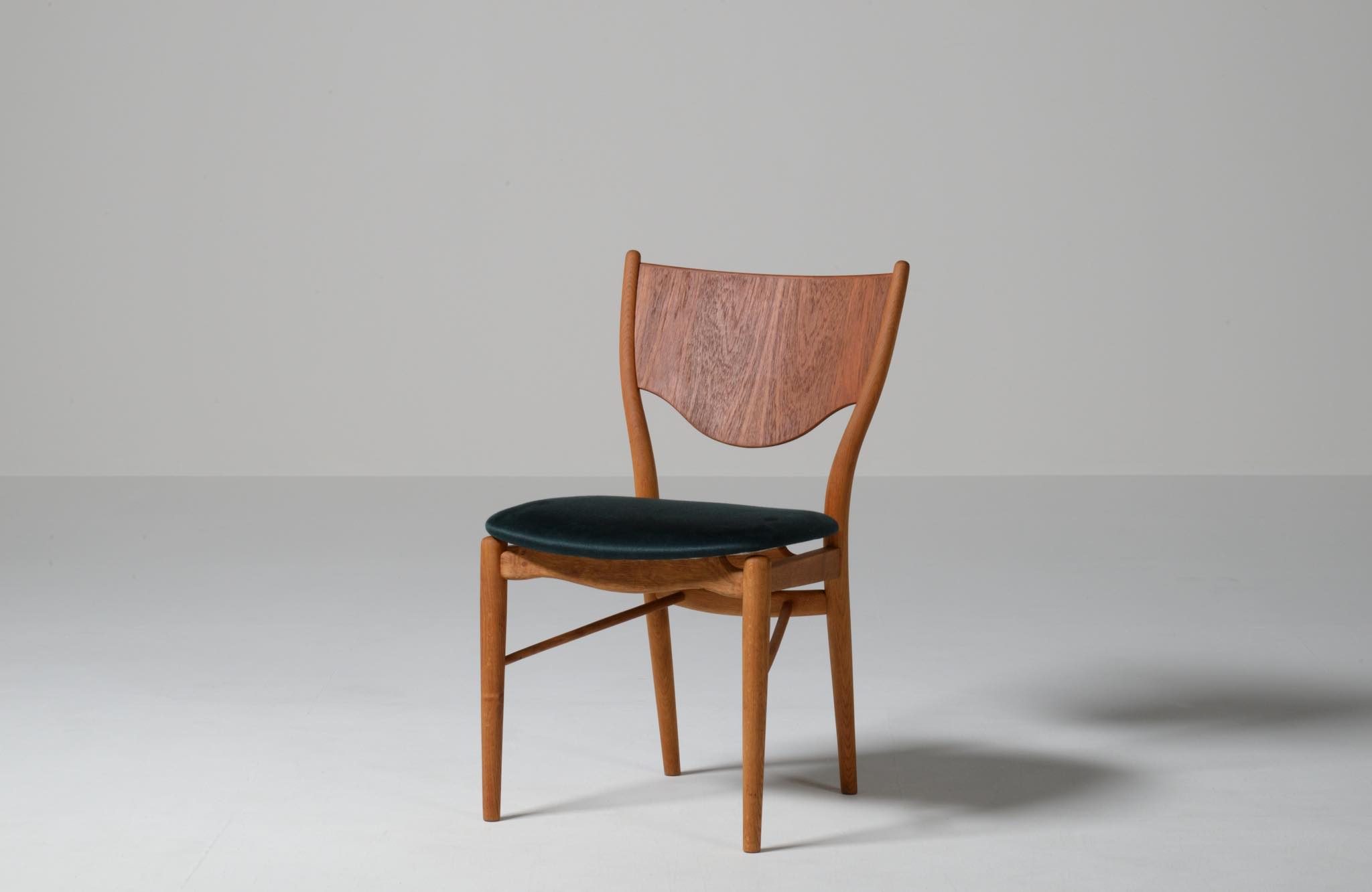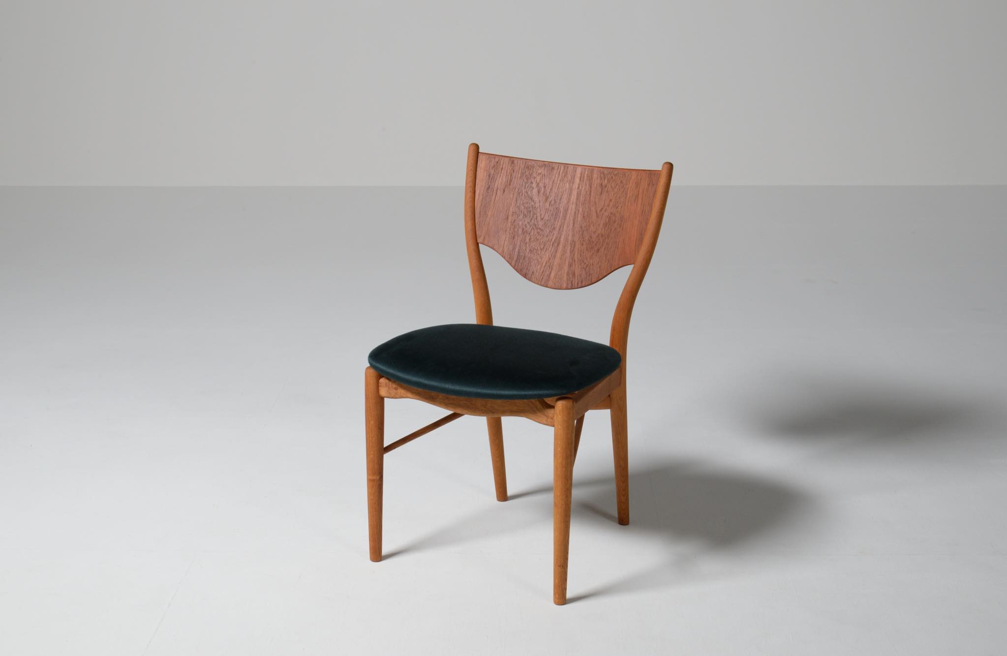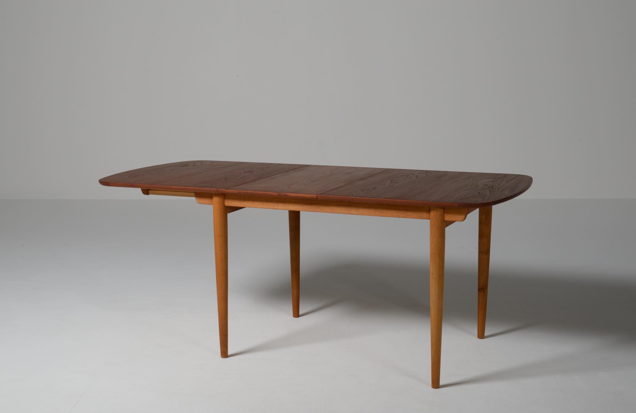 デンマークを代表するデザイナーのFinn Juhl/フィン・ユールによってデザインされたダイニングテーブルと椅子のセットです。1950年代に作られたものでしょう。テーブルはチーク材の天板にオーク材の脚の構成で、エクステンションリーフが二枚付属し、天板面積の拡張が可能です。天板に小傷が見られますが、全体に綺麗な状態です。椅子はチーク材の背もたれにオーク材のフレームの構成で、20世紀中葉に流行した異素材のコンビネーションが特徴です。笠木の表面突き板の一部に呼び継ぎ補修のあるものが一脚見られますが、構造的な問題はありません。また、6脚中1脚の「貫」にダメージが見られたため、同じオーク材によって再製作しています。こちらも構造的な問題はなく、6脚ともに綺麗な状態です。シートはイタリアのリネン生地、ロロピアーナインテリアのPavilionにて張り替えました。こちらはテーブルと椅子6脚との7点セットでの販売です。