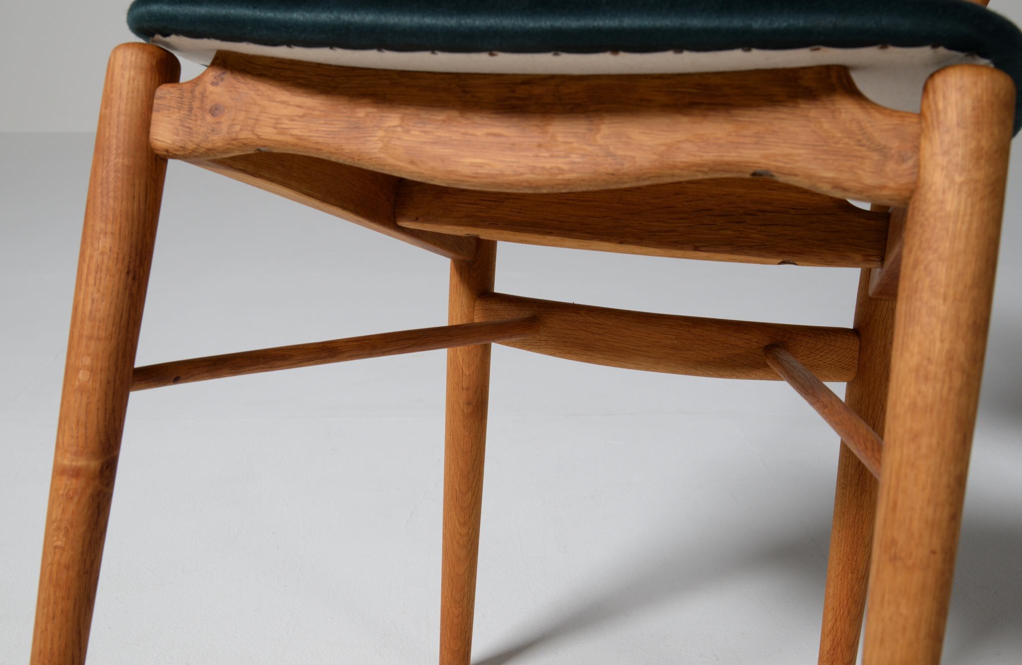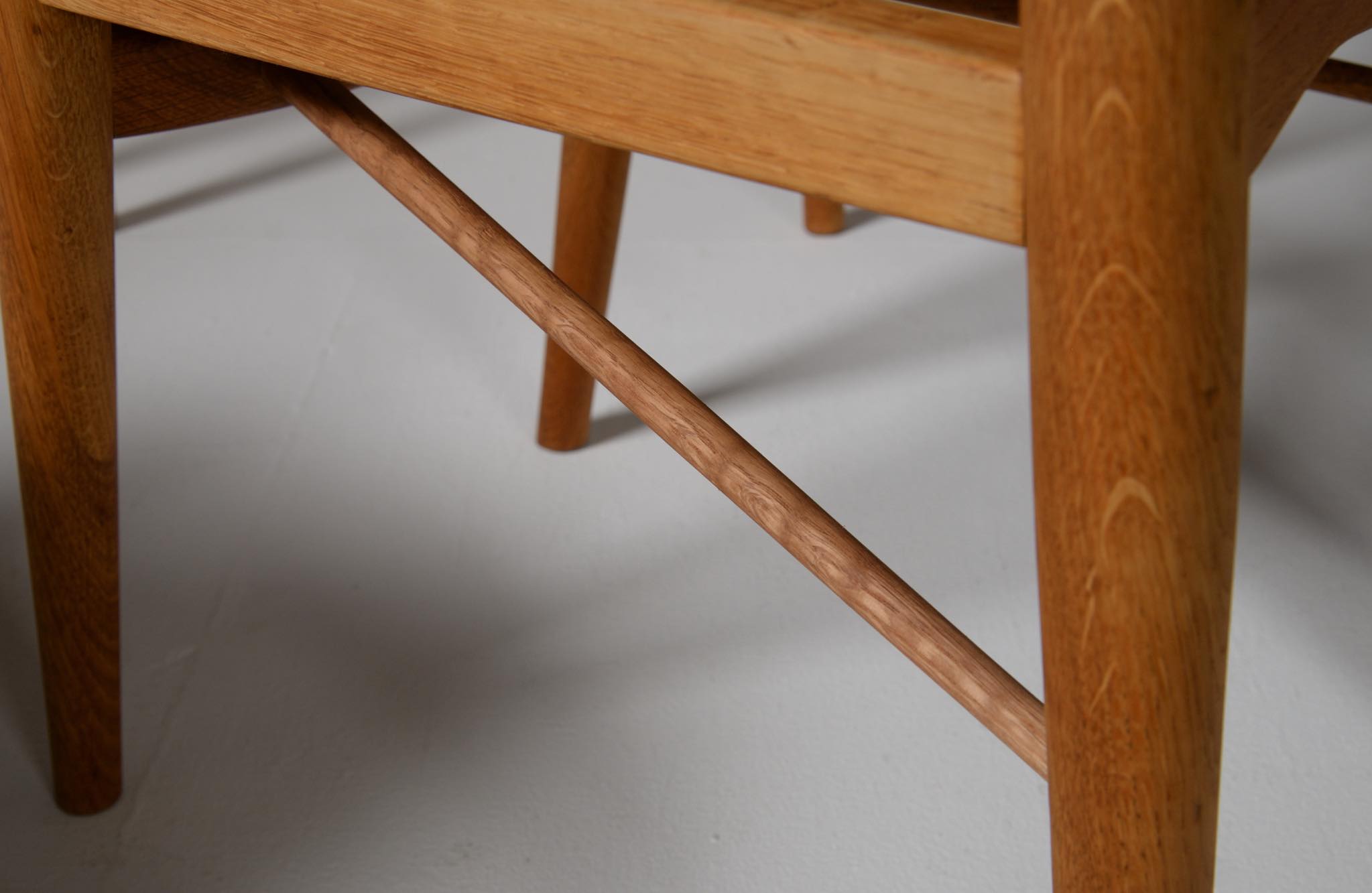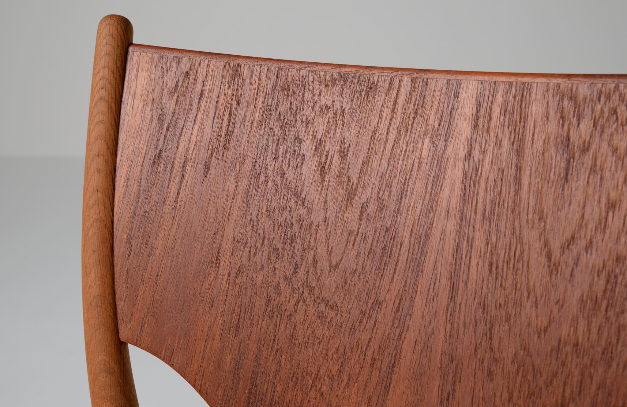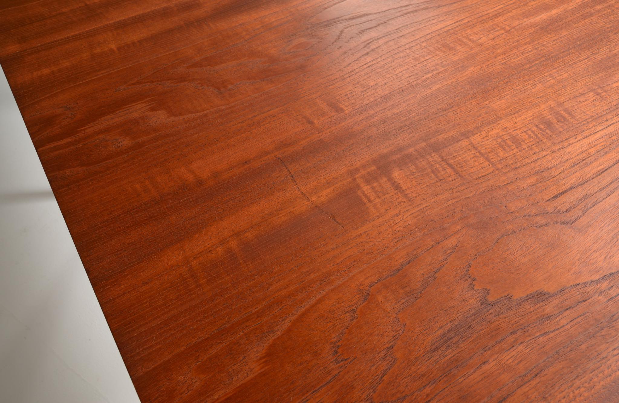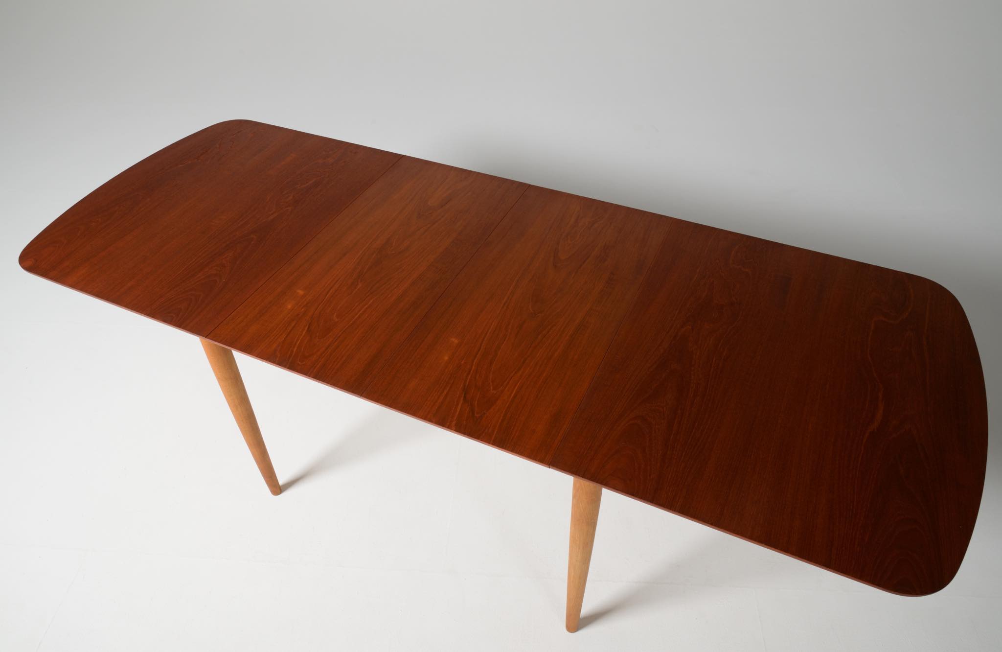 デンマークを代表するデザイナーのFinn Juhl/フィン・ユールによってデザインされたダイニングテーブルと椅子のセットです。1950年代に作られたものでしょう。テーブルはチーク材の天板にオーク材の脚の構成で、エクステンションリーフが二枚付属し、天板面積の拡張が可能です。天板に小傷が見られますが、全体に綺麗な状態です。椅子はチーク材の背もたれにオーク材のフレームの構成で、20世紀中葉に流行した異素材のコンビネーションが特徴です。笠木の表面突き板の一部に呼び継ぎ補修のあるものが一脚見られますが、構造的な問題はありません。また、6脚中1脚の「貫」にダメージが見られたため、同じオーク材によって再製作しています。こちらも構造的な問題はなく、6脚ともに綺麗な状態です。シートはイタリアのリネン生地、ロロピアーナインテリアのPavilionにて張り替えました。こちらはテーブルと椅子6脚との7点セットでの販売です。