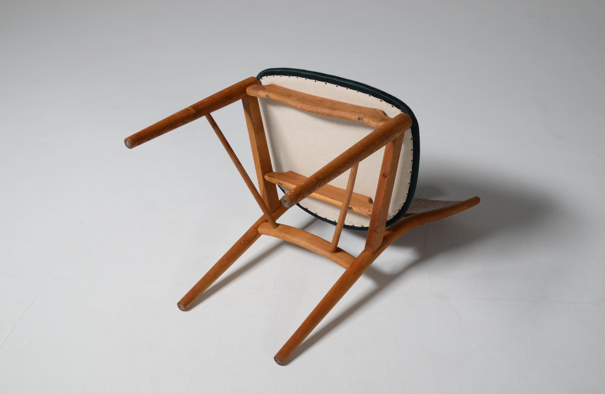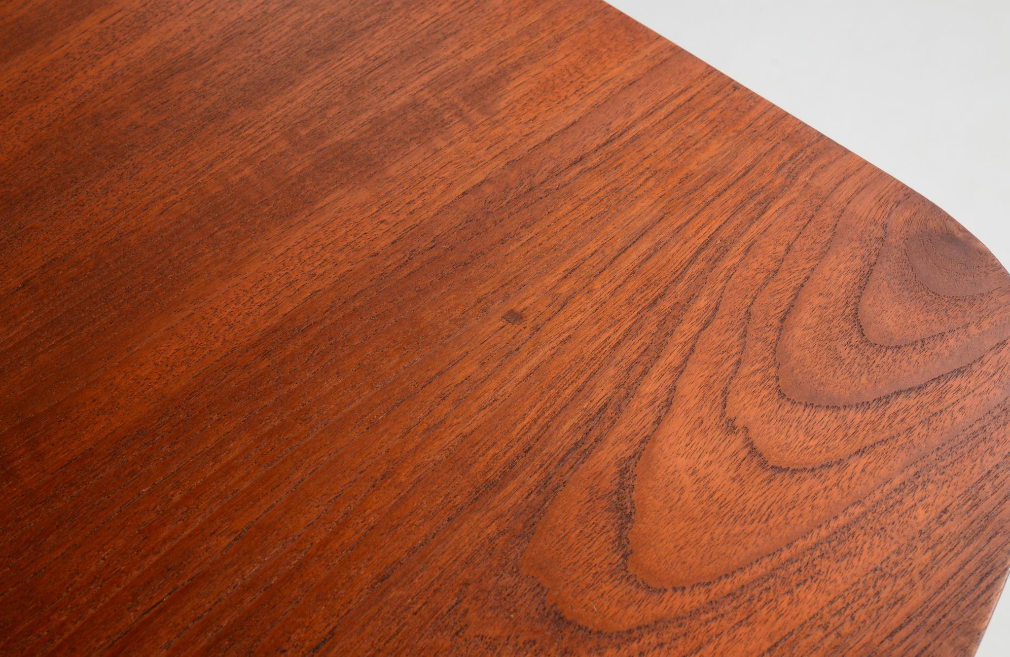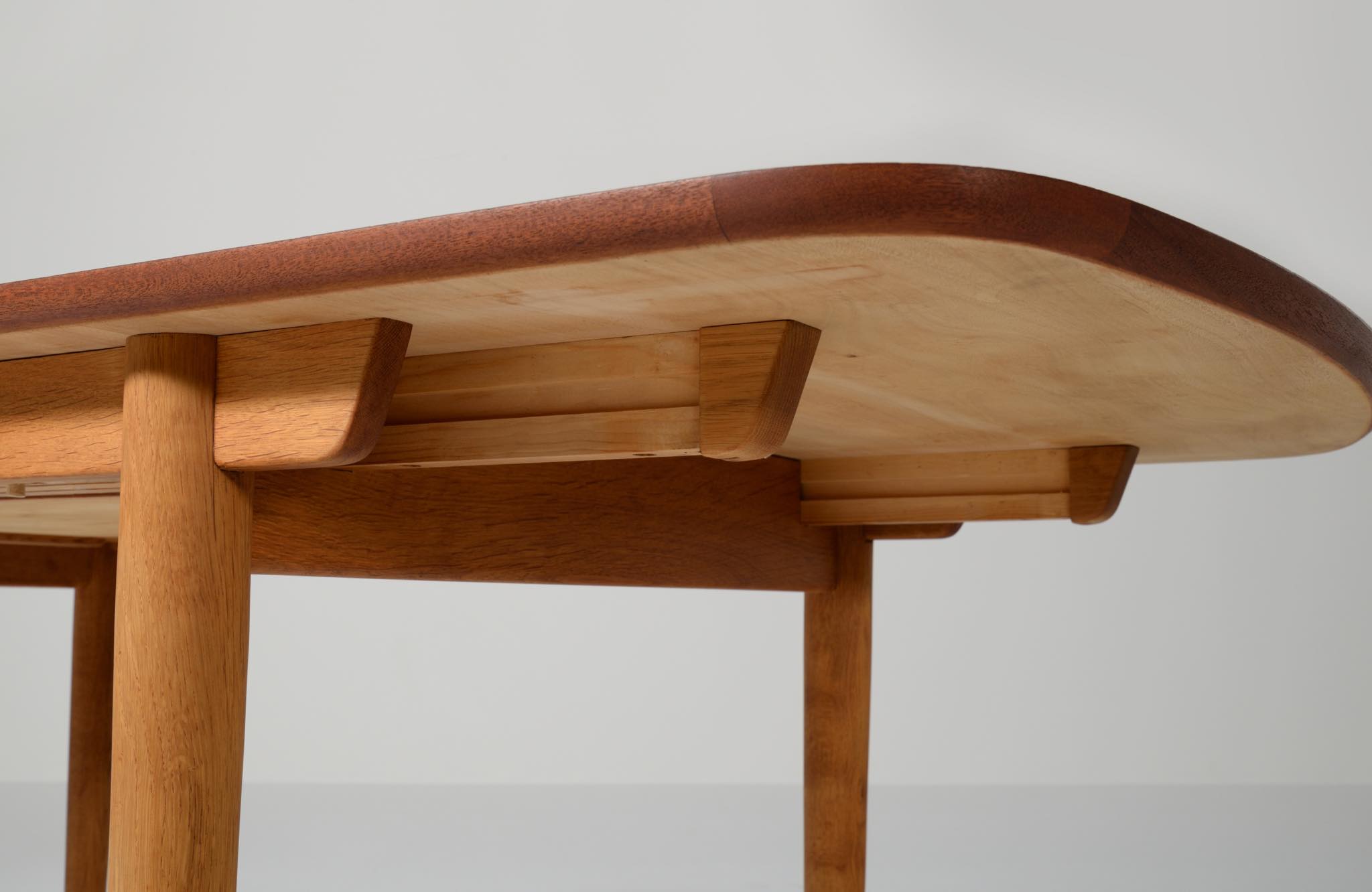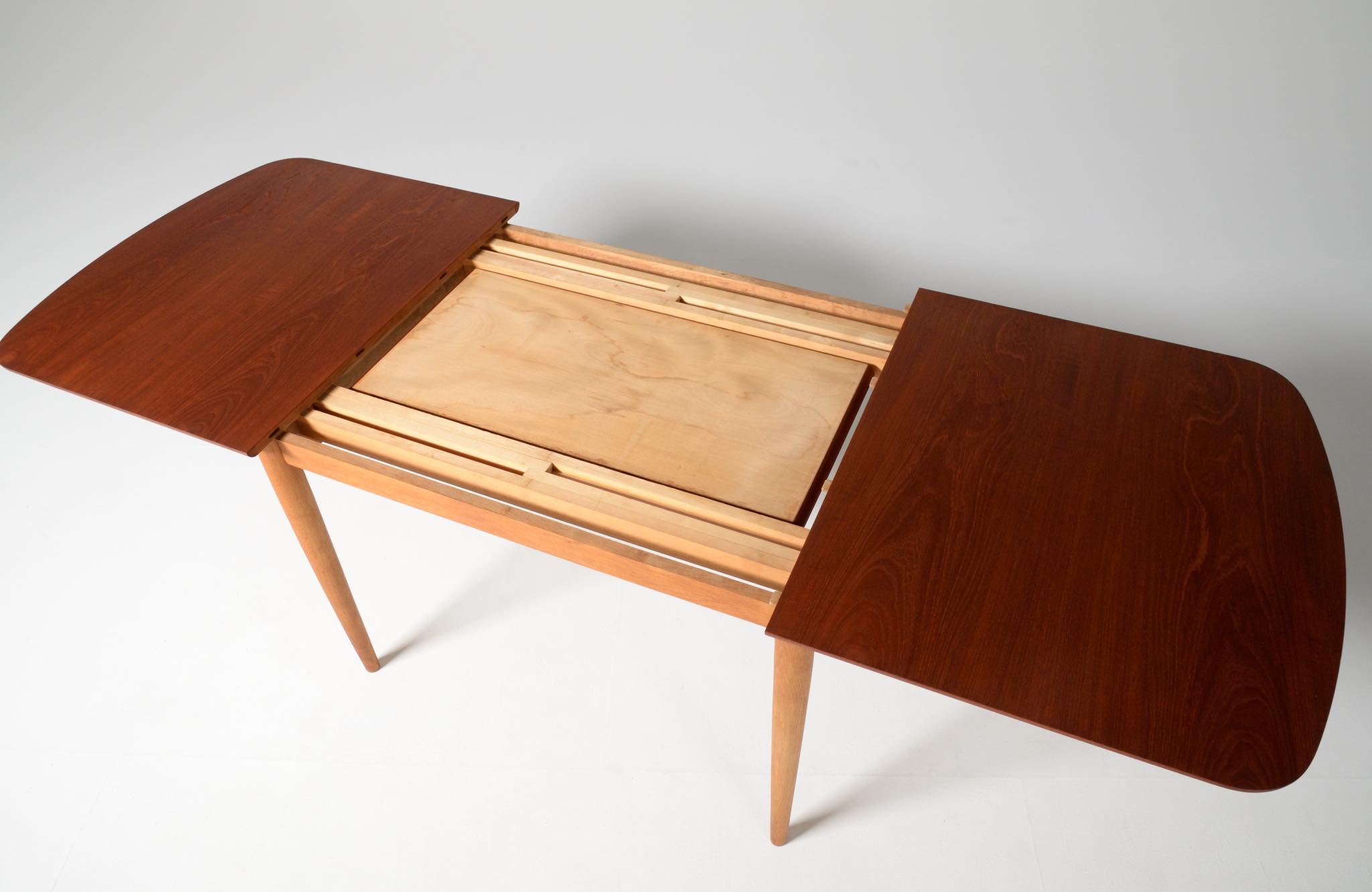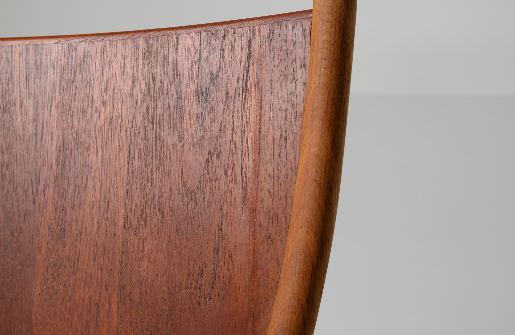 デンマークを代表するデザイナーのFinn Juhl/フィン・ユールによってデザインされたダイニングテーブルと椅子のセットです。1950年代に作られたものでしょう。テーブルはチーク材の天板にオーク材の脚の構成で、エクステンションリーフが二枚付属し、天板面積の拡張が可能です。天板に小傷が見られますが、全体に綺麗な状態です。椅子はチーク材の背もたれにオーク材のフレームの構成で、20世紀中葉に流行した異素材のコンビネーションが特徴です。笠木の表面突き板の一部に呼び継ぎ補修のあるものが一脚見られますが、構造的な問題はありません。また、6脚中1脚の「貫」にダメージが見られたため、同じオーク材によって再製作しています。こちらも構造的な問題はなく、6脚ともに綺麗な状態です。シートはイタリアのリネン生地、ロロピアーナインテリアのPavilionにて張り替えました。こちらはテーブルと椅子6脚との7点セットでの販売です。