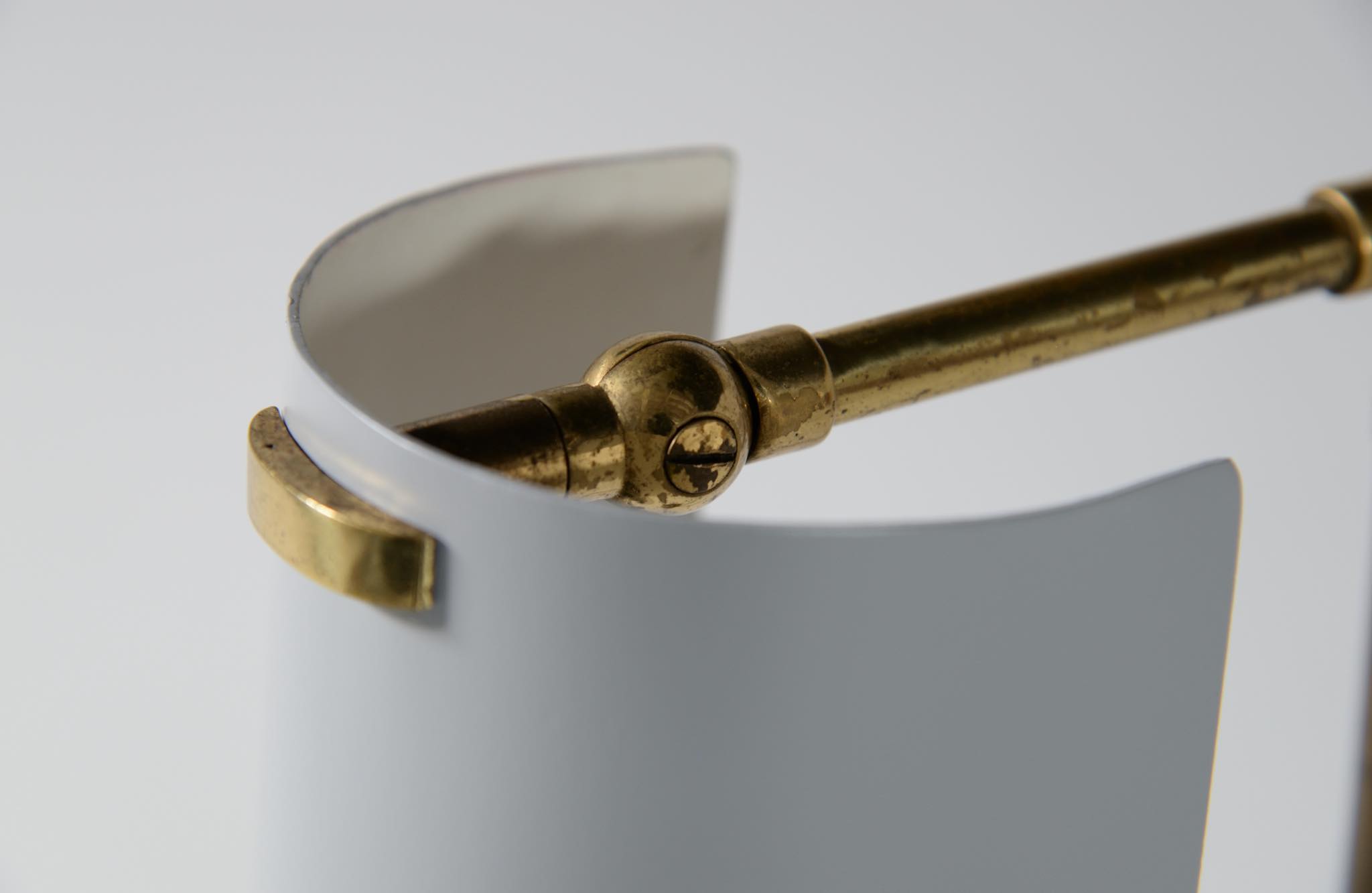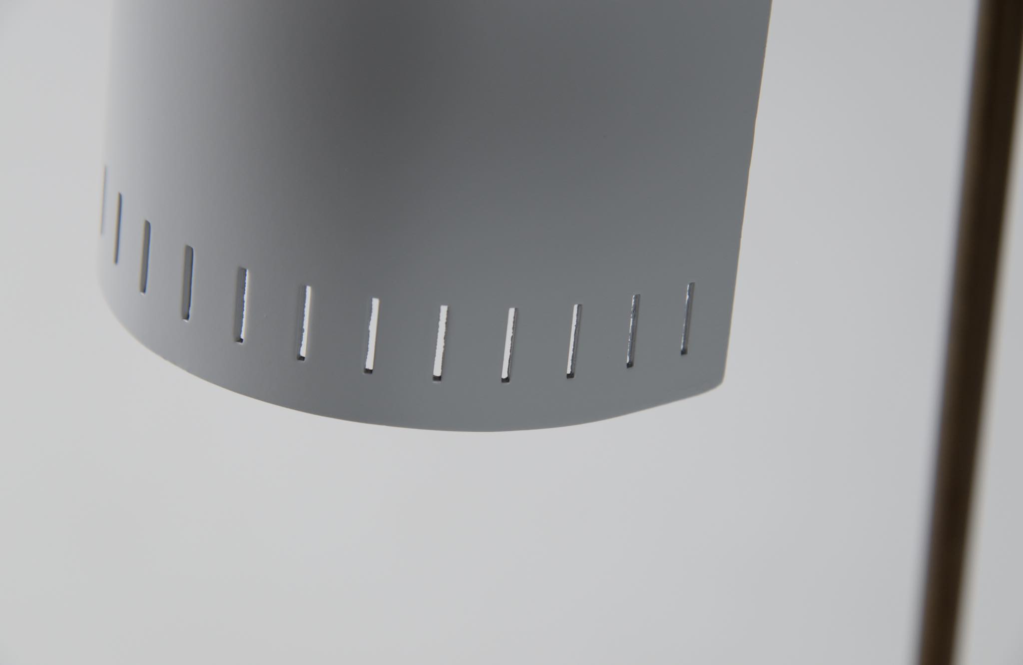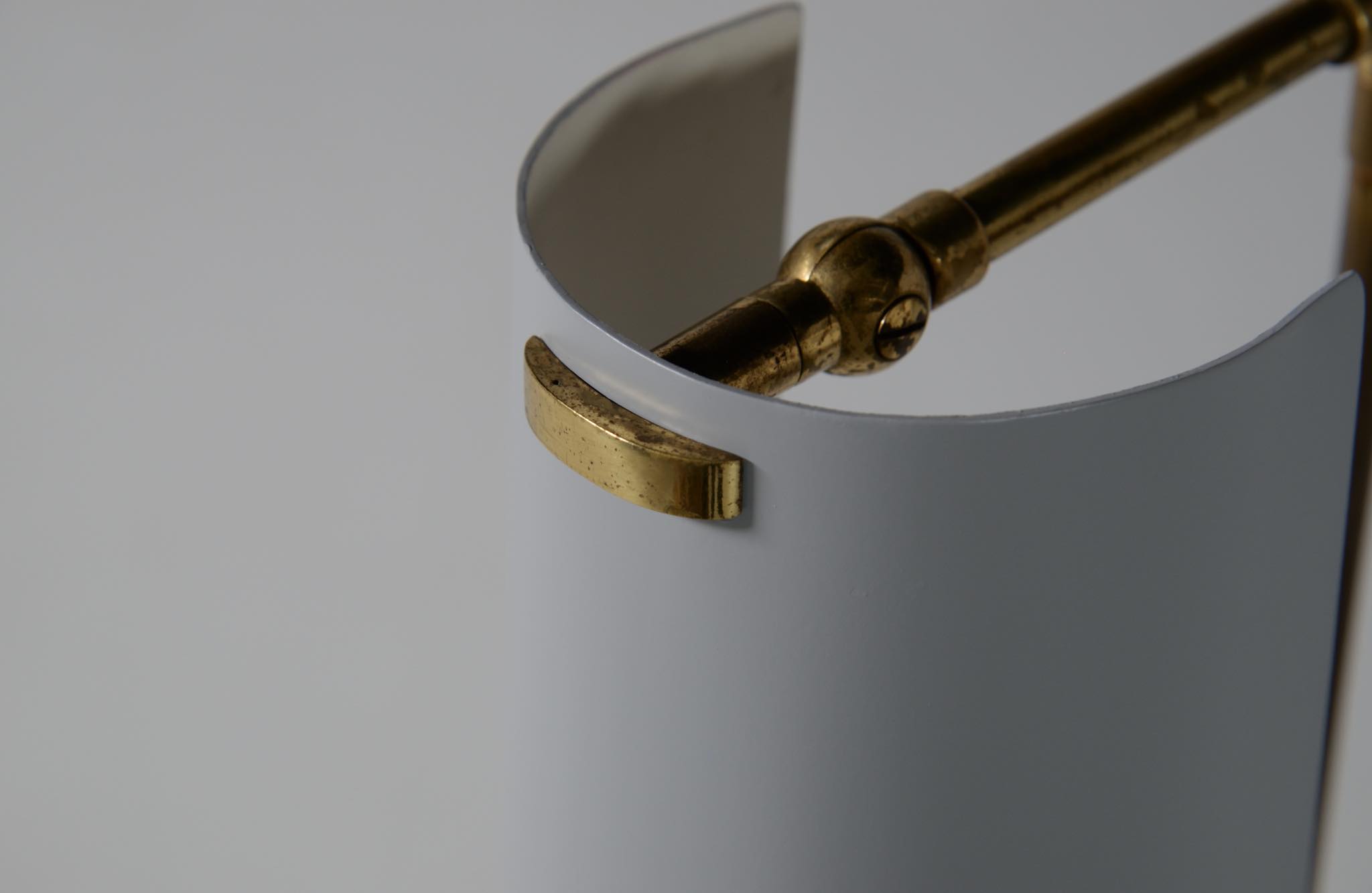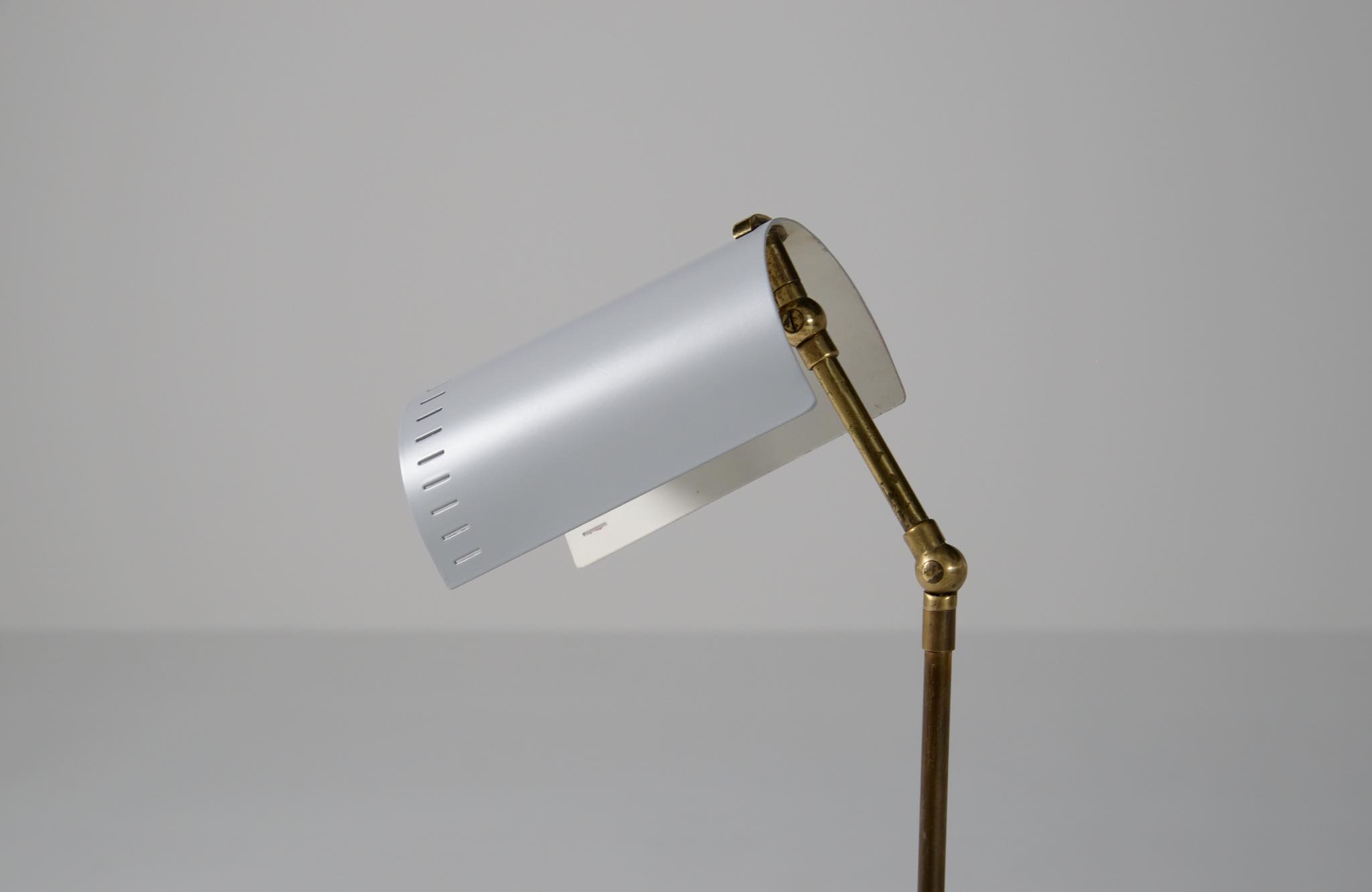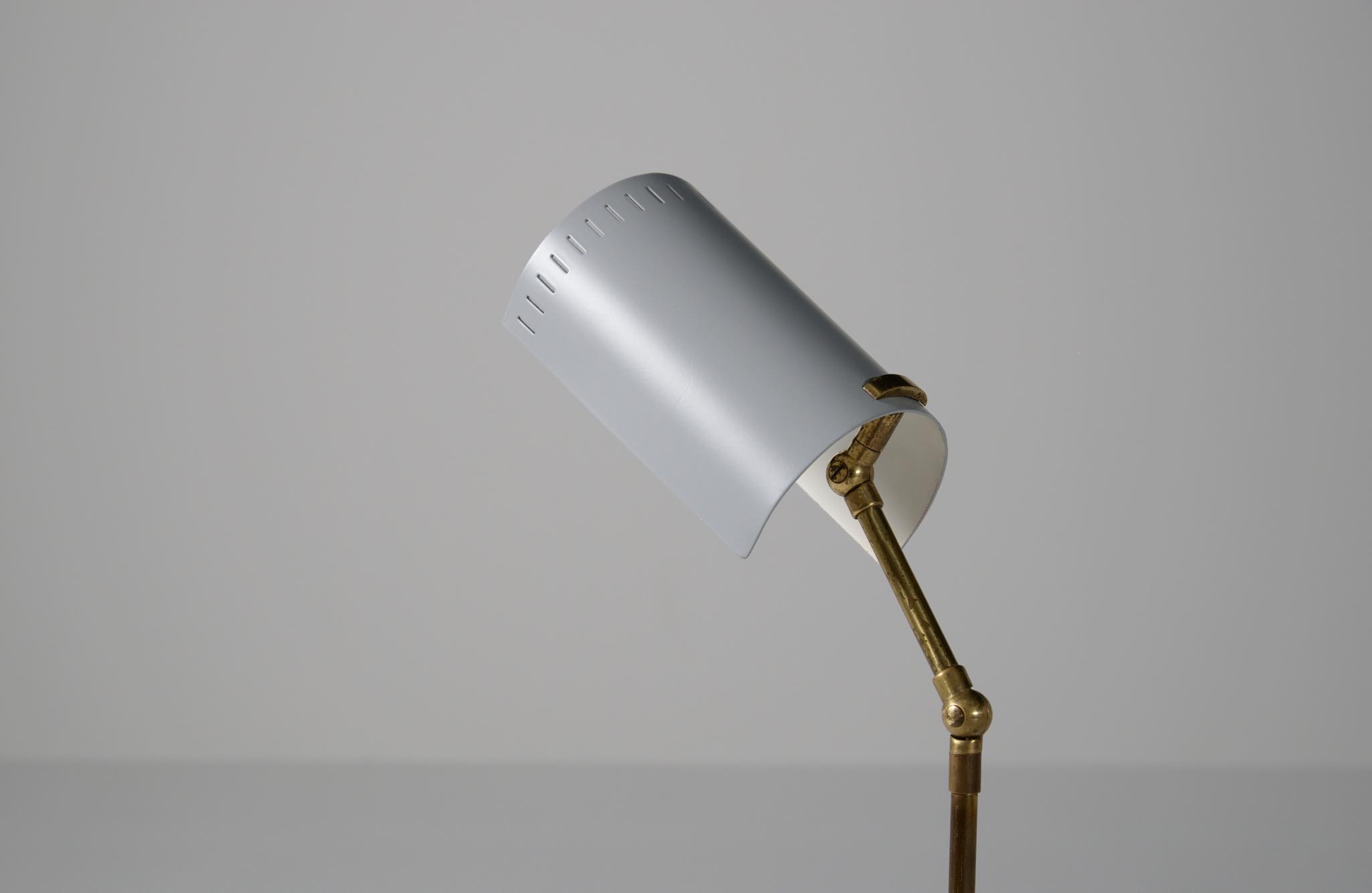 デンマーク製、1950年代頃に作られたリーディングランプです。スチールや真鍮などを用いて作られており、ふたつの関節でシェードの向きを自由に変えることができます。亜鉛アルミで作られた透かしのシェード表面の傷が目立ったため、再塗装して整えましたが、電球側の白い部分はあえてそのままにしております。ベースは真鍮の薄板のため柔らかいようで、若干の歪みや小傷が生じていますが、全体に良い雰囲気です。Lyfaや Føg & Mørupなどの知られたランプ工房で作られたものではないかと思われますが、資料に乏しく詳しいことは判っておりません。戦後のデンマークでは戦時に備えた金属回収令によって職を追われた銀職人達が、戦後のモダンデザインの時代になり鉄や真鍮等を用いて個々の工房でランプを作り始めたと云われています。