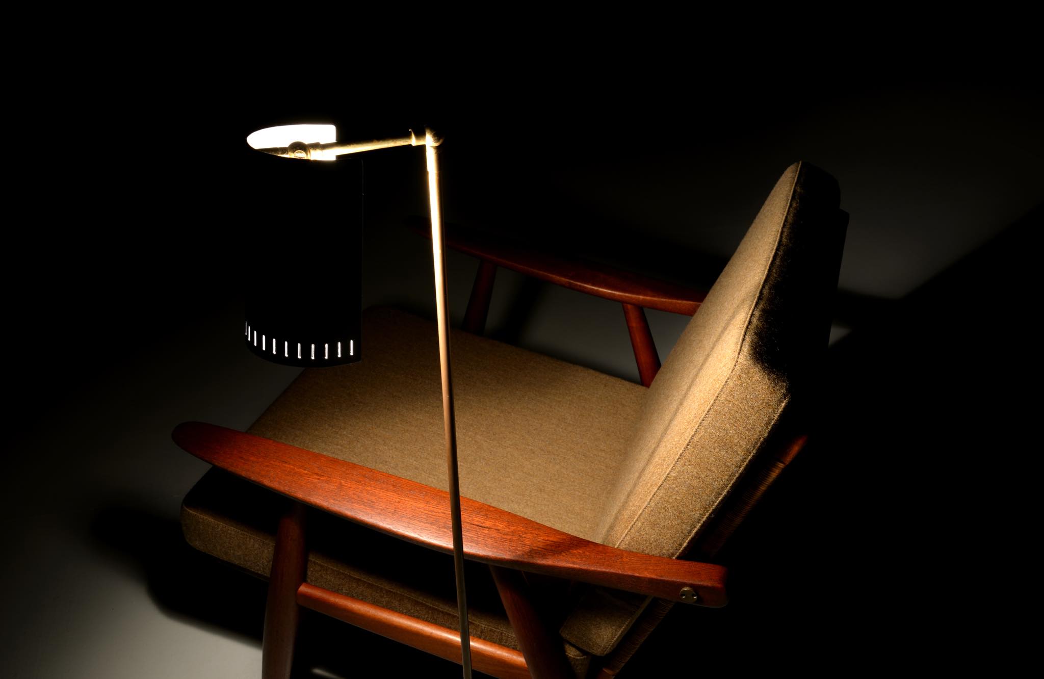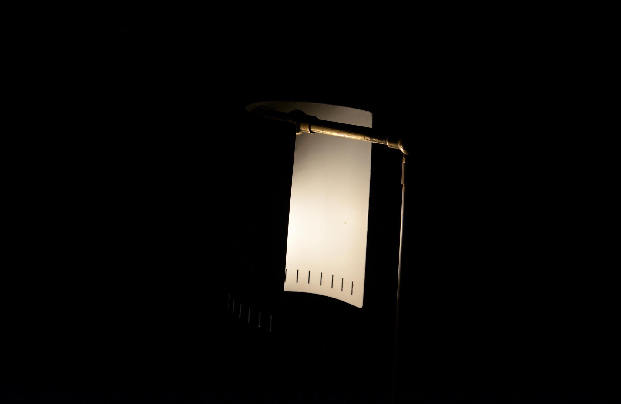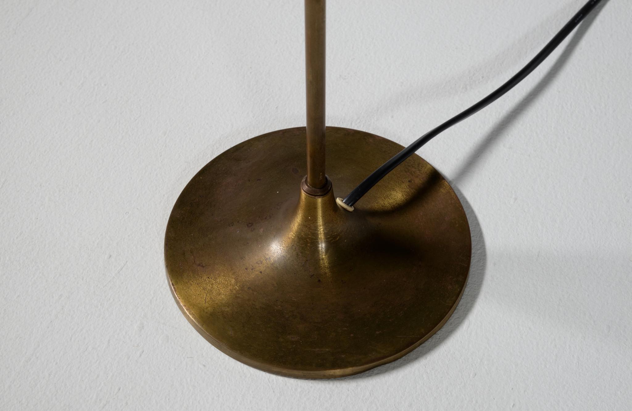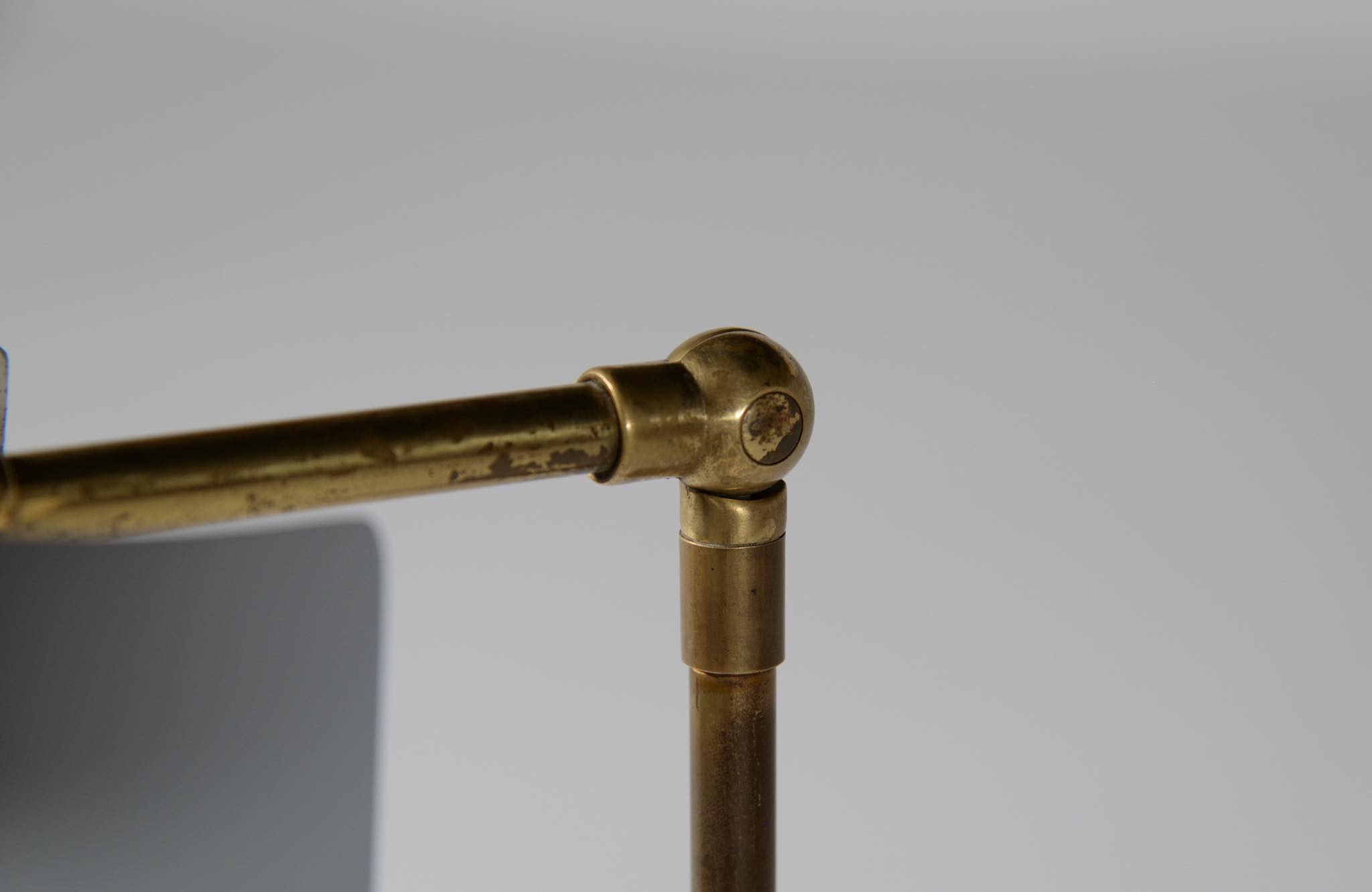 デンマーク製、1950年代頃に作られたリーディングランプです。スチールや真鍮などを用いて作られており、ふたつの関節でシェードの向きを自由に変えることができます。亜鉛アルミで作られた透かしのシェード表面の傷が目立ったため、再塗装して整えましたが、電球側の白い部分はあえてそのままにしております。ベースは真鍮の薄板のため柔らかいようで、若干の歪みや小傷が生じていますが、全体に良い雰囲気です。Lyfaや Føg & Mørupなどの知られたランプ工房で作られたものではないかと思われますが、資料に乏しく詳しいことは判っておりません。戦後のデンマークでは戦時に備えた金属回収令によって職を追われた銀職人達が、戦後のモダンデザインの時代になり鉄や真鍮等を用いて個々の工房でランプを作り始めたと云われています。
