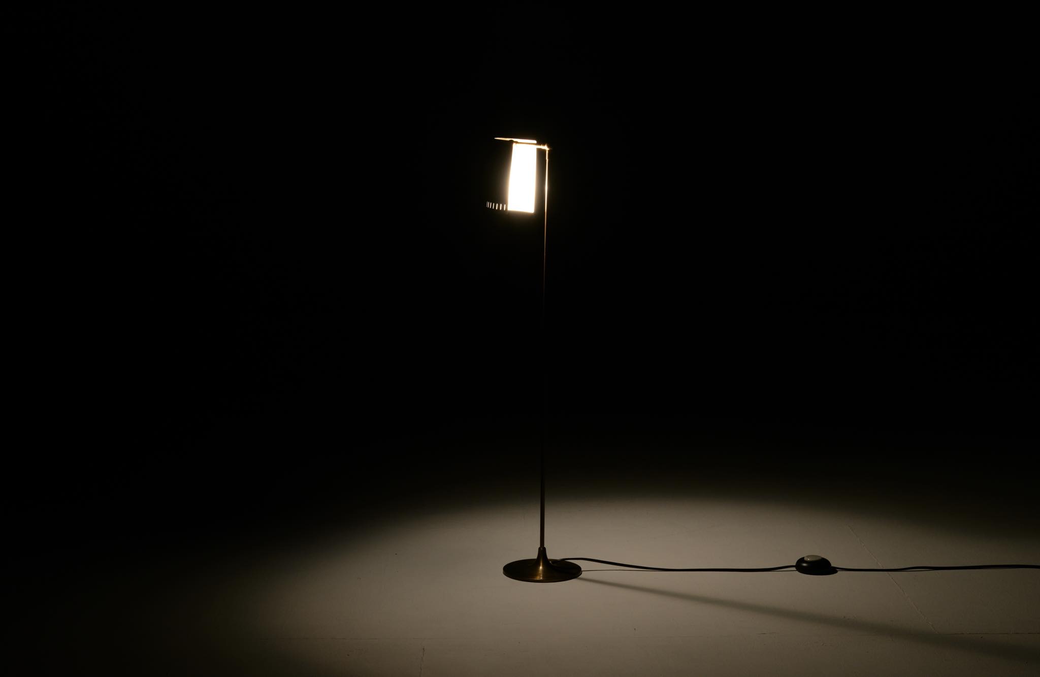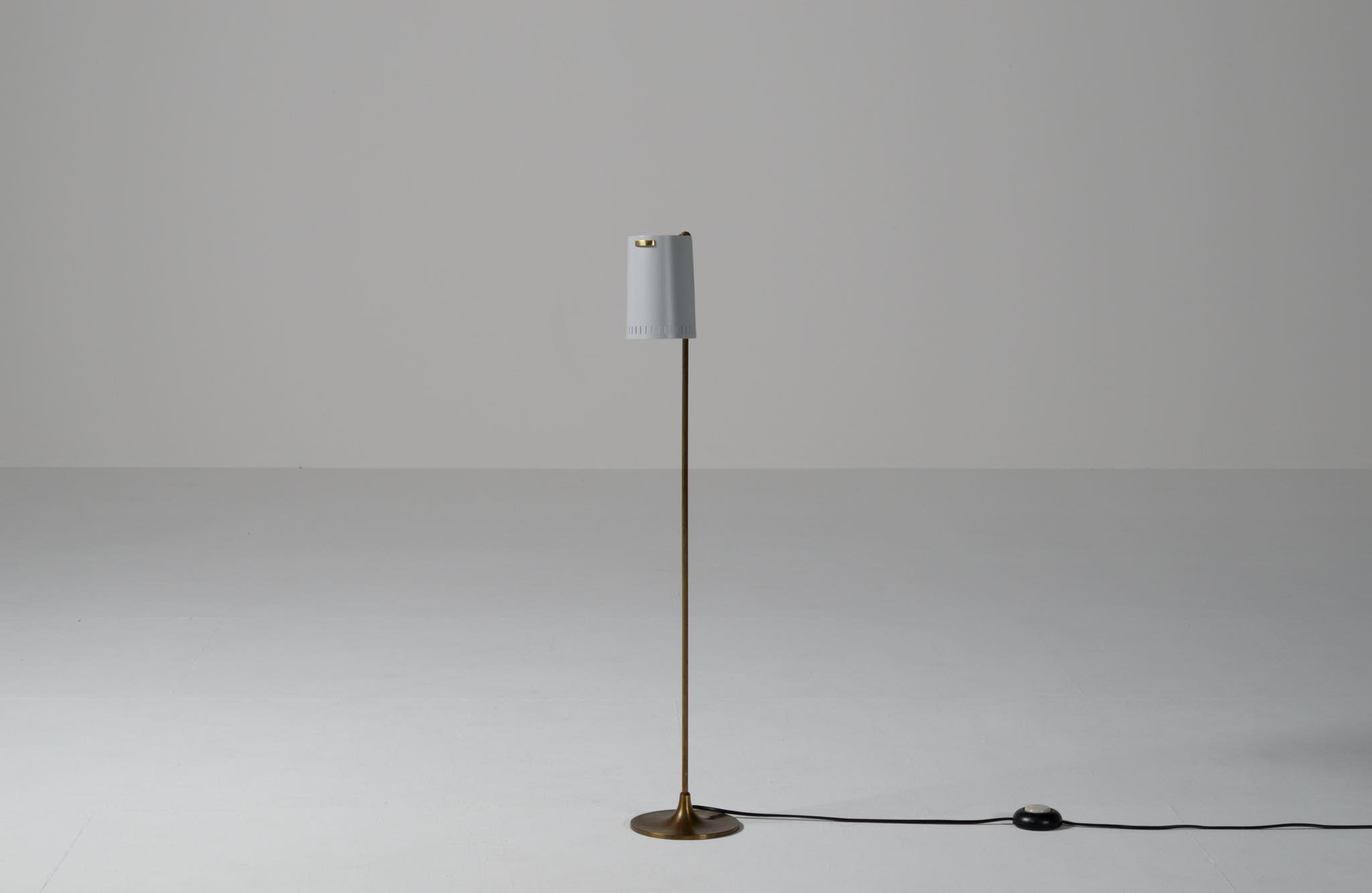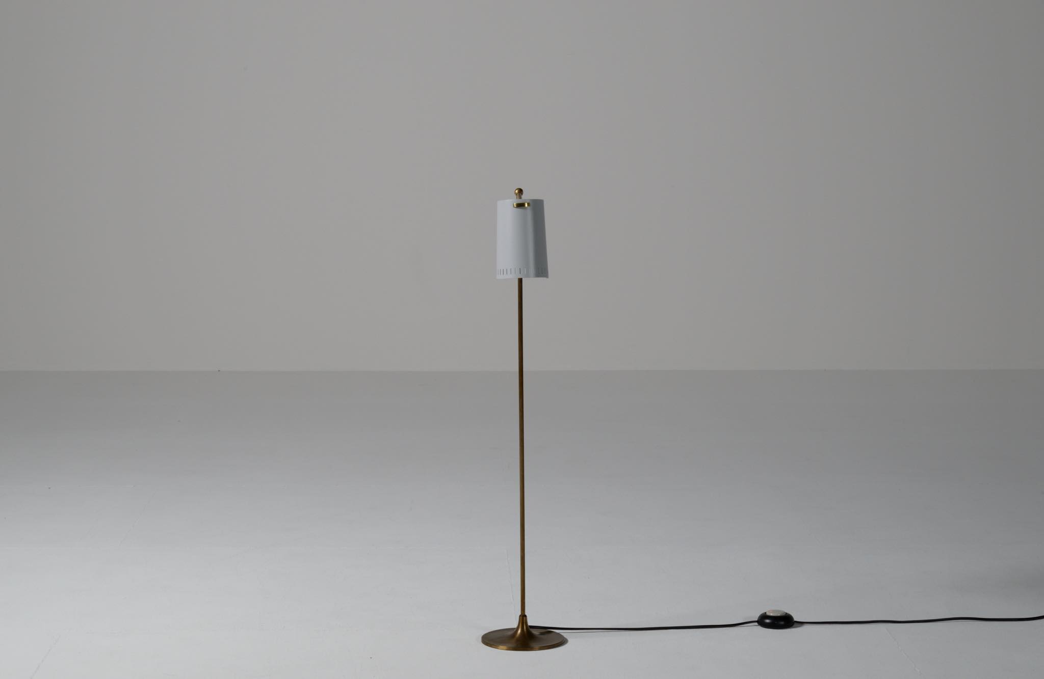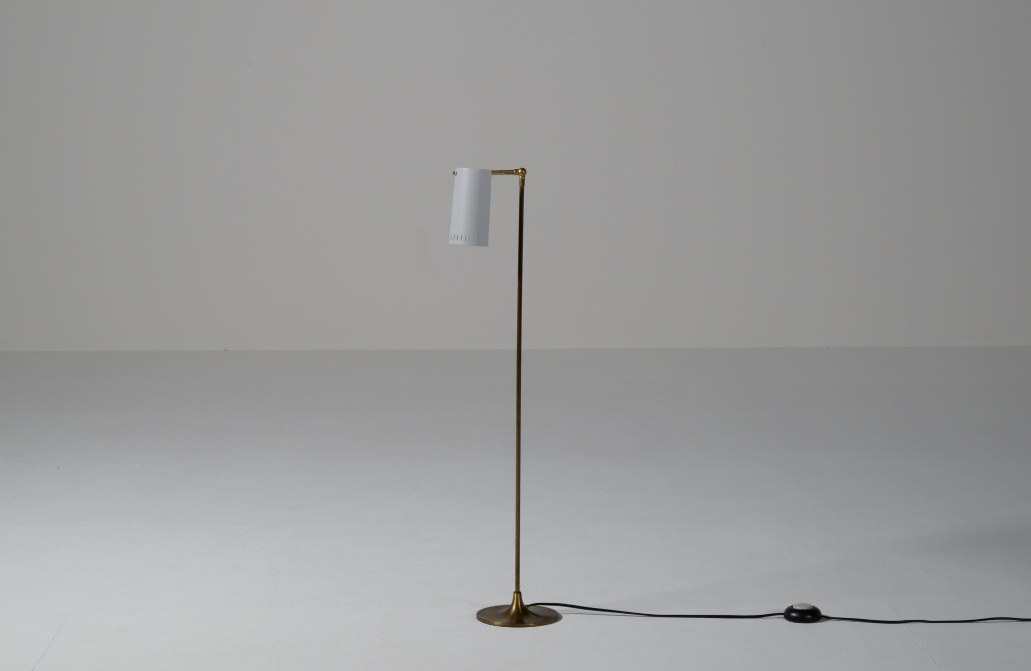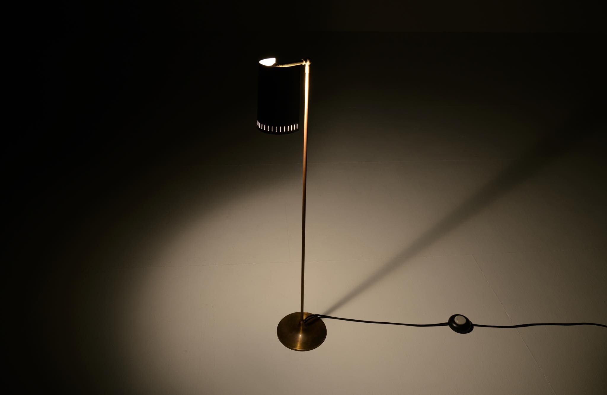 デンマーク製、1950年代頃に作られたリーディングランプです。スチールや真鍮などを用いて作られており、ふたつの関節でシェードの向きを自由に変えることができます。亜鉛アルミで作られた透かしのシェード表面の傷が目立ったため、再塗装して整えましたが、電球側の白い部分はあえてそのままにしております。ベースは真鍮の薄板のため柔らかいようで、若干の歪みや小傷が生じていますが、全体に良い雰囲気です。Lyfaや Føg & Mørupなどの知られたランプ工房で作られたものではないかと思われますが、資料に乏しく詳しいことは判っておりません。戦後のデンマークでは戦時に備えた金属回収令によって職を追われた銀職人達が、戦後のモダンデザインの時代になり鉄や真鍮等を用いて個々の工房でランプを作り始めたと云われています。