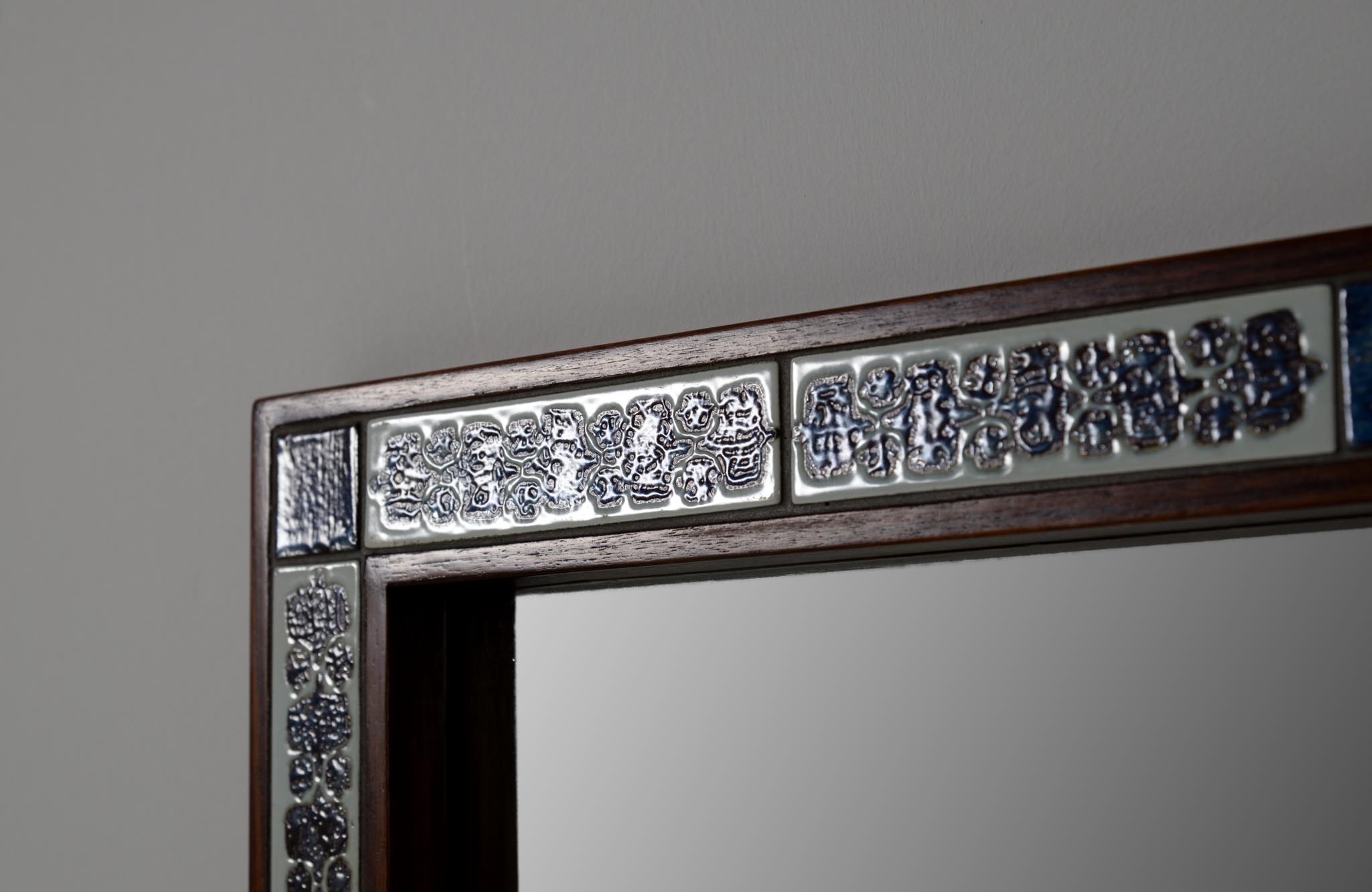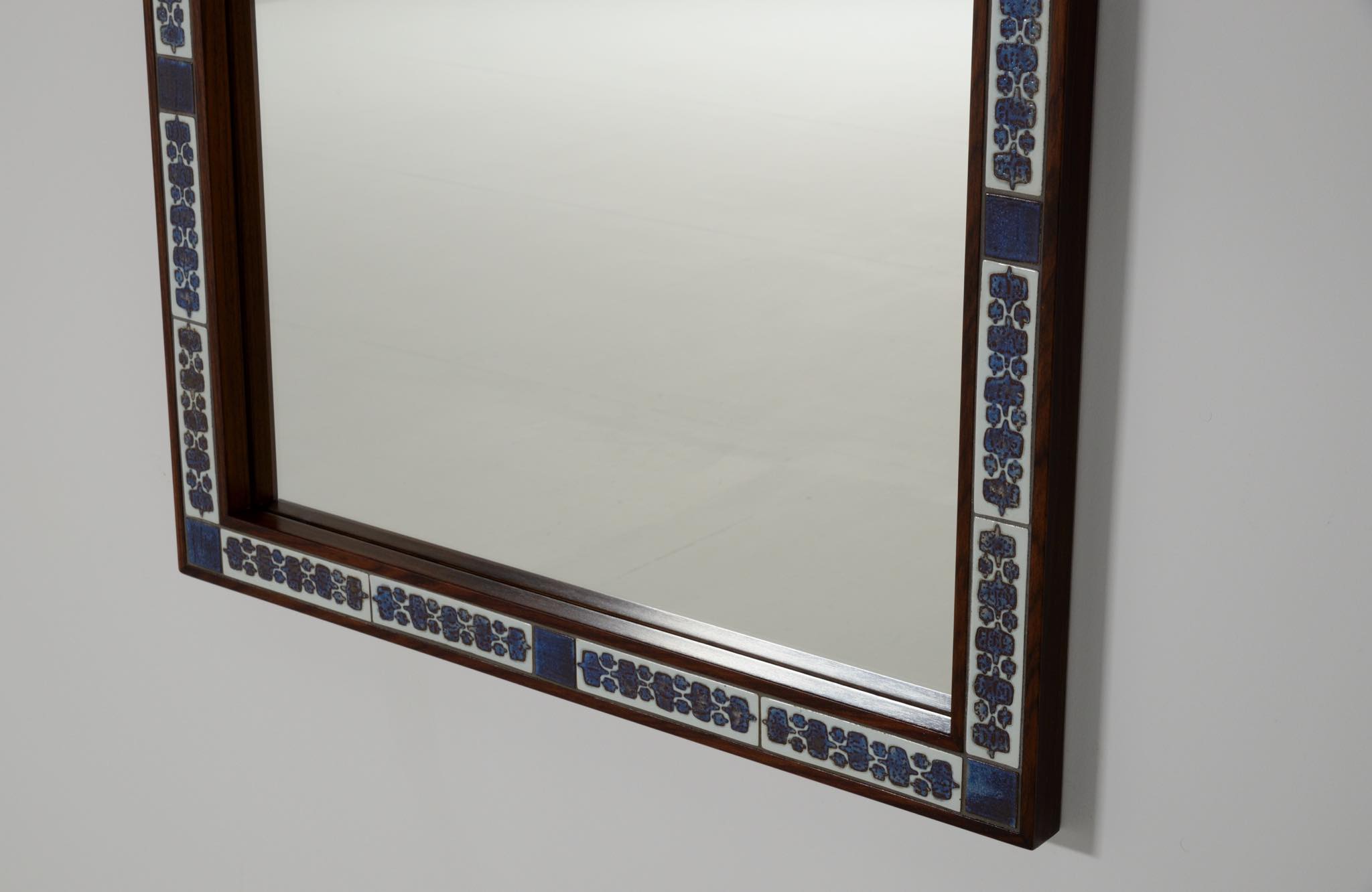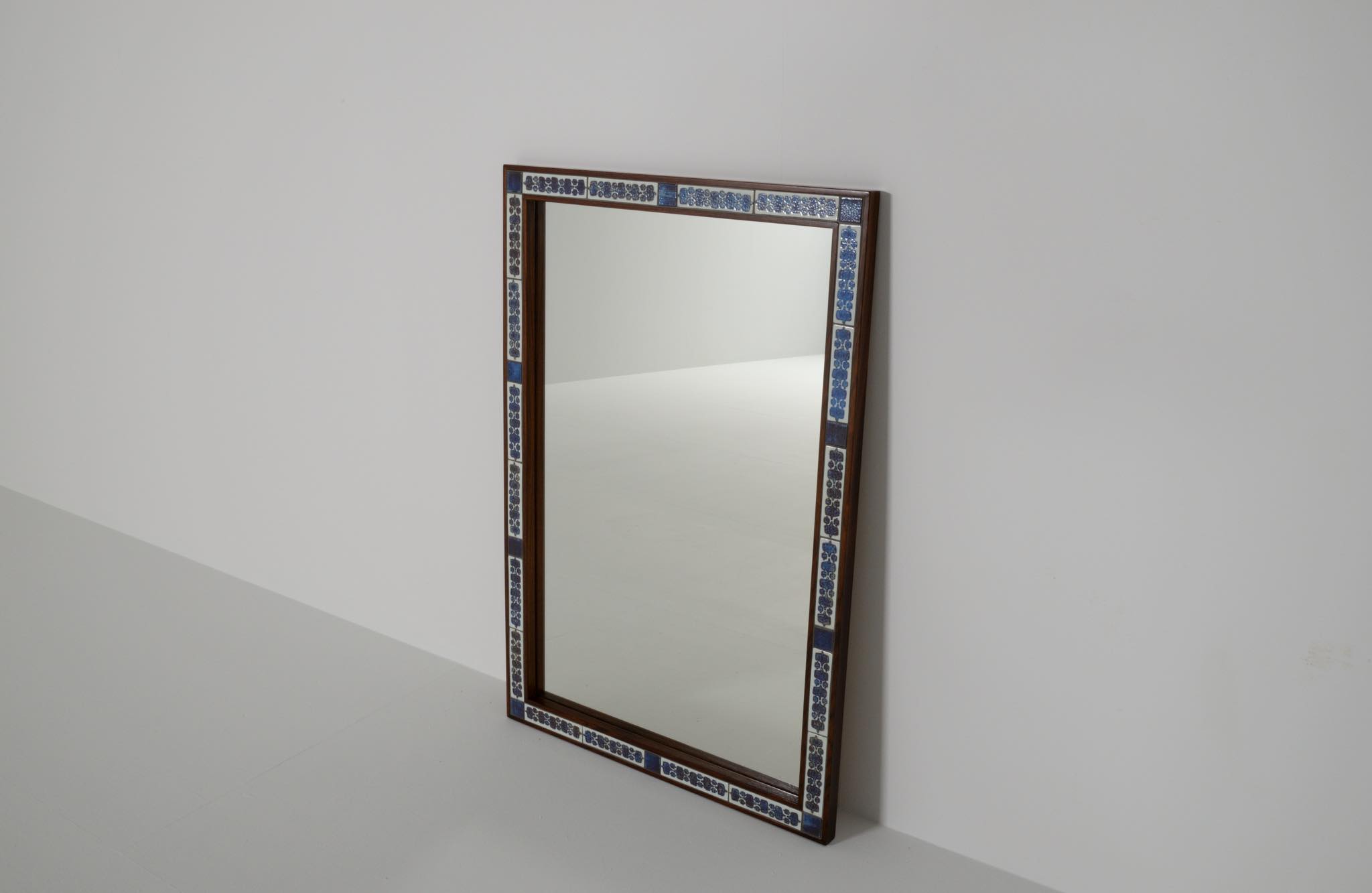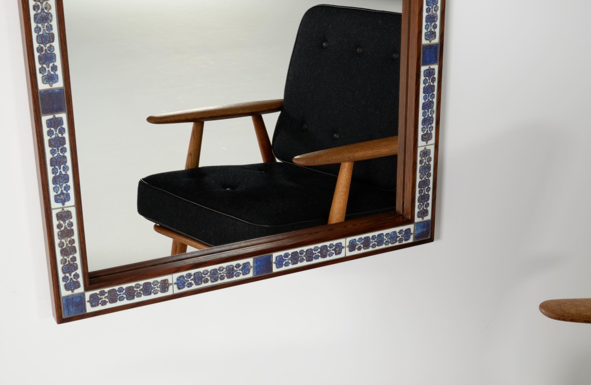 デンマークの家具工房、Haslev Møbelsnedkeri/ハスレヴ社製、ロイヤルコペンハーゲンのタイルを象嵌した壁掛け用ミラーです。フレームはローズウッド材で作られており、タイルとのコントラストが際立った作品です。総重量が15キロほどあり、一般的な住宅の壁素材の石膏ボードへの壁掛けは危険と思われるので、施工業者の方へご相談されると良いでしょう。鏡は新しいものに入れ替えております。
