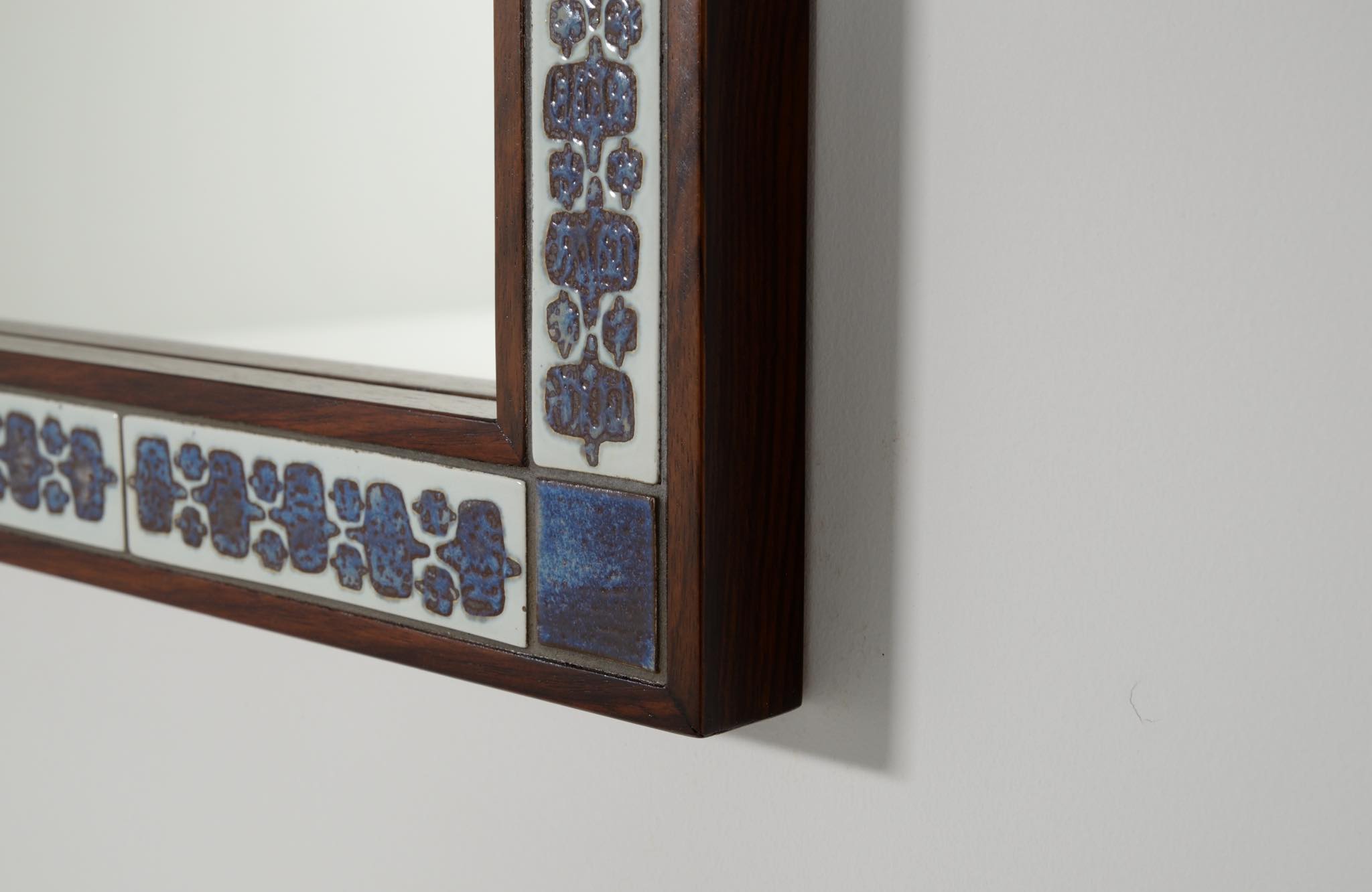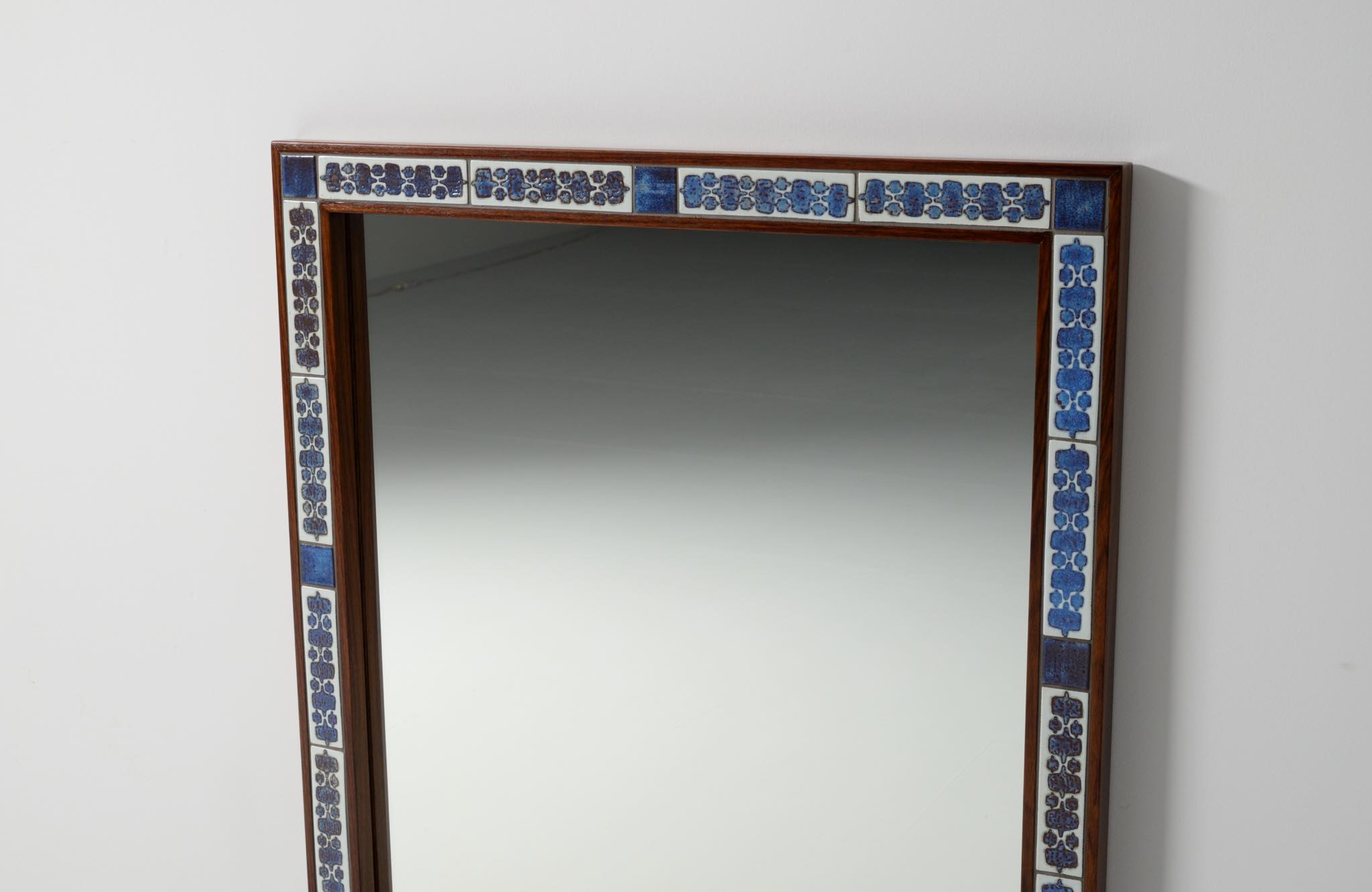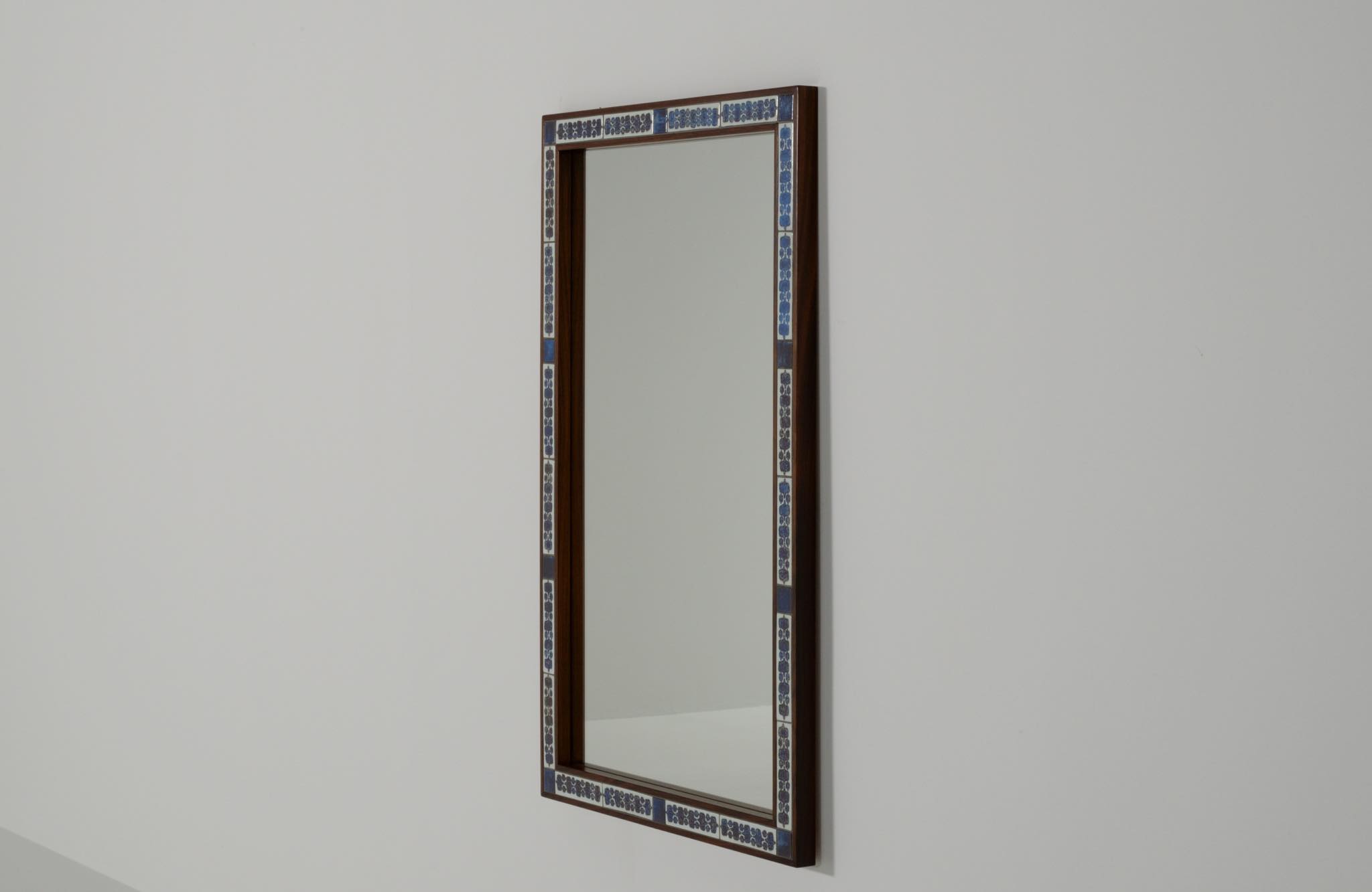 デンマークの家具工房、Haslev Møbelsnedkeri/ハスレヴ社製、ロイヤルコペンハーゲンのタイルを象嵌した壁掛け用ミラーです。フレームはローズウッド材で作られており、タイルとのコントラストが際立った作品です。総重量が15キロほどあり、一般的な住宅の壁素材の石膏ボードへの壁掛けは危険と思われるので、施工業者の方へご相談されると良いでしょう。鏡は新しいものに入れ替えております。