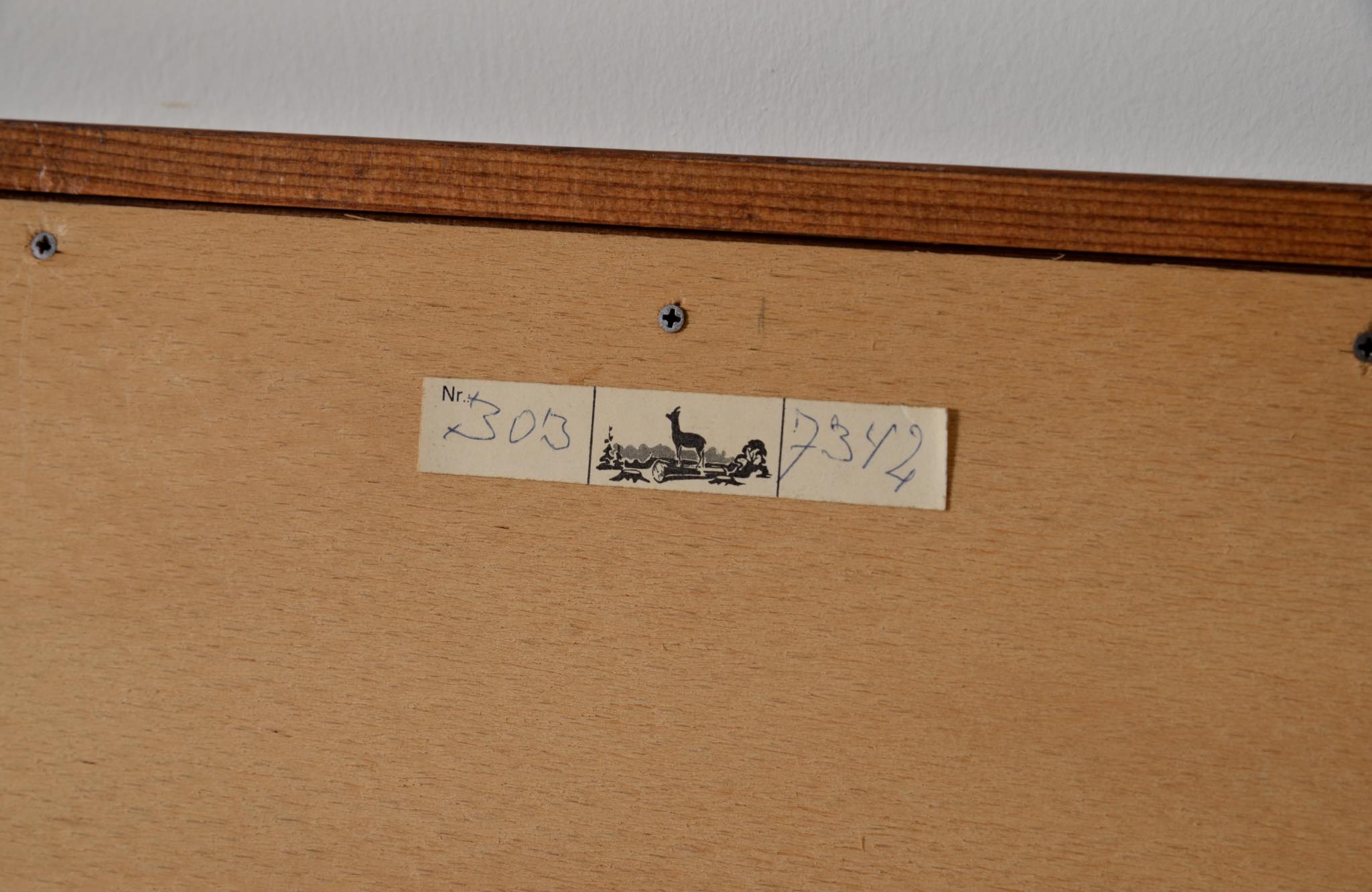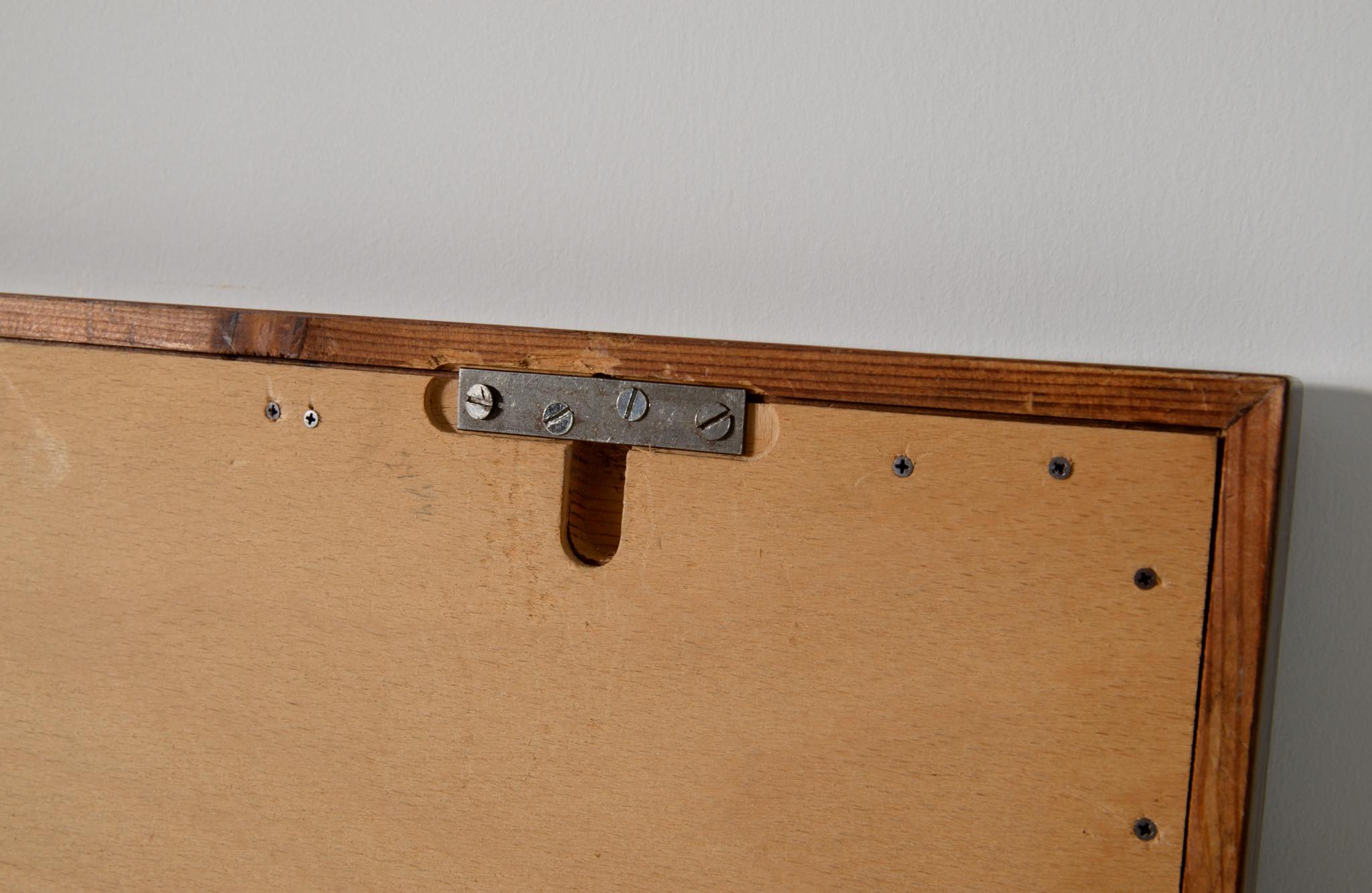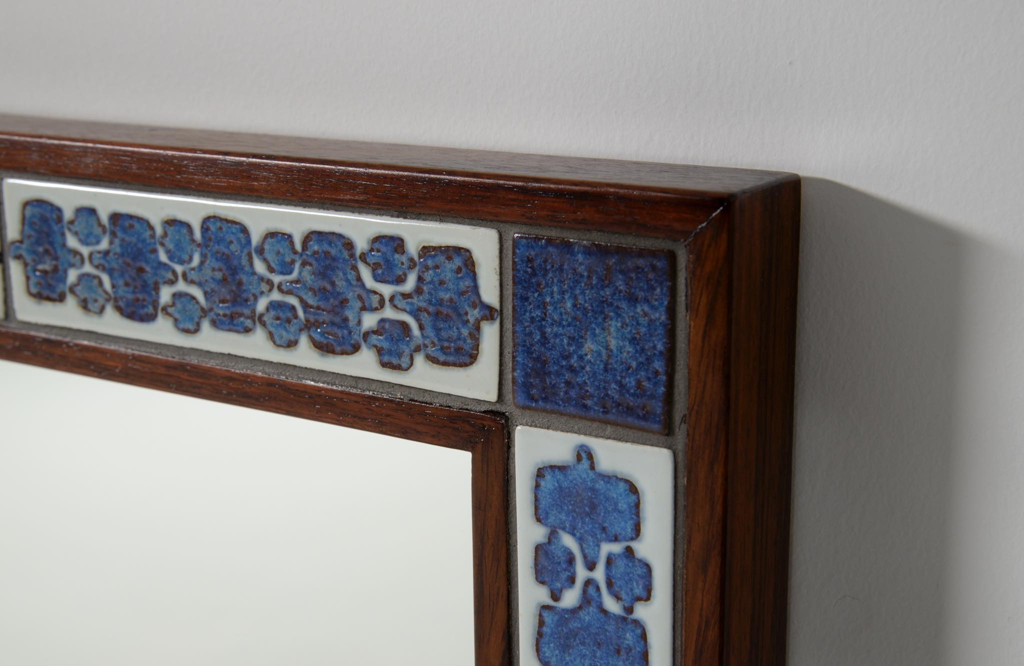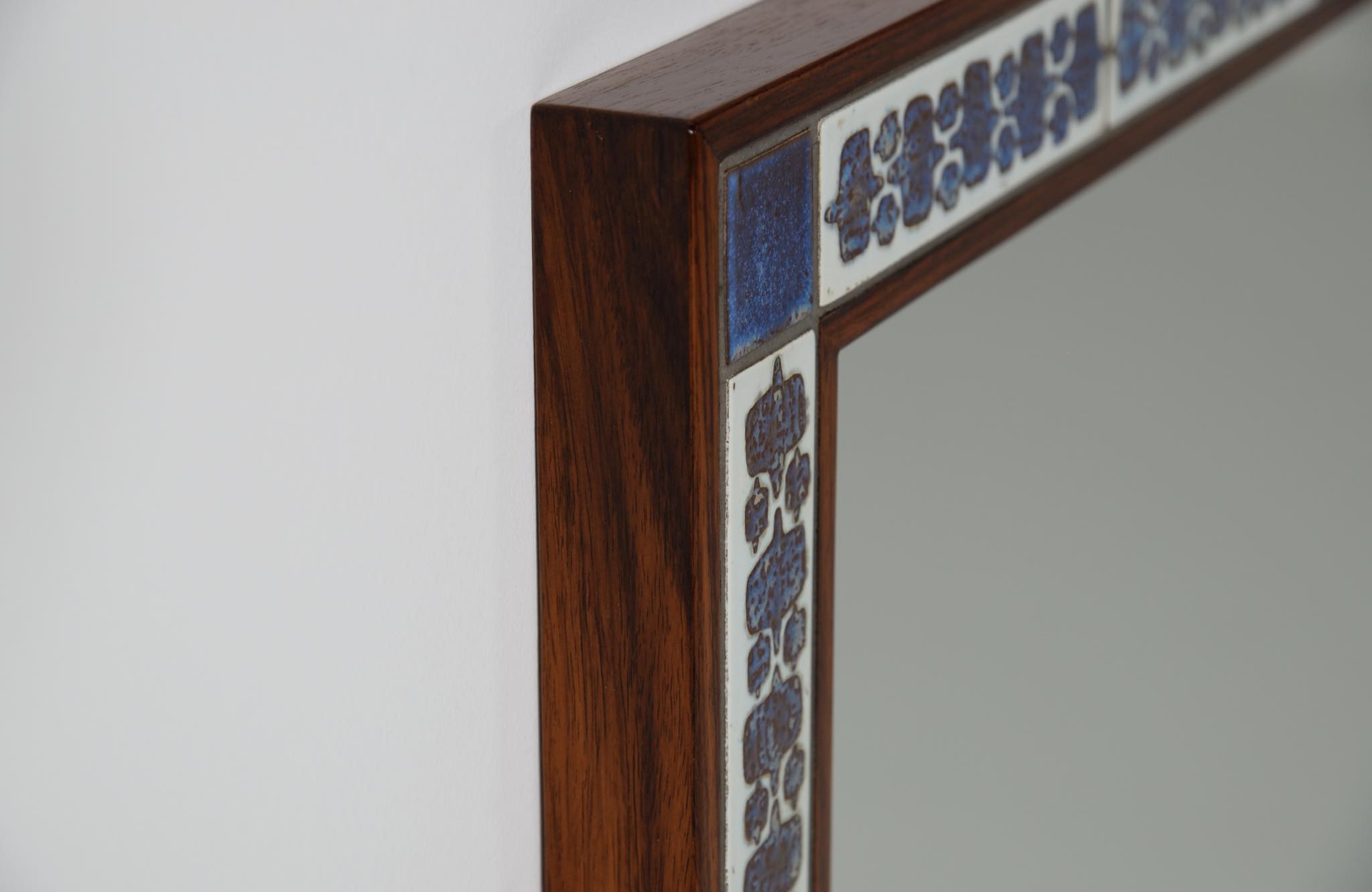 デンマークの家具工房、Haslev Møbelsnedkeri/ハスレヴ社製、ロイヤルコペンハーゲンのタイルを象嵌した壁掛け用ミラーです。フレームはローズウッド材で作られており、タイルとのコントラストが際立った作品です。総重量が15キロほどあり、一般的な住宅の壁素材の石膏ボードへの壁掛けは危険と思われるので、施工業者の方へご相談されると良いでしょう。鏡は新しいものに入れ替えております。