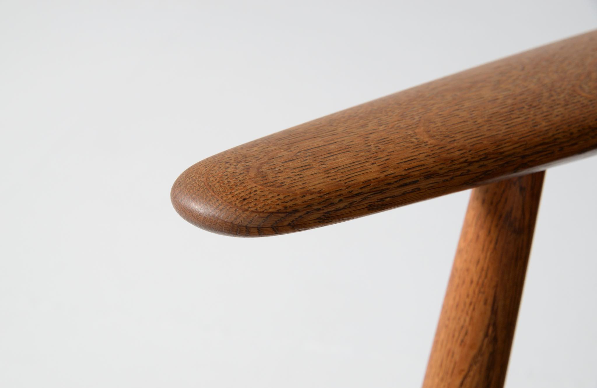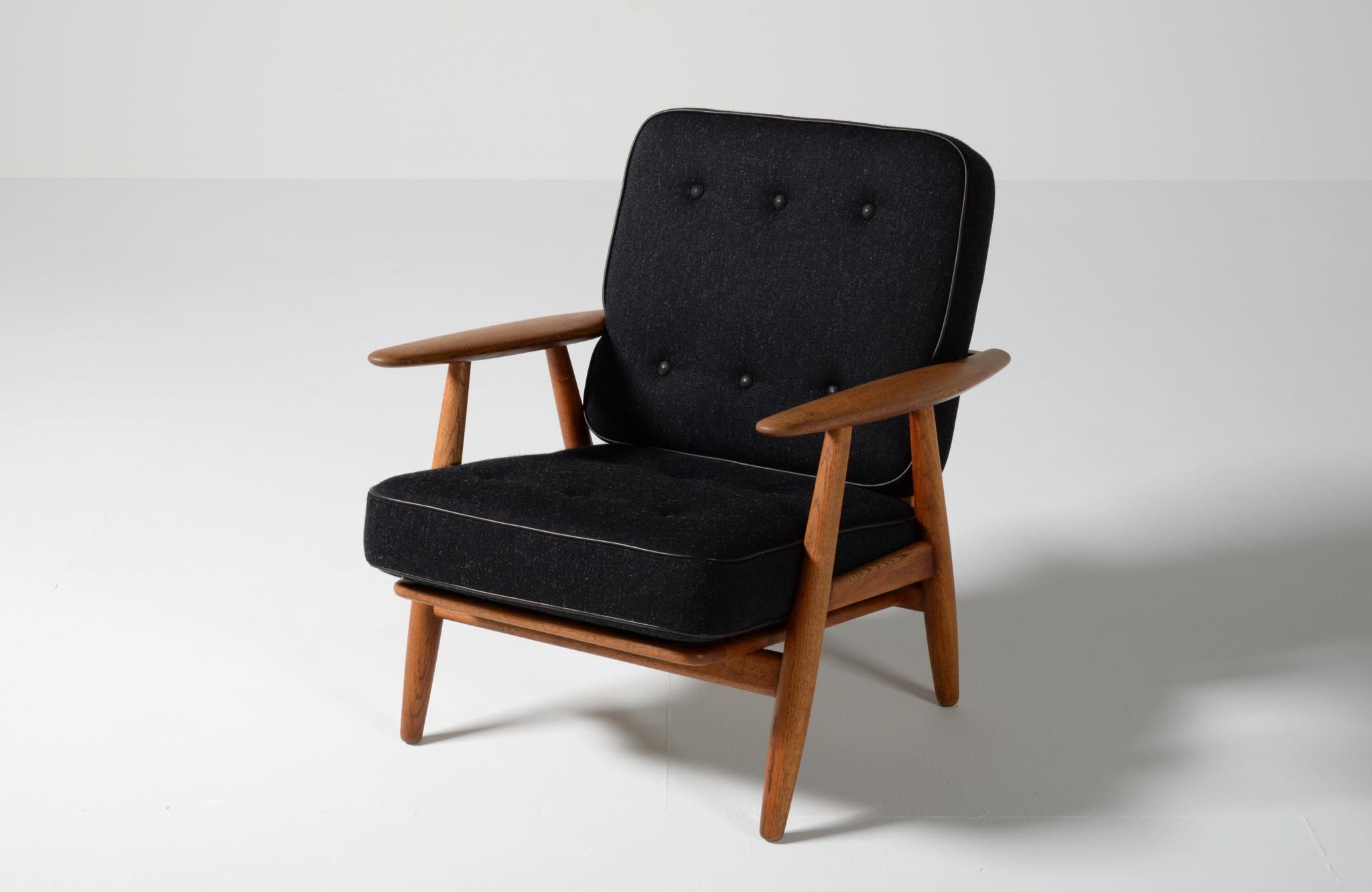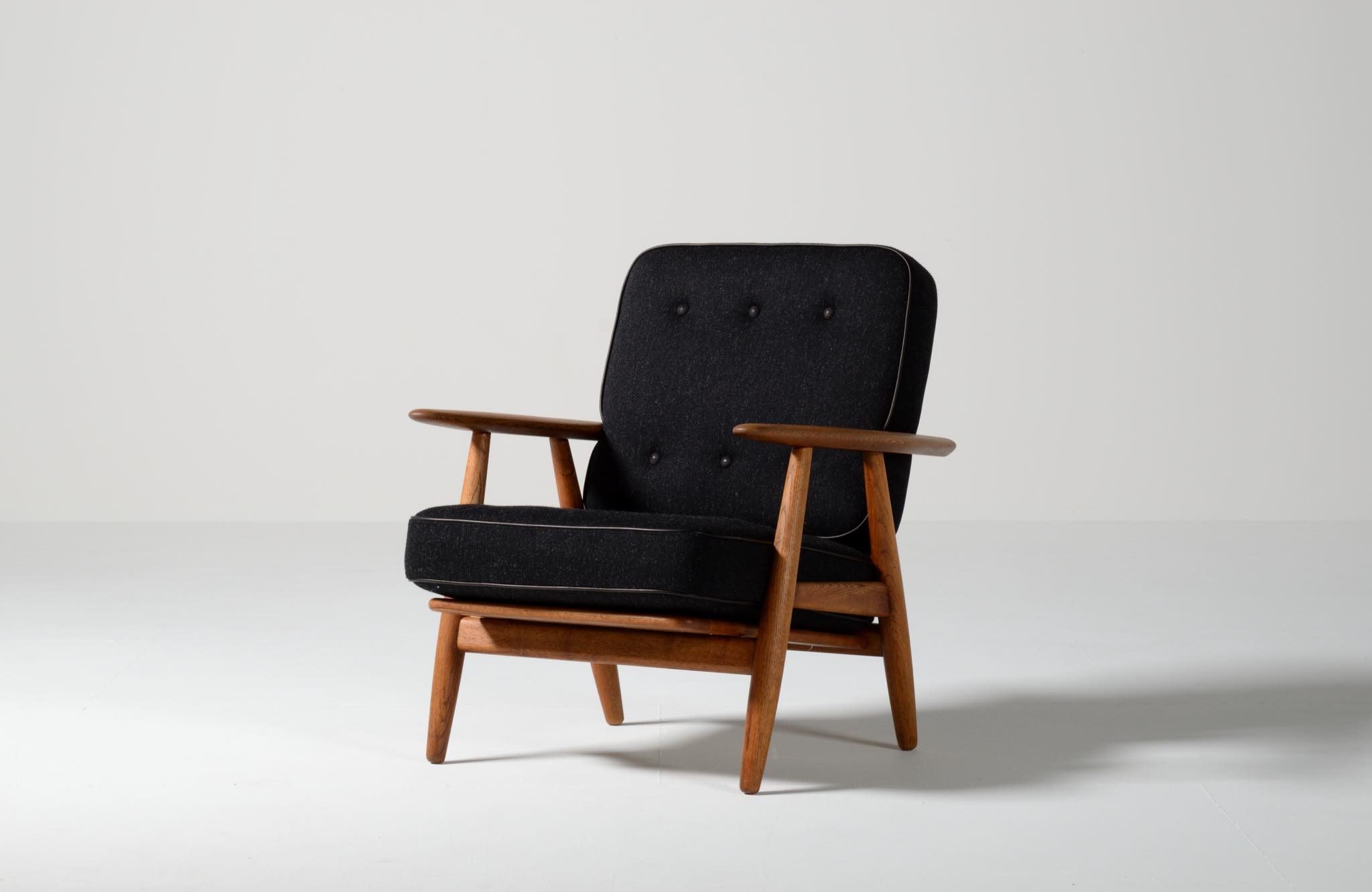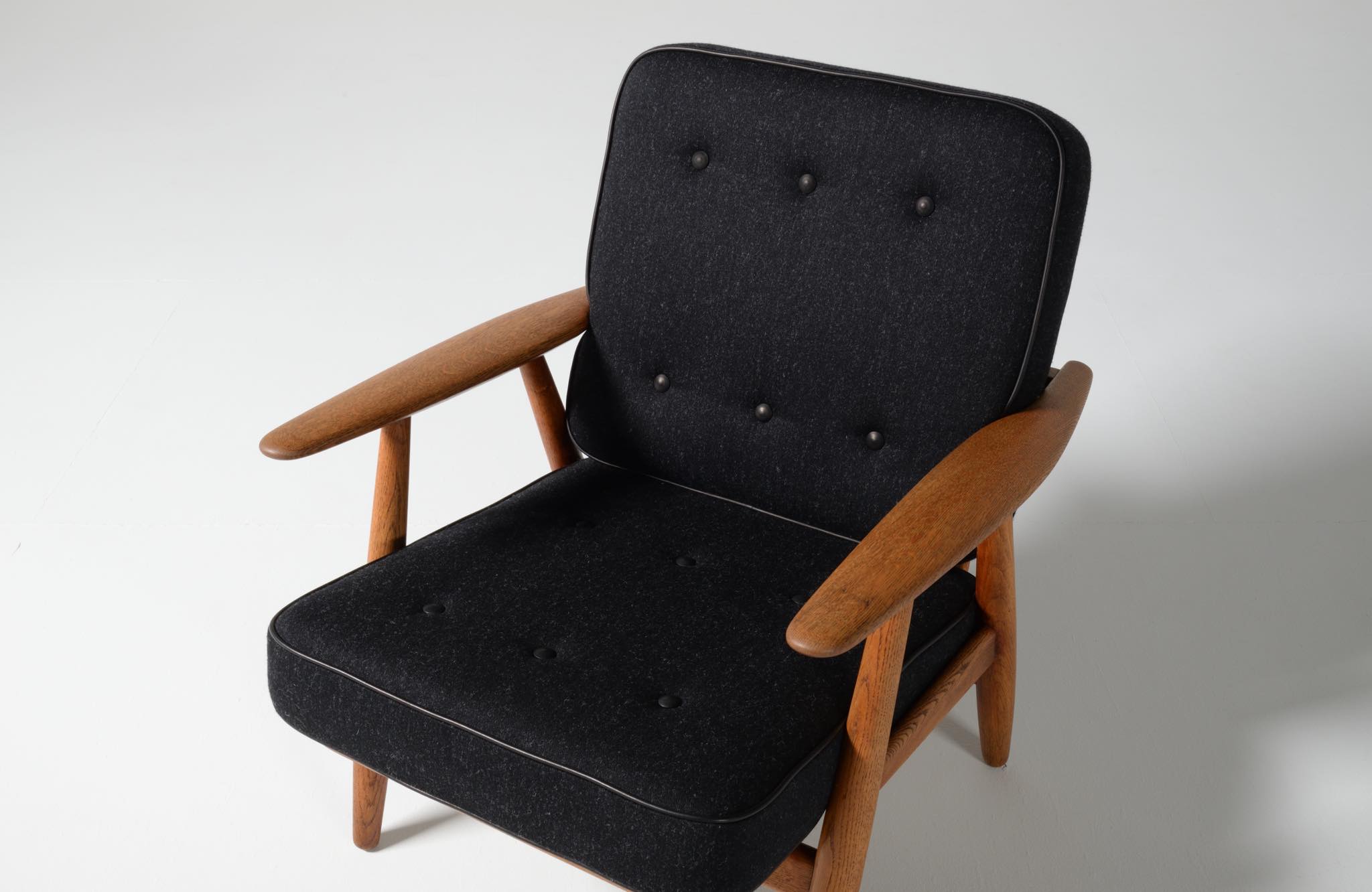 デンマークを代表する家具デザイナーのHans J. Wegner/ハンス・ウェグナーによるGE240イージーチェア、アームの形状が葉巻の形に似ていることから通称”シガー”と呼ばれているモデルです。オーク材のタイプで、1950年代頃に作られたものでしょう。ファブリックは新たに張り替え、パイピングとボタンは皮革を用いています。座面の下の底張りも新たに交換しました。座って左アームの目立つ部分に打跡が見られ、かつて何か硬いものを落として凹みができてしまったようです。それ以外のコンディションは良好です。