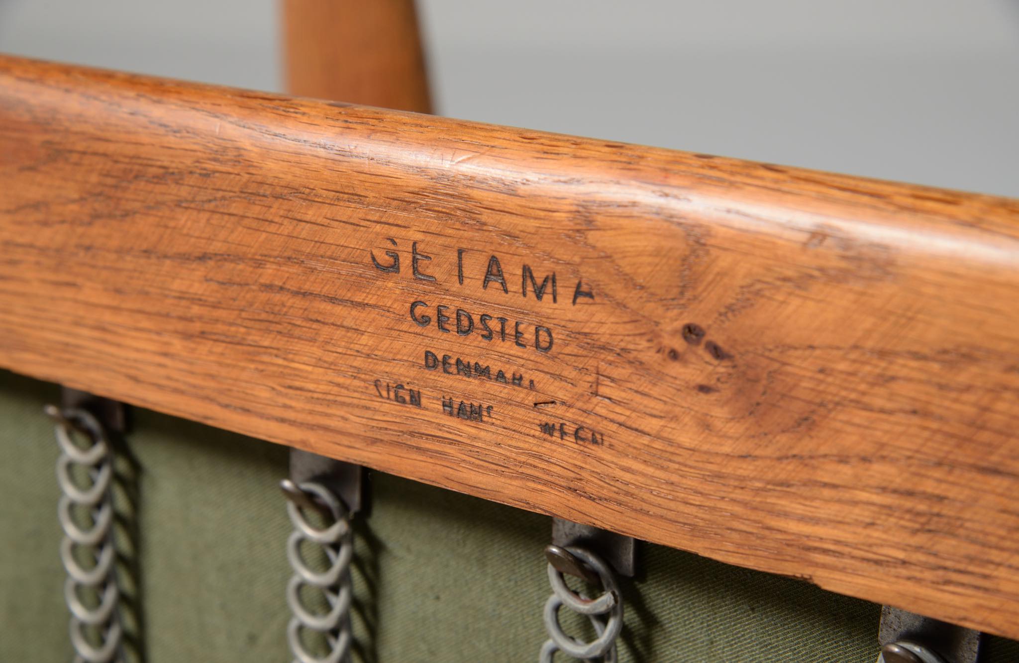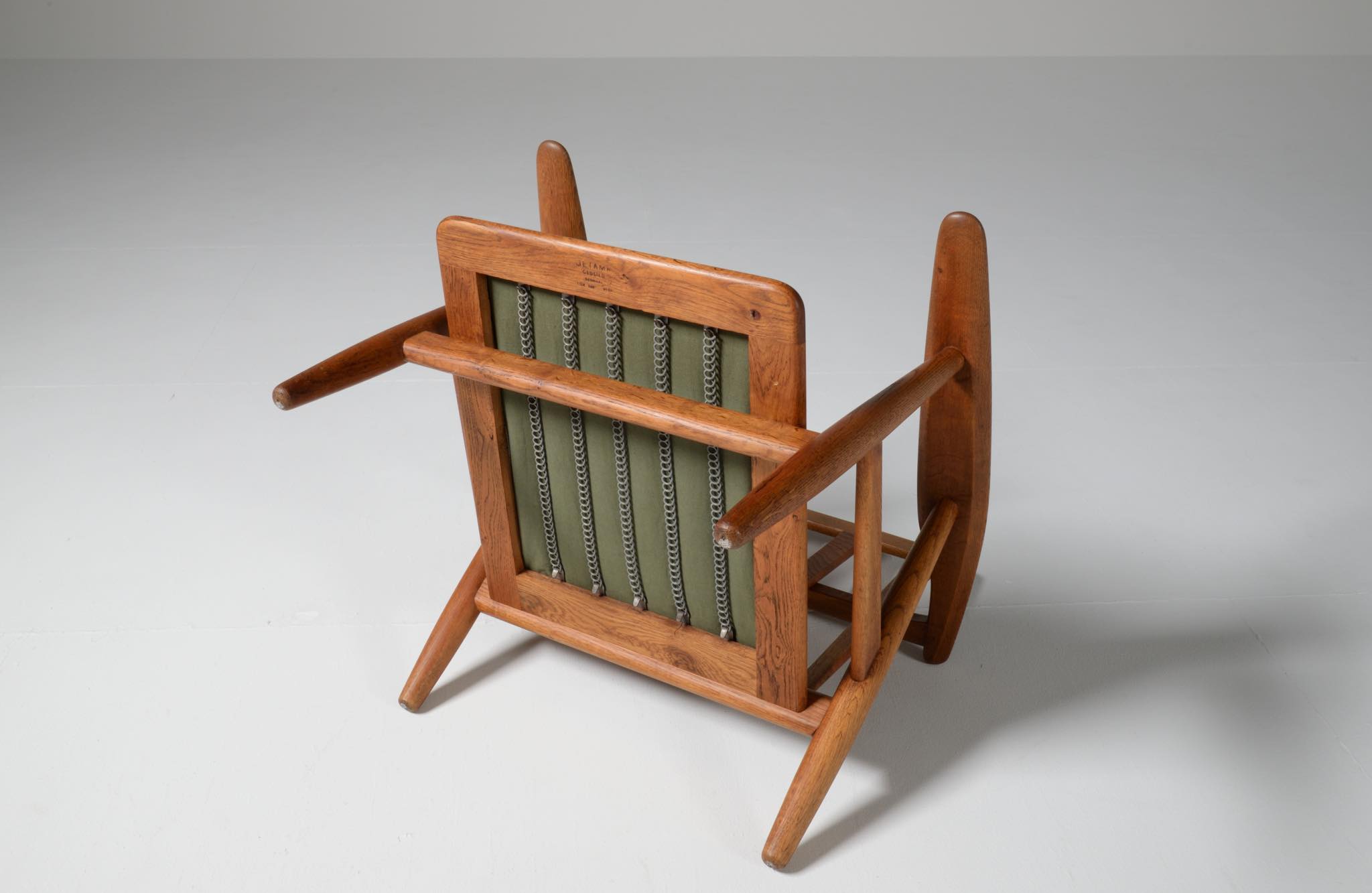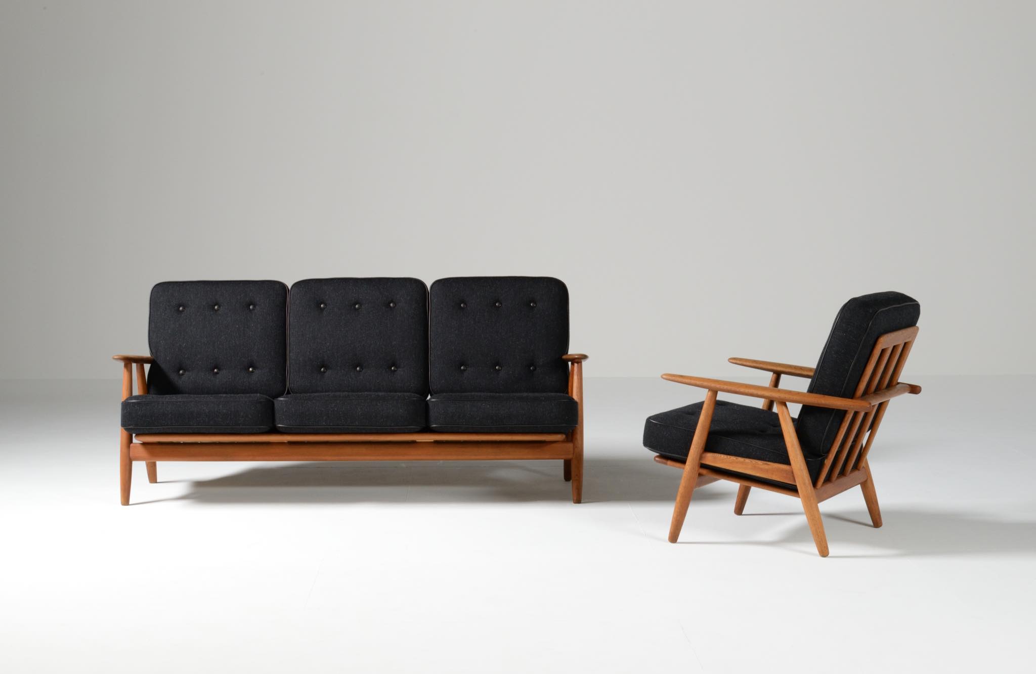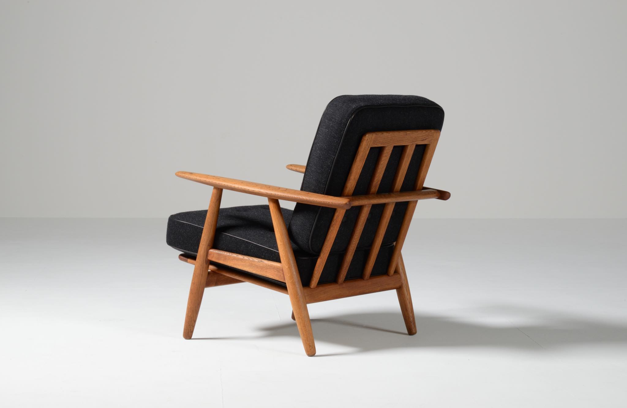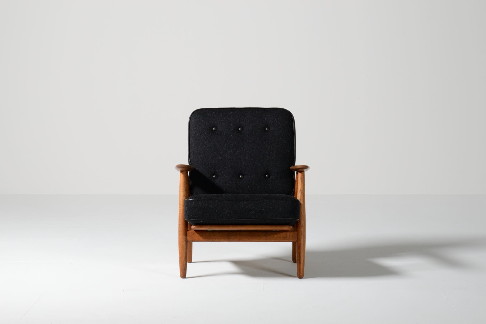 デンマークを代表する家具デザイナーのHans J. Wegner/ハンス・ウェグナーによるGE240イージーチェア、アームの形状が葉巻の形に似ていることから通称”シガー”と呼ばれているモデルです。オーク材のタイプで、1950年代頃に作られたものでしょう。ファブリックは新たに張り替え、パイピングとボタンは皮革を用いています。座面の下の底張りも新たに交換しました。座って左アームの目立つ部分に打跡が見られ、かつて何か硬いものを落として凹みができてしまったようです。それ以外のコンディションは良好です。