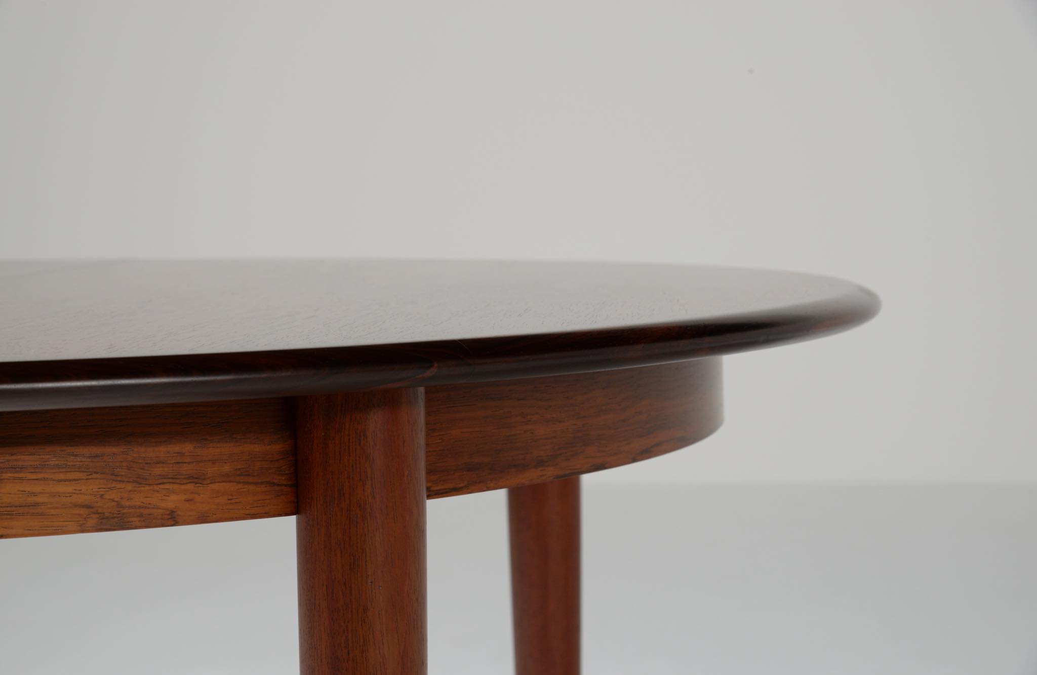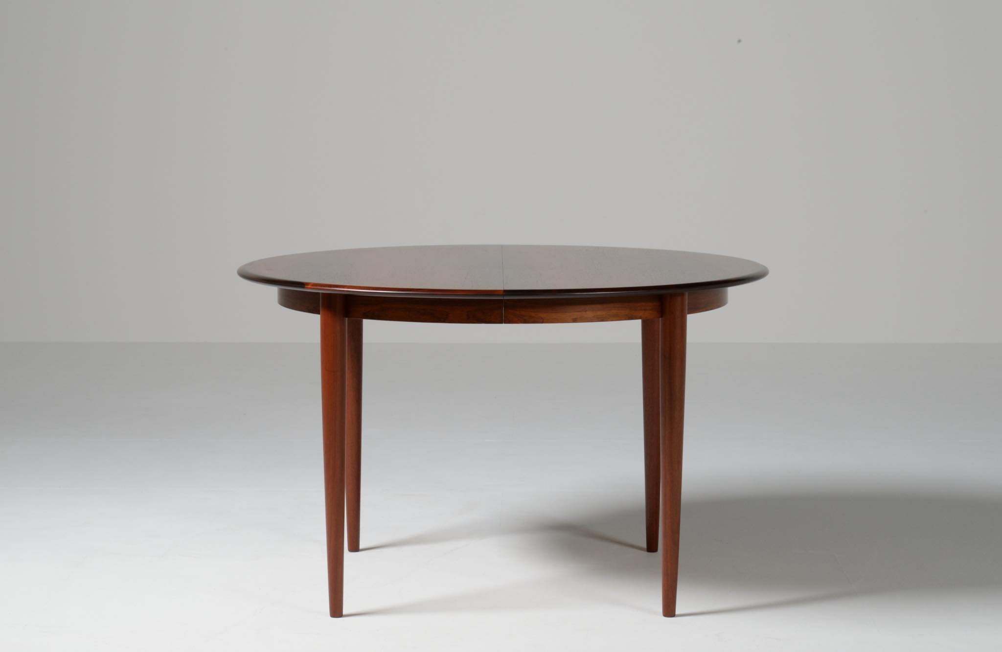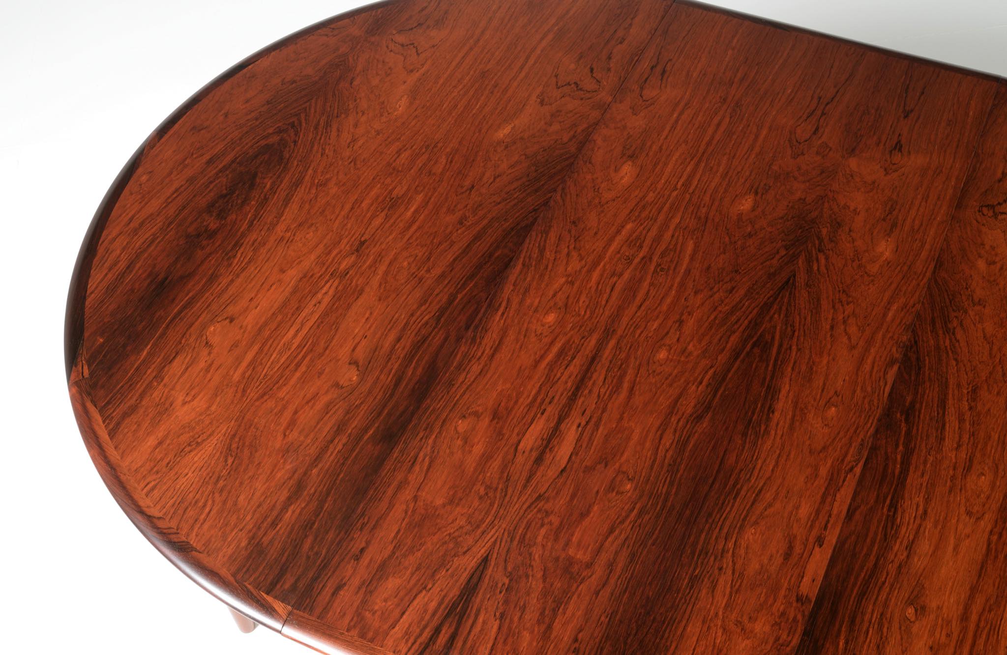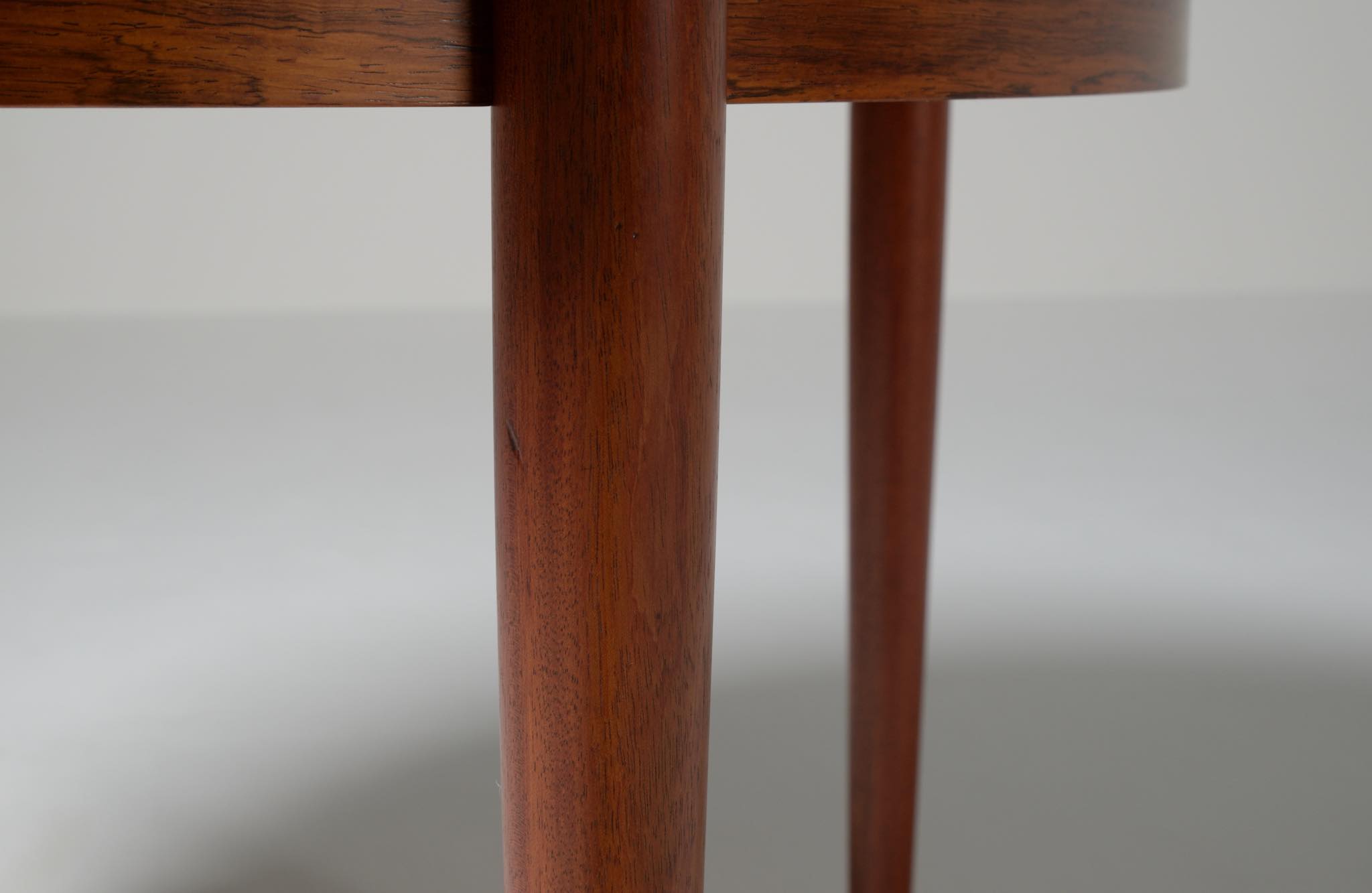デンマークの家具工房、Skovmand & Andersen/スコウマン&アナセンによって作られたダイニングテーブルです。1950〜60年代頃に作られたものでしょう。天板はブラジル原産と思しきローズウッドが木取りされており、肌理細かく穏やかな木目文様に見応えがあります。エクステンションリーフが一枚備わり天板面積の拡張が可能です。表面の塗膜に劣化が見られたため再塗装を施しました。コンディションは良好です。