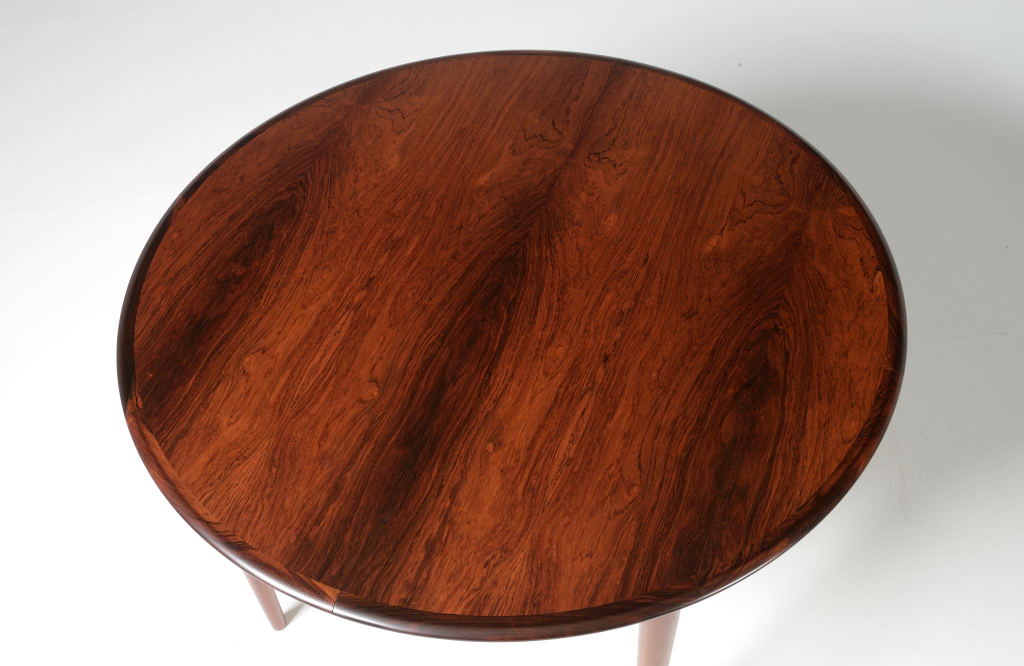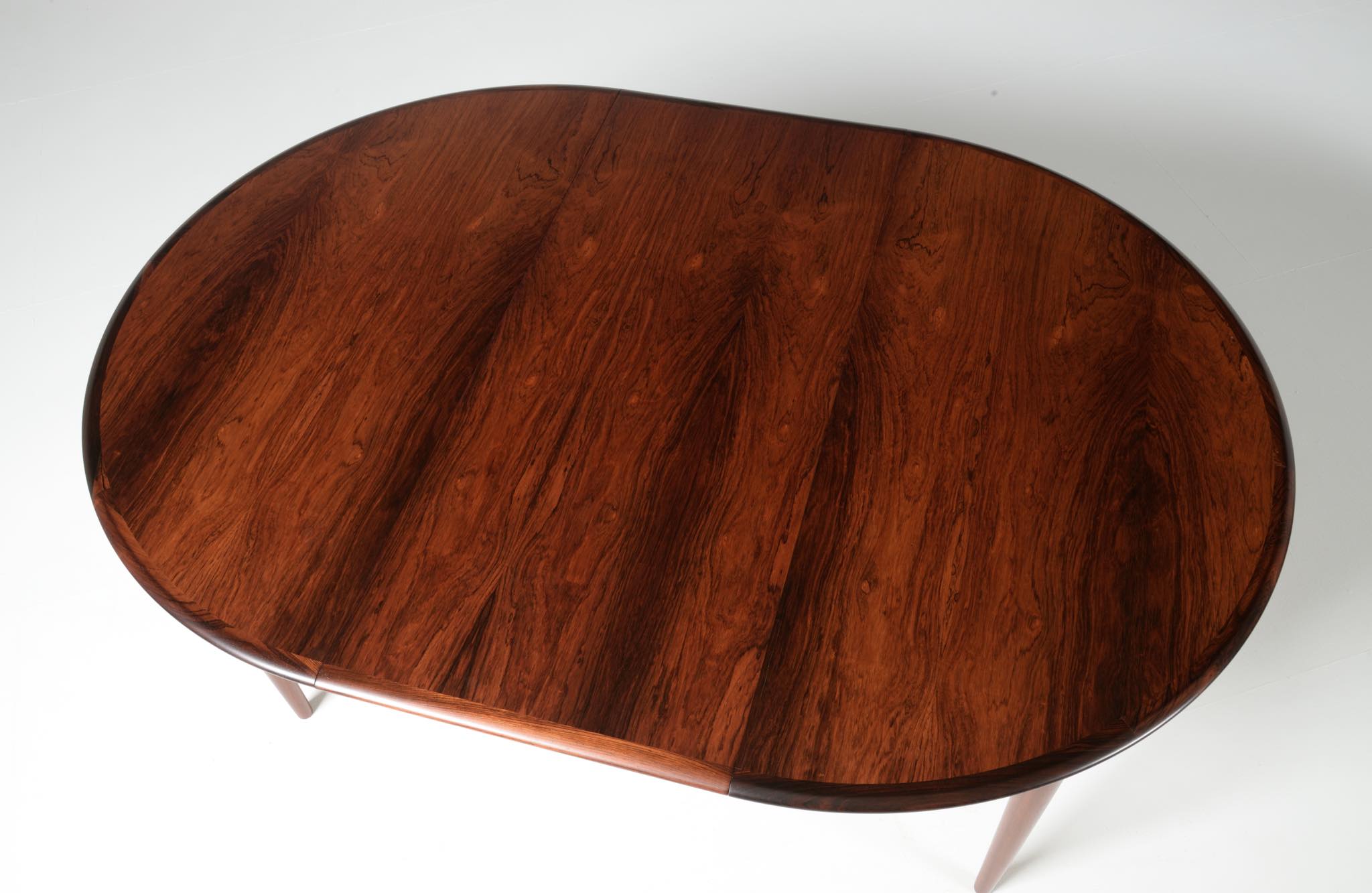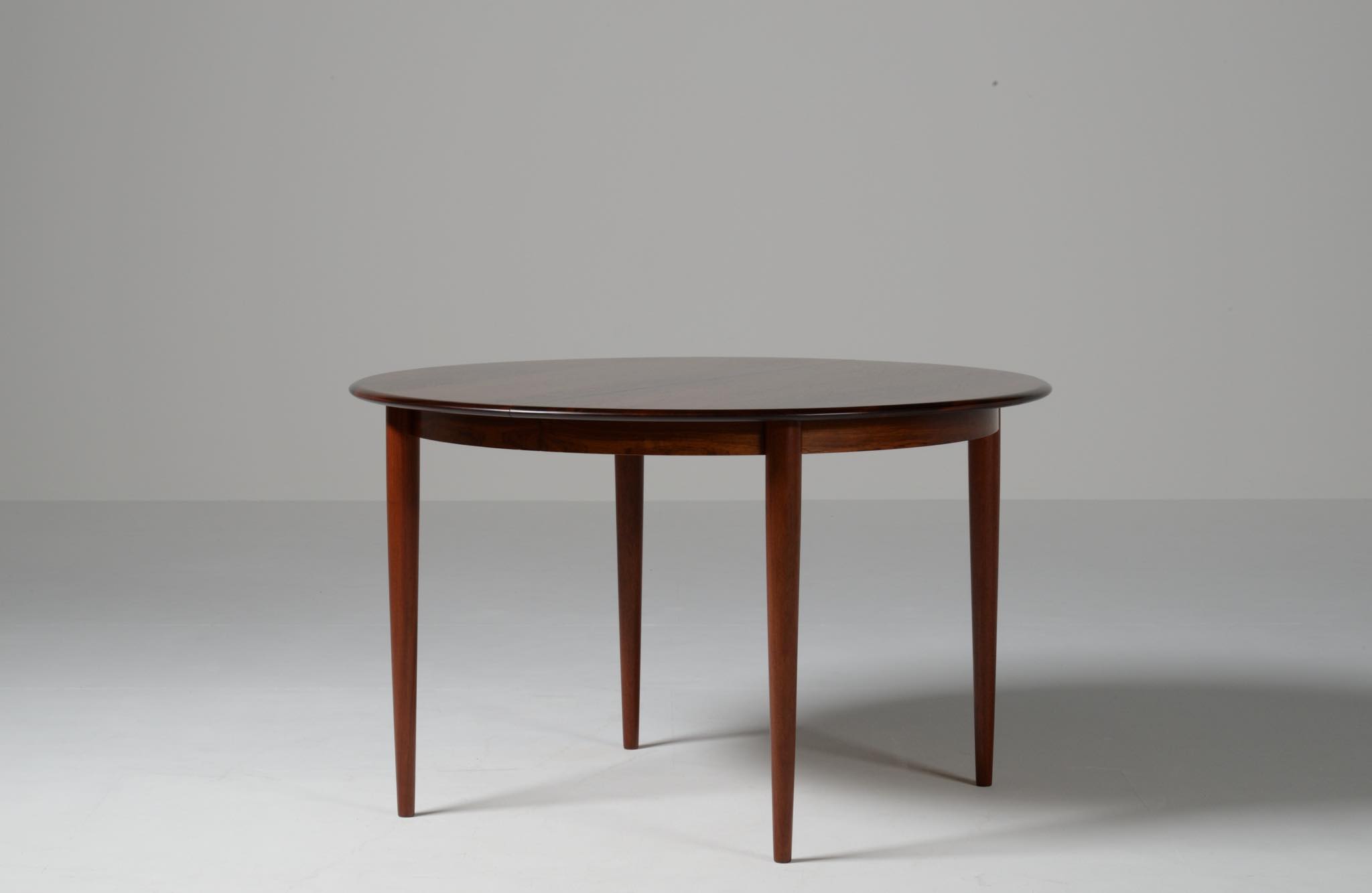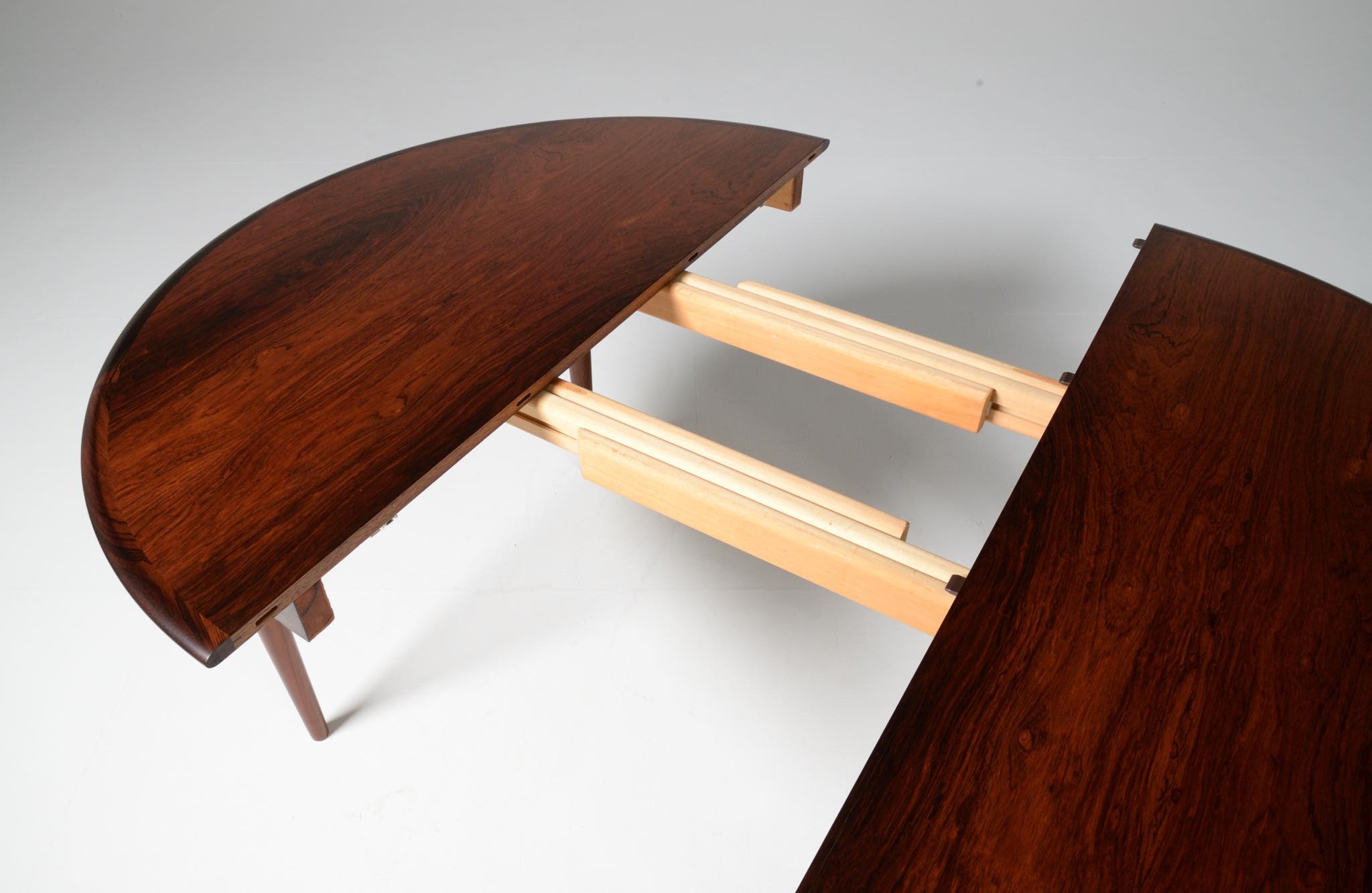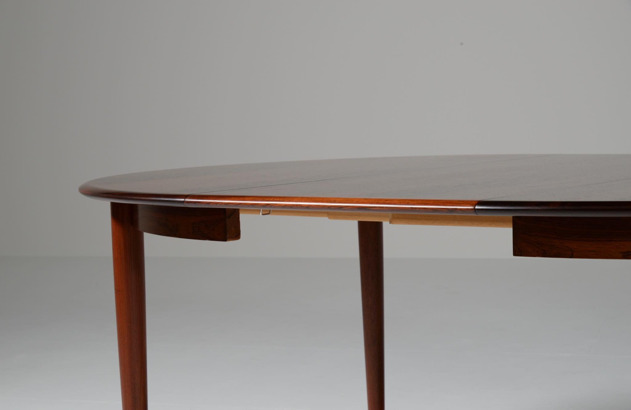 デンマークの家具工房、Skovmand & Andersen/スコウマン&アナセンによって作られたダイニングテーブルです。1950〜60年代頃に作られたものでしょう。天板はブラジル原産と思しきローズウッドが木取りされており、肌理細かく穏やかな木目文様に見応えがあります。エクステンションリーフが一枚備わり天板面積の拡張が可能です。表面の塗膜に劣化が見られたため再塗装を施しました。コンディションは良好です。