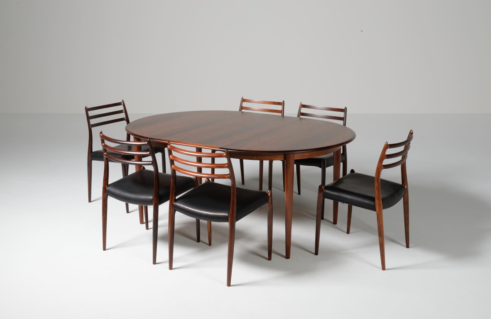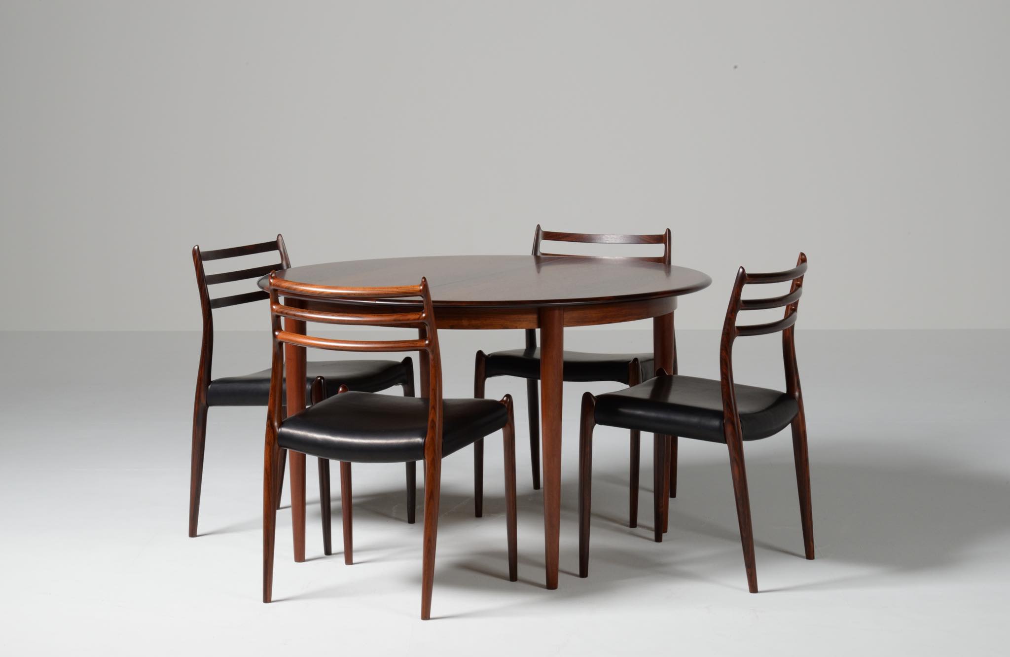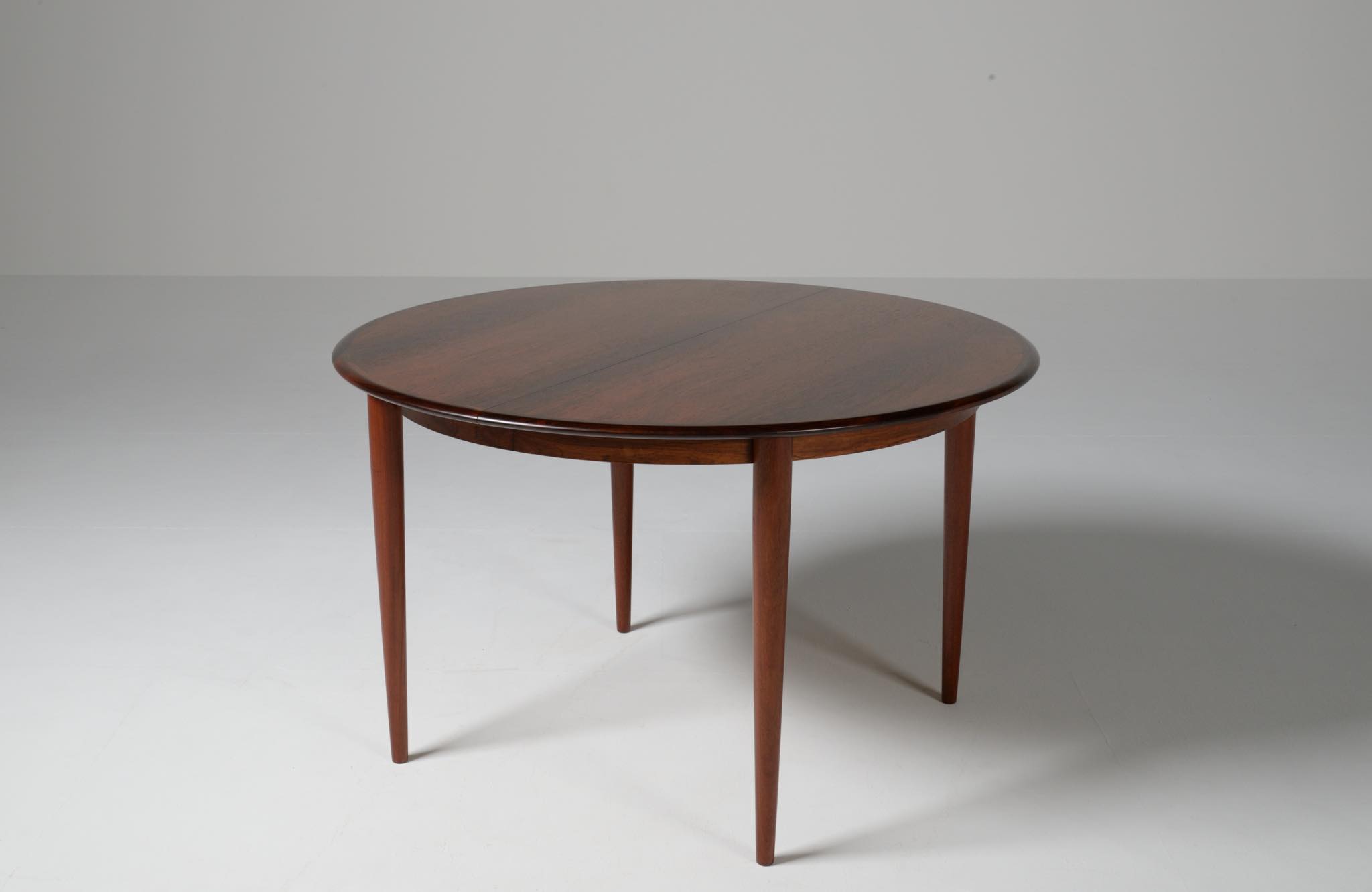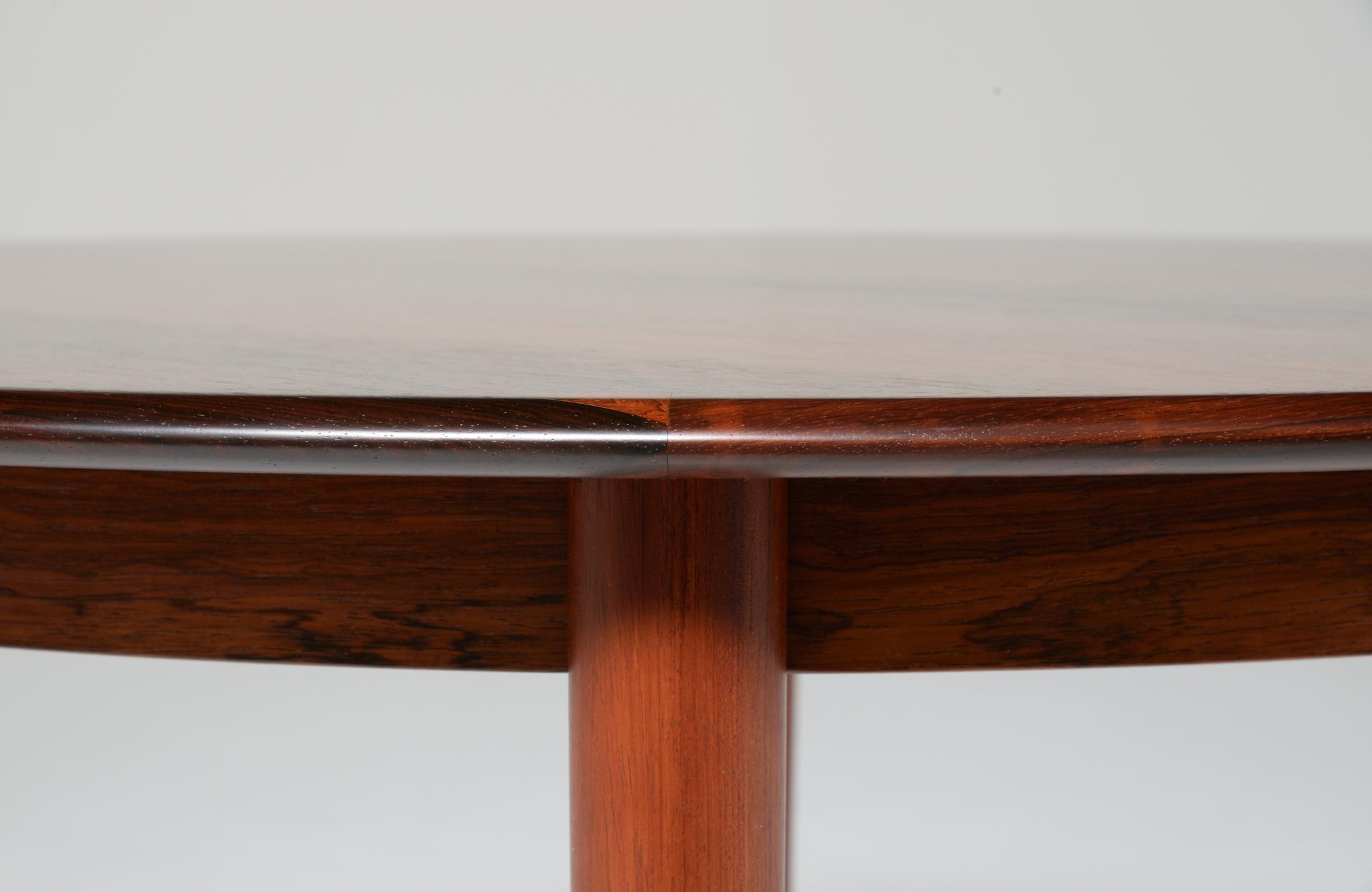 デンマークの家具工房、Skovmand & Andersen/スコウマン&アナセンによって作られたダイニングテーブルです。1950〜60年代頃に作られたものでしょう。天板はブラジル原産と思しきローズウッドが木取りされており、肌理細かく穏やかな木目文様に見応えがあります。エクステンションリーフが一枚備わり天板面積の拡張が可能です。表面の塗膜に劣化が見られたため再塗装を施しました。コンディションは良好です。