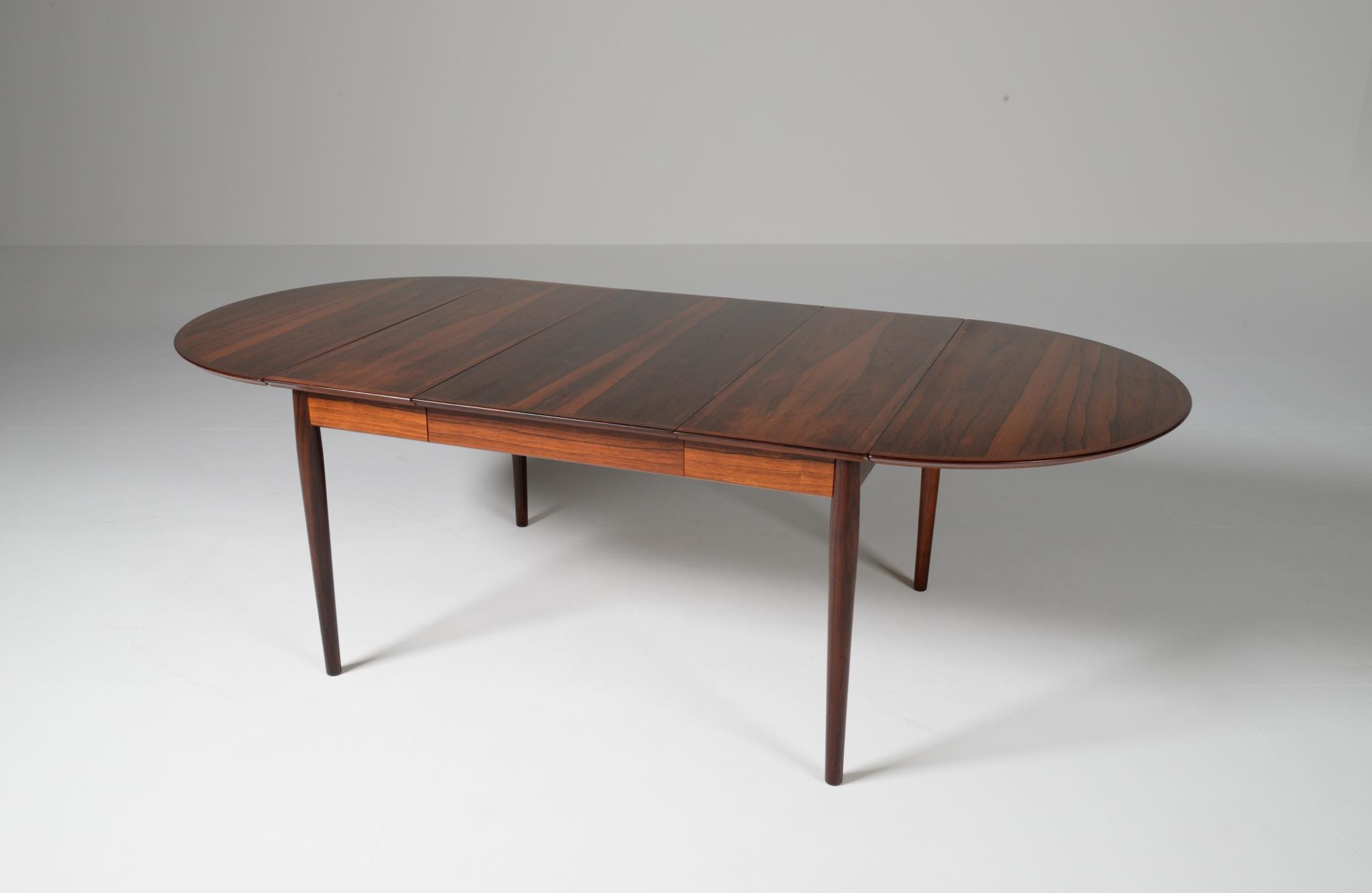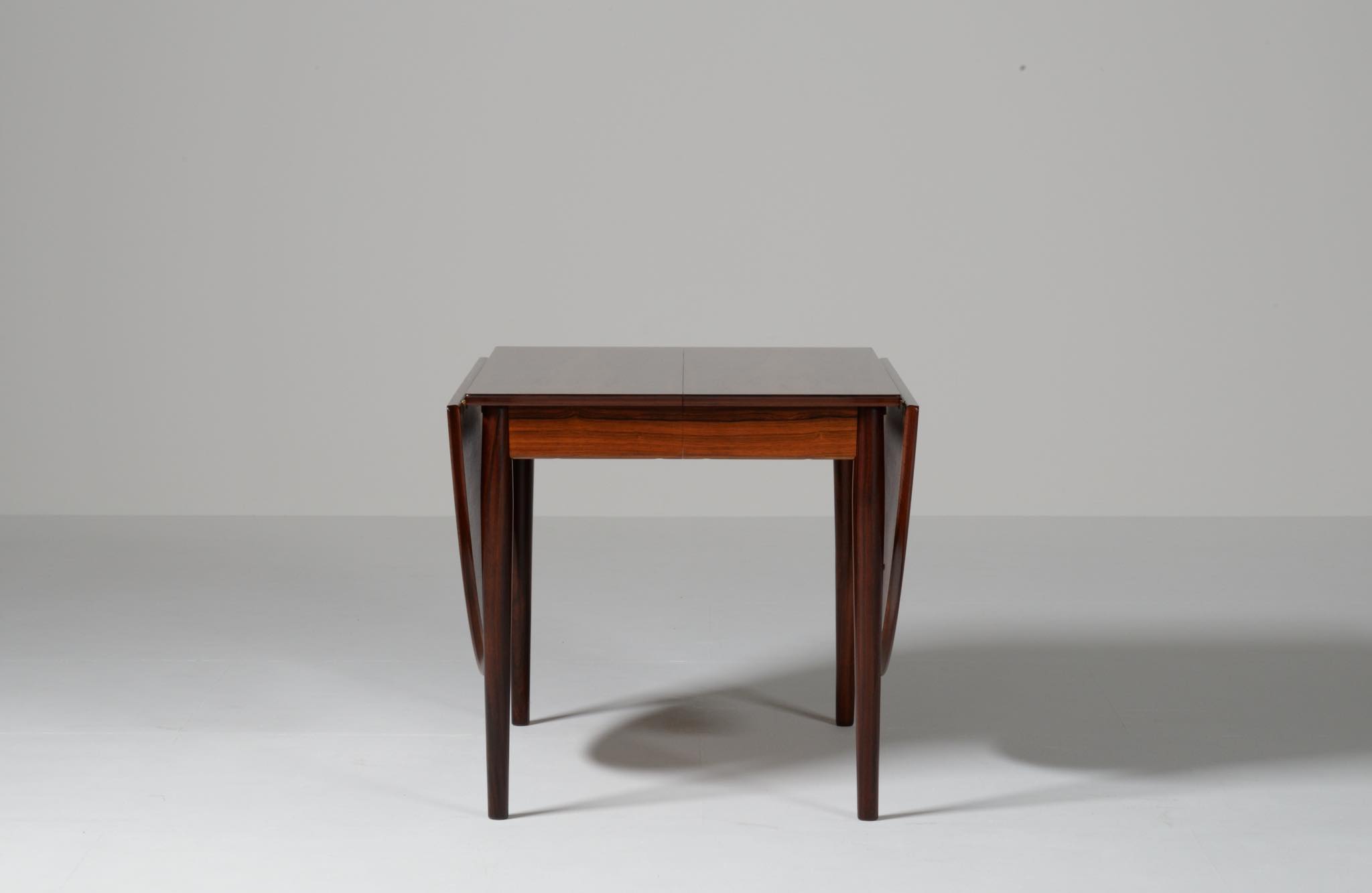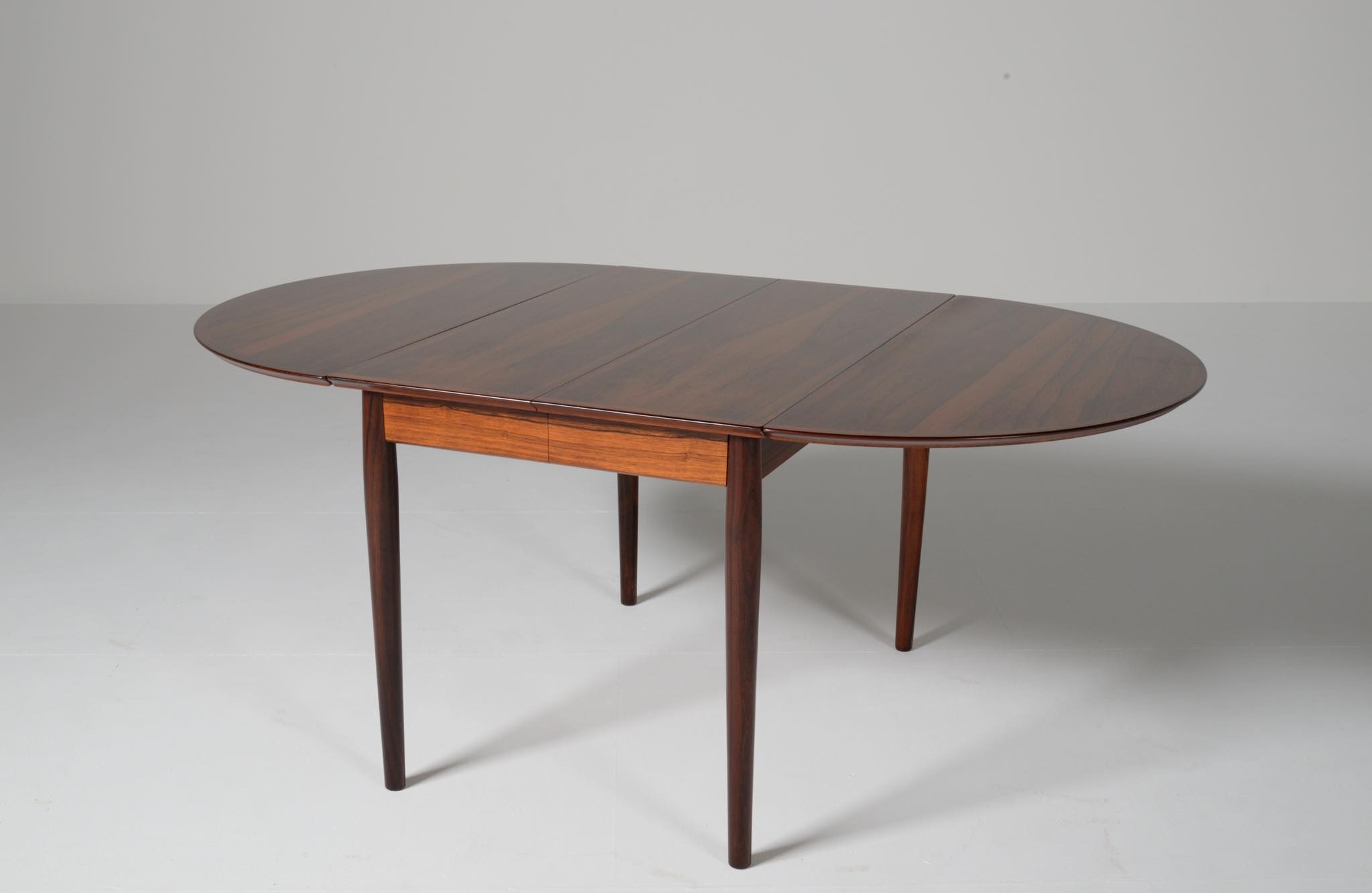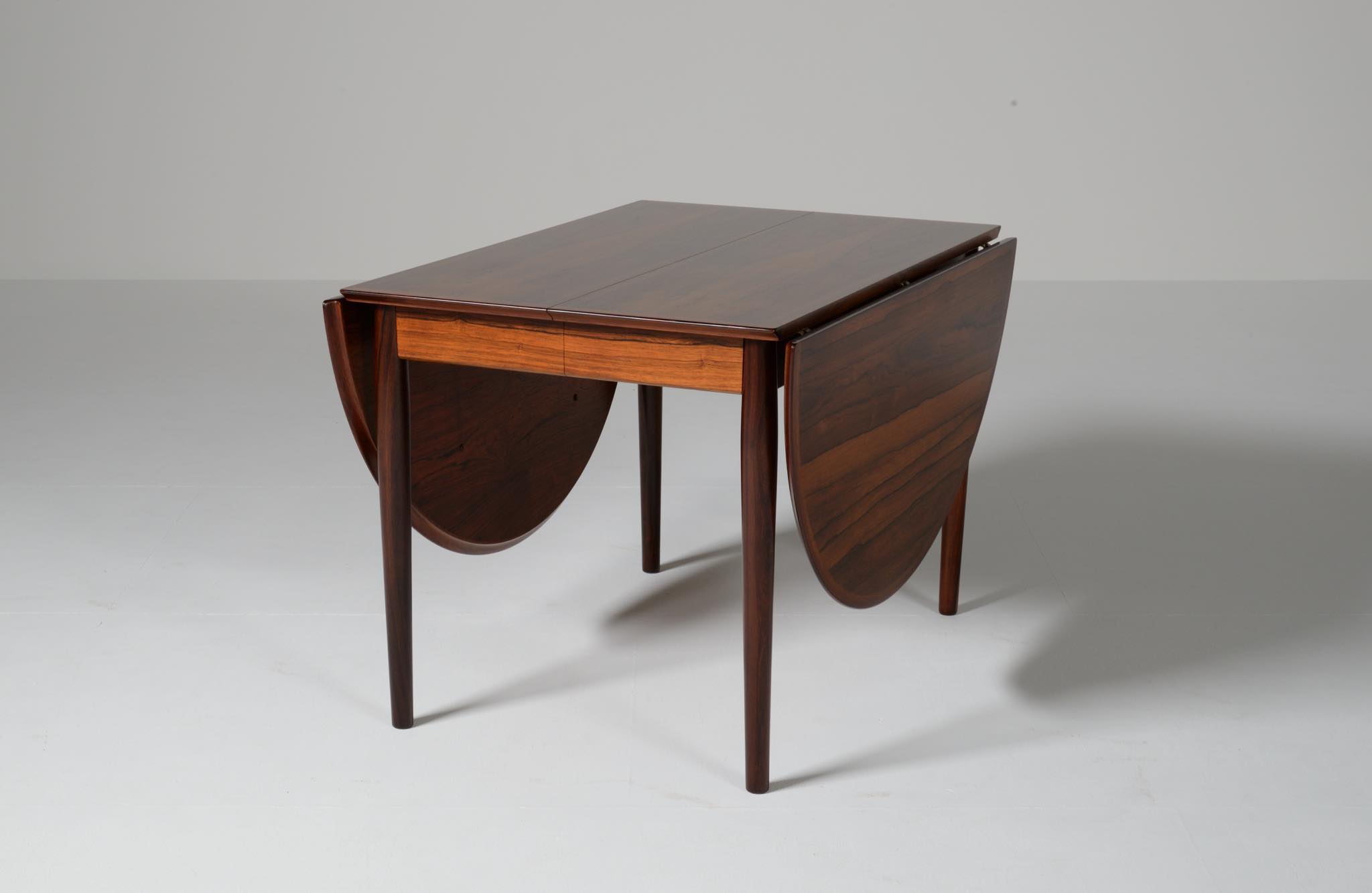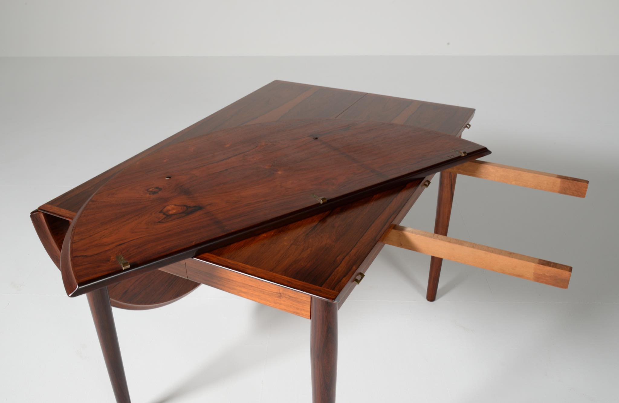 1960年代に活動したデンマークを代表する家具デザイナー、Arne Vodder/アルネ・ヴォッダーによるバタフライスタイルのダイニングテーブルです。シバストファニチャー社によって1960年代に作られたもので、ブラジル原産と思しきローズウッド材が用いられており、しっかりとした作りのものです。側面に提げられたリーフは取り外すことが可能です。また、天板の中心にエクステンションリーフを挿入することができ、4段階でのサイズ変更が可能です。表面の塗膜に劣化が見られたため再塗装を施しました。コンディションは良好です。