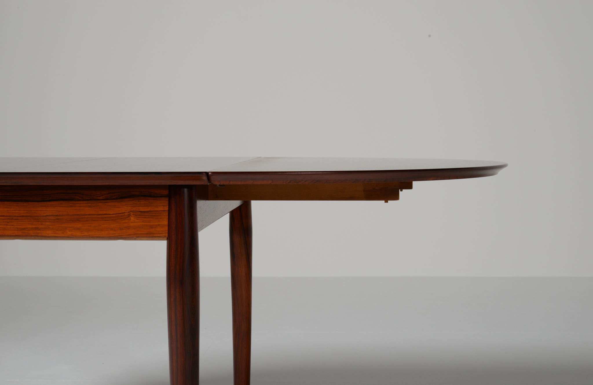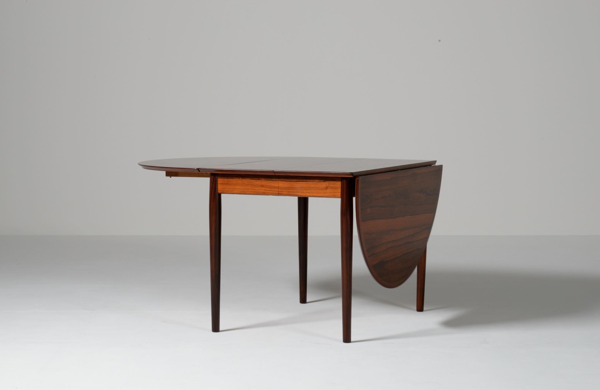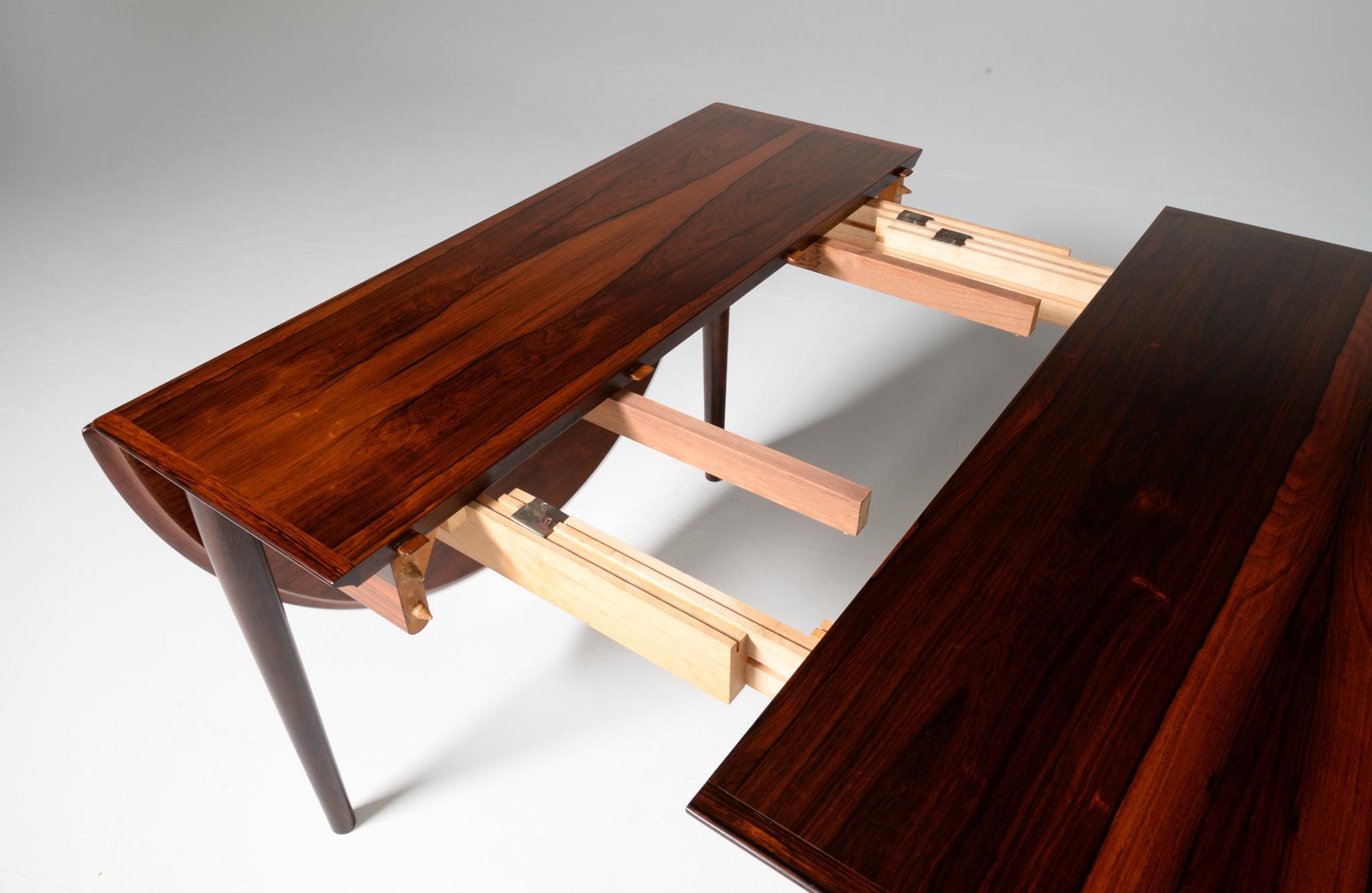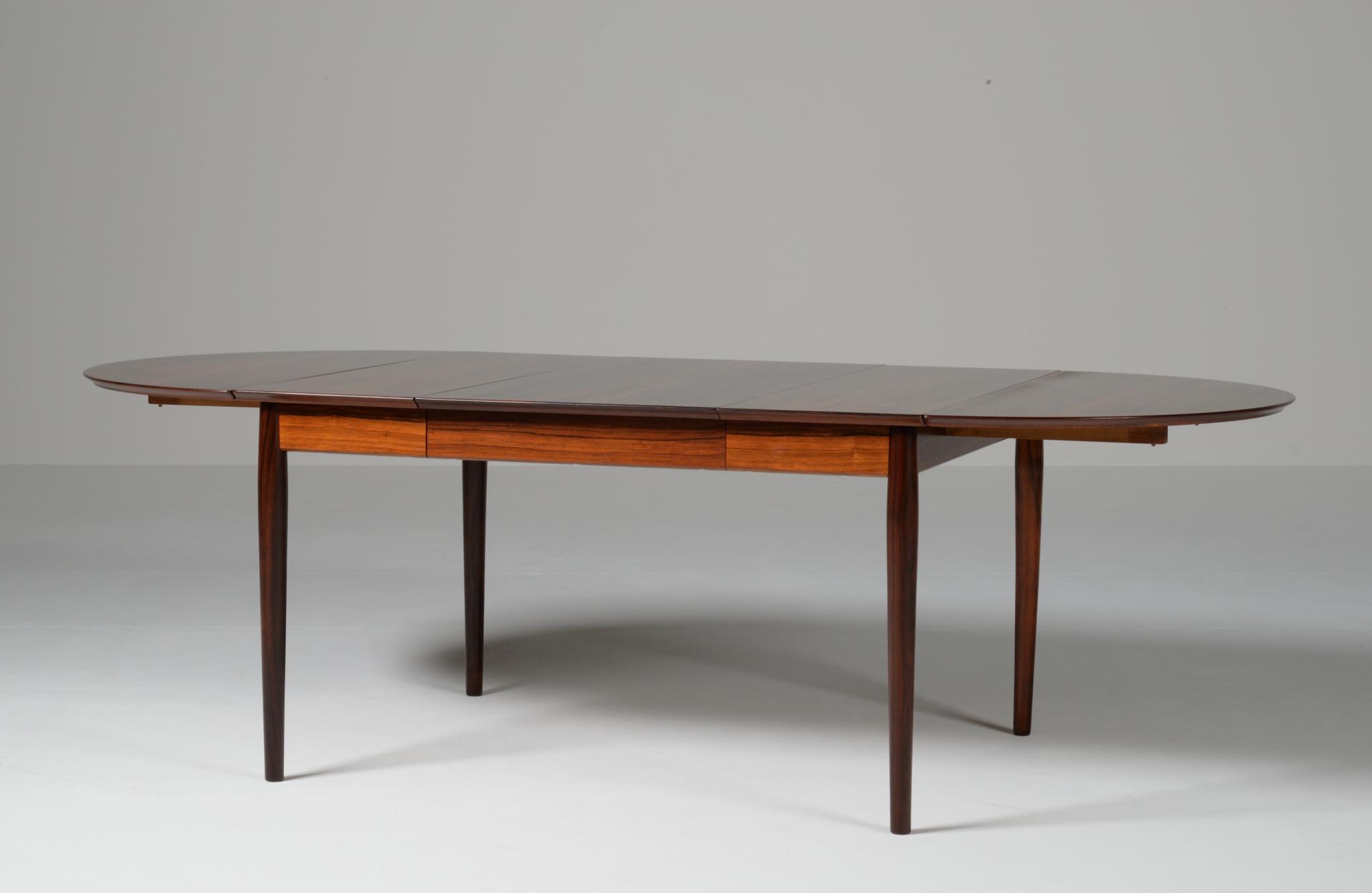1960年代に活動したデンマークを代表する家具デザイナー、Arne Vodder/アルネ・ヴォッダーによるバタフライスタイルのダイニングテーブルです。シバストファニチャー社によって1960年代に作られたもので、ブラジル原産と思しきローズウッド材が用いられており、しっかりとした作りのものです。側面に提げられたリーフは取り外すことが可能です。また、天板の中心にエクステンションリーフを挿入することができ、4段階でのサイズ変更が可能です。表面の塗膜に劣化が見られたため再塗装を施しました。コンディションは良好です。