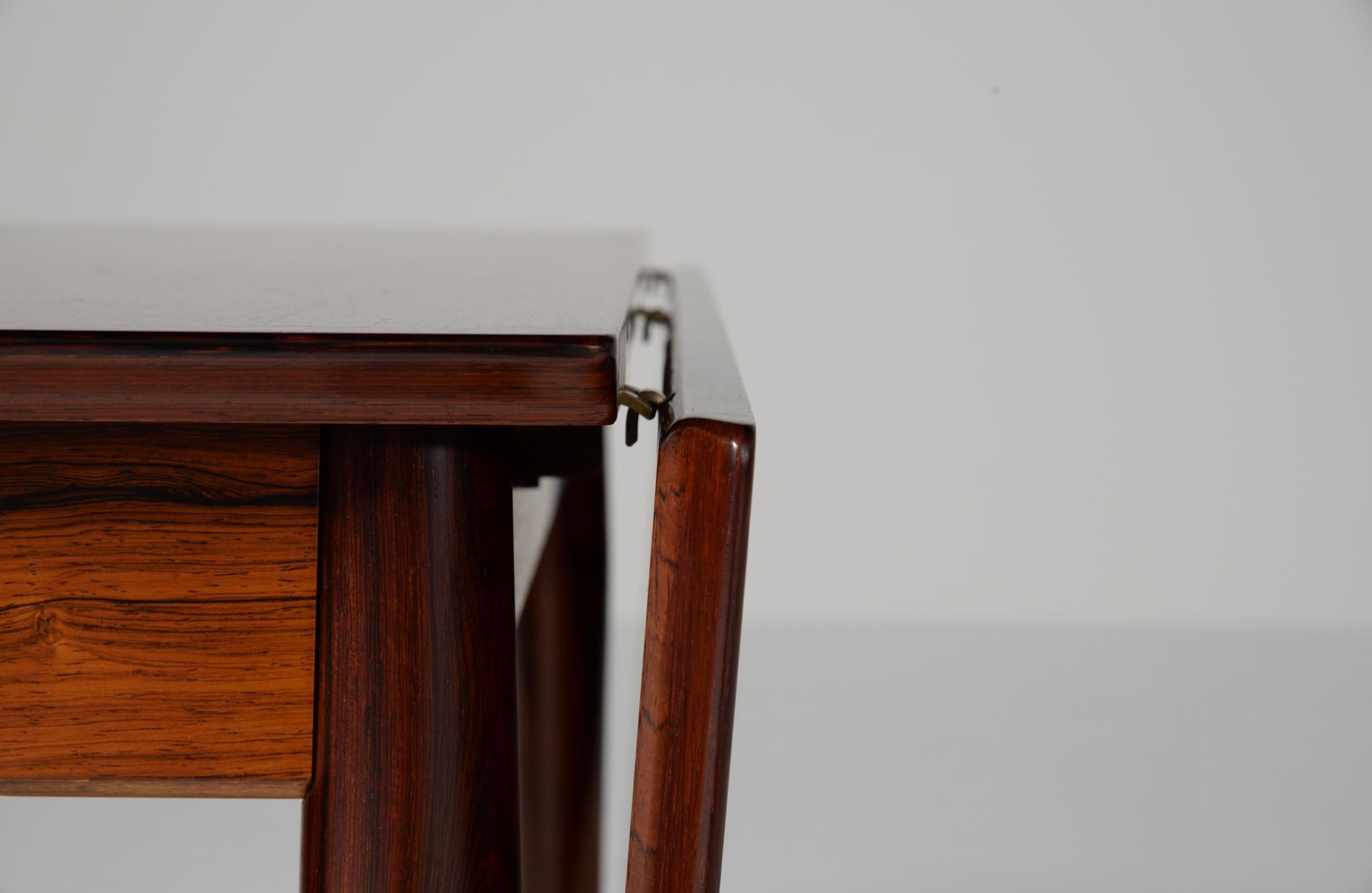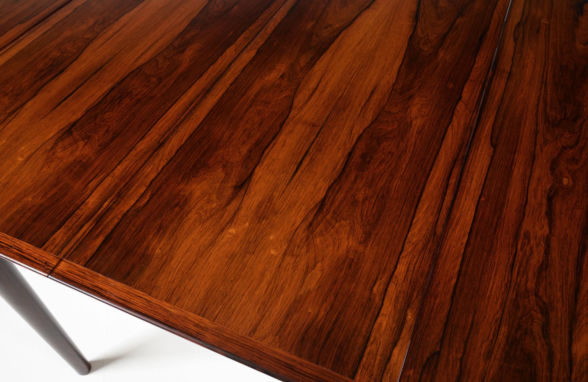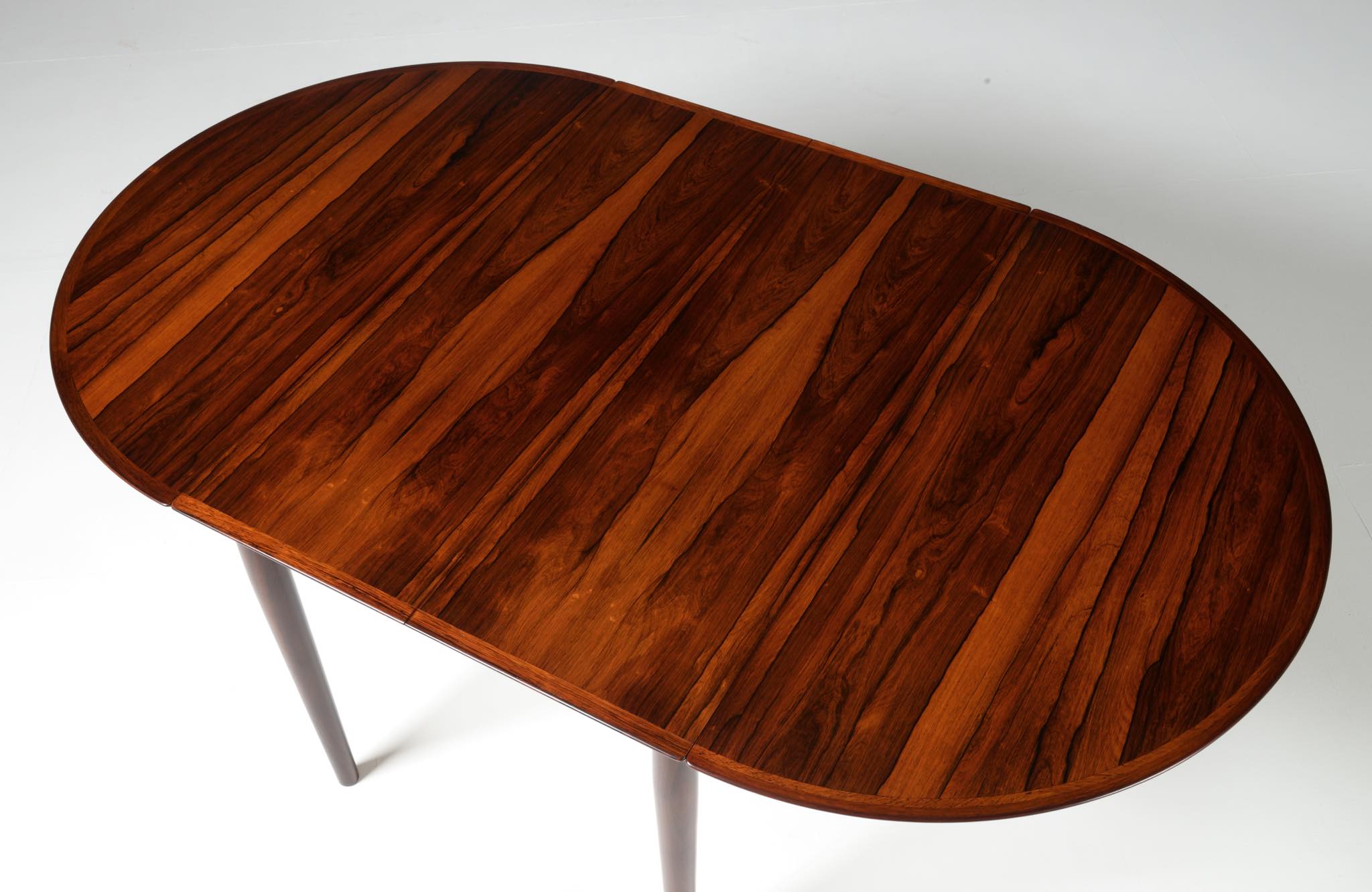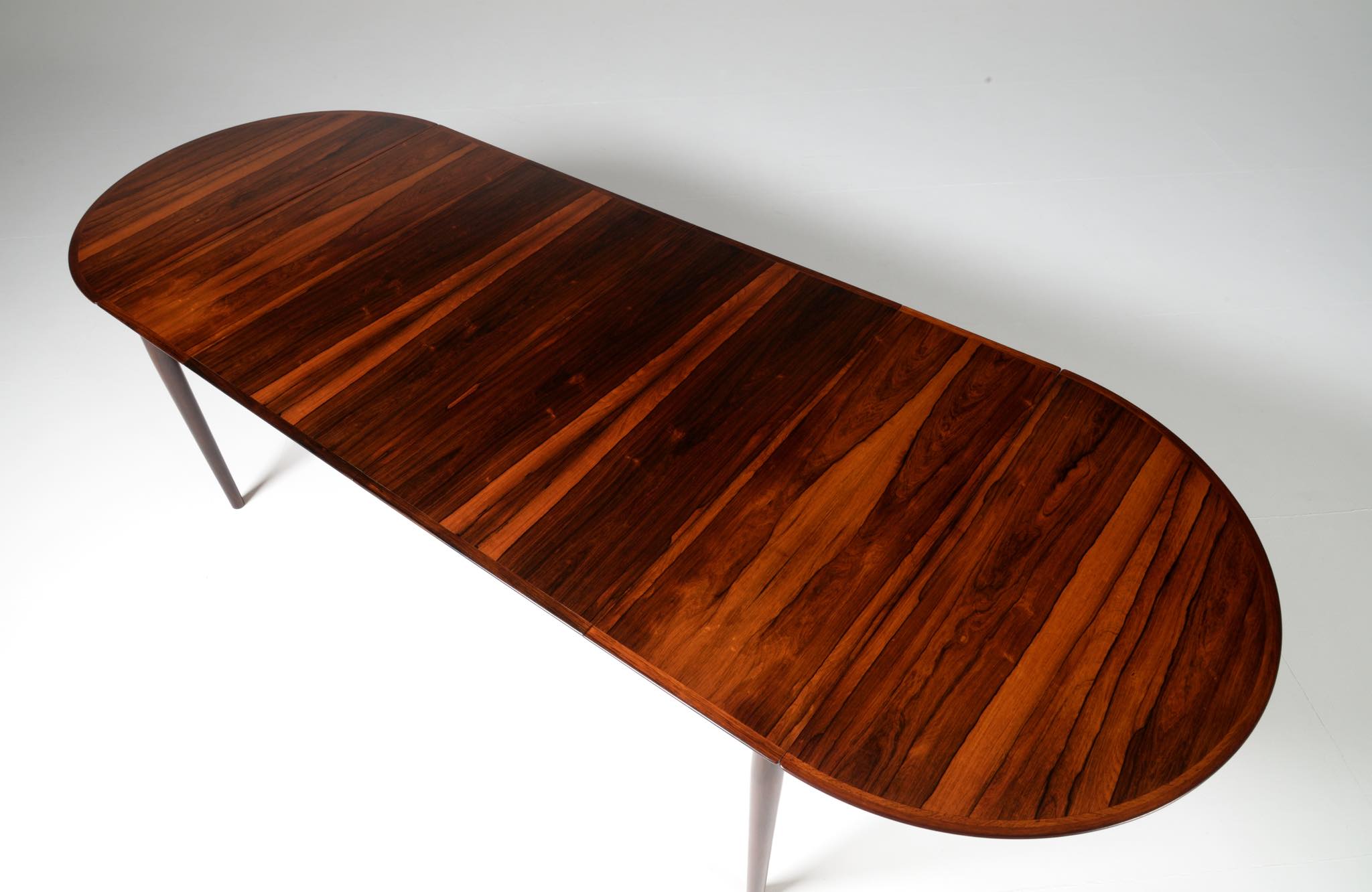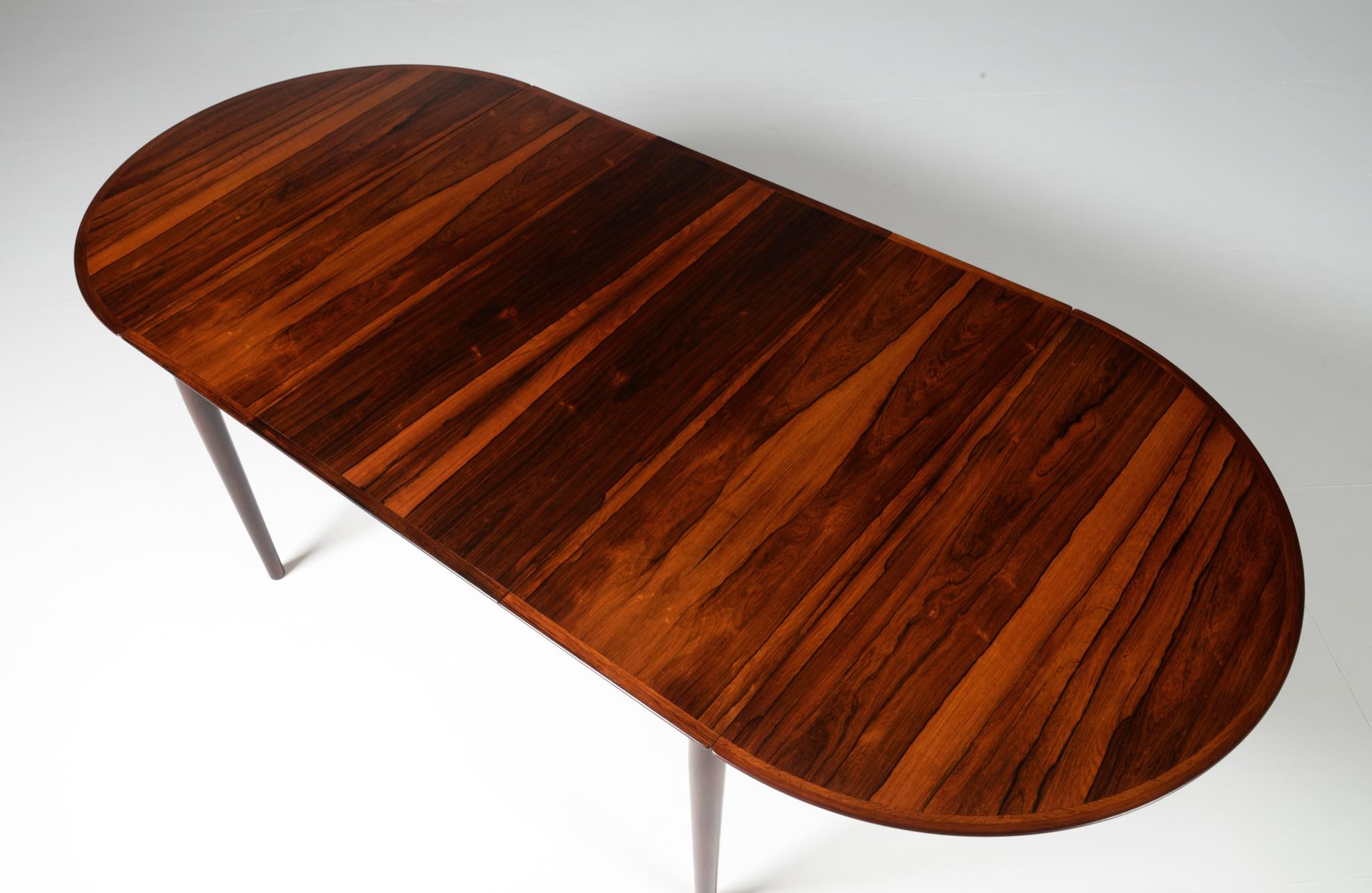 1960年代に活動したデンマークを代表する家具デザイナー、Arne Vodder/アルネ・ヴォッダーによるバタフライスタイルのダイニングテーブルです。シバストファニチャー社によって1960年代に作られたもので、ブラジル原産と思しきローズウッド材が用いられており、しっかりとした作りのものです。側面に提げられたリーフは取り外すことが可能です。また、天板の中心にエクステンションリーフを挿入することができ、4段階でのサイズ変更が可能です。表面の塗膜に劣化が見られたため再塗装を施しました。コンディションは良好です。