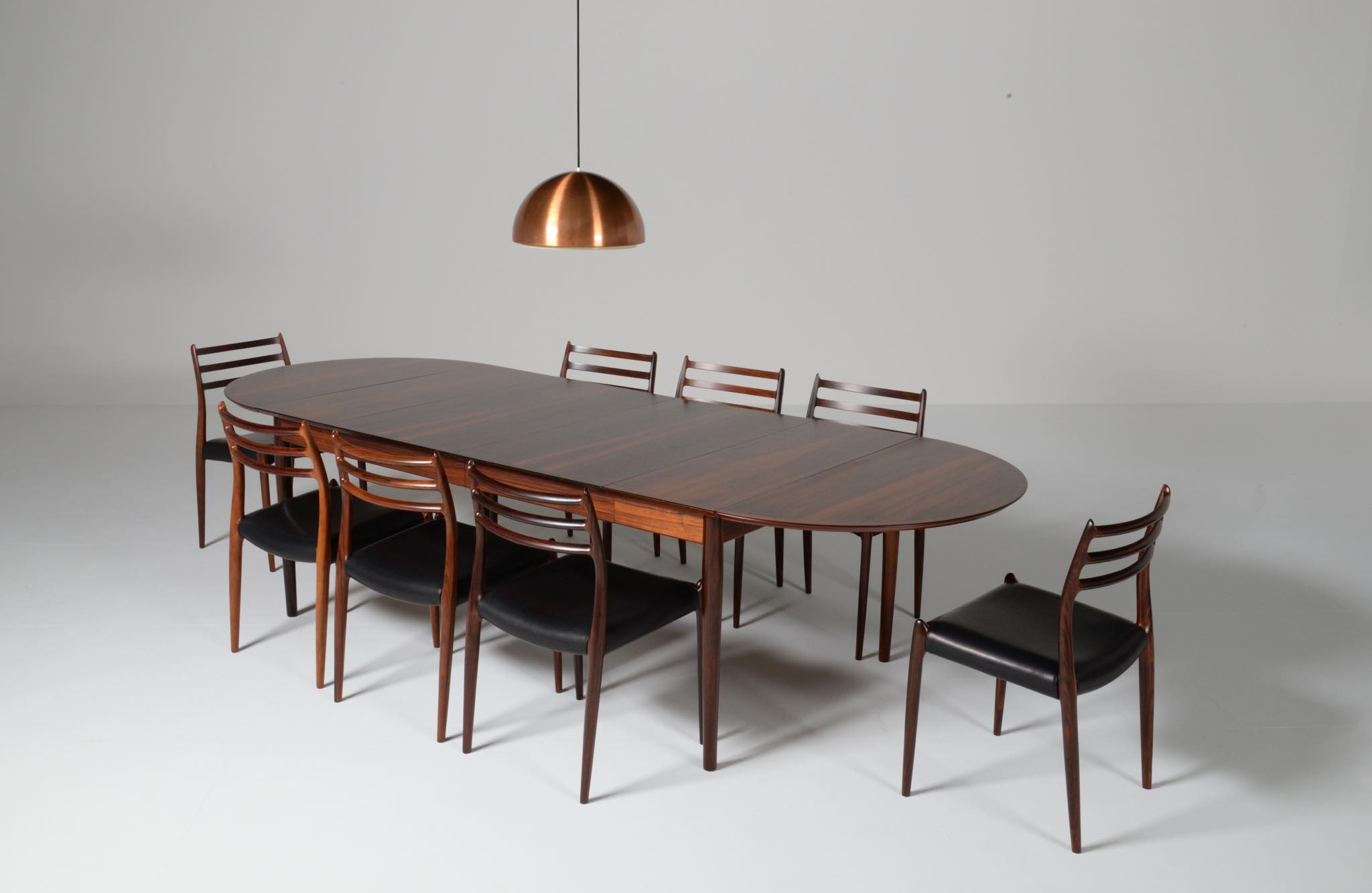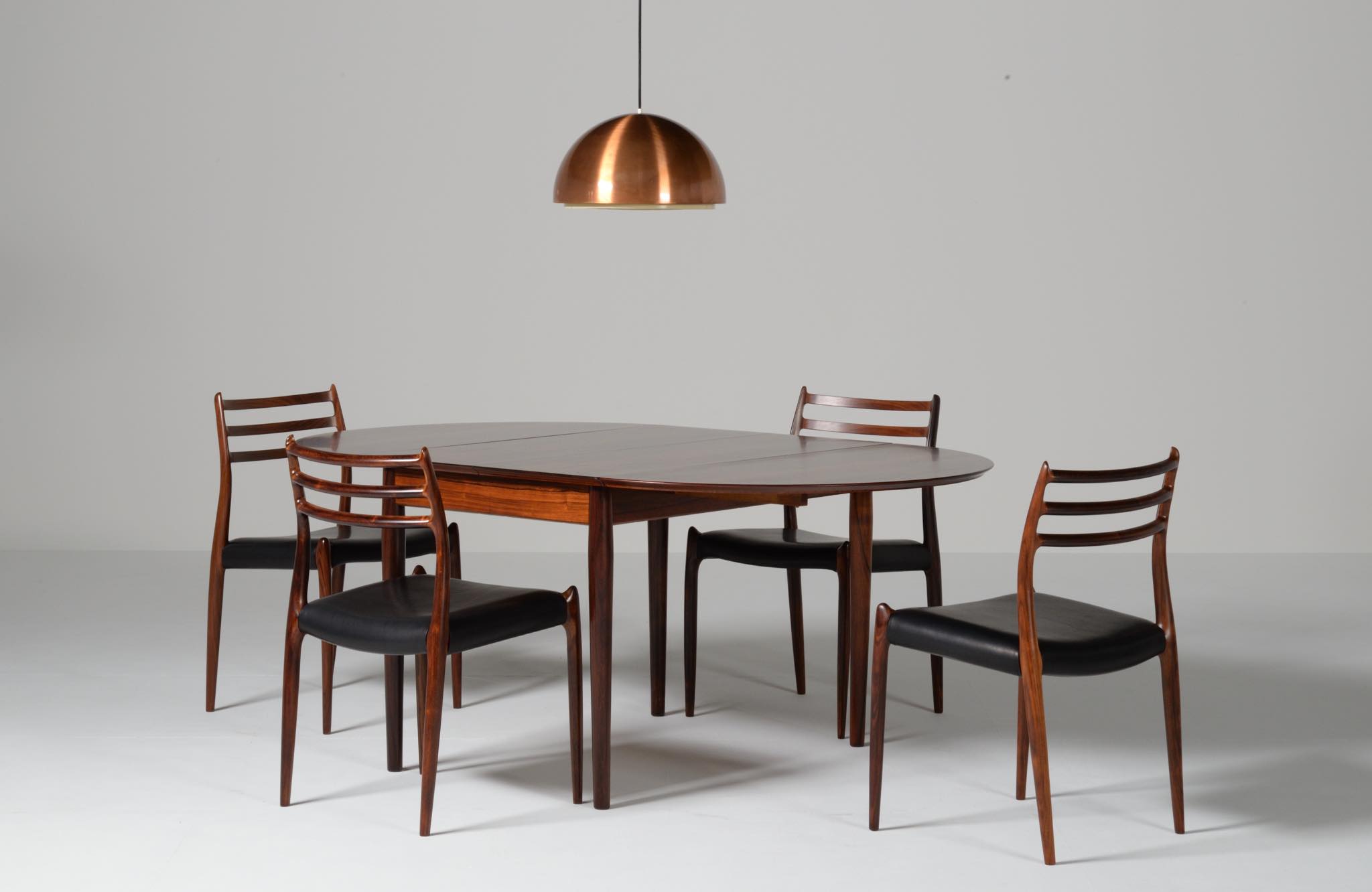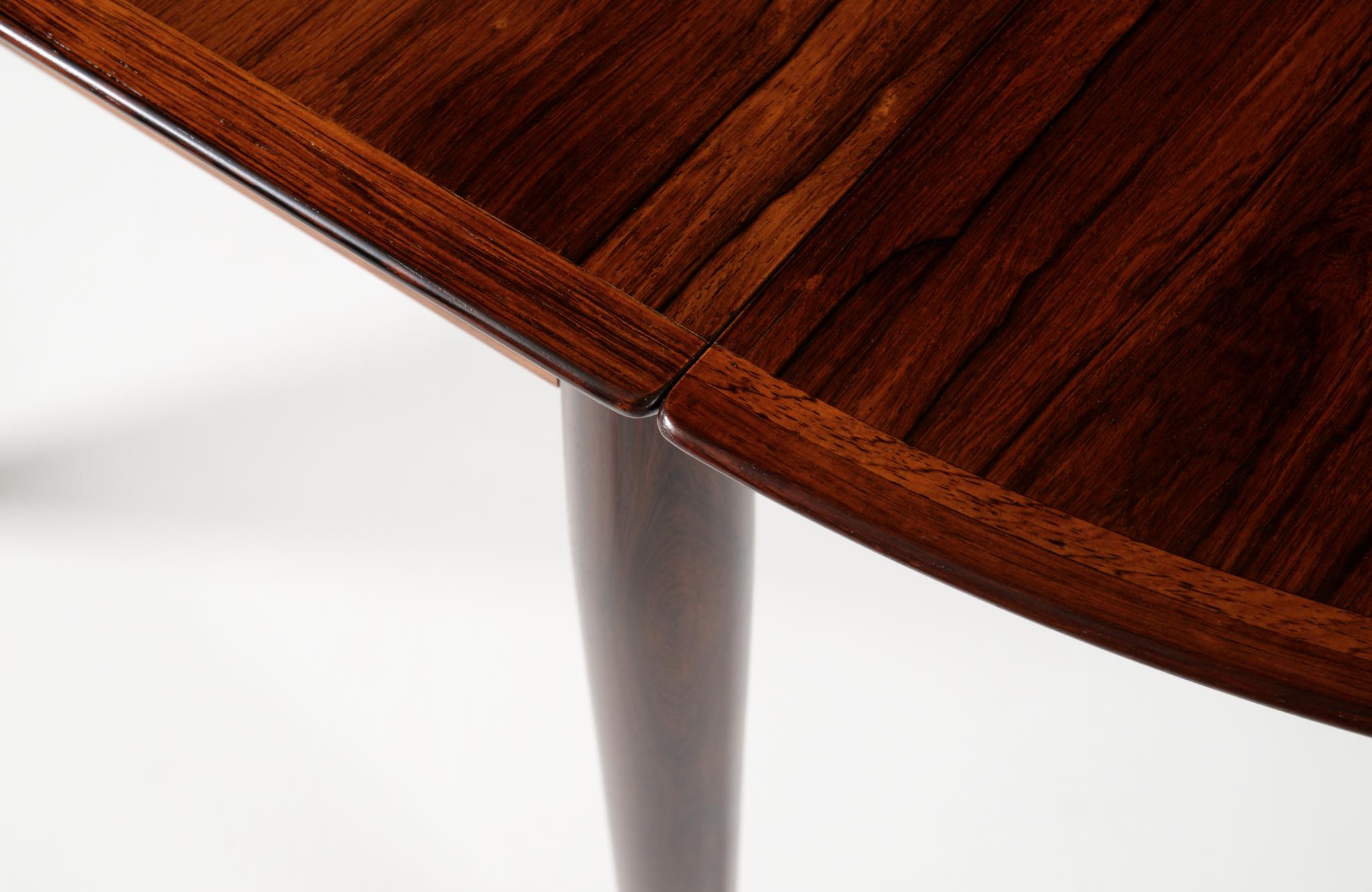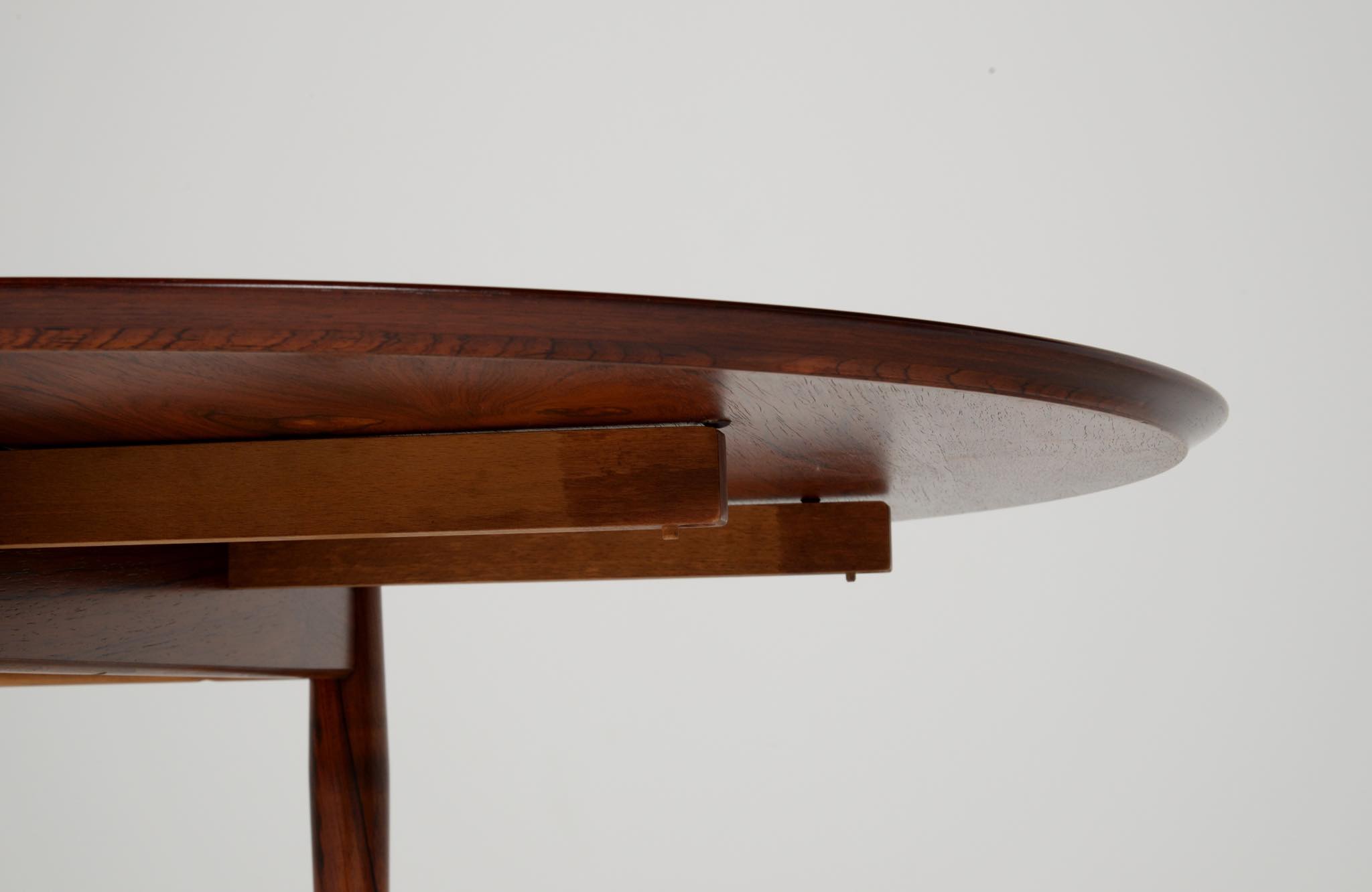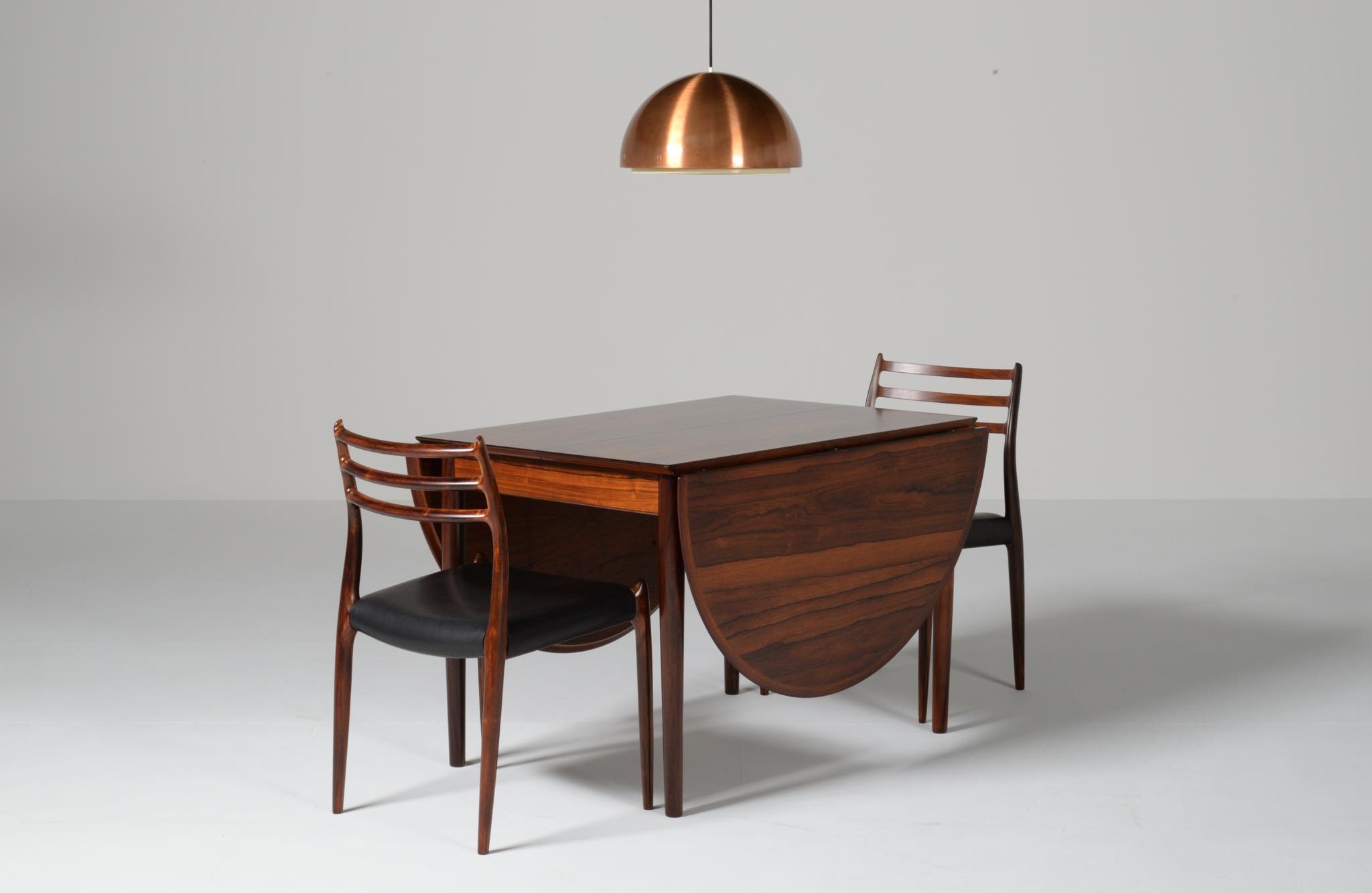 1960年代に活動したデンマークを代表する家具デザイナー、Arne Vodder/アルネ・ヴォッダーによるバタフライスタイルのダイニングテーブルです。シバストファニチャー社によって1960年代に作られたもので、ブラジル原産と思しきローズウッド材が用いられており、しっかりとした作りのものです。側面に提げられたリーフは取り外すことが可能です。また、天板の中心にエクステンションリーフを挿入することができ、4段階でのサイズ変更が可能です。表面の塗膜に劣化が見られたため再塗装を施しました。コンディションは良好です。