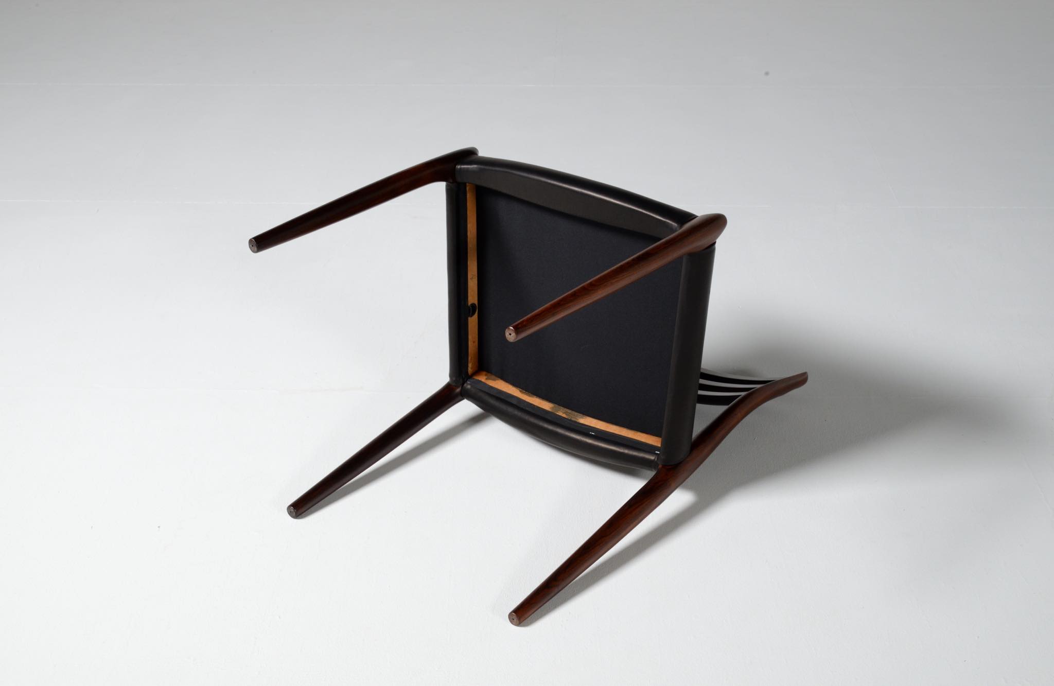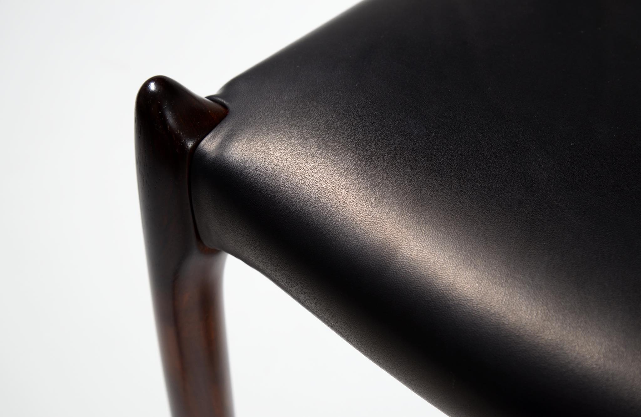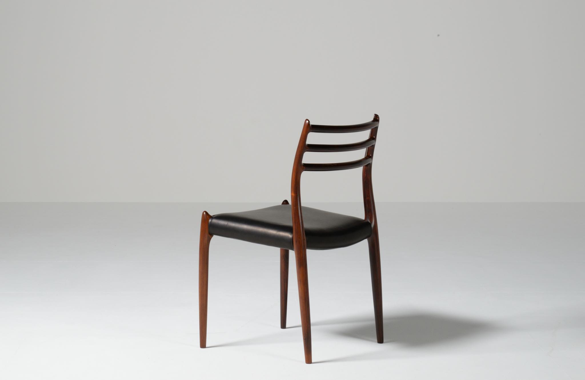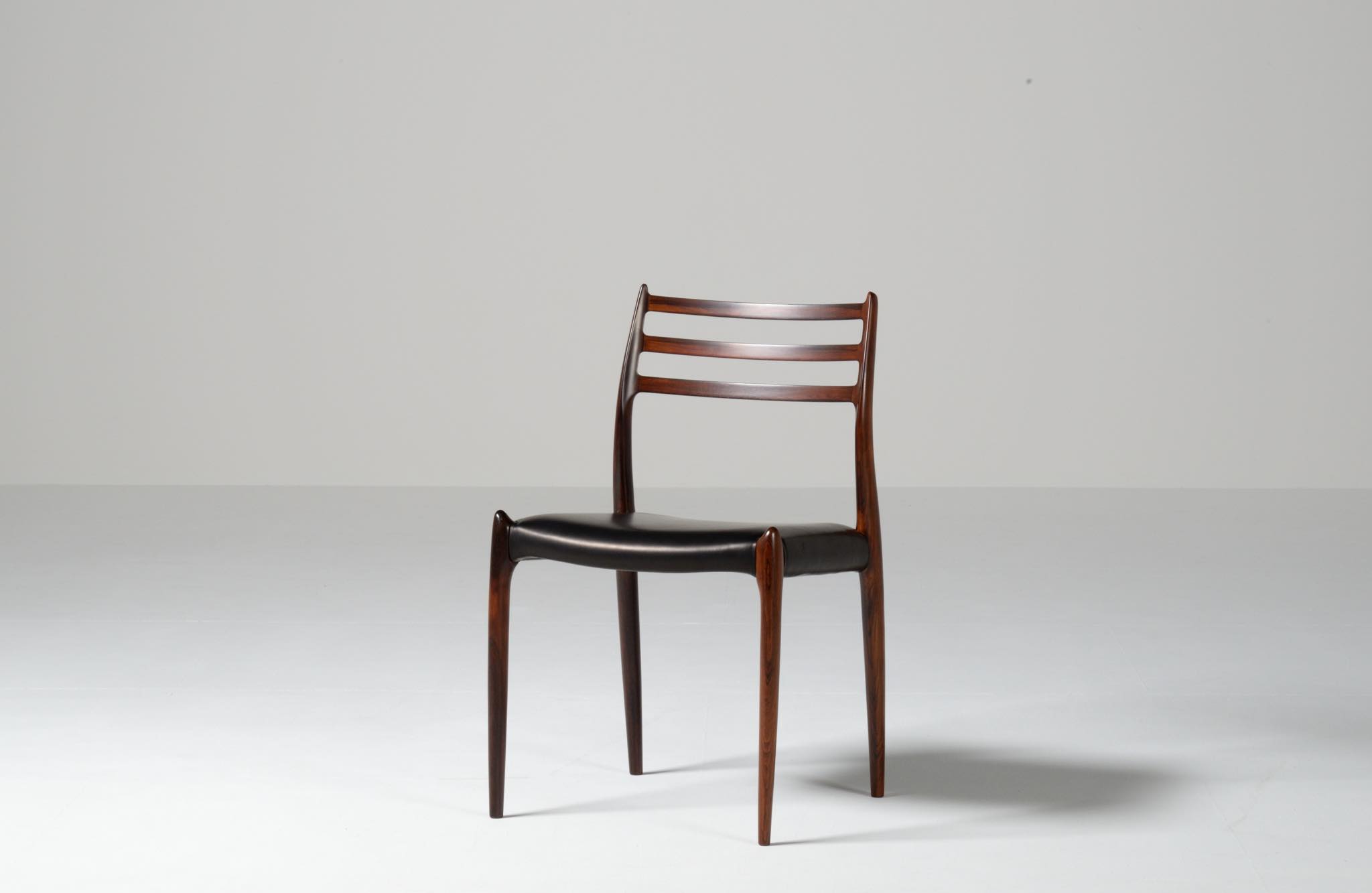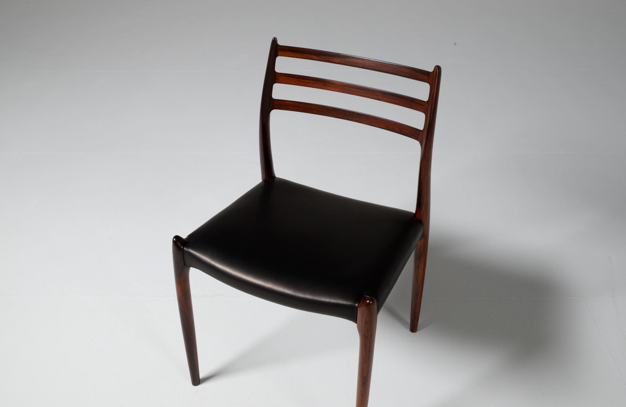 デンマークの家具工房、J.L.Møller/J.L.モラーによるダイニングチェア "model 78" です。創業者のN.O. Moller/ニルス・オット・モラーによってデザインされたモデルで、こちらは1960年代頃に作られたヴィンテージ品です。良質なローズウッドが用いられており、綺麗な木目文様が現れています。座面はデンマークのCAMO leather社による良質な黒皮革にて張り替えを行いました。フレームの塗膜に劣化が見られたため再塗装しており、コンディションは良好です。