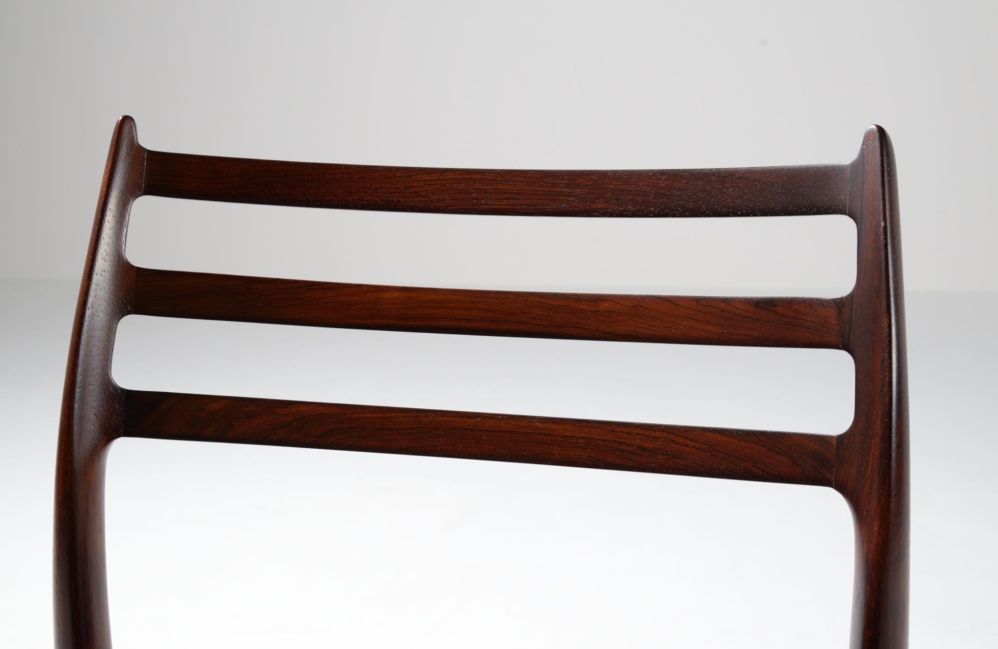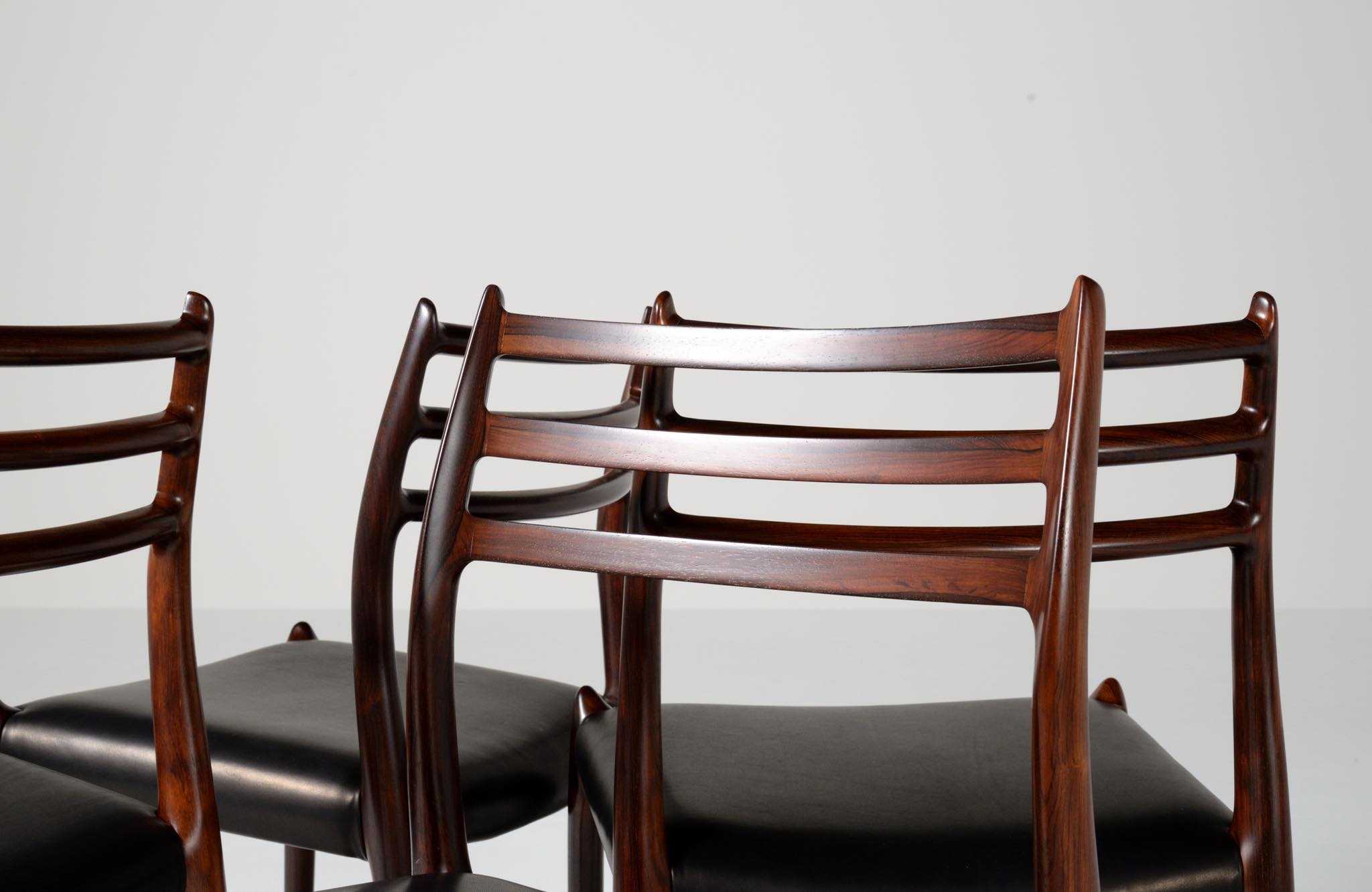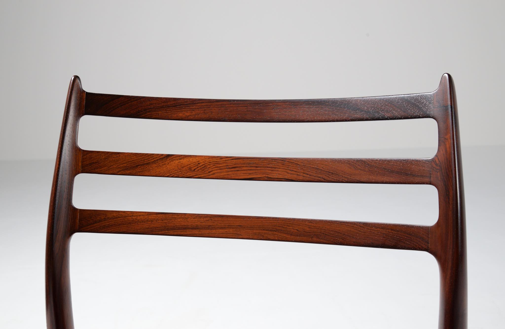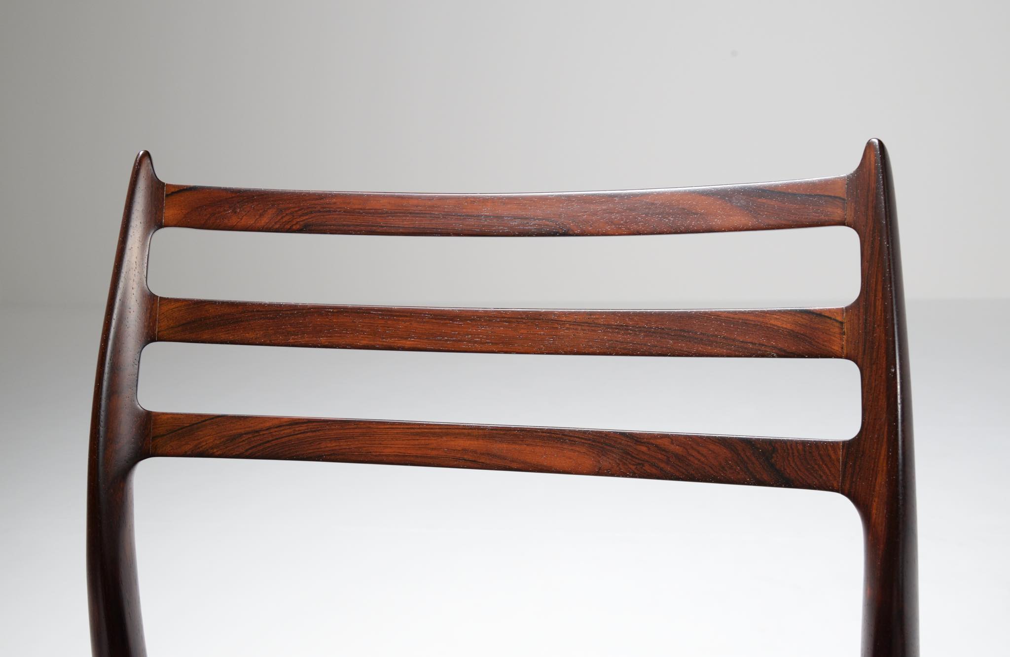 デンマークの家具工房、J.L.Møller/J.L.モラーによるダイニングチェア "model 78" です。創業者のN.O. Moller/ニルス・オット・モラーによってデザインされたモデルで、こちらは1960年代頃に作られたヴィンテージ品です。良質なローズウッドが用いられており、綺麗な木目文様が現れています。座面はデンマークのCAMO leather社による良質な黒皮革にて張り替えを行いました。フレームの塗膜に劣化が見られたため再塗装しており、コンディションは良好です。