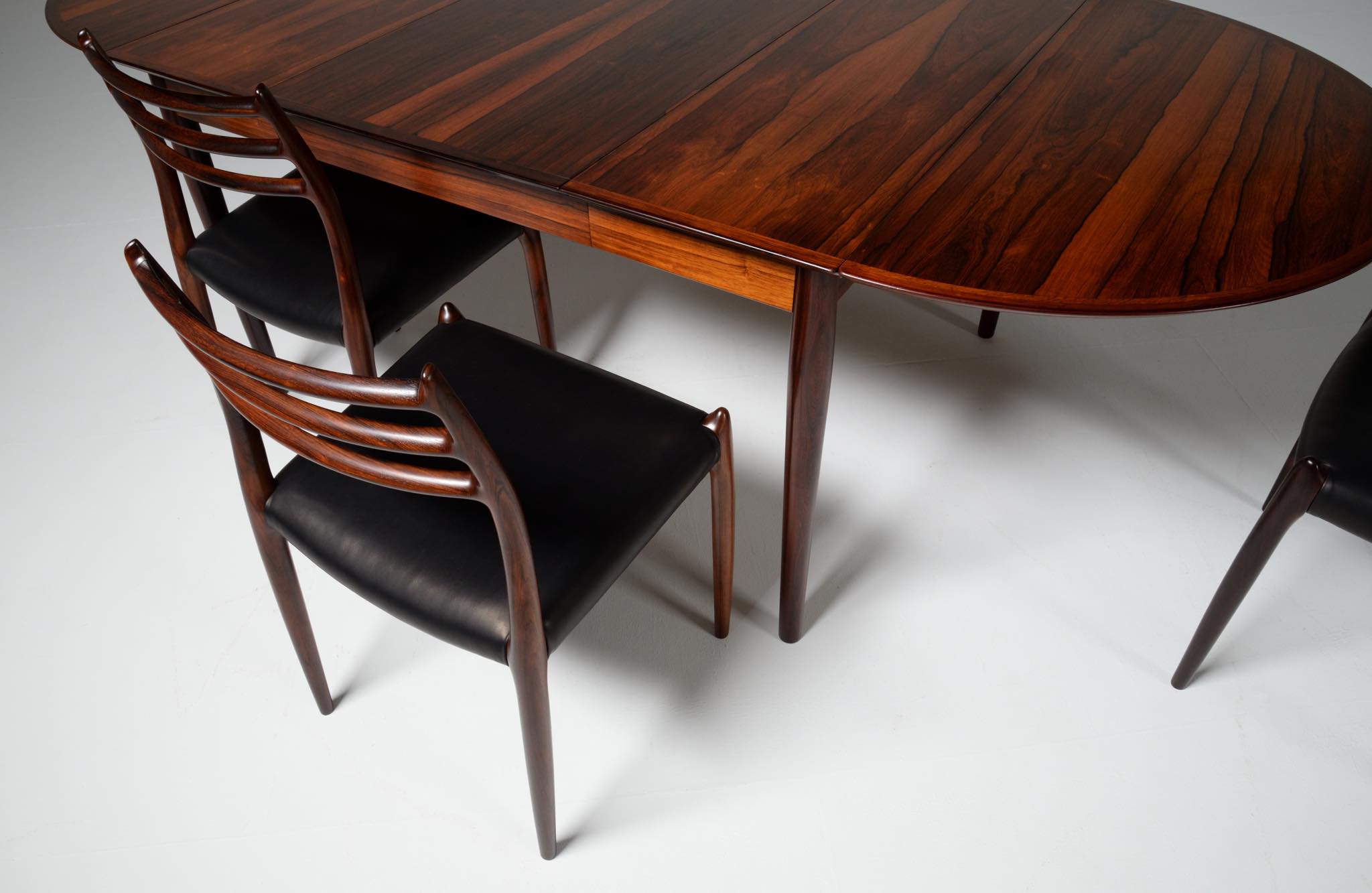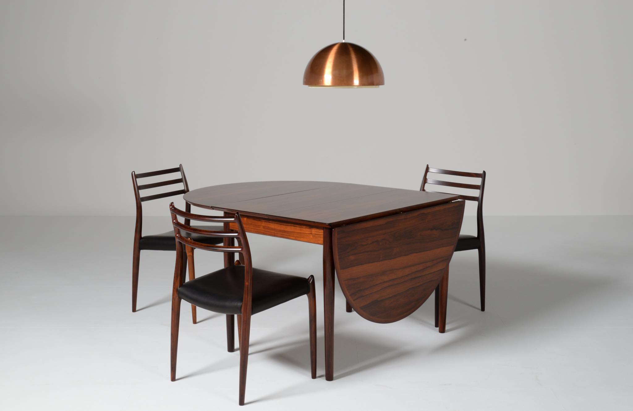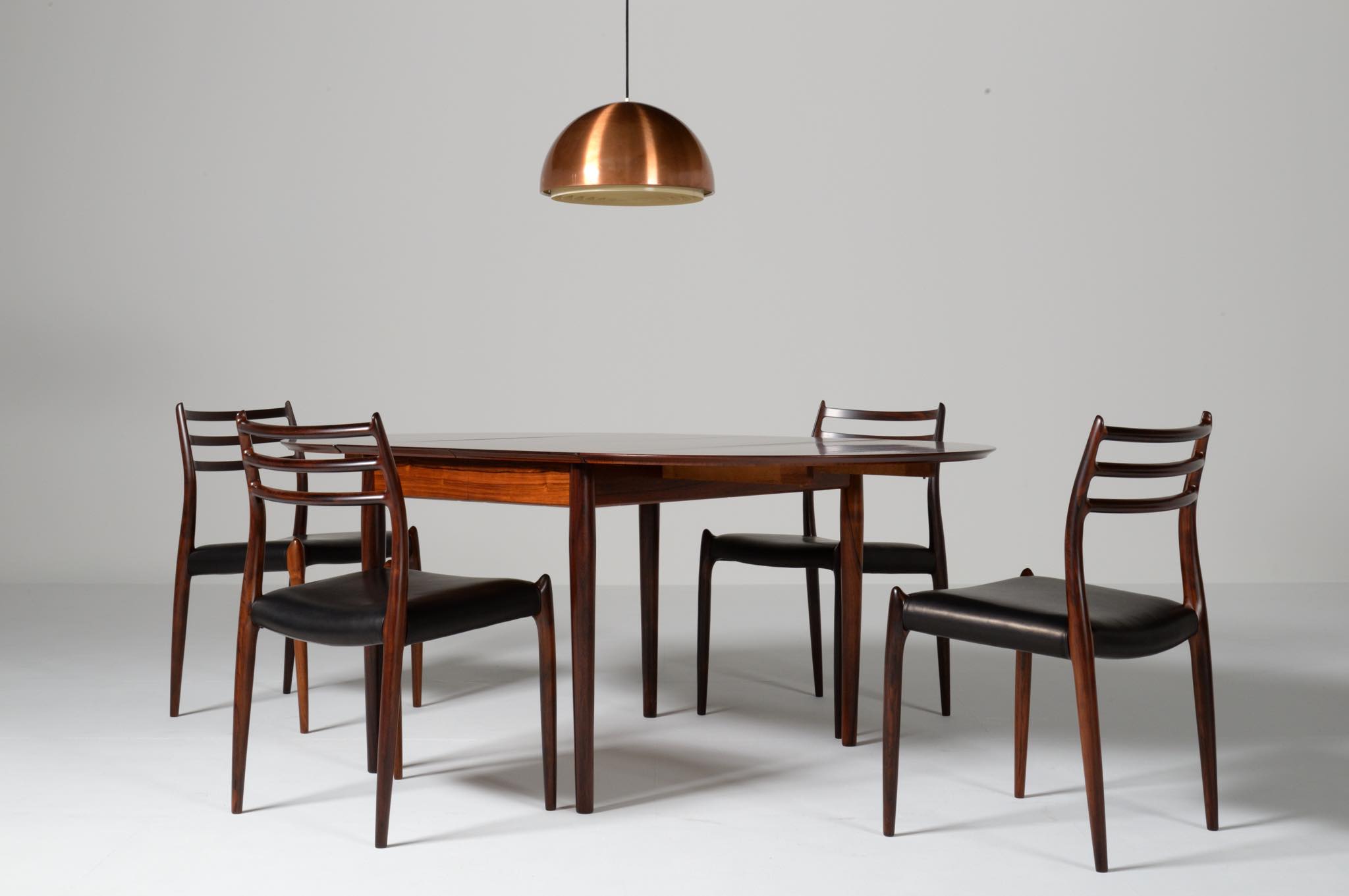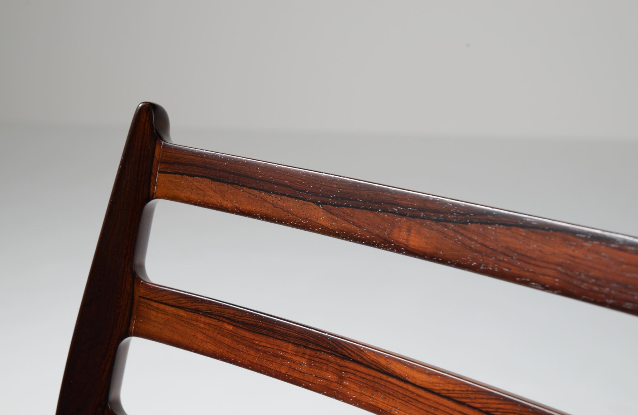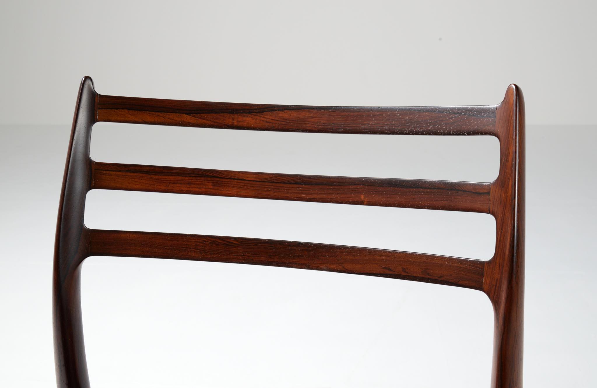 デンマークの家具工房、J.L.Møller/J.L.モラーによるダイニングチェア "model 78" です。創業者のN.O. Moller/ニルス・オット・モラーによってデザインされたモデルで、こちらは1960年代頃に作られたヴィンテージ品です。良質なローズウッドが用いられており、綺麗な木目文様が現れています。座面はデンマークのCAMO leather社による良質な黒皮革にて張り替えを行いました。フレームの塗膜に劣化が見られたため再塗装しており、コンディションは良好です。