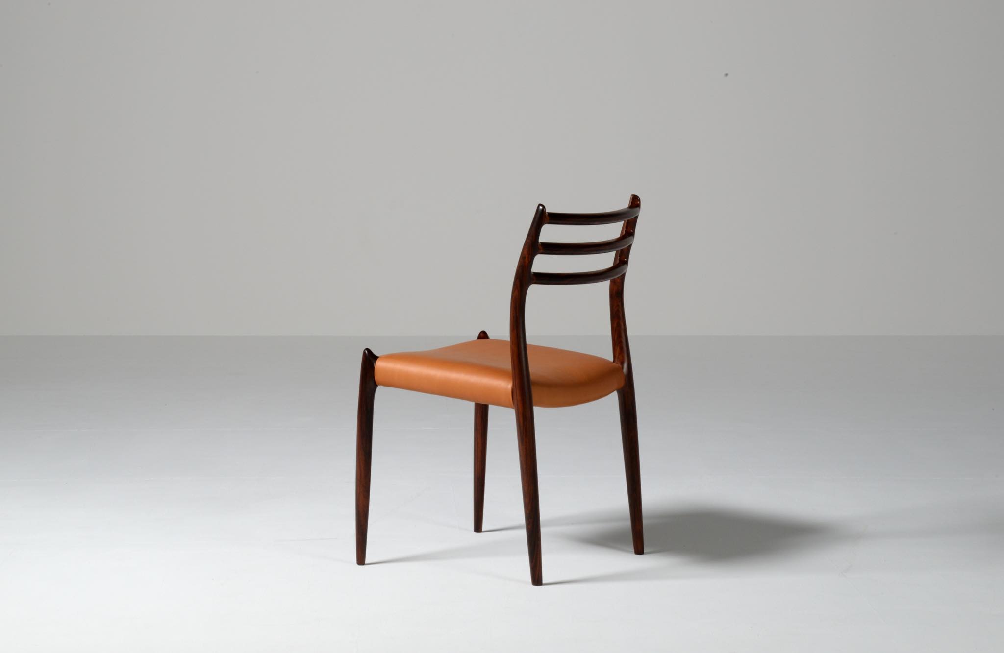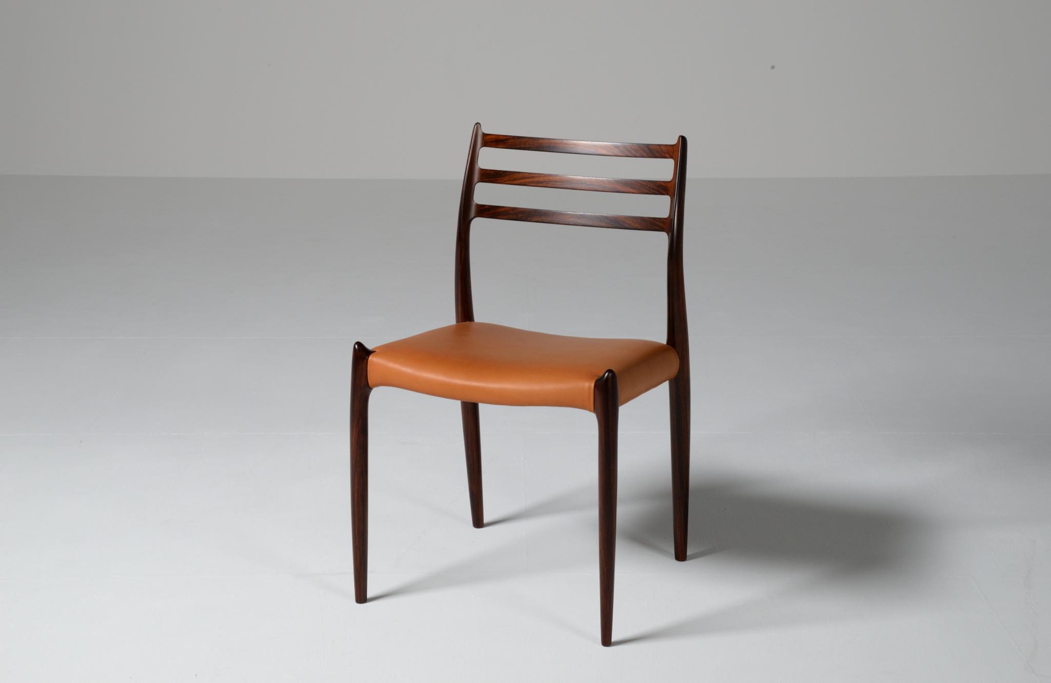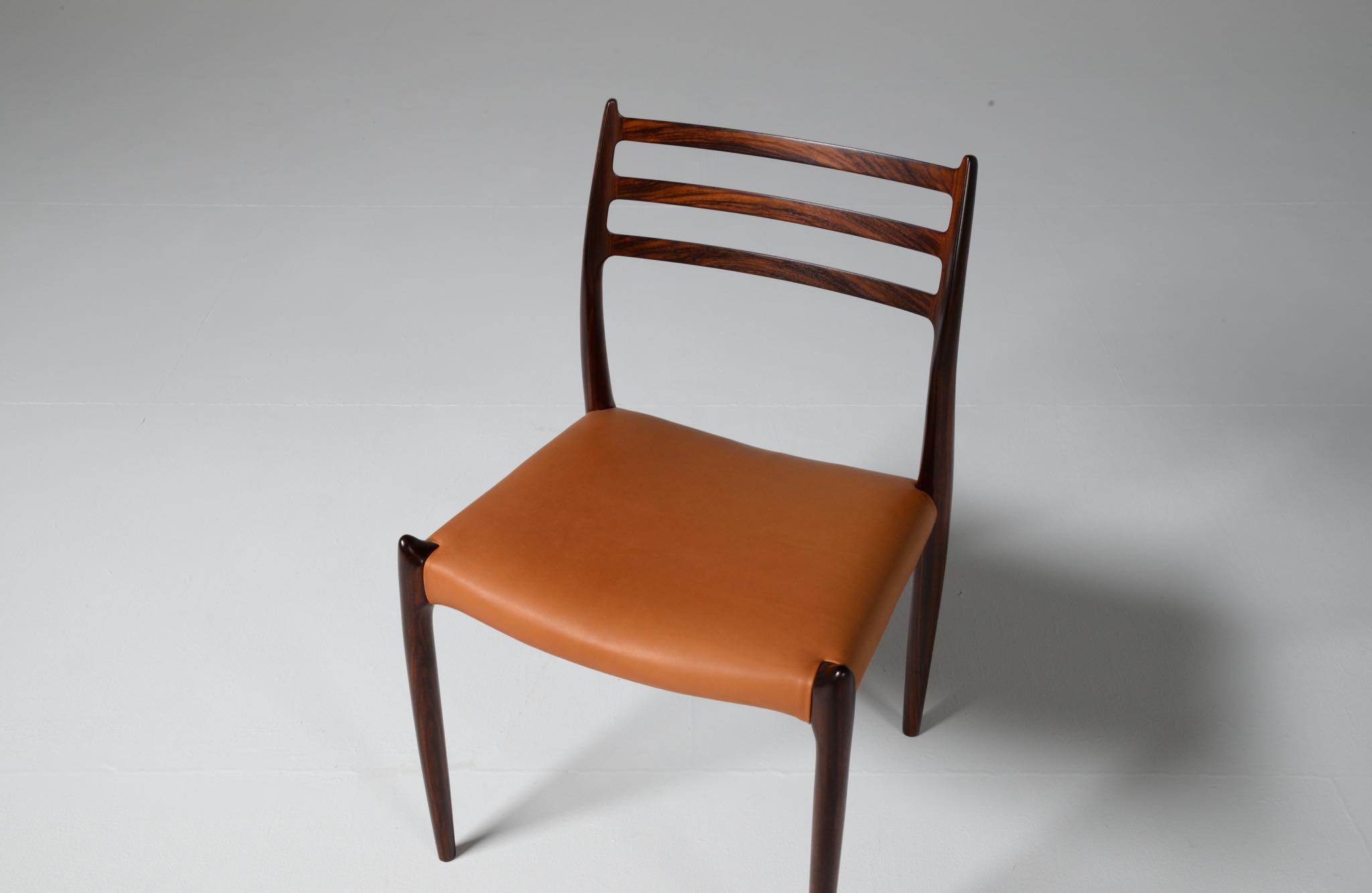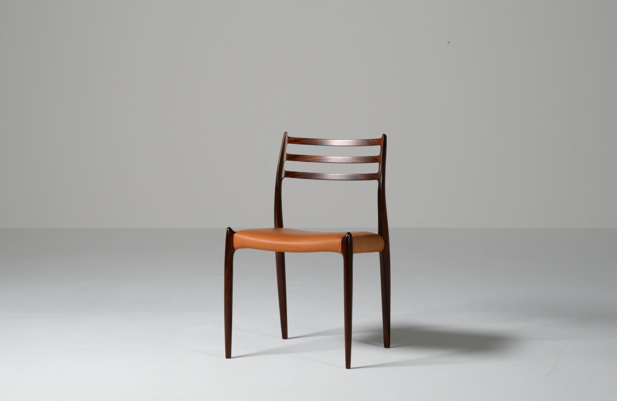 デンマークの家具工房、J.L.Møller/J.L.モラーによるダイニングチェア "model 78" です。創業者のN.O. Moller/ニルス・オット・モラーによってデザインされたモデルで、こちらは1960年代頃に作られたヴィンテージ品です。良質なローズウッドが用いられており、綺麗な木目文様が現れています。少なくてもこの4脚セットとして同じロットで作られたもので、それぞれが同一の材から木取りされています。座面はデンマークのCAMO leather社による良質な茶色皮革にて張り替えを行いました。フレームの塗膜に劣化が見られたため再塗装しており、コンディションは良好です。こちらは4脚セットでの販売となります。